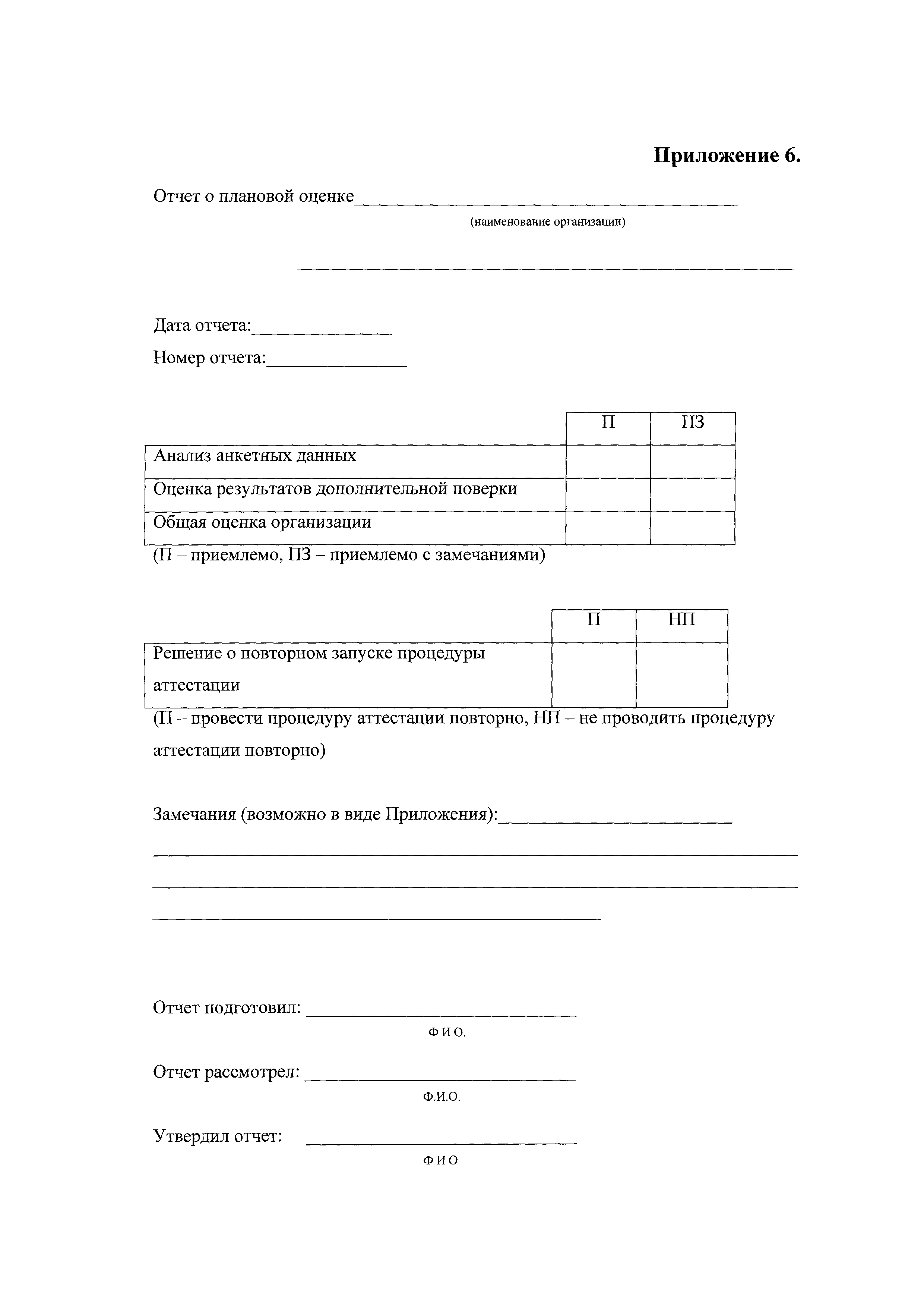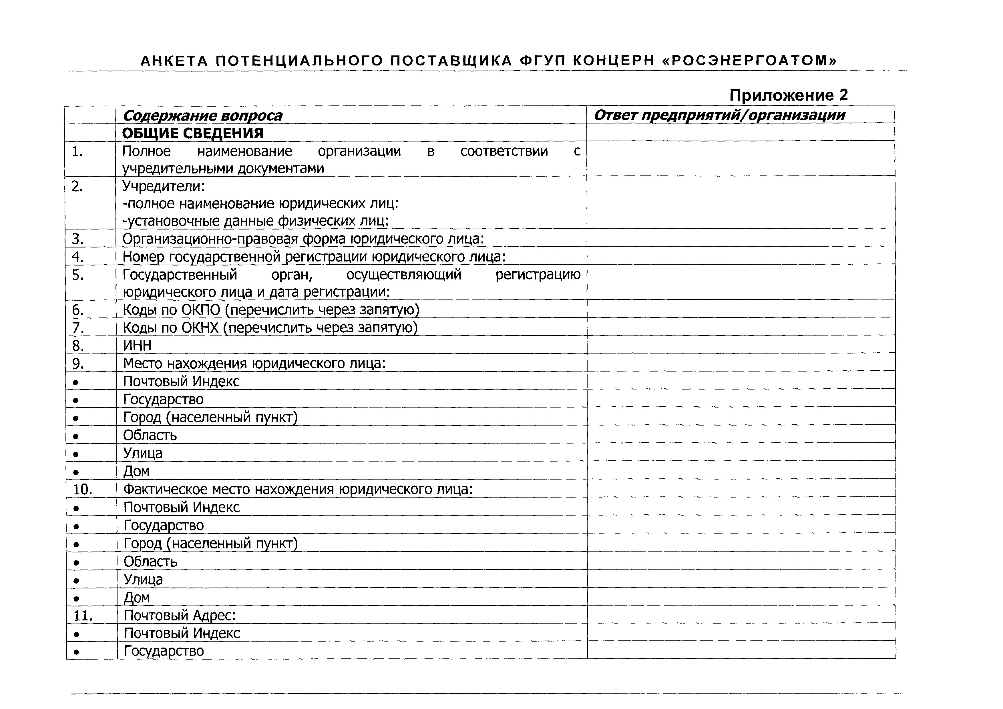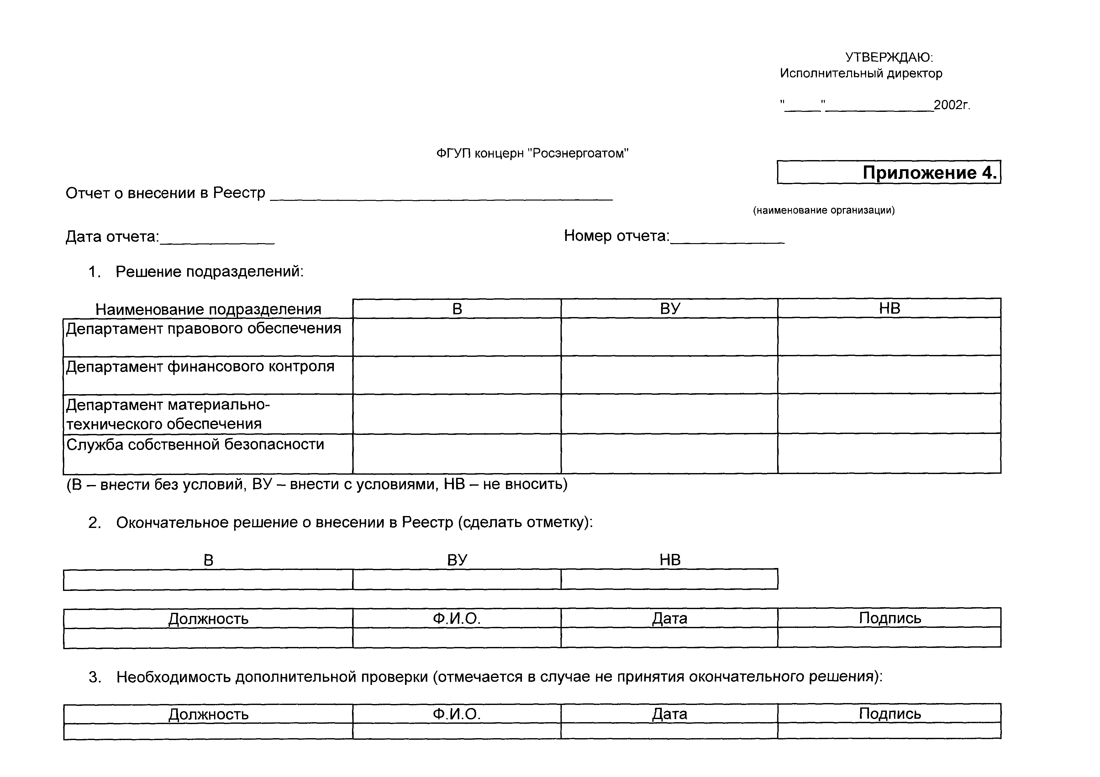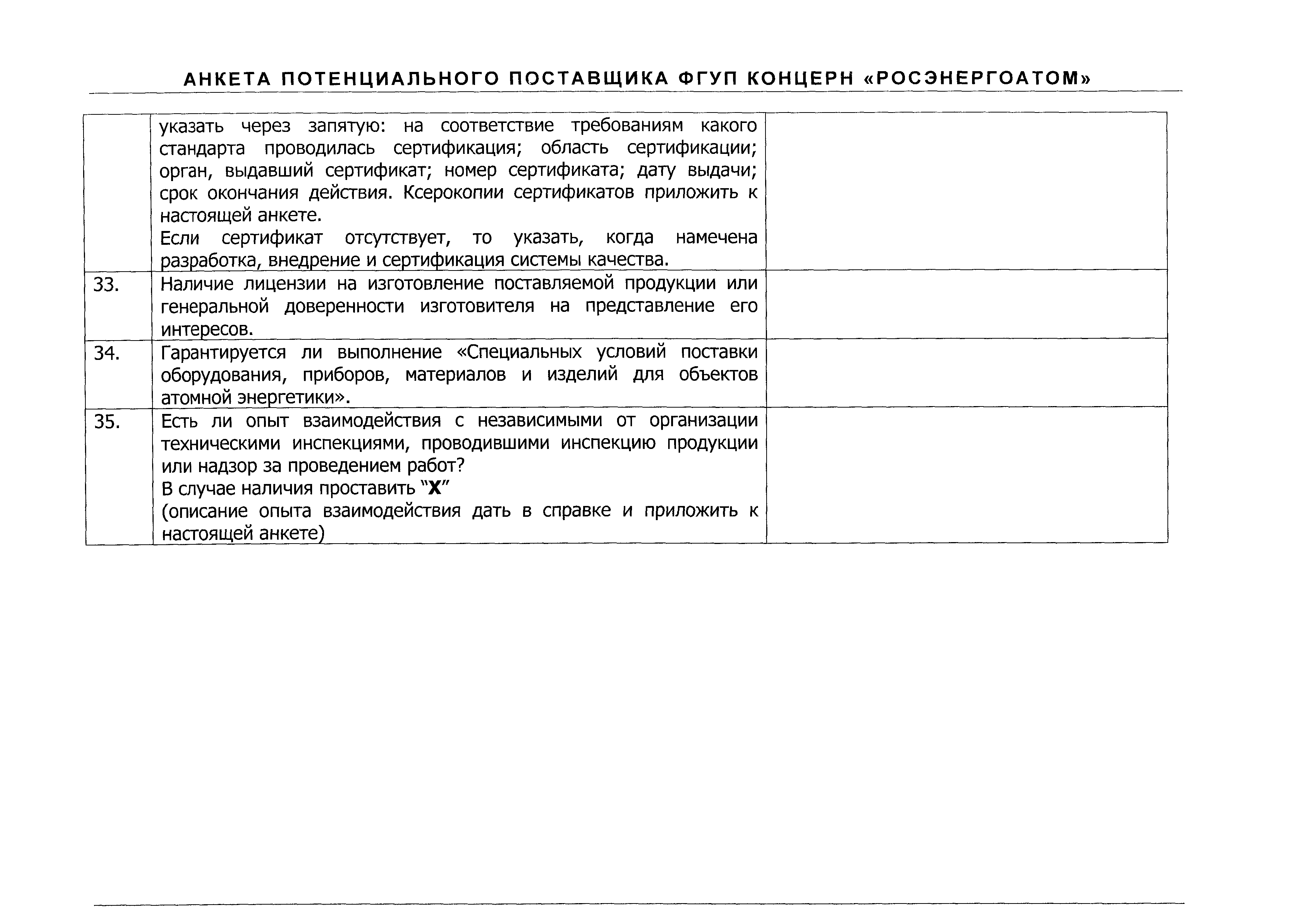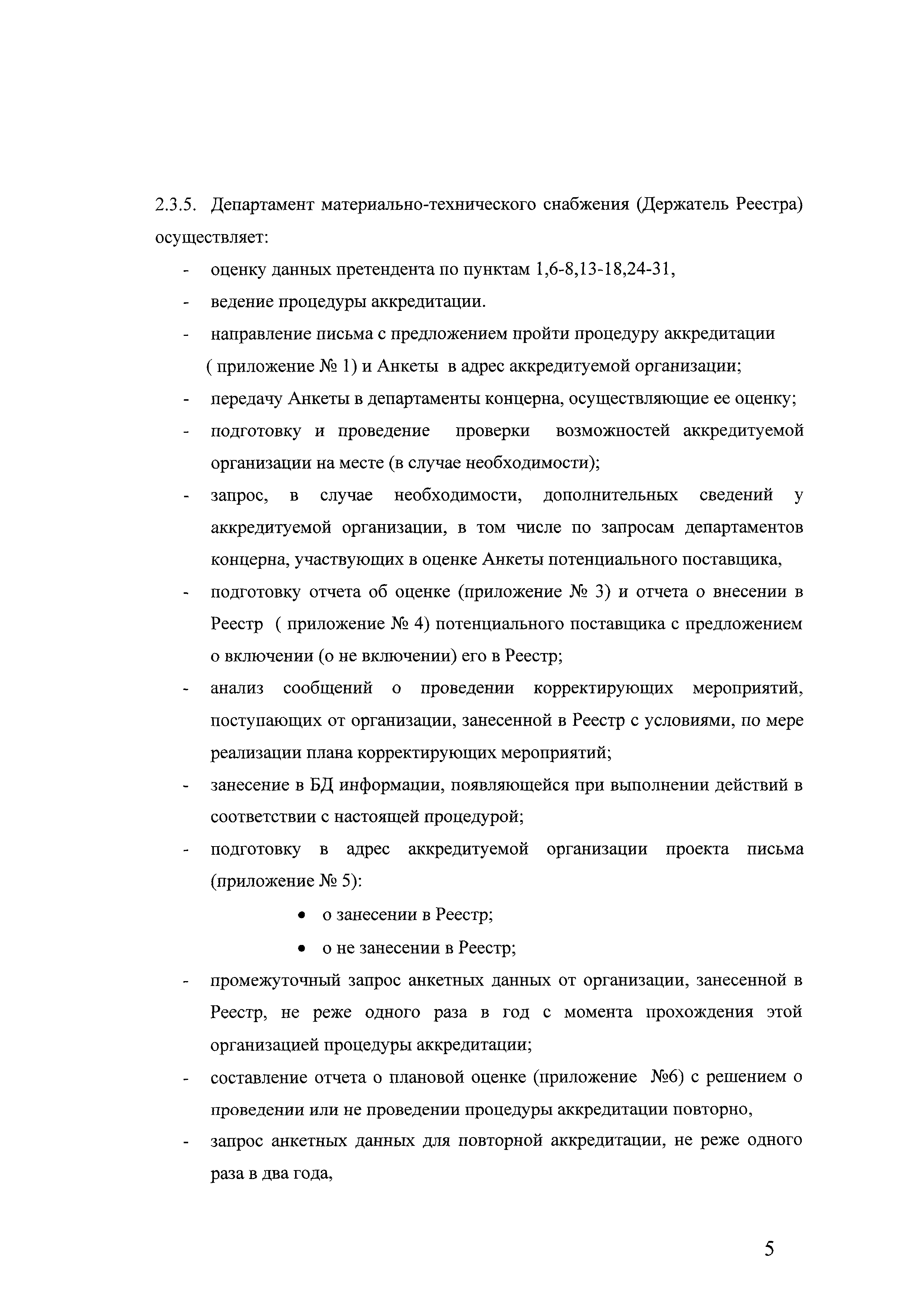 Положение об аккредитации потенциальных поставщиков оборудования, запчастей и материалов для концерна "Росэнергоатом" и его филиалов - атомных станций и о внесении их в Реестр концерна "Росэнергоатом"| Статус: | не определен законодательством | | Название рус.: | Положение об аккредитации потенциальных поставщиков оборудования, запчастей и материалов для концерна "Росэнергоатом" и его филиалов - атомных станций и о внесении их в Реестр концерна "Росэнергоатом" | | Дата добавления в базу: | 01.09.2013 | | Дата актуализации: | 01.01.2021 | | Область применения: | Положение устанавливает порядок аккредитации потенциальных поставщиков оборудования, запчастей и материалов для концерна "Росэнергоатом" и его филиалов - атомных станций и внесения их в реестр концерна. | | Оглавление: | 1. Общие положения 2. Процедура аккредитации 3. Оформление предложений потенциальных поставщиков продукции (оборудования, запчастей и материалов) для концерна и его филиалов - атомных станций 4. Использование Реестра поставщиков Приложение 1. Форма письма в адрес аттестуемой организации с предложением пройти процедуру аккредитации Приложение 2. Анкета потенциального поставщика ФГУП концерн "Росэнергоатом" Приложение 3. Отчет об оценке Приложение 4. Отчет о внесении в Реестр Приложение 5. Форма письма, в адрес аттестованной организации. подтверждающий факт внесения в Реестр Приложение 6. Отчет о плановой оценке | | Утверждён: | 29.10.2002 Концерн Росэнергоатом (Rosenergoatom Concern 749)