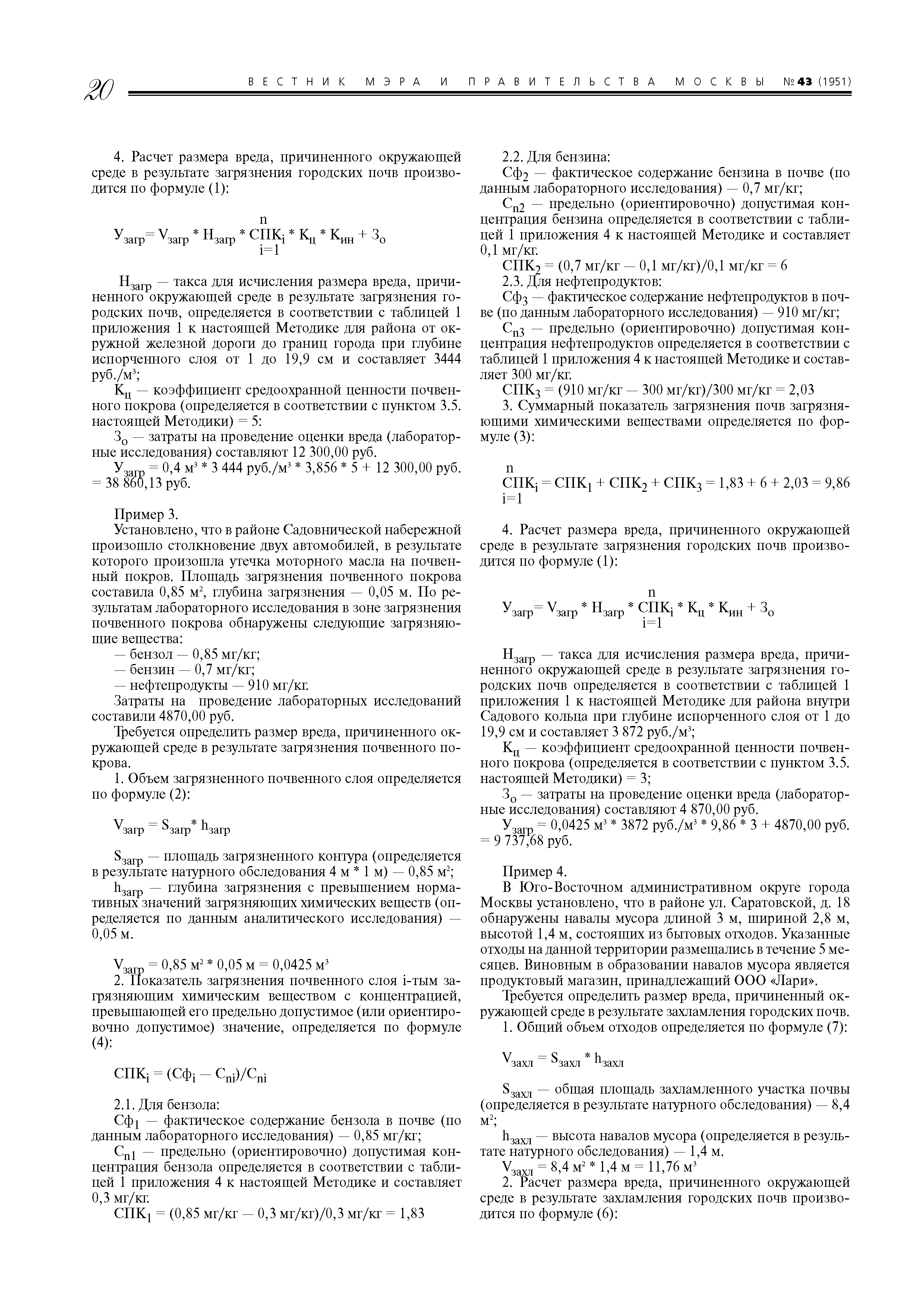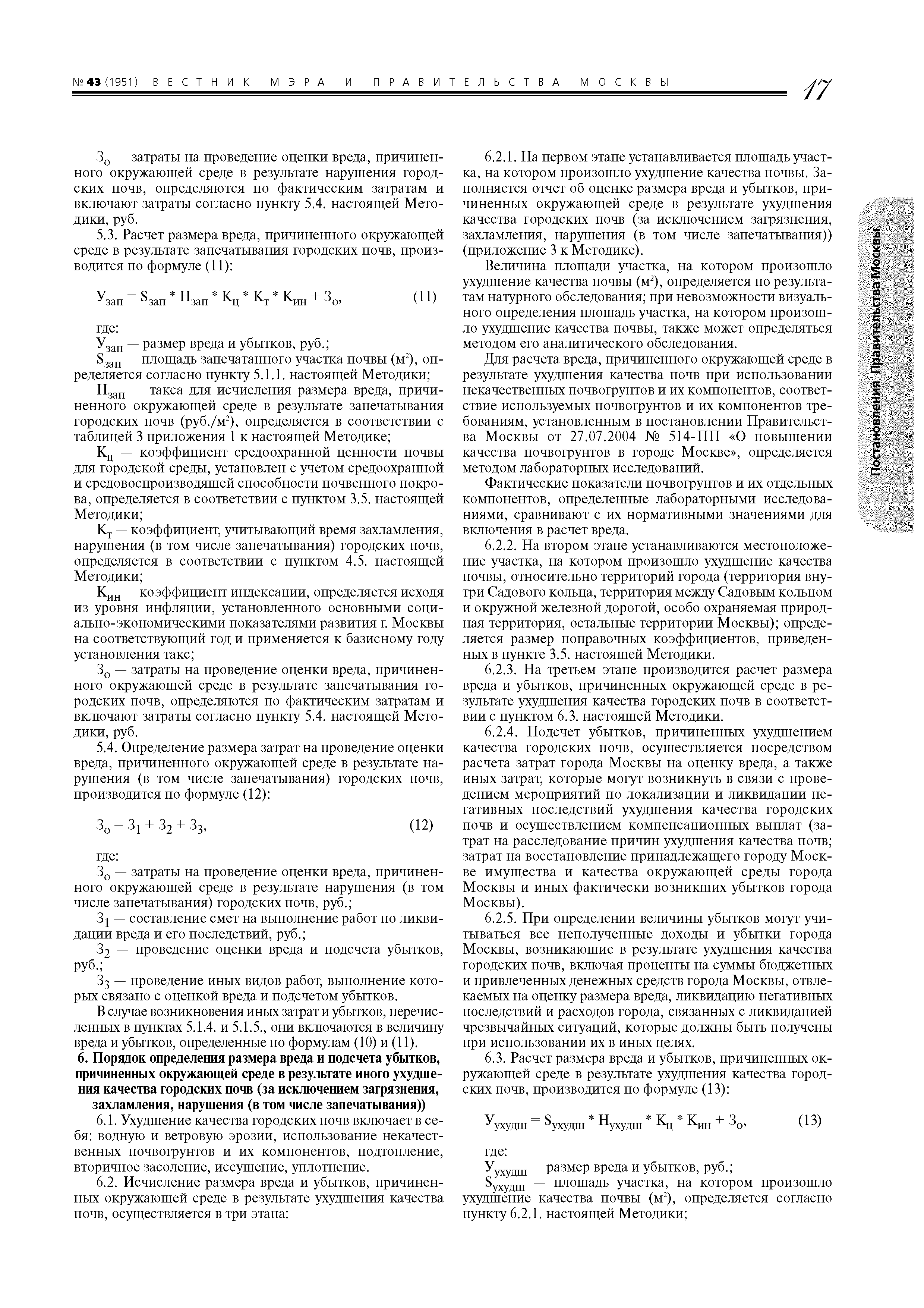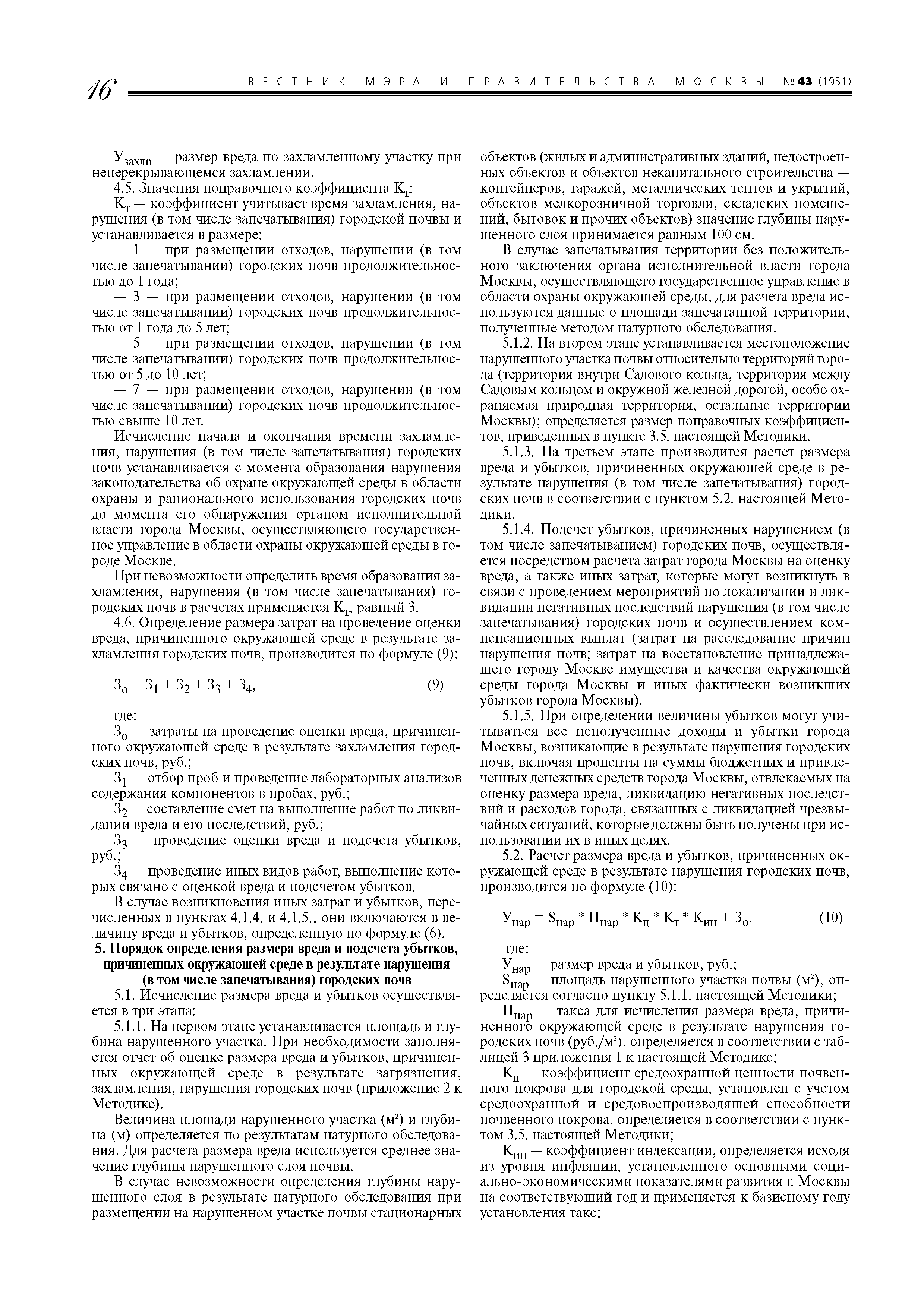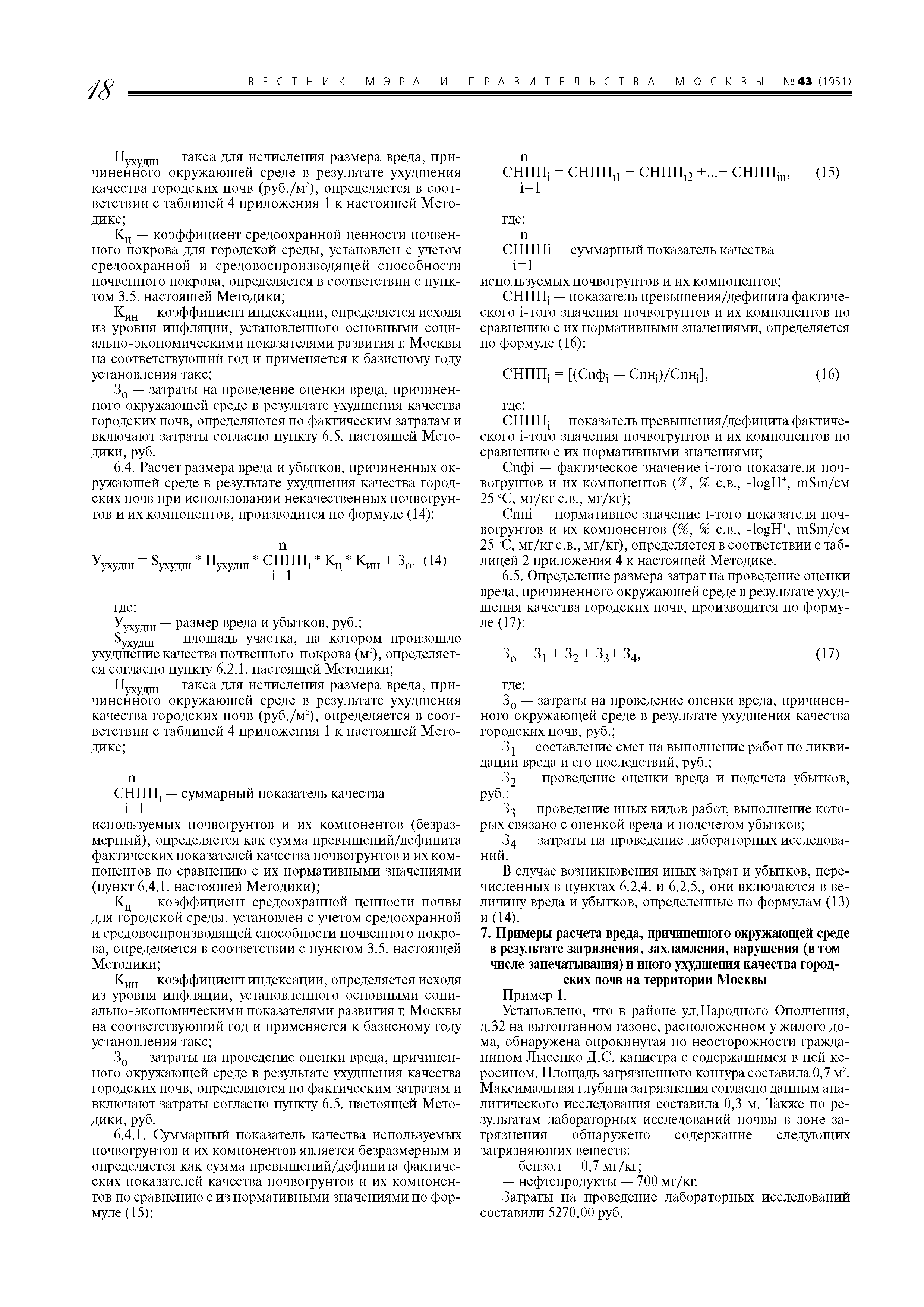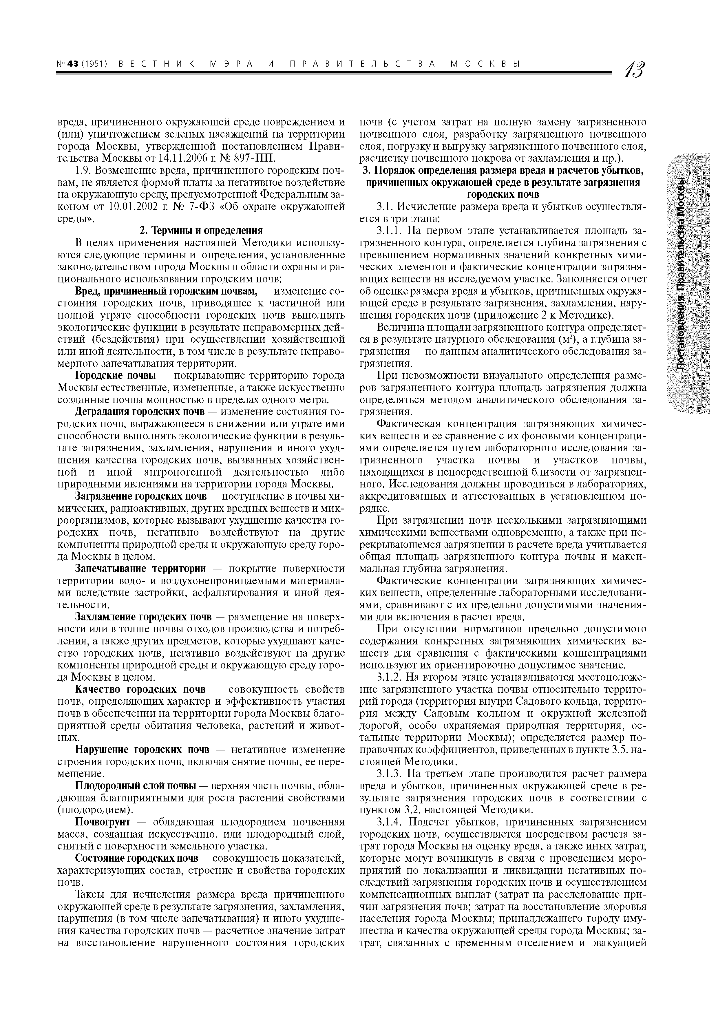 | Область применения: | Методика применяется в случаях: - исчисления размера вреда и убытков города Москвы, которые возникли в результате административного правонарушения, повлекшего загрязнение, захламление, нарушение (в том числе запечатывание) и иное ухудшение качества городских почв, находящихся на территории Москвы; - определения в процессе проведения государственной экологической экспертизы проектов и оценки воздействия на окружающую среду при разработке проектной документации размера вреда, который может возникнуть при загрязнении, захламлении, нарушении (в том числе запечатывании) и ином ухудшении качества городских почв на территории Москвы; - экономической оценки негативного воздействия на окружающую среду при загрязнении, захламлении, нарушении (в том числе запечатывании) и ином ухудшении качества городских почв в результате хозяйственной и иной деятельности организаций, расположенных на территории города Москвы; - в иных случаях, связанных с исчислением размера вреда окружающей среде и убытков города Москвы, причиненных в результате загрязнения, захламления, нарушения (в том числе запечатывания) и иного ухудшения качества городских почв на территории Москвы, подсчетом затрат на ликвидацию негативных последствий, связанных с данным воздействием. Методика применяется для определения размера вреда, причиненного действиями физических, должностных и юридических лиц на территории города Москвы. Методика не применяется для определения размера вреда, причиненного здоровью и имуществу граждан, имуществу юридических лиц в результате деградации городских почв. |