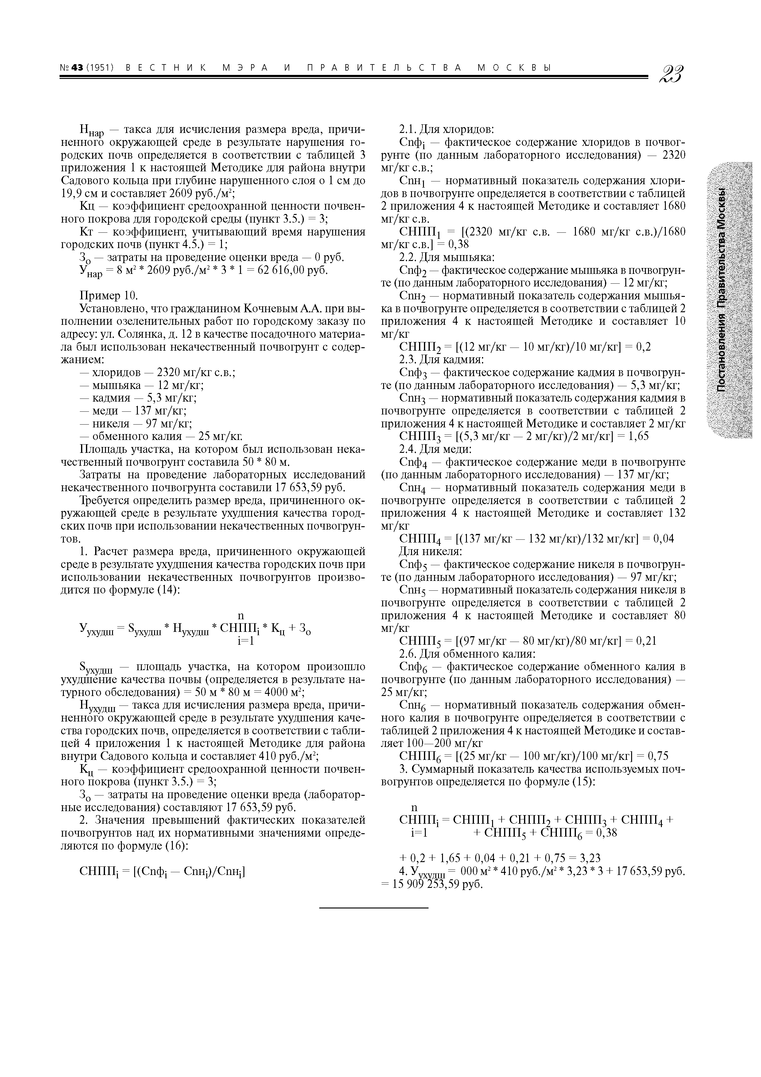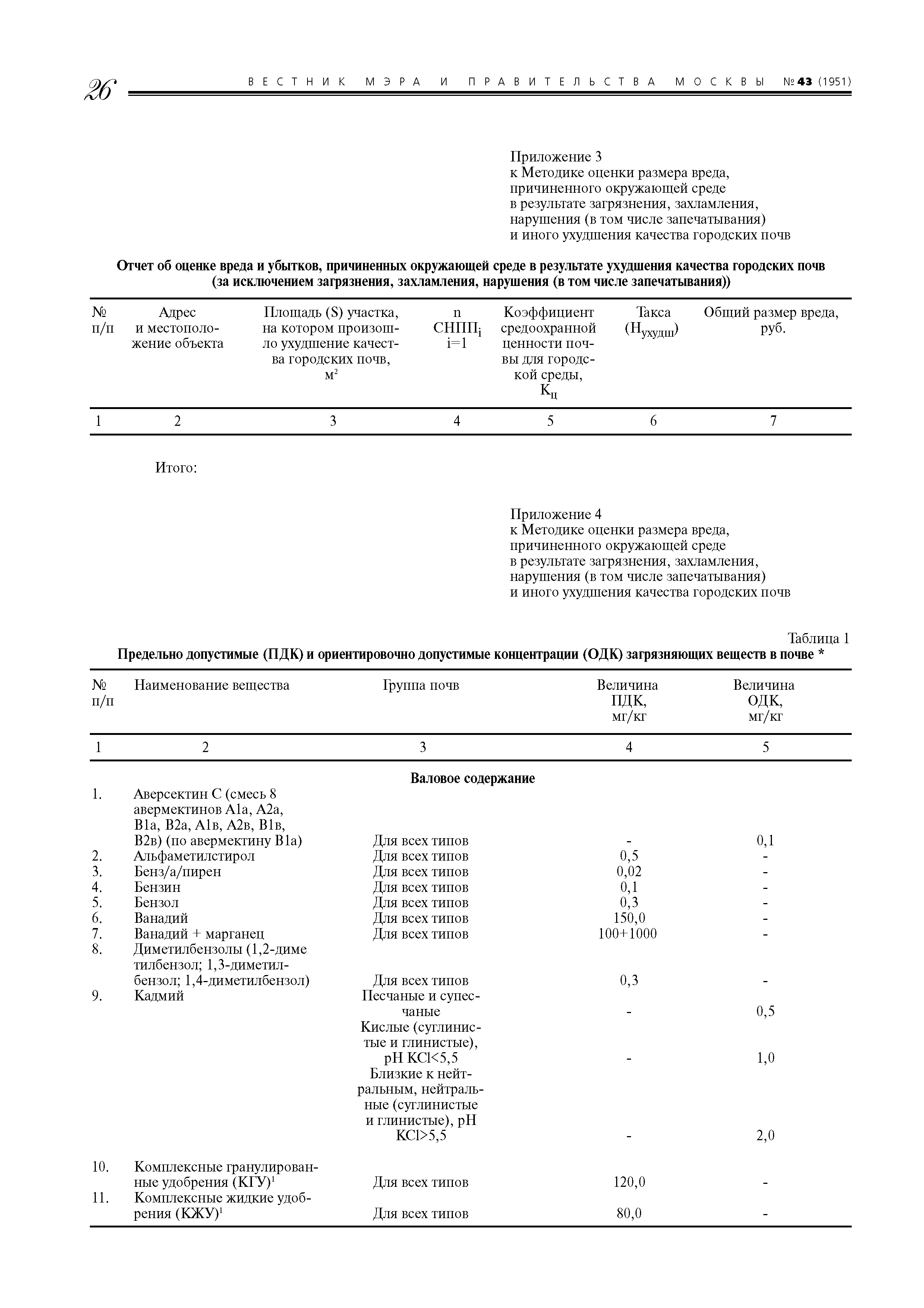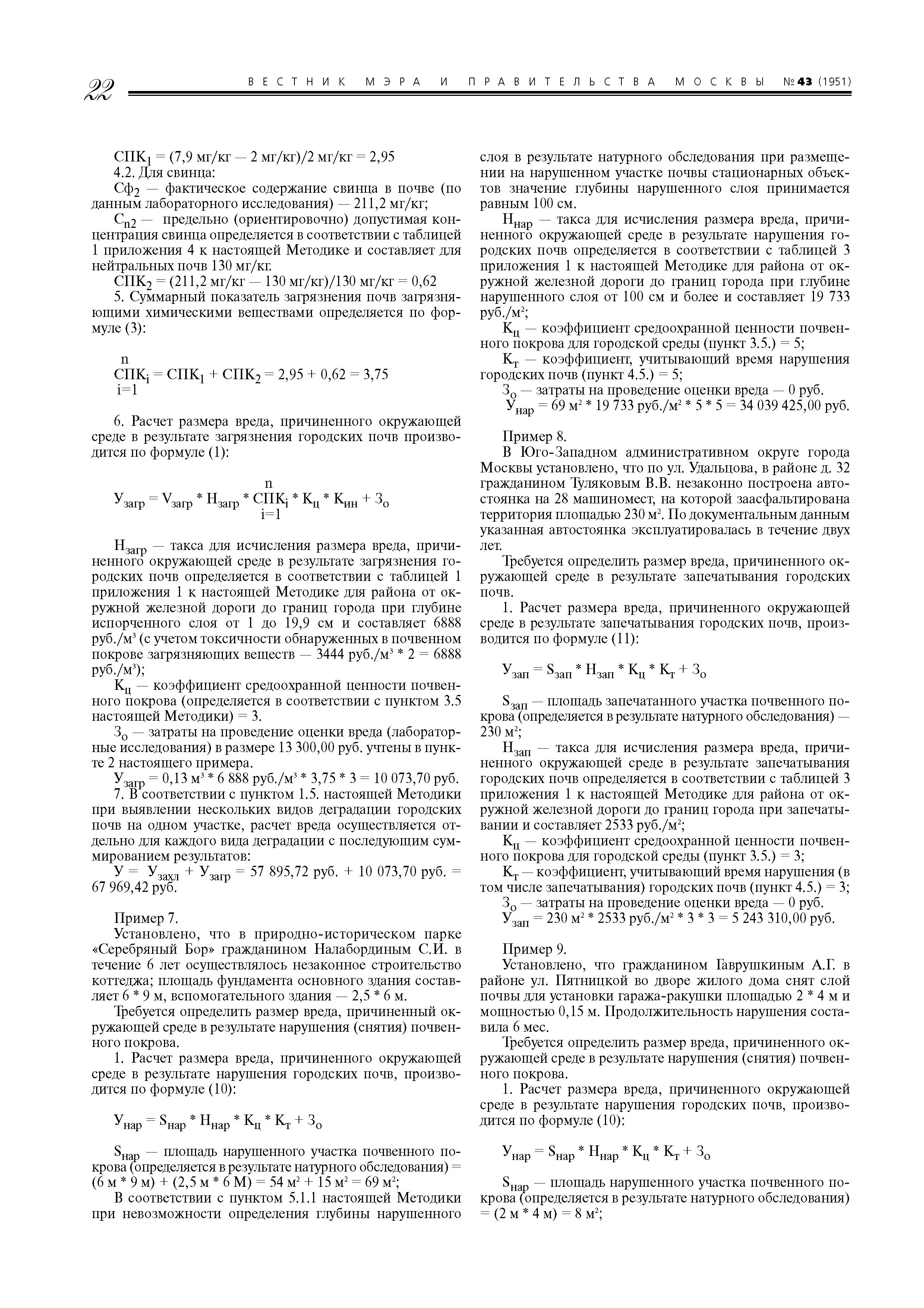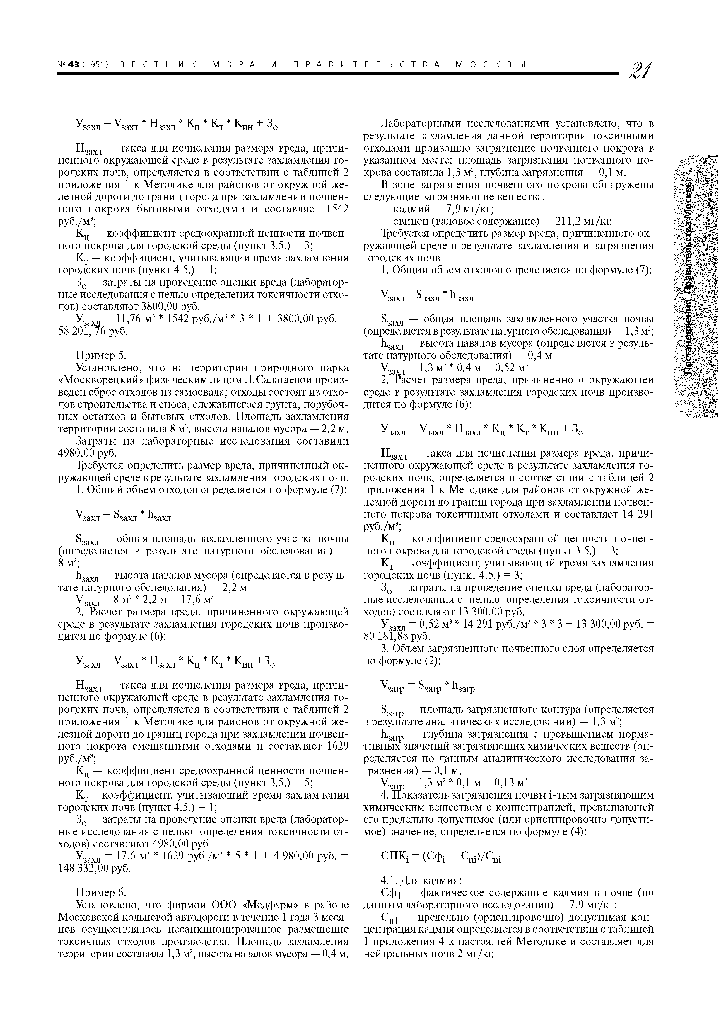| Оглавление: | 1. Назначение и область применения 2. Термины и определения 3. Порядок определения размера вреда и расчетов убытков, причиненных окружающей среде в результате загрязнения городских почв 4. Порядок определения размера вреда и подсчета убытков, причиненных окружающей среде в результате захламления городских почв 5. Порядок определения размера вреда и подсчета убытков, причиненных окружающей среде в результате нарушения (в том числе запечатывания) городских почв 6. Порядок определения размера вреда и подсчета убытков, причиненных окружающей среде в результате иного ухудшения качества городских почв (за исключением загрязнения, захламления, нарушения (в том числе запечатывания)) 7. Примеры расчета вреда, причиненного окружающей среде в результате загрязнения, захламлешiя, нарушения (в том числе запечатывашiя) и иного ухудшения качества городских почв на территории Москвы Приложение 1. Таксы для исчисления размера вреда (таблицы 1 - 4) Приложение 2. Отчет об оценке размера вреда и убытков, причиненных окружающей среде в результате загрязнения, захламления, нарушения городских почв Приложение 3. Отчет об оценке вреда и убытков, причиненных окружающей среде в результате ухудшения качества городских почв (за исключением загрязнения, захламления, нарушения (в том числе запечатывания)) Приложение 4. ПДК, ОДК и нормативные показатели почвогрунтов и их компонентов (таблицы 1, 2) |
