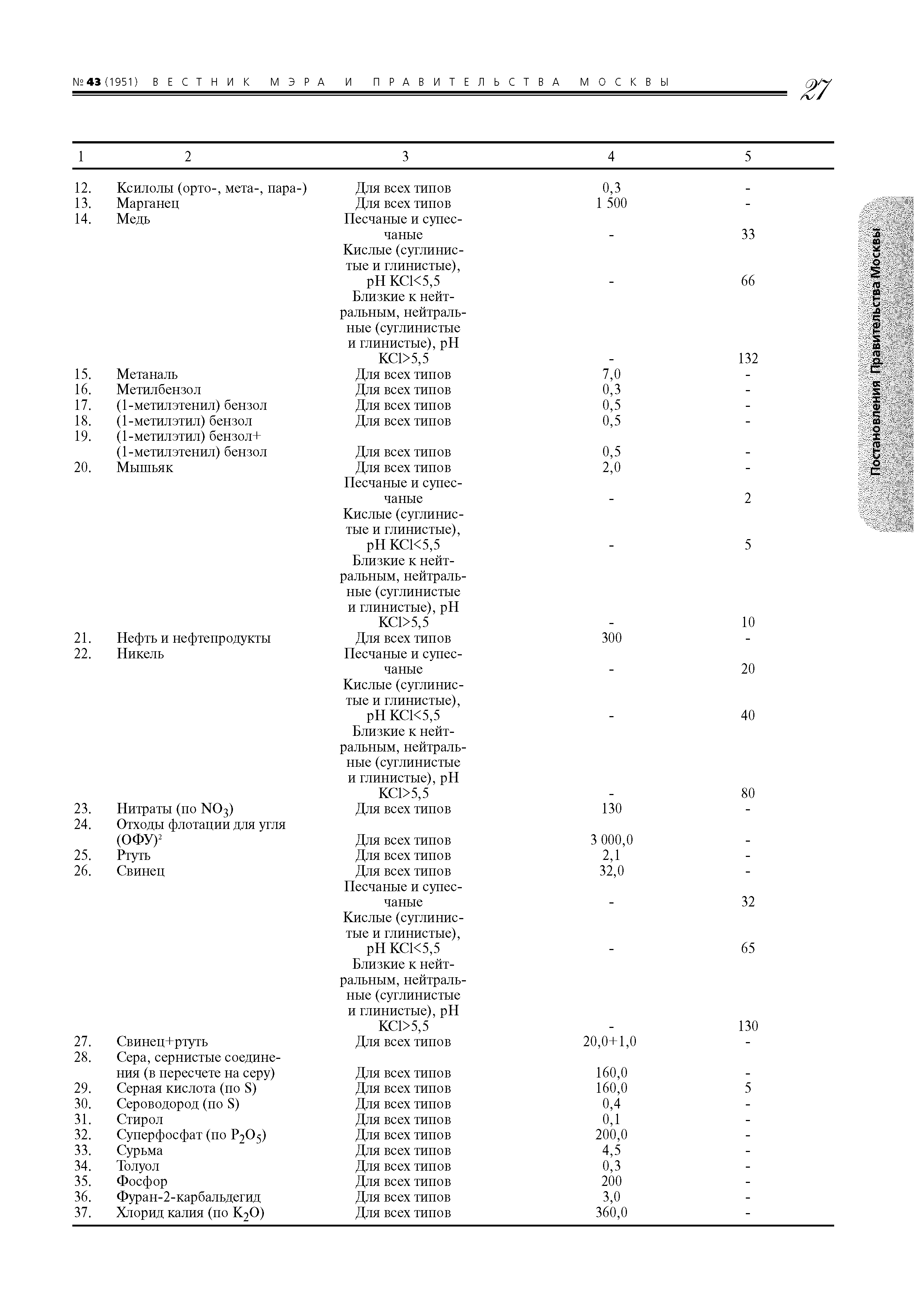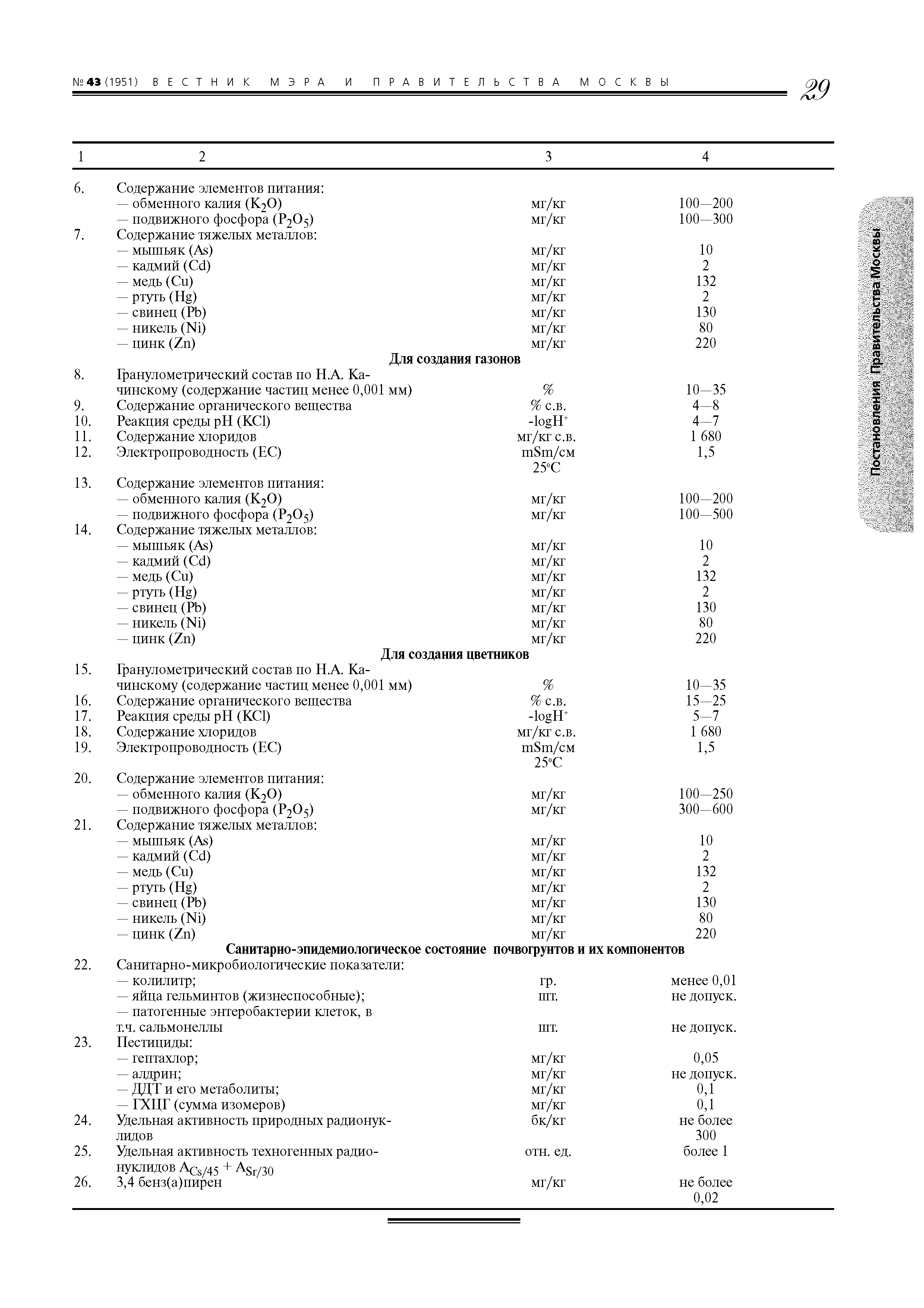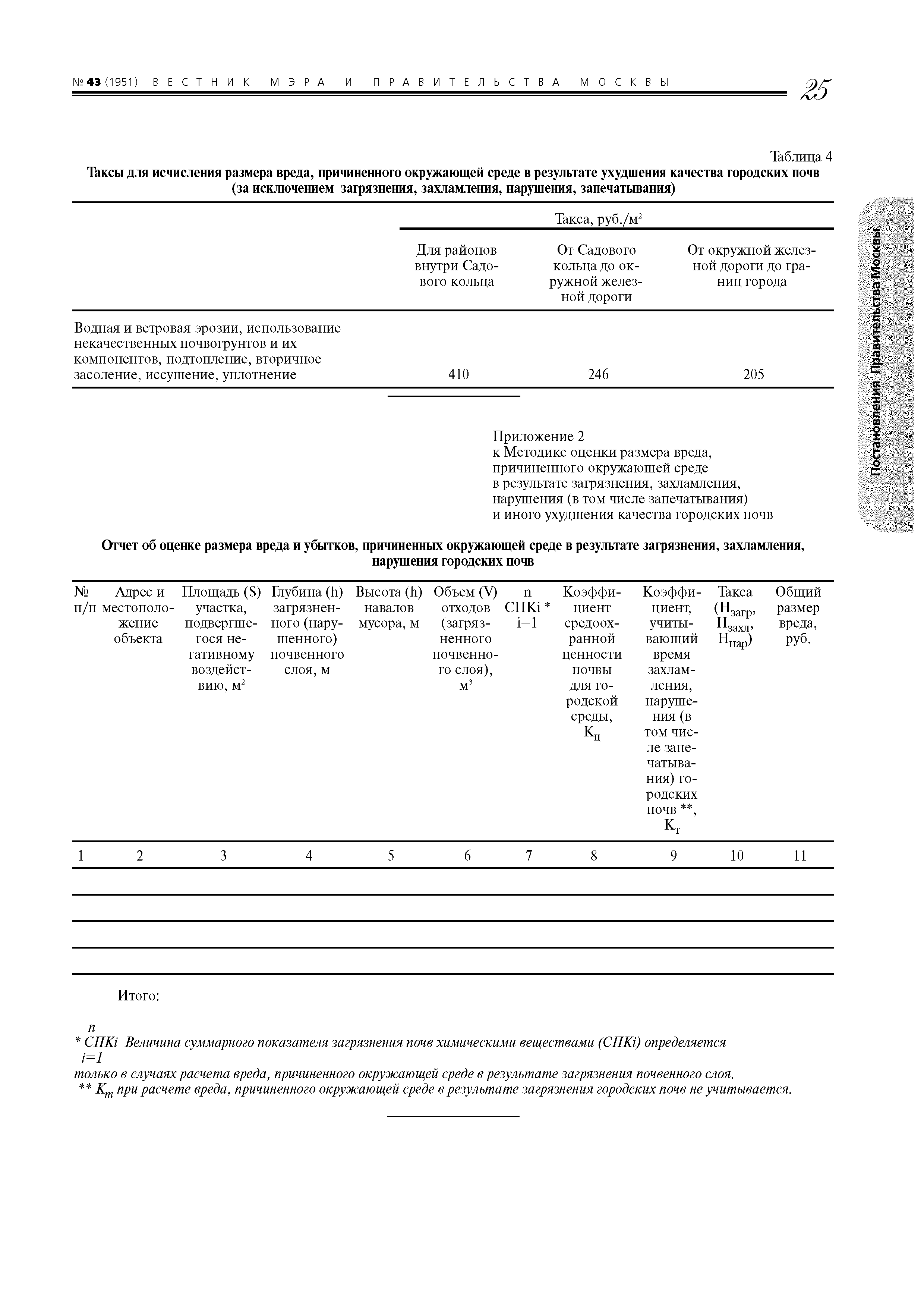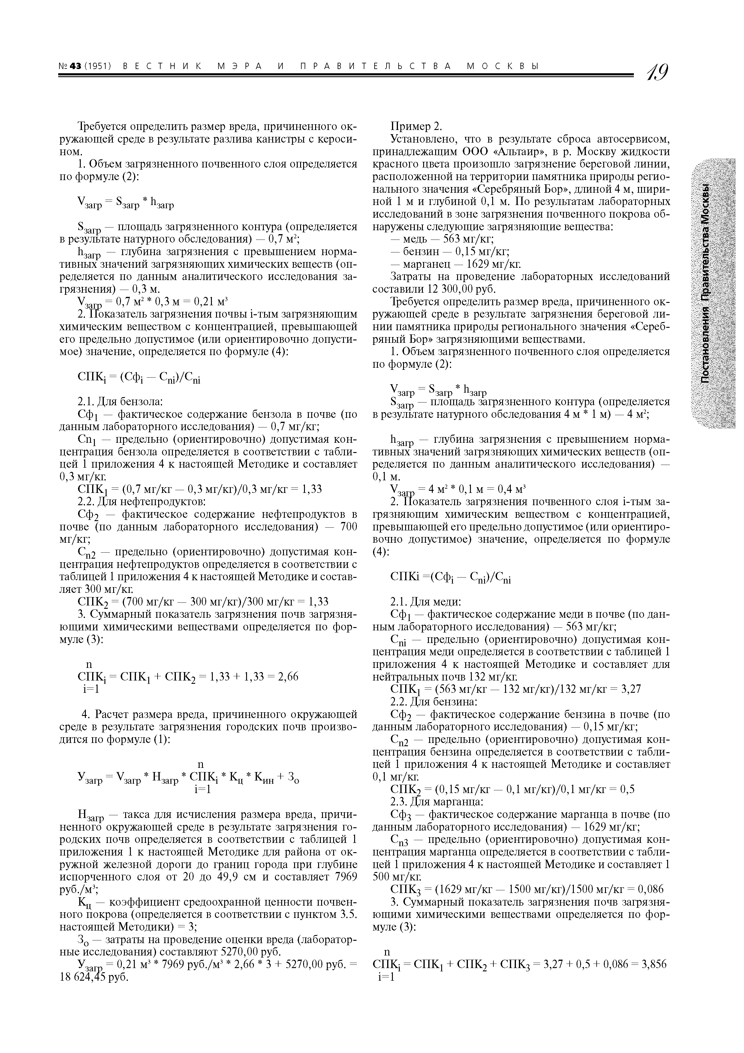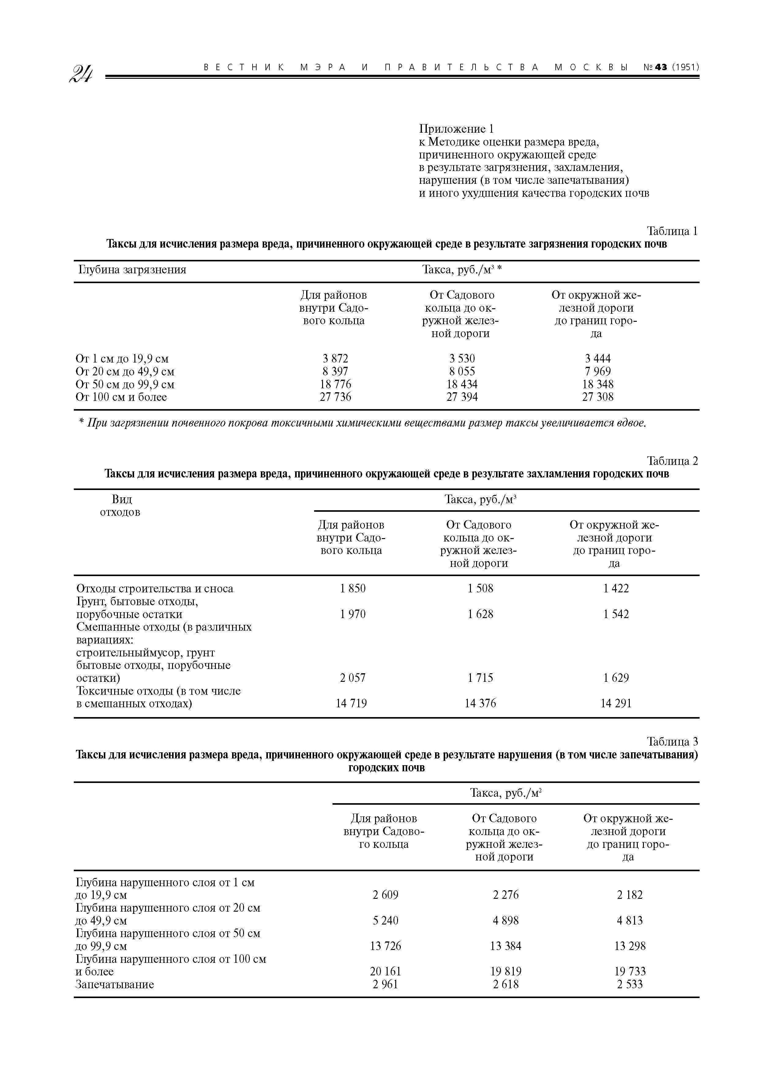 | Оглавление: | 1. Назначение и область применения 2. Термины и определения 3. Порядок определения размера вреда и расчетов убытков, причиненных окружающей среде в результате загрязнения городских почв 4. Порядок определения размера вреда и подсчета убытков, причиненных окружающей среде в результате захламления городских почв 5. Порядок определения размера вреда и подсчета убытков, причиненных окружающей среде в результате нарушения (в том числе запечатывания) городских почв 6. Порядок определения размера вреда и подсчета убытков, причиненных окружающей среде в результате иного ухудшения качества городских почв (за исключением загрязнения, захламления, нарушения (в том числе запечатывания)) 7. Примеры расчета вреда, причиненного окружающей среде в результате загрязнения, захламлешiя, нарушения (в том числе запечатывашiя) и иного ухудшения качества городских почв на территории Москвы Приложение 1. Таксы для исчисления размера вреда (таблицы 1 - 4) Приложение 2. Отчет об оценке размера вреда и убытков, причиненных окружающей среде в результате загрязнения, захламления, нарушения городских почв Приложение 3. Отчет об оценке вреда и убытков, причиненных окружающей среде в результате ухудшения качества городских почв (за исключением загрязнения, захламления, нарушения (в том числе запечатывания)) Приложение 4. ПДК, ОДК и нормативные показатели почвогрунтов и их компонентов (таблицы 1, 2) |