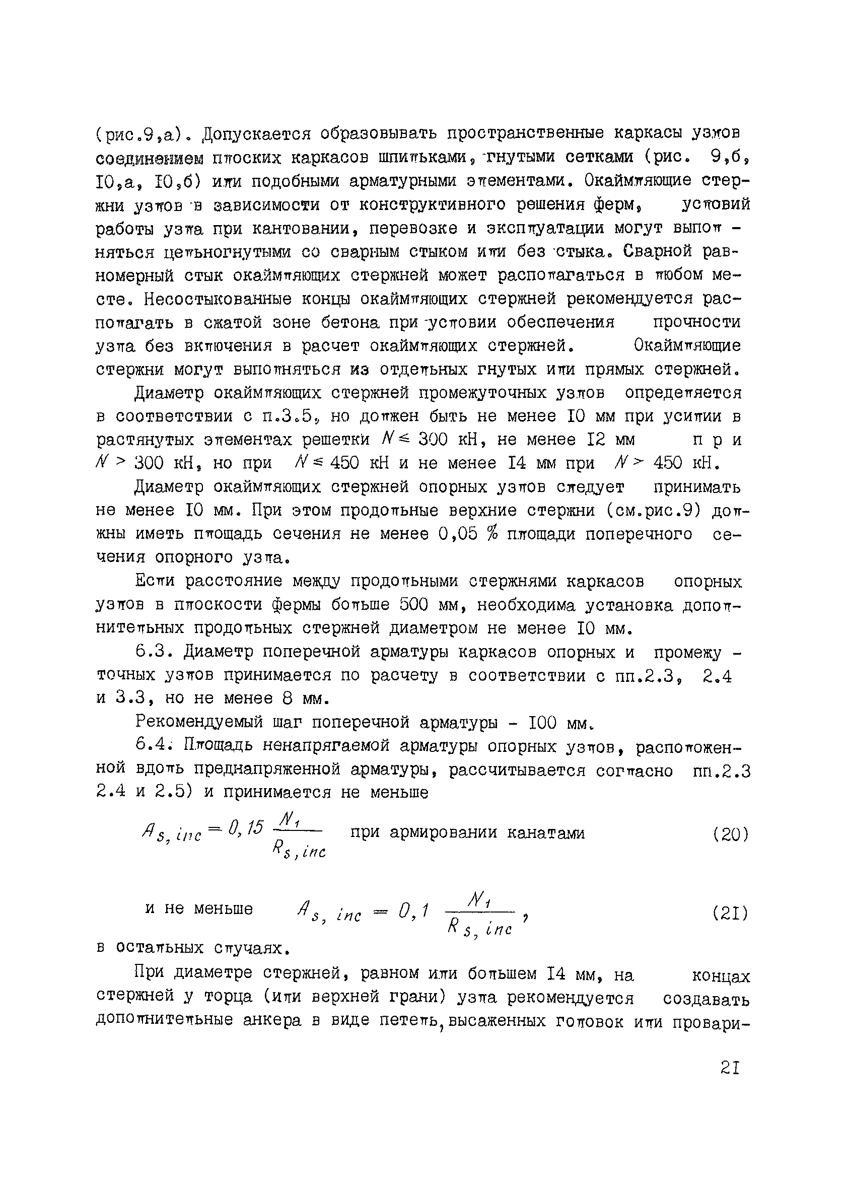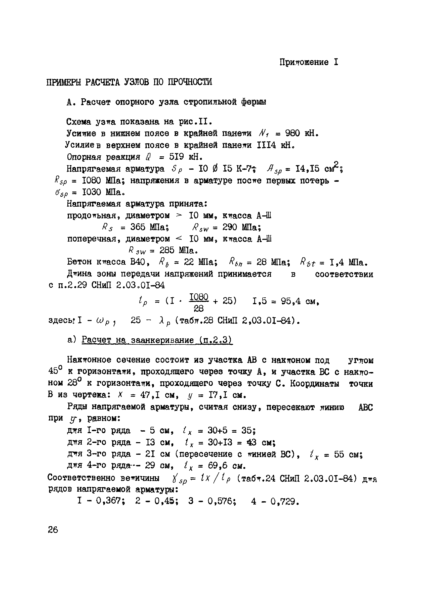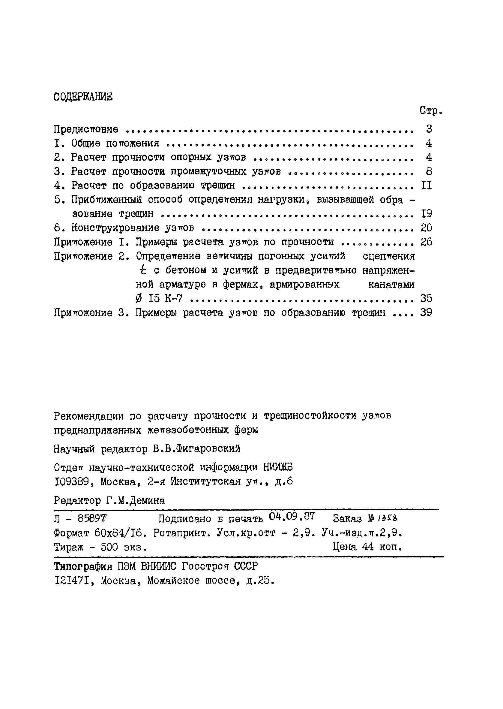 | Оглавление: | Предисловие 1. Общие положения 2. Расчет прочности опорных узлов 3. Расчет прочности промежуточных узлов 4. Расчет по образованию трещин 5. Приближенный способ определения нагрузки, вызывающей образование трещин 6. Конструирование узлов Приложение 1. Примеры расчета узлов по прочности Приложение 2. Определение величины погонных усилий сцепления t с бетоном и усилий в предварительно напряженной арматуре в фермах, армированных канатами диаметром 15 К-7 Приложение 3. Примеры расчета узлов по образованию трещин |