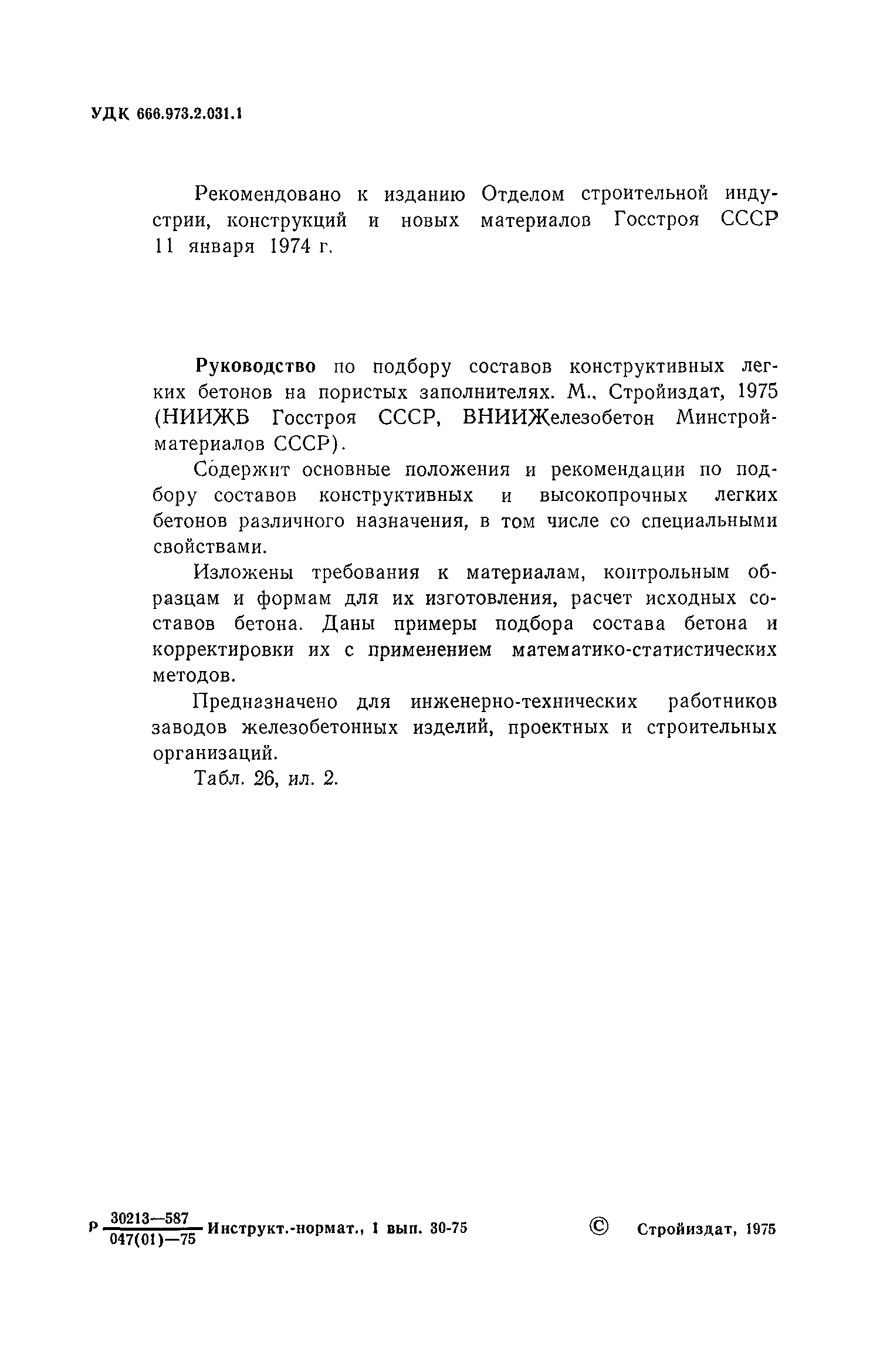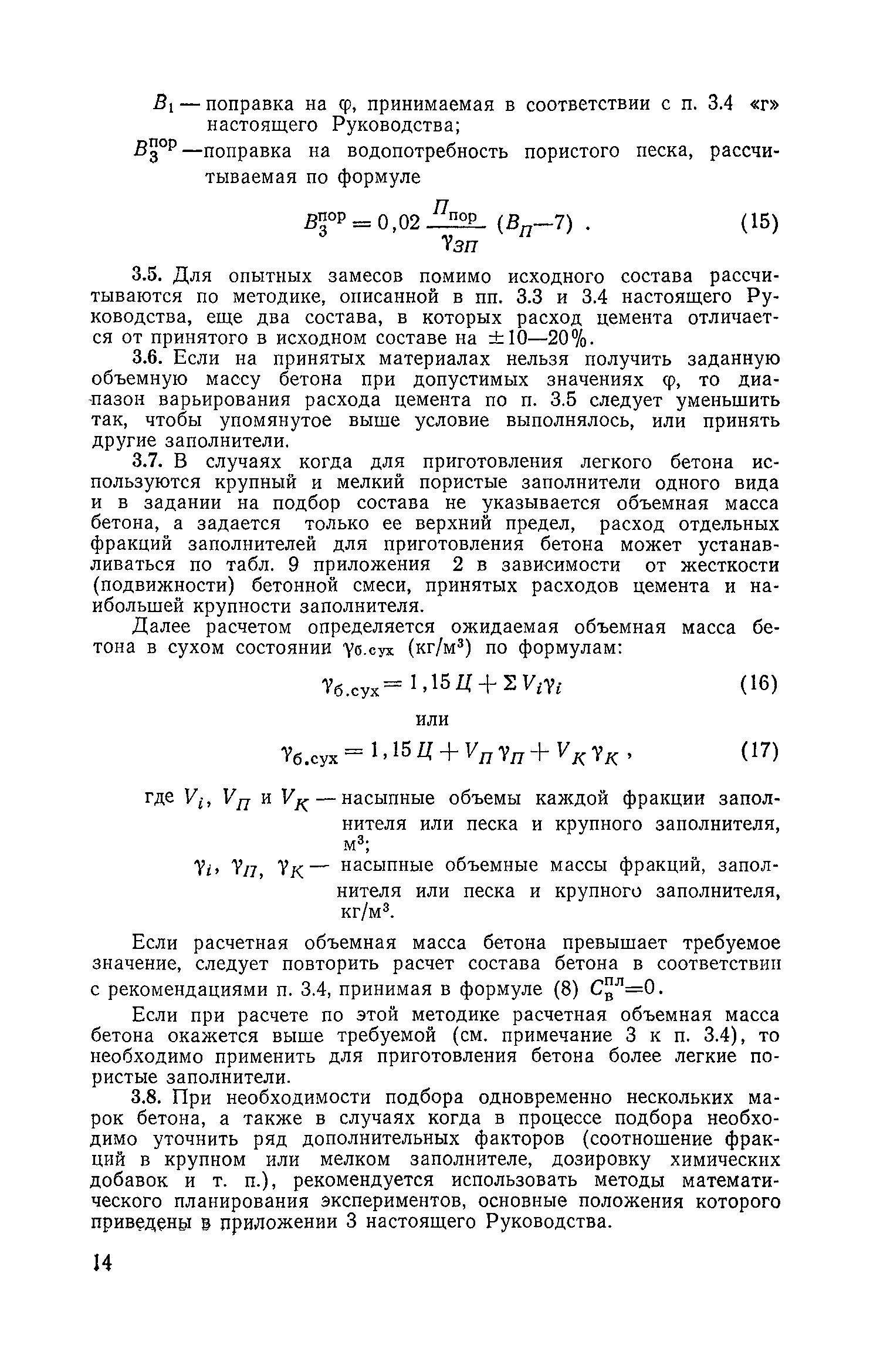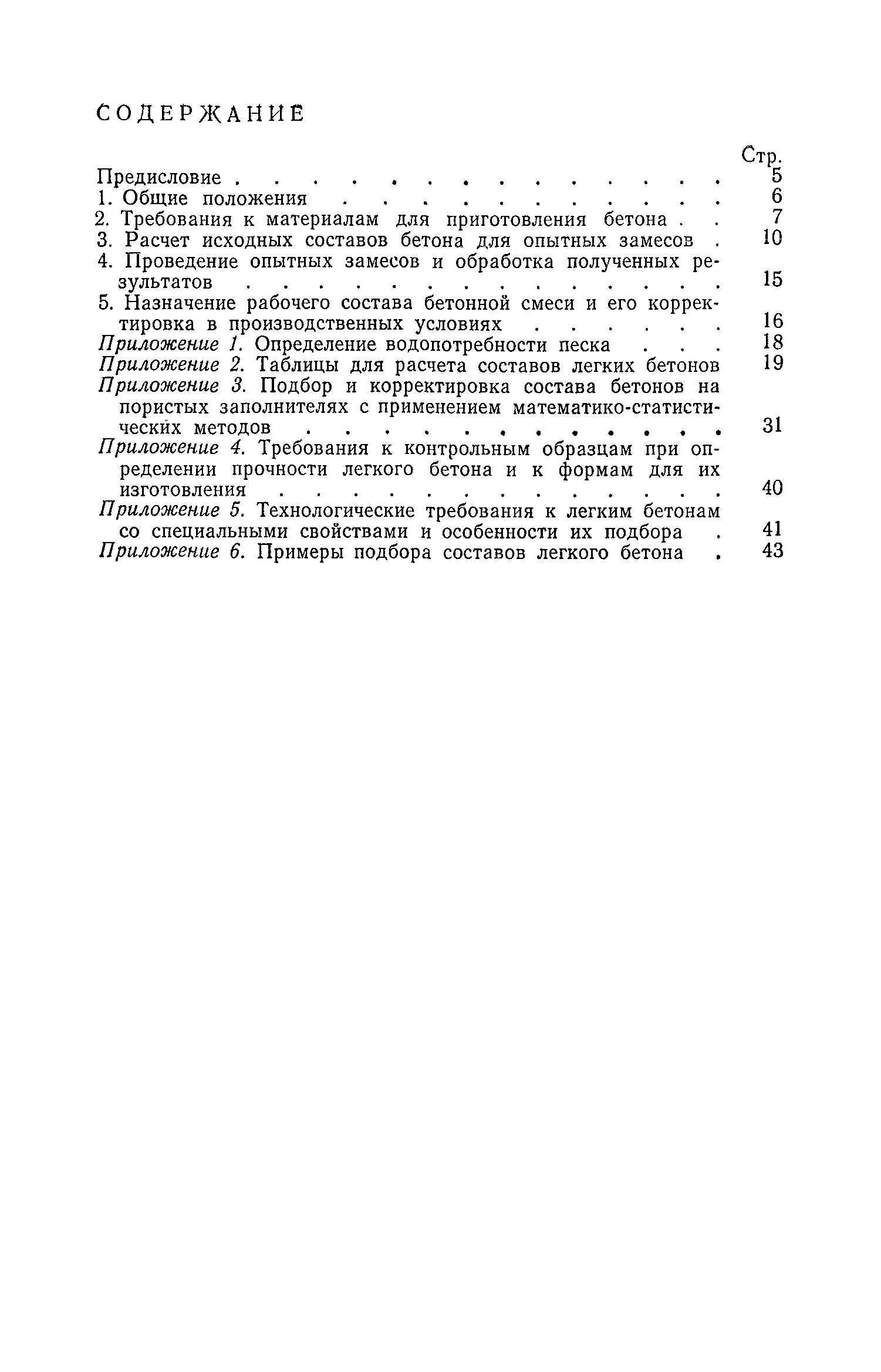 | Оглавление: | Предисловие 1. Общие положении 2. Требования к материалам для приготовления бетона 3. Расчет исходных составов бетона для опытных замесов 4. Проведение опытных замесов и обработка полученных результатов 5. Назначение рабочего состава бетонной смеси и его корректировка в производственных условиях Приложение 1. Определение водопотребности песка Приложение 2. Таблицы для расчета составов легких бетонов Приложение 3. Подбор и корректировка состава бетонов на пористых заполнителях с применением математико-статистических методов Приложение 4. Требования к контрольным образцам при определении прочности легкого бетона и к формам для их изготовления Приложение 5. Технологические требования к легким бетонам со специальными свойствами и особенности их подбора . Приложение 6. Примеры подбора составов легкого бетона |