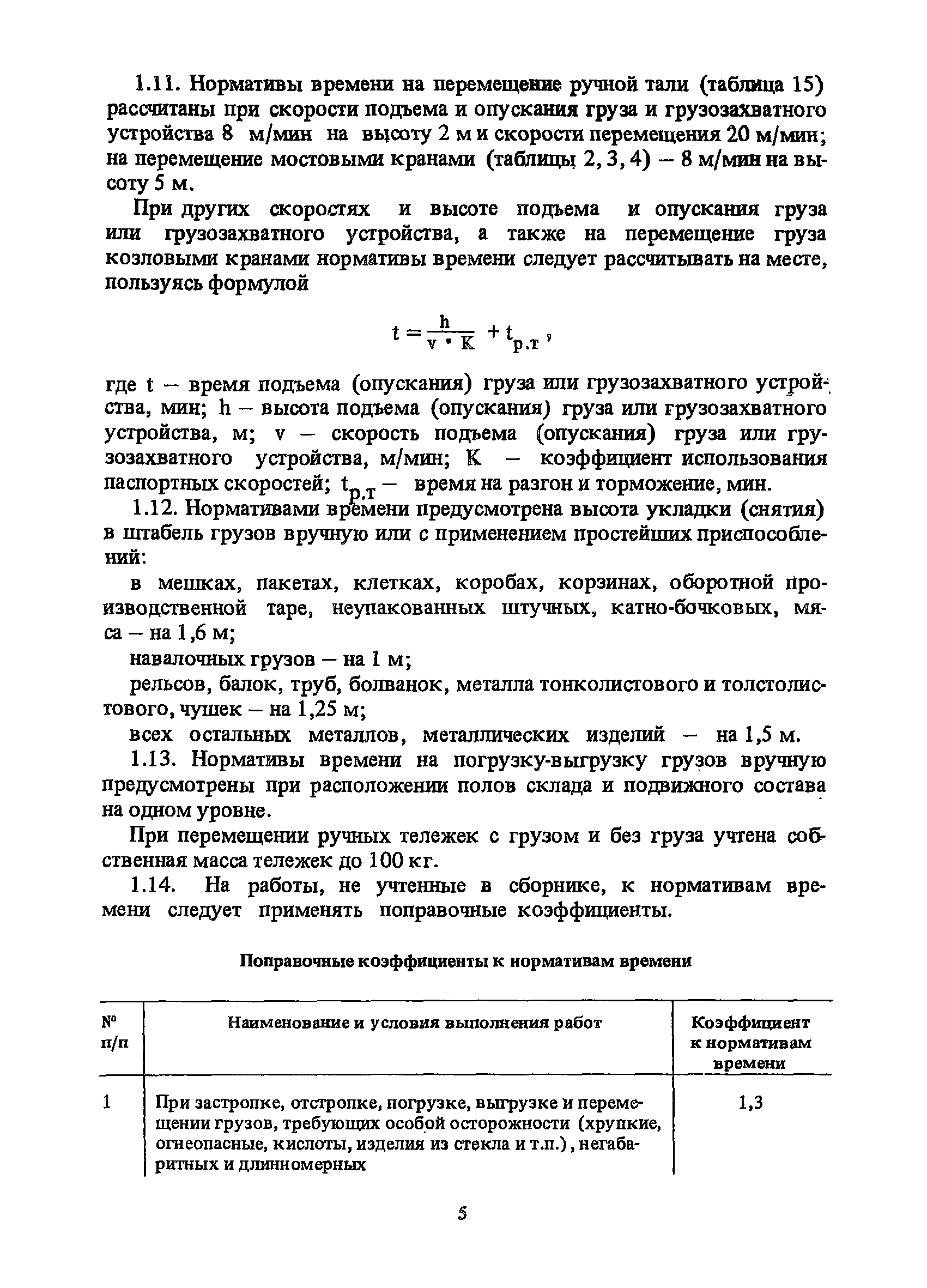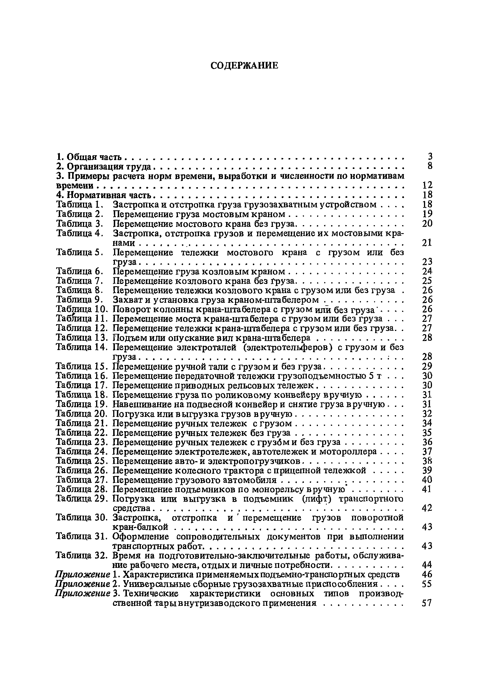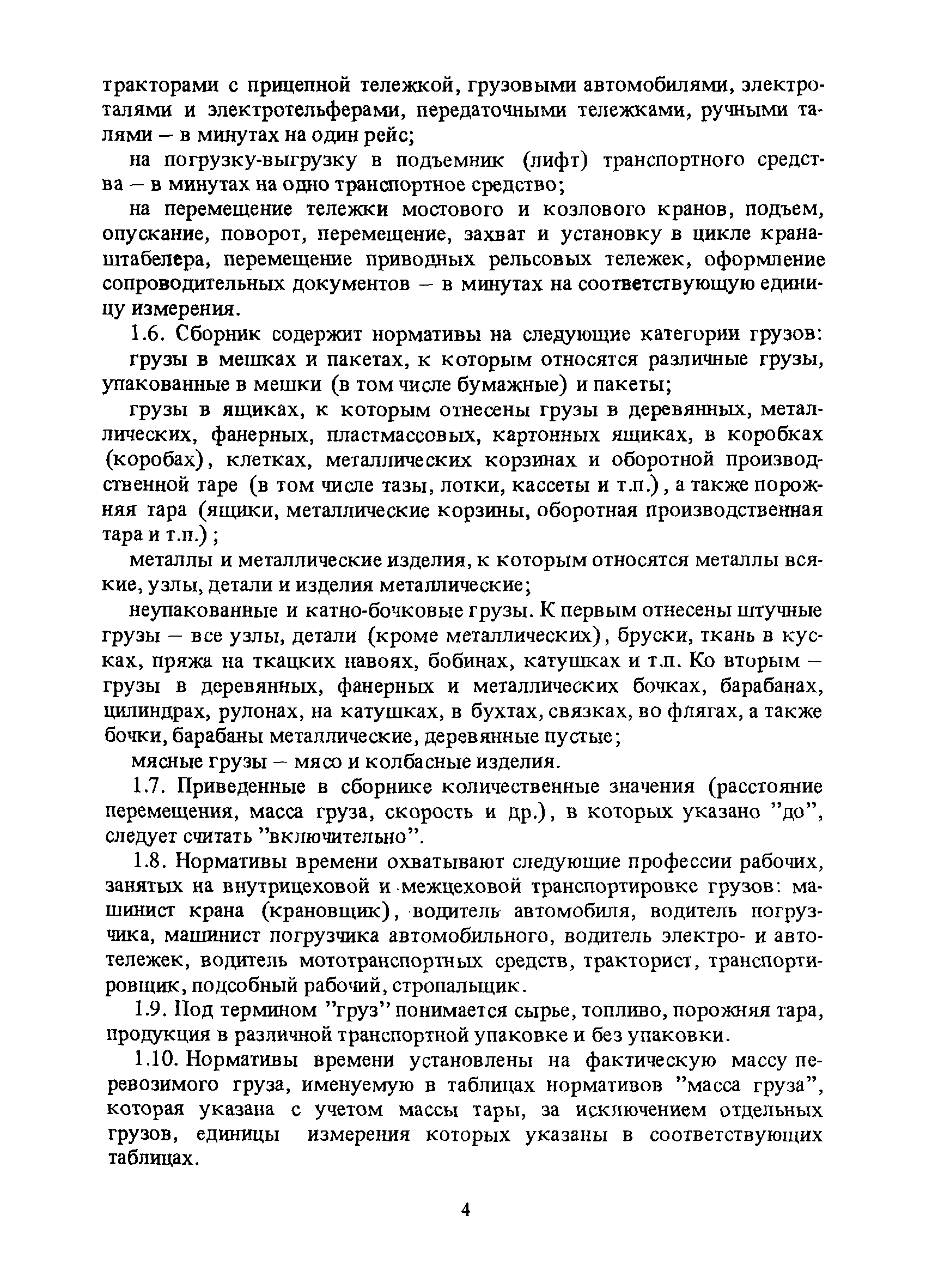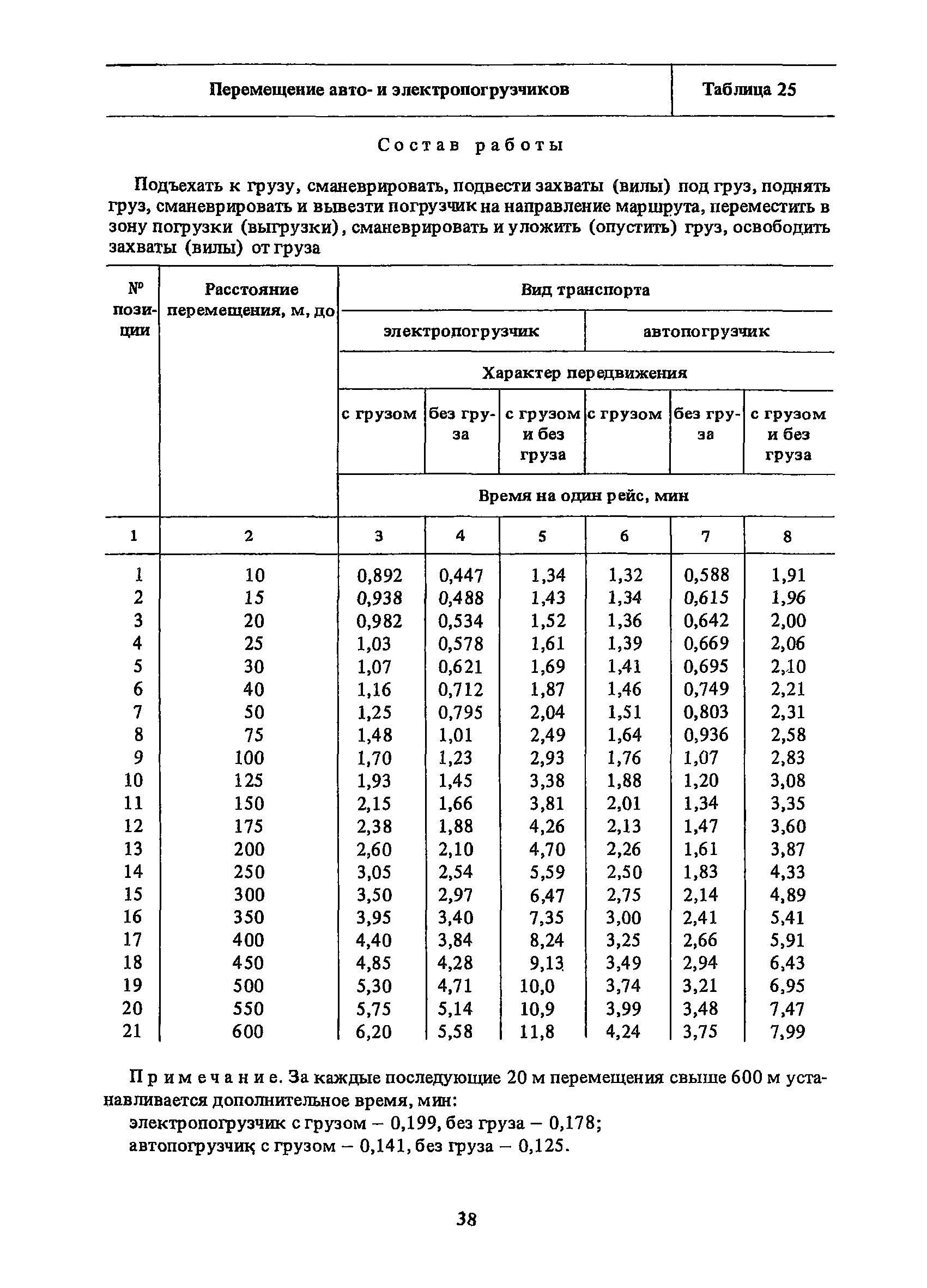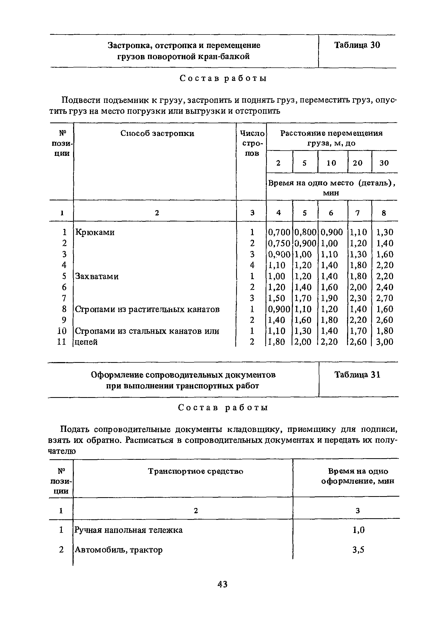 Нормативы времени на внутрицеховую и межцеховую транспортировку грузов| Статус: | утратил силу | | Название рус.: | Нормативы времени на внутрицеховую и межцеховую транспортировку грузов | | Дата добавления в базу: | 01.09.2013 | | Дата актуализации: | 01.01.2021 | | Область применения: | Нормативы времени разработаны на выполнение операций по погрузке, выгрузке, застропке и перемещению грузов внутрипроизводственным (внутрицеховым и межцеховым) транспортом, связанным непосредственно со сферой производства в рамках одного предприятия. Нормативы времени предназначены для расчета технически обоснованных норм времени (выработки) при нормировании труда рабочих-сдельщиков, установления нормированных заданий рабочим-повременщикам, а также дни расчета численности рабочих, занятых внутрицеховой и межцеховой транспортировкой грузов. | | Оглавление: | 1. Общая часть 2. Организация труда 3. Примеры расчета норм времени, выработки и численности по нормативам времени 4. Нормативная часть Таблица 1. Застропка и отстропка груза грузозахватным устройством Таблица 2. Перемещение груза мостовым краном Таблица 3. Перемещение мостового крана без груза Таблица 4. Застропка, отстропка грузов и перемещение их мостовыми кранами Таблица 5. Перемещение тележки мостового крана с грузом или без груза Таблица 6. Перемещение груза козловым краном Таблица 7. Перемещение козлового крана без груза Таблица 8. Перемещение тележки козлового крана с грузом или без груза Таблица 9. Захват и установка груза краном-штабелером Таблица 10. Поворот колонны крана-штабелера с грузом или без груза Таблица 11. Перемещение моста крана-штабелера с грузом или без груза Таблица 12. Перемещение тележки крана-штабелера с грузом или без груза Таблица 13. Подъем или опускание вил крана-штабелера Таблица 14. Перемещение электроталей (электротельферов) с грузом и без груза Таблица 15. Перемещение ручной тали с грузом и без груза Таблица 16. Перемещение передаточной тележки грузоподъемностью 5 т Таблица 17. Перемещение приводных рельсовых тележек Таблица 18. Перемещение груза по роликовому конвейеру вручную Таблица 19. Навешивание на подвесной конвейер и снятие груза вручную Таблица 20. Погрузка или выгрузка грузов вручную Таблица 21. Перемещение ручных тележек с грузом Таблица 22. Перемещение ручных тележек без груза Таблица 23. Перемещение ручных тележек с грузом и без груза Таблица 24. Перемещение электротележек, автотележек и мотороллера Таблица 25. Перемещение авто- и электропогрузчиков Таблица 26. Перемещение колесного трактора с прицепной тележкой Таблица 27. Перемещение грузового автомобиля Таблица 28. Перемещение подъемников по монорельсу вручную Таблица 29. Погрузка или выгрузка в подъемник (лифт) транспортного средства Таблица 30. Застропка, отстропка и перемещение грузов поворотной кран-балкой Таблица 31. Оформление сопроводительных документов при выполнении транспортных работ Таблица 32. Время на подготовительно-заключительные работы, обслуживание рабочего места, отдыхи личные потребности Приложение 1. Характеристика применяемых подъемно-транспортных средств Приложение 2. Универсальные сборные грузозахватные приспособления Приложение 3. Технические характеристики основных типов производственной тары внутризаводского применения | | Разработан: | Министерство энергетики и электрификации СС
