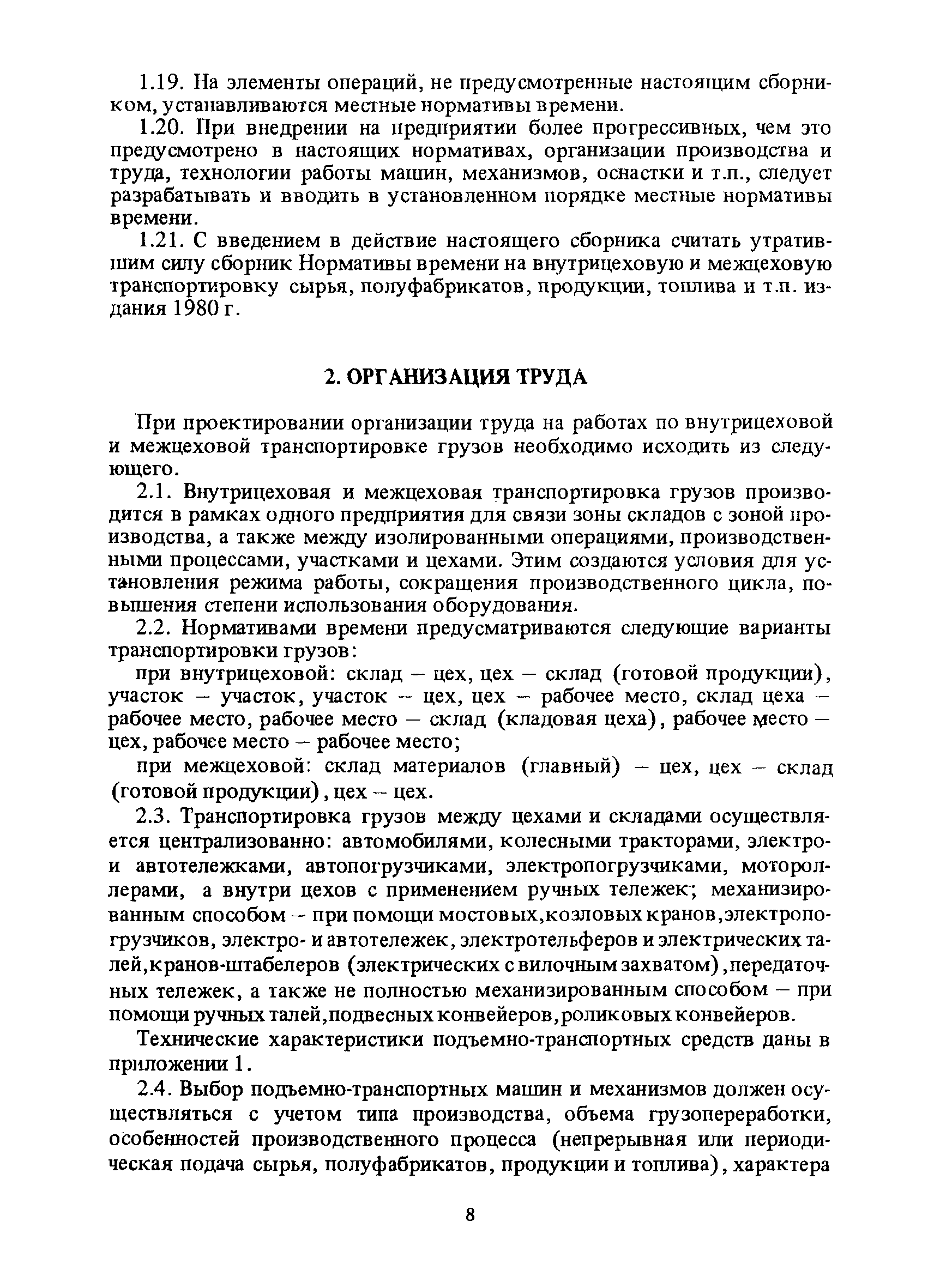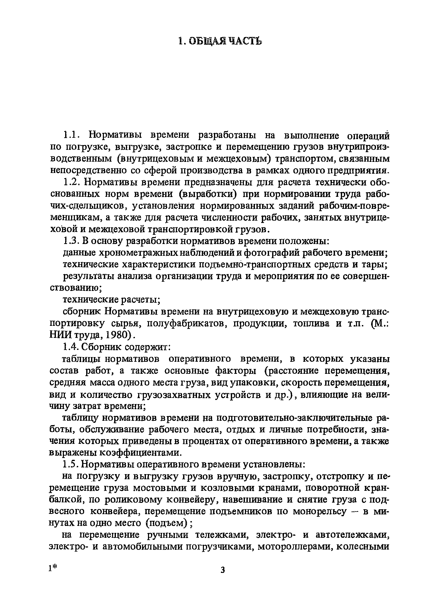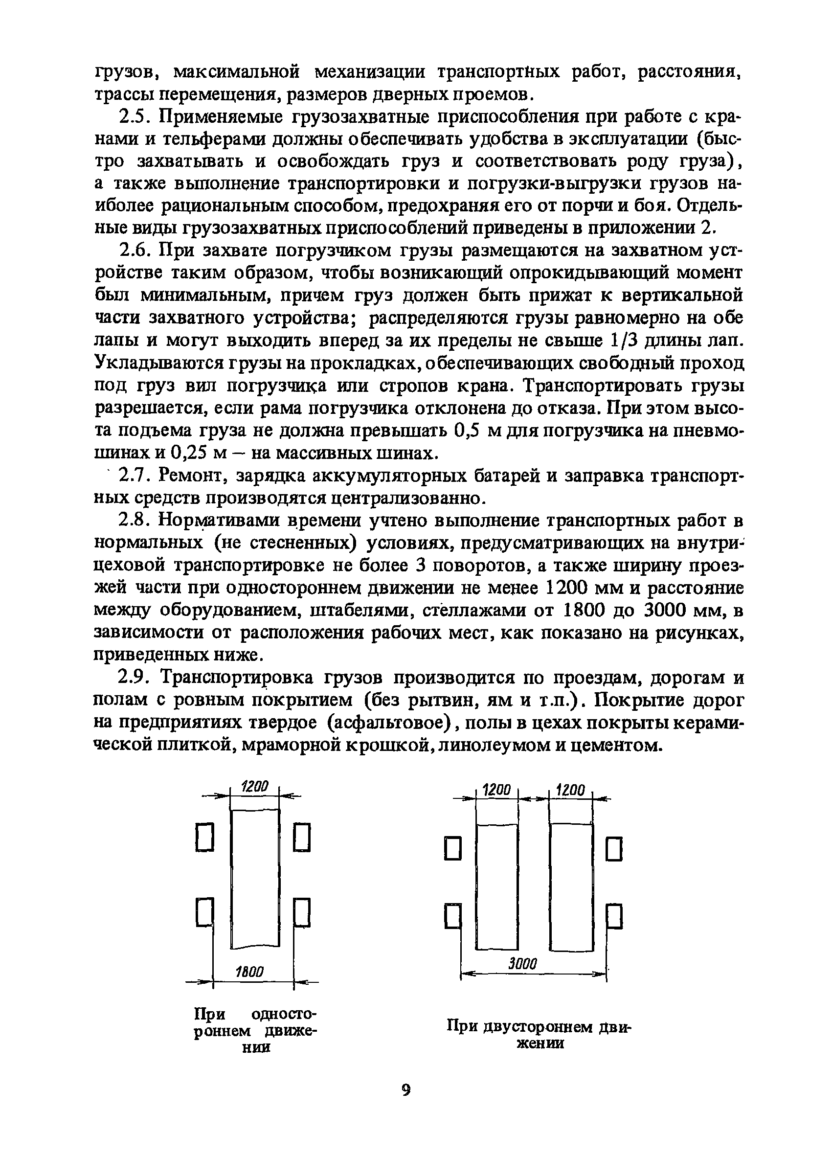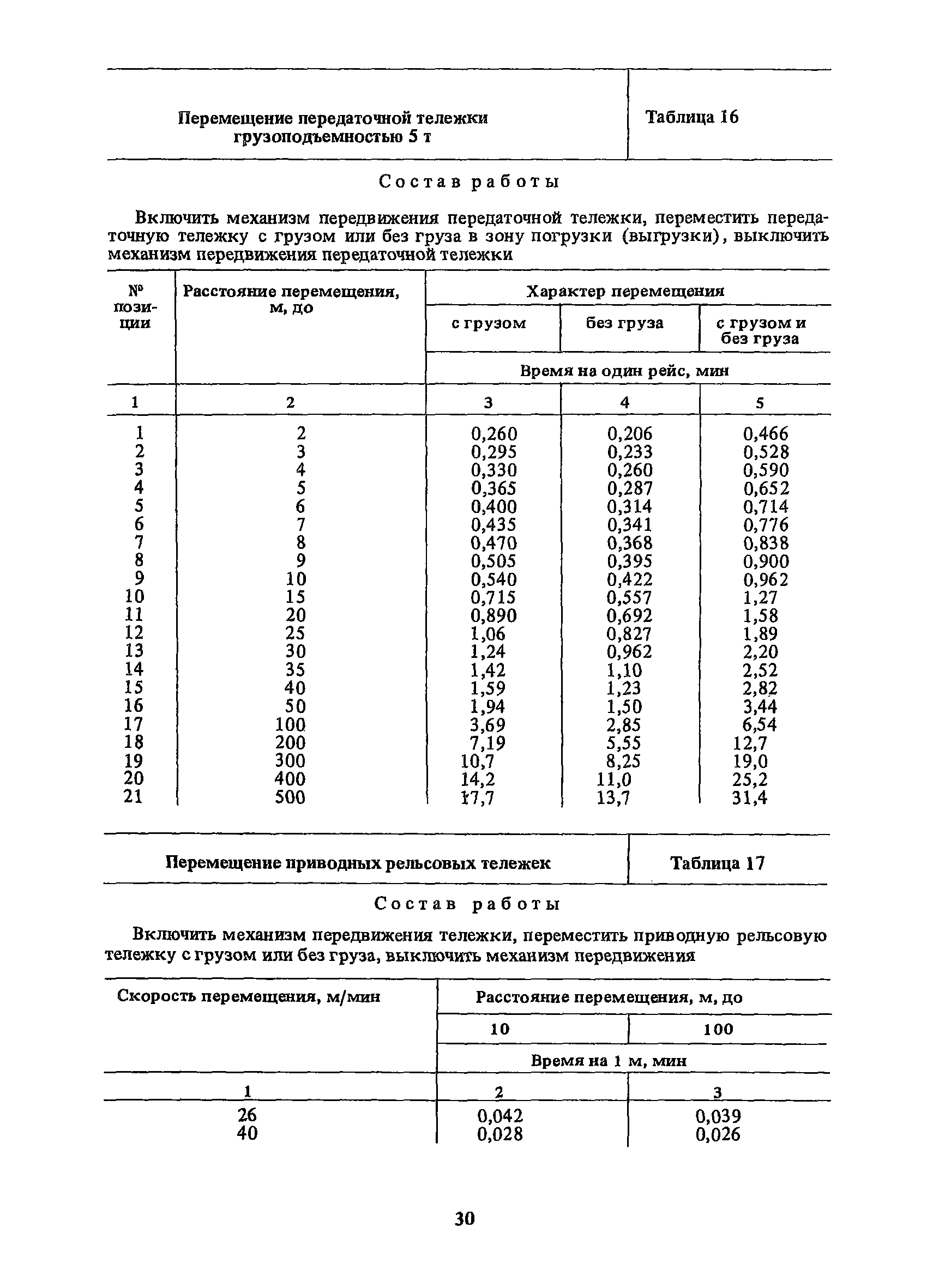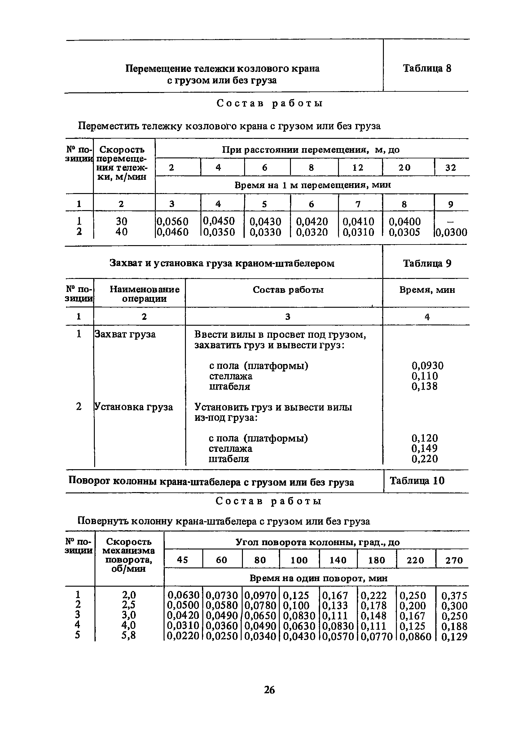Нормативы времени на внутрицеховую и межцеховую транспортировку грузов| Статус: | утратил силу | | Название рус.: | Нормативы времени на внутрицеховую и межцеховую транспортировку грузов | | Дата добавления в базу: | 01.09.2013 | | Дата актуализации: | 01.01.2021 | | Область применения: | Нормативы времени разработаны на выполнение операций по погрузке, выгрузке, застропке и перемещению грузов внутрипроизводственным (внутрицеховым и межцеховым) транспортом, связанным непосредственно со сферой производства в рамках одного предприятия. Нормативы времени предназначены для расчета технически обоснованных норм времени (выработки) при нормировании труда рабочих-сдельщиков, установления нормированных заданий рабочим-повременщикам, а также дни расчета численности рабочих, занятых внутрицеховой и межцеховой транспортировкой грузов. | | Оглавление: | 1. Общая часть 2. Организация труда 3. Примеры расчета норм времени, выработки и численности по нормативам времени 4. Нормативная часть Таблица 1. Застропка и отстропка груза грузозахватным устройством Таблица 2. Перемещение груза мостовым краном Таблица 3. Перемещение мостового крана без груза Таблица 4. Застропка, отстропка грузов и перемещение их мостовыми кранами Таблица 5. Перемещение тележки мостового крана с грузом или без груза Таблица 6. Перемещение груза козловым краном Таблица 7. Перемещение козлового крана без груза Таблица 8. Перемещение тележки козлового крана с грузом или без груза Таблица 9. Захват и установка груза краном-штабелером Таблица 10. Поворот колонны крана-штабелера с грузом или без груза Таблица 11. Перемещение моста крана-штабелера с грузом или без груза Таблица 12. Перемещение тележки крана-штабелера с грузом или без груза Таблица 13. Подъем или опускание вил крана-штабелера Таблица 14. Перемещение электроталей (электротельферов) с грузом и без груза Таблица 15. Перемещение ручной тали с грузом и без груза Таблица 16. Перемещение передаточной тележки грузоподъемностью 5 т Таблица 17. Перемещение приводных рельсовых тележек Таблица 18. Перемещение груза по роликовому конвейеру вручную Таблица 19. Навешивание на подвесной конвейер и снятие груза вручную Таблица 20. Погрузка или выгрузка грузов вручную Таблица 21. Перемещение ручных тележек с грузом Таблица 22. Перемещение ручных тележек без груза Таблица 23. Перемещение ручных тележек с грузом и без груза Таблица 24. Перемещение электротележек, автотележек и мотороллера Таблица 25. Перемещение авто- и электропогрузчиков Таблица 26. Перемещение колесного трактора с прицепной тележкой Таблица 27. Перемещение грузового автомобиля Таблица 28. Перемещение подъемников по монорельсу вручную Таблица 29. Погрузка или выгрузка в подъемник (лифт) транспортного средства Таблица 30. Застропка, отстропка и перемещение грузов поворотной кран-балкой Таблица 31. Оформление сопроводительных документов при выполнении транспортных работ Таблица 32. Время на подготовительно-заключительные работы, обслуживание рабочего места, отдыхи личные потребности Приложение 1. Характеристика применяемых подъемно-транспортных средств Приложение 2. Универсальные сборные грузозахватные приспособления Приложение 3. Технические характеристики основных типов производственной тары внутризаводского применения | | Разработан: | Министерство энергетики и электрификации СС