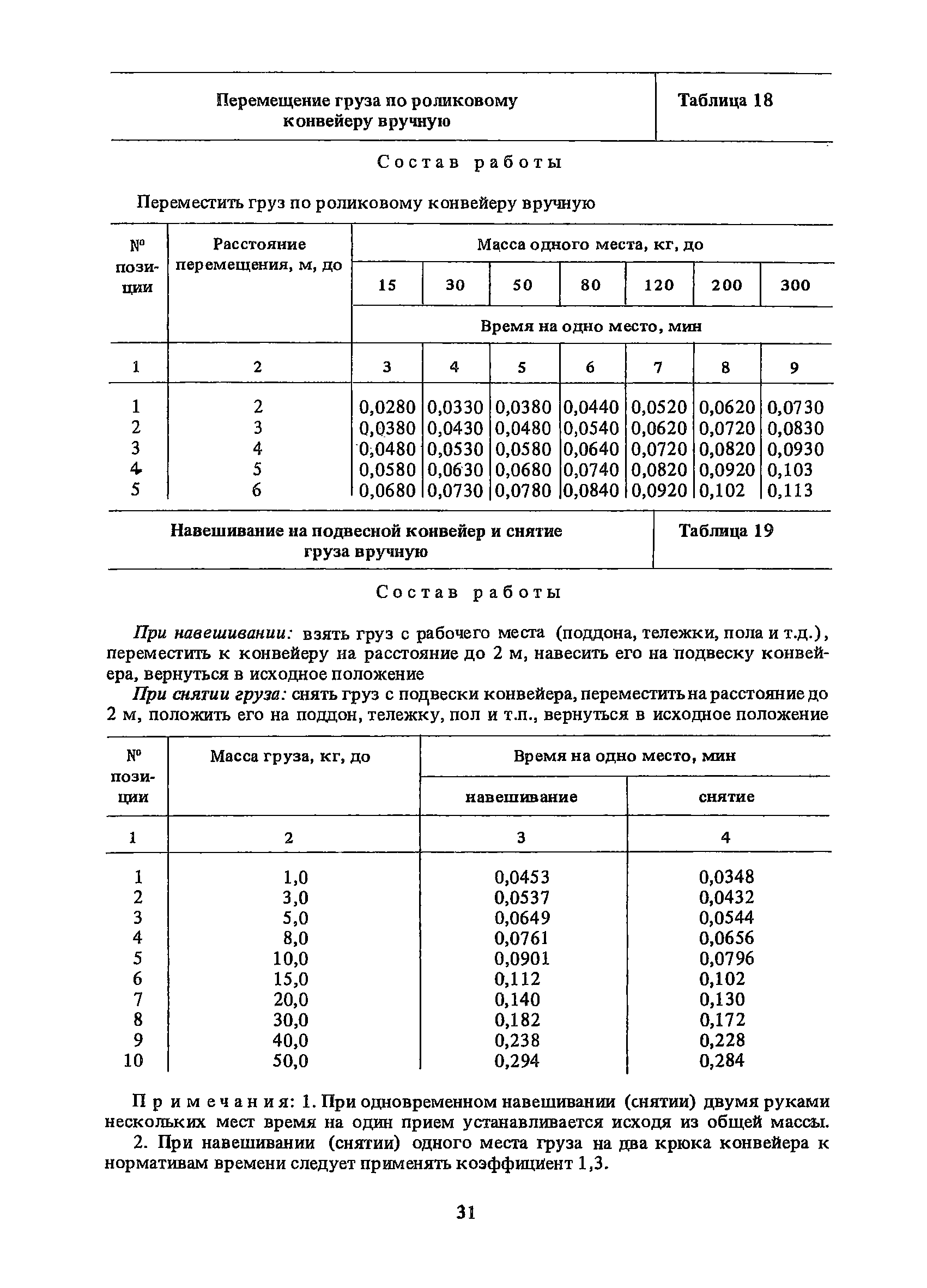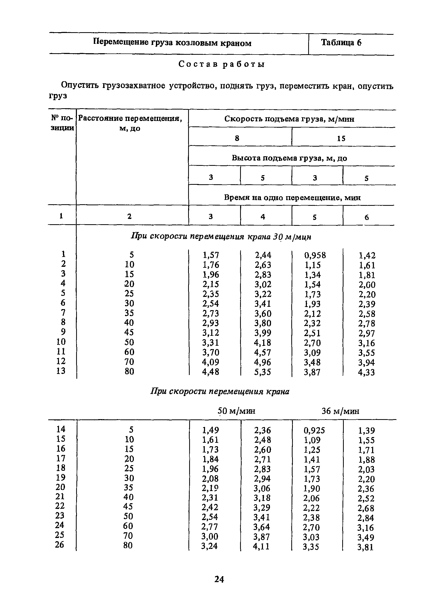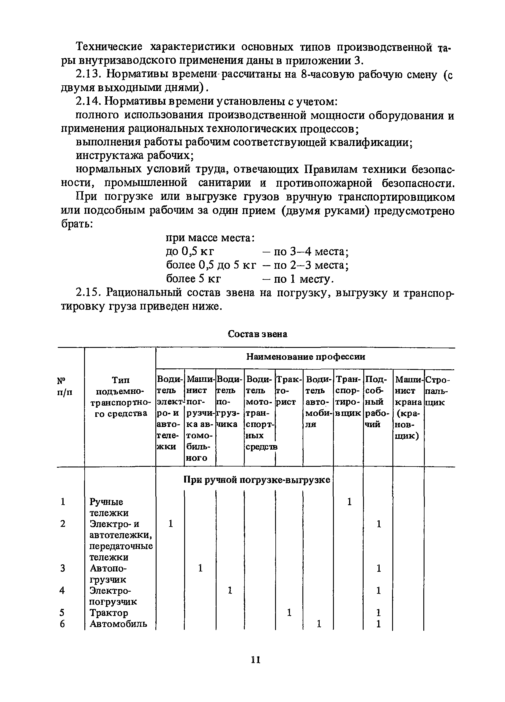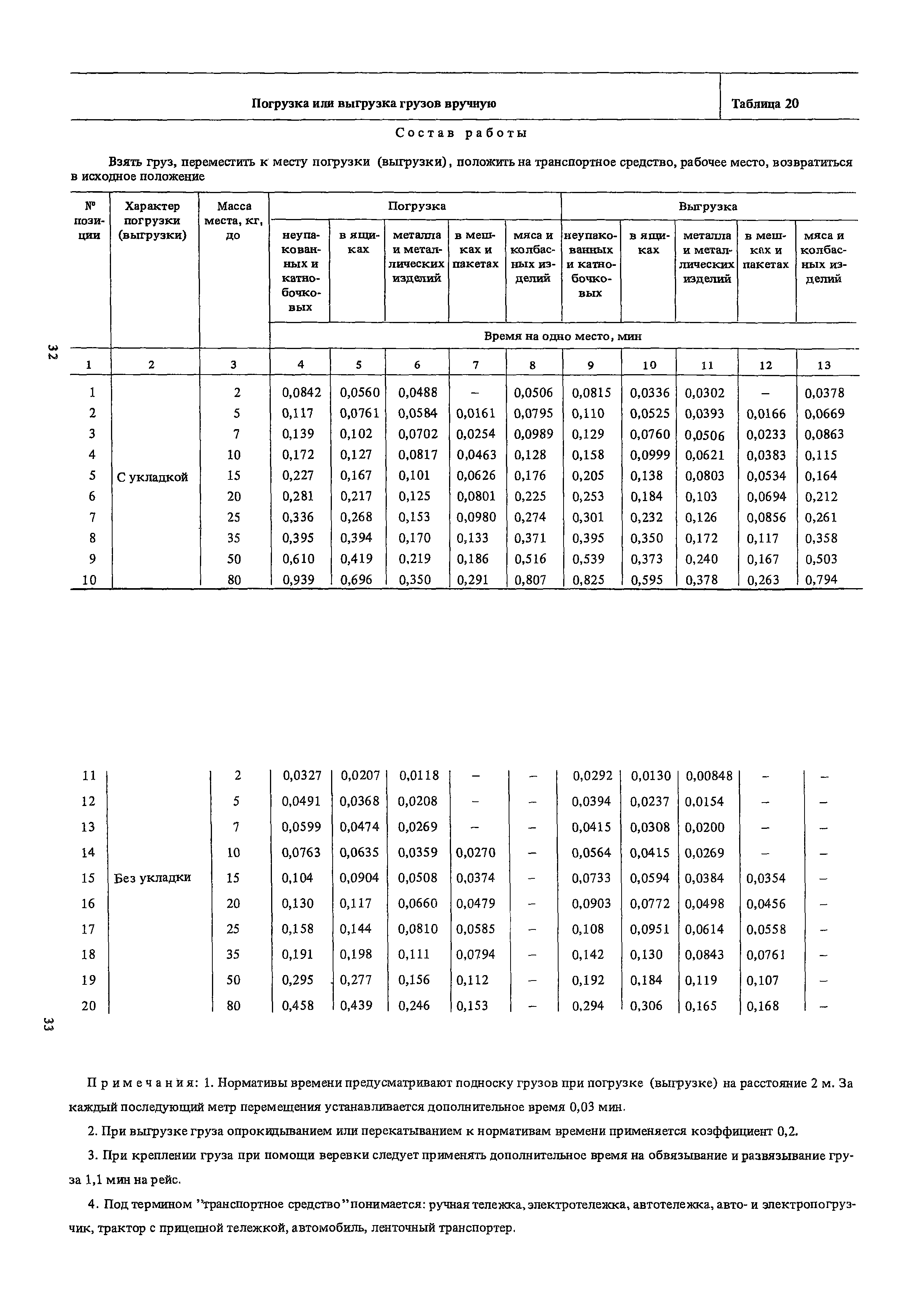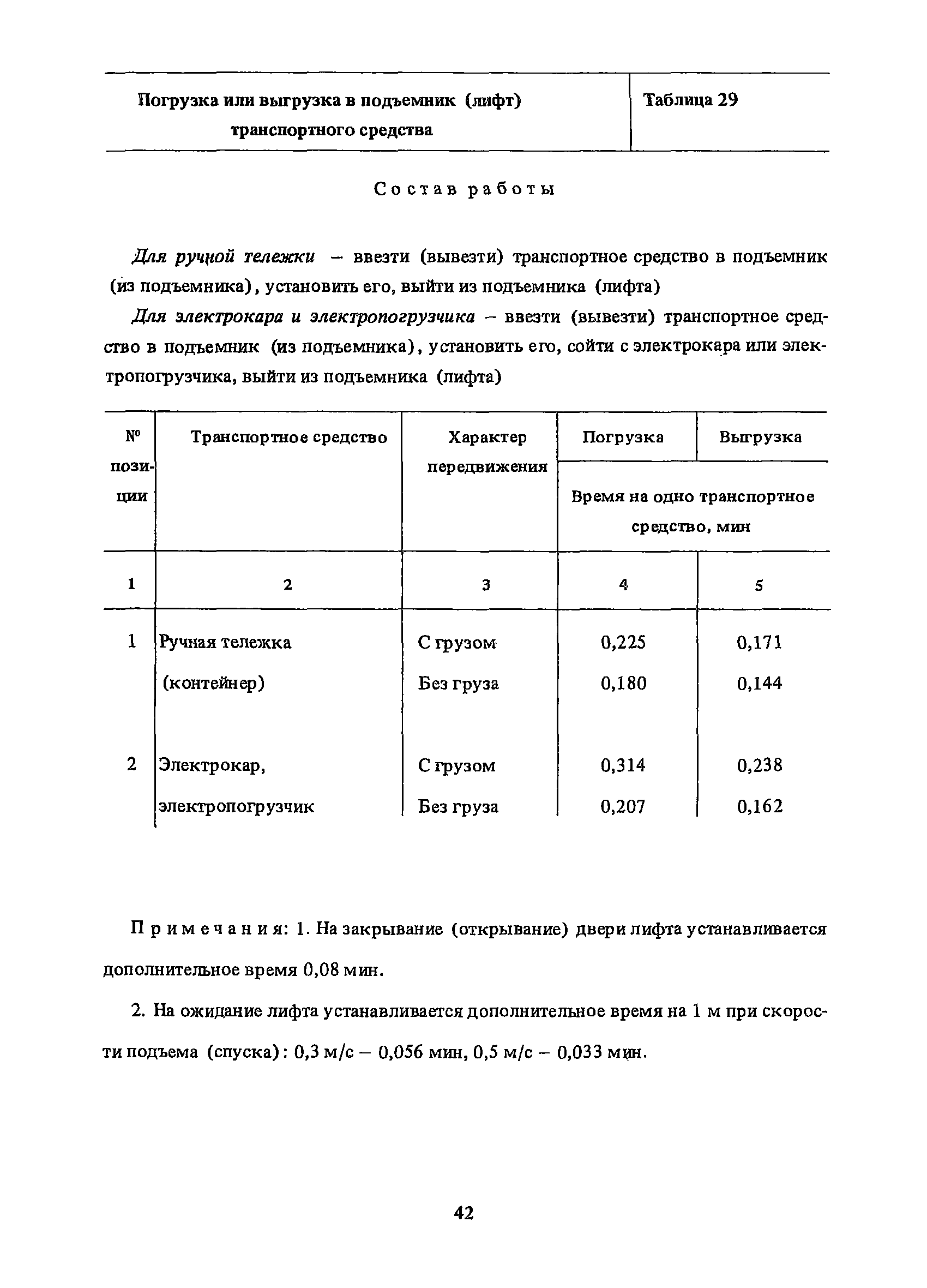 Нормативы времени на внутрицеховую и межцеховую транспортировку грузов| Статус: | утратил силу | | Название рус.: | Нормативы времени на внутрицеховую и межцеховую транспортировку грузов | | Дата добавления в базу: | 01.09.2013 | | Дата актуализации: | 01.01.2021 | | Область применения: | Нормативы времени разработаны на выполнение операций по погрузке, выгрузке, застропке и перемещению грузов внутрипроизводственным (внутрицеховым и межцеховым) транспортом, связанным непосредственно со сферой производства в рамках одного предприятия. Нормативы времени предназначены для расчета технически обоснованных норм времени (выработки) при нормировании труда рабочих-сдельщиков, установления нормированных заданий рабочим-повременщикам, а также дни расчета численности рабочих, занятых внутрицеховой и межцеховой транспортировкой грузов. | | Оглавление: | 1. Общая часть 2. Организация труда 3. Примеры расчета норм времени, выработки и численности по нормативам времени 4. Нормативная часть Таблица 1. Застропка и отстропка груза грузозахватным устройством Таблица 2. Перемещение груза мостовым краном Таблица 3. Перемещение мостового крана без груза Таблица 4. Застропка, отстропка грузов и перемещение их мостовыми кранами Таблица 5. Перемещение тележки мостового крана с грузом или без груза Таблица 6. Перемещение груза козловым краном Таблица 7. Перемещение козлового крана без груза Таблица 8. Перемещение тележки козлового крана с грузом или без груза Таблица 9. Захват и установка груза краном-штабелером Таблица 10. Поворот колонны крана-штабелера с грузом или без груза Таблица 11. Перемещение моста крана-штабелера с грузом или без груза Таблица 12. Перемещение тележки крана-штабелера с грузом или без груза Таблица 13. Подъем или опускание вил крана-штабелера Таблица 14. Перемещение электроталей (электротельферов) с грузом и без груза Таблица 15. Перемещение ручной тали с грузом и без груза Таблица 16. Перемещение передаточной тележки грузоподъемностью 5 т Таблица 17. Перемещение приводных рельсовых тележек Таблица 18. Перемещение груза по роликовому конвейеру вручную Таблица 19. Навешивание на подвесной конвейер и снятие груза вручную Таблица 20. Погрузка или выгрузка грузов вручную Таблица 21. Перемещение ручных тележек с грузом Таблица 22. Перемещение ручных тележек без груза Таблица 23. Перемещение ручных тележек с грузом и без груза Таблица 24. Перемещение электротележек, автотележек и мотороллера Таблица 25. Перемещение авто- и электропогрузчиков Таблица 26. Перемещение колесного трактора с прицепной тележкой Таблица 27. Перемещение грузового автомобиля Таблица 28. Перемещение подъемников по монорельсу вручную Таблица 29. Погрузка или выгрузка в подъемник (лифт) транспортного средства Таблица 30. Застропка, отстропка и перемещение грузов поворотной кран-балкой Таблица 31. Оформление сопроводительных документов при выполнении транспортных работ Таблица 32. Время на подготовительно-заключительные работы, обслуживание рабочего места, отдыхи личные потребности Приложение 1. Характеристика применяемых подъемно-транспортных средств Приложение 2. Универсальные сборные грузозахватные приспособления Приложение 3. Технические характеристики основных типов производственной тары внутризаводского применения | | Разработан: | Министерство энергетики и электрификации СС