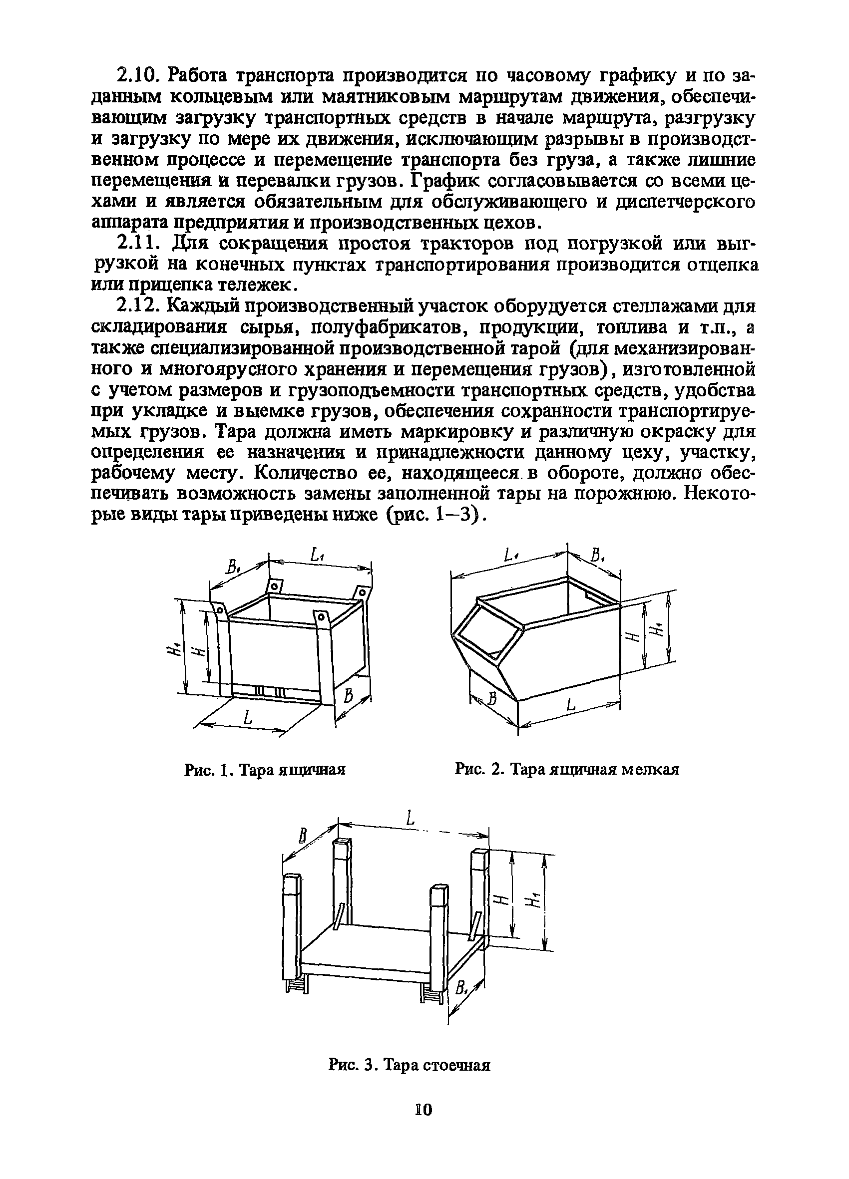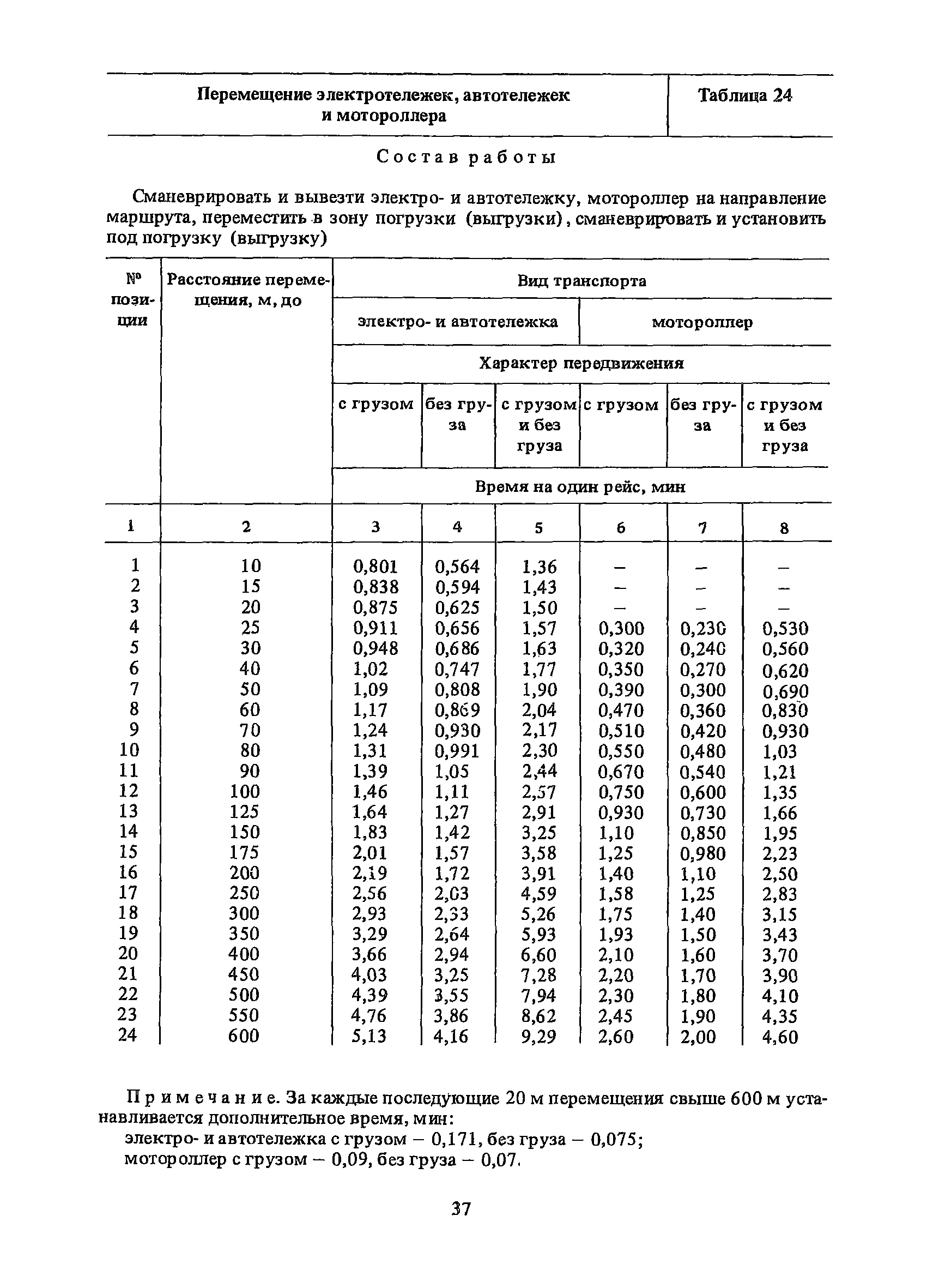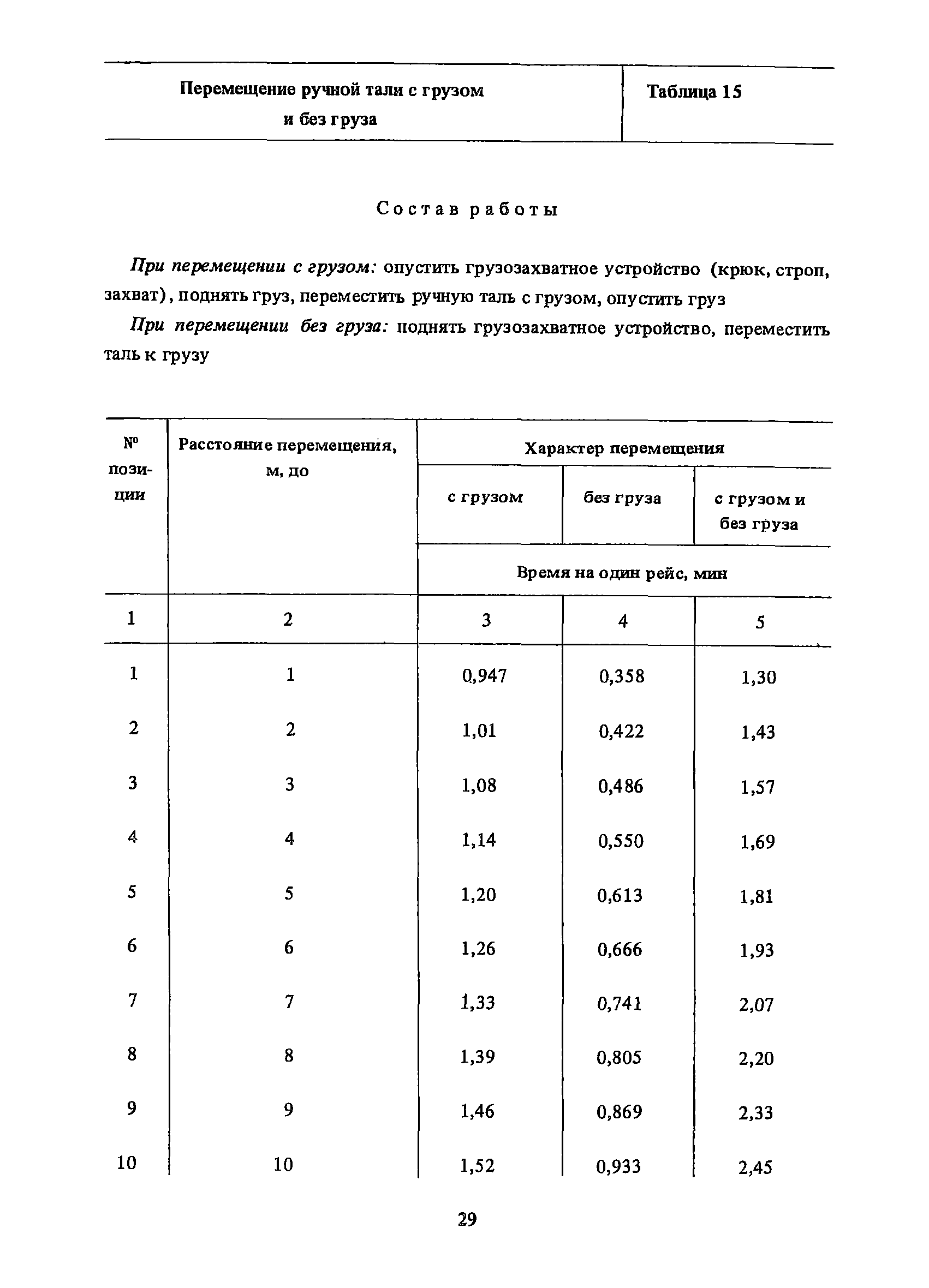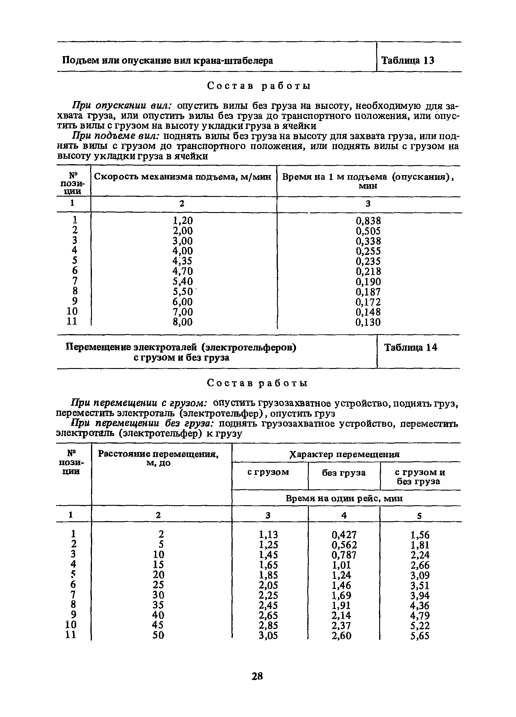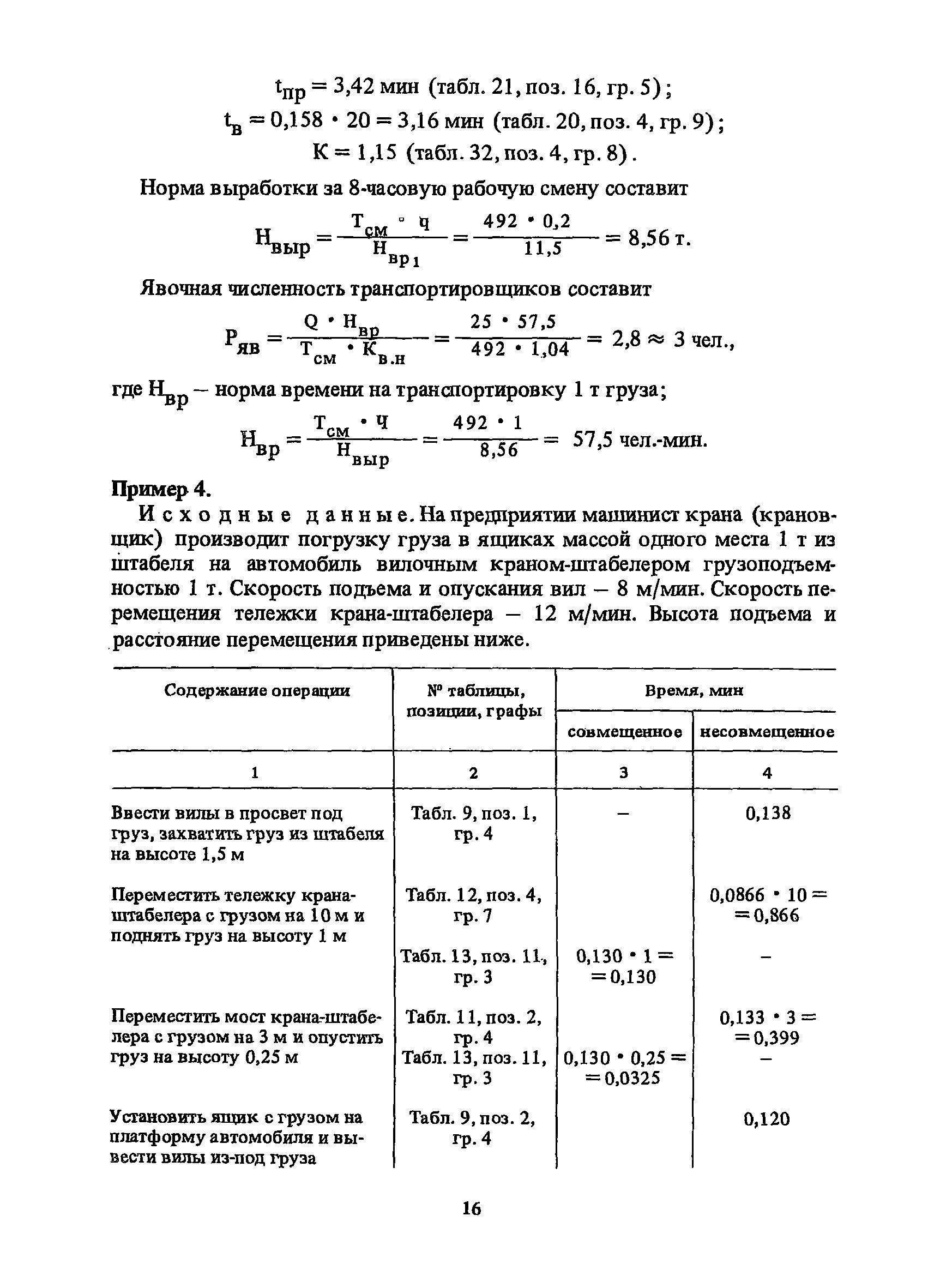 Нормативы времени на внутрицеховую и межцеховую транспортировку грузов| Статус: | утратил силу | | Название рус.: | Нормативы времени на внутрицеховую и межцеховую транспортировку грузов | | Дата добавления в базу: | 01.09.2013 | | Дата актуализации: | 01.01.2021 | | Область применения: | Нормативы времени разработаны на выполнение операций по погрузке, выгрузке, застропке и перемещению грузов внутрипроизводственным (внутрицеховым и межцеховым) транспортом, связанным непосредственно со сферой производства в рамках одного предприятия. Нормативы времени предназначены для расчета технически обоснованных норм времени (выработки) при нормировании труда рабочих-сдельщиков, установления нормированных заданий рабочим-повременщикам, а также дни расчета численности рабочих, занятых внутрицеховой и межцеховой транспортировкой грузов. | | Оглавление: | 1. Общая часть 2. Организация труда 3. Примеры расчета норм времени, выработки и численности по нормативам времени 4. Нормативная часть Таблица 1. Застропка и отстропка груза грузозахватным устройством Таблица 2. Перемещение груза мостовым краном Таблица 3. Перемещение мостового крана без груза Таблица 4. Застропка, отстропка грузов и перемещение их мостовыми кранами Таблица 5. Перемещение тележки мостового крана с грузом или без груза Таблица 6. Перемещение груза козловым краном Таблица 7. Перемещение козлового крана без груза Таблица 8. Перемещение тележки козлового крана с грузом или без груза Таблица 9. Захват и установка груза краном-штабелером Таблица 10. Поворот колонны крана-штабелера с грузом или без груза Таблица 11. Перемещение моста крана-штабелера с грузом или без груза Таблица 12. Перемещение тележки крана-штабелера с грузом или без груза Таблица 13. Подъем или опускание вил крана-штабелера Таблица 14. Перемещение электроталей (электротельферов) с грузом и без груза Таблица 15. Перемещение ручной тали с грузом и без груза Таблица 16. Перемещение передаточной тележки грузоподъемностью 5 т Таблица 17. Перемещение приводных рельсовых тележек Таблица 18. Перемещение груза по роликовому конвейеру вручную Таблица 19. Навешивание на подвесной конвейер и снятие груза вручную Таблица 20. Погрузка или выгрузка грузов вручную Таблица 21. Перемещение ручных тележек с грузом Таблица 22. Перемещение ручных тележек без груза Таблица 23. Перемещение ручных тележек с грузом и без груза Таблица 24. Перемещение электротележек, автотележек и мотороллера Таблица 25. Перемещение авто- и электропогрузчиков Таблица 26. Перемещение колесного трактора с прицепной тележкой Таблица 27. Перемещение грузового автомобиля Таблица 28. Перемещение подъемников по монорельсу вручную Таблица 29. Погрузка или выгрузка в подъемник (лифт) транспортного средства Таблица 30. Застропка, отстропка и перемещение грузов поворотной кран-балкой Таблица 31. Оформление сопроводительных документов при выполнении транспортных работ Таблица 32. Время на подготовительно-заключительные работы, обслуживание рабочего места, отдыхи личные потребности Приложение 1. Характеристика применяемых подъемно-транспортных средств Приложение 2. Универсальные сборные грузозахватные приспособления Приложение 3. Технические характеристики основных типов производственной тары внутризаводского применения | | Разработан: | Министерство энергетики и электрификации СС