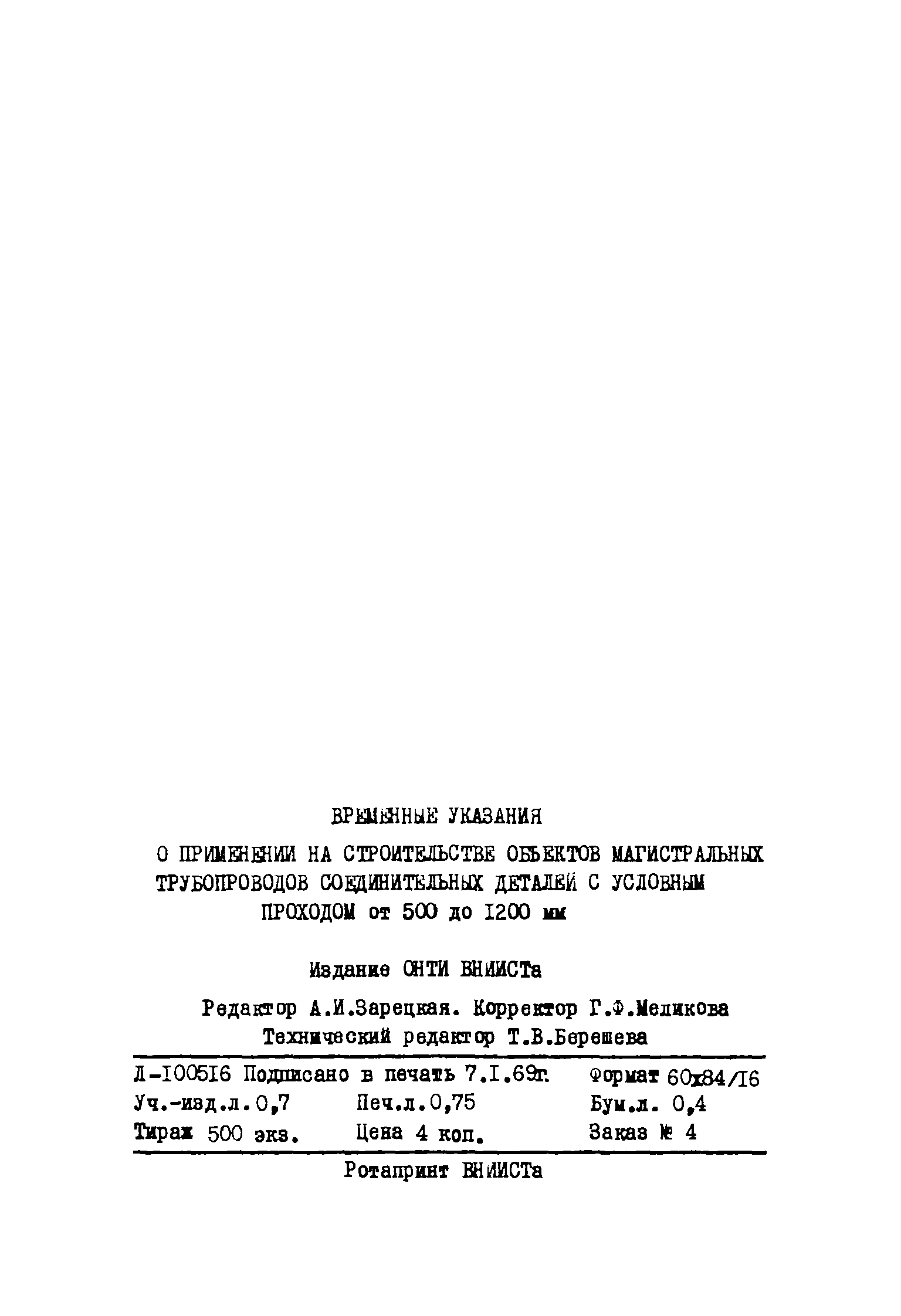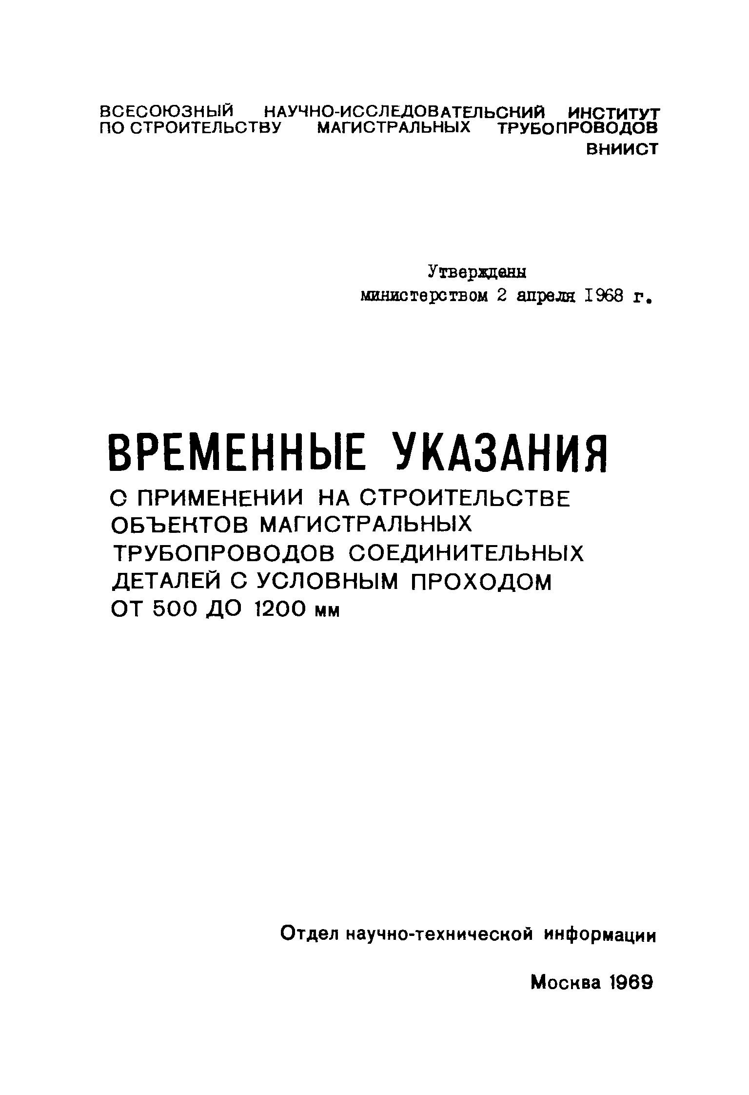 | Название рус.: | Временные указания о применении на строительстве объектов магистральных трубопроводов соединительных деталей с условным проходом от 500 до 1200 мм |