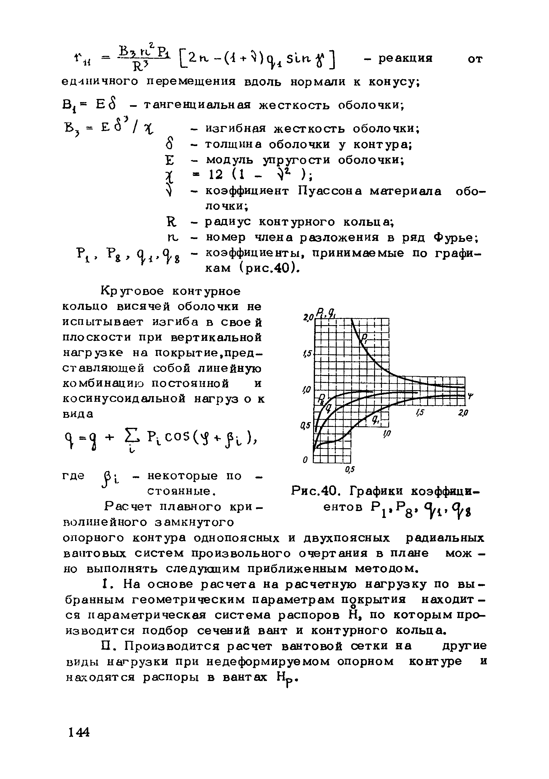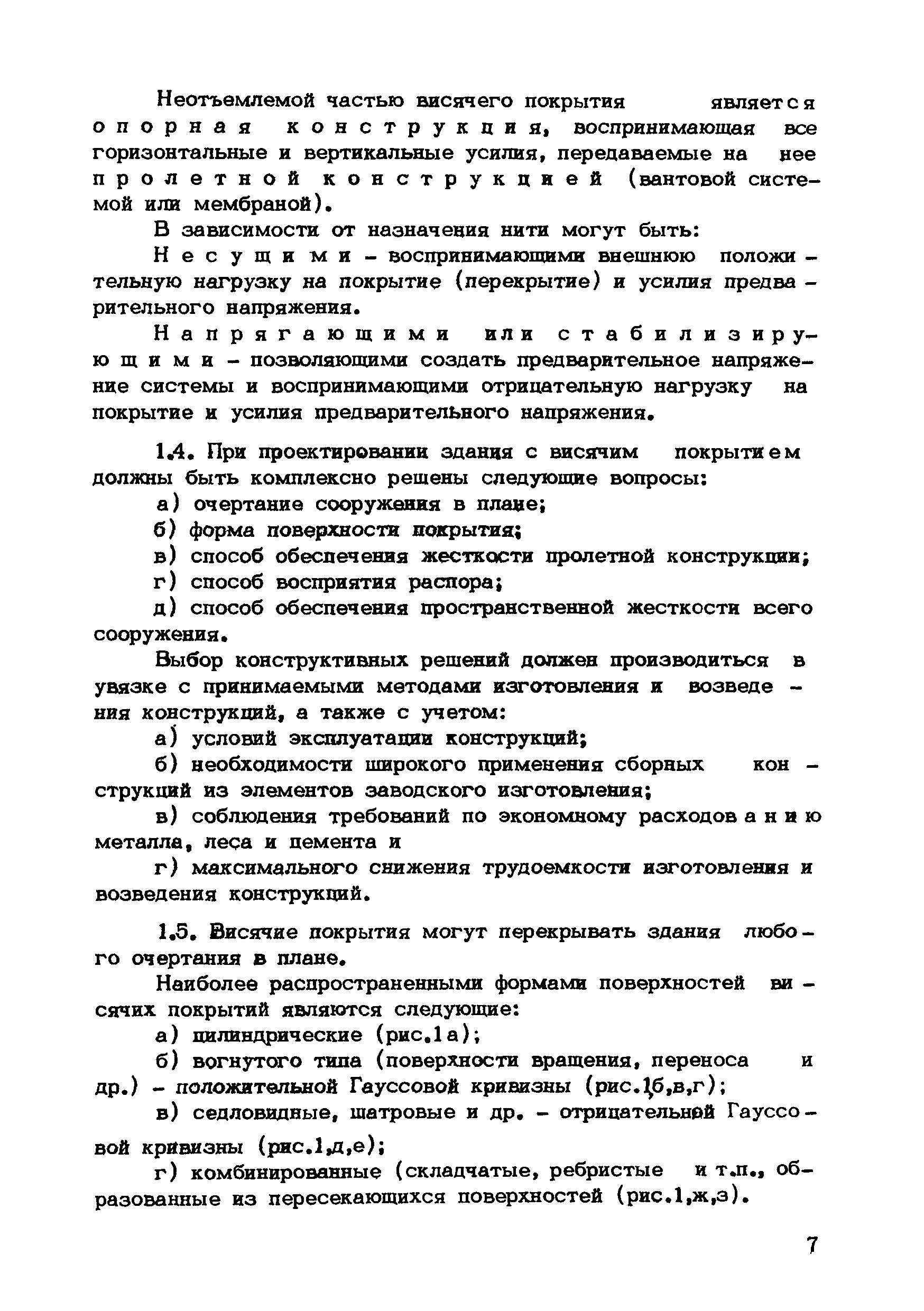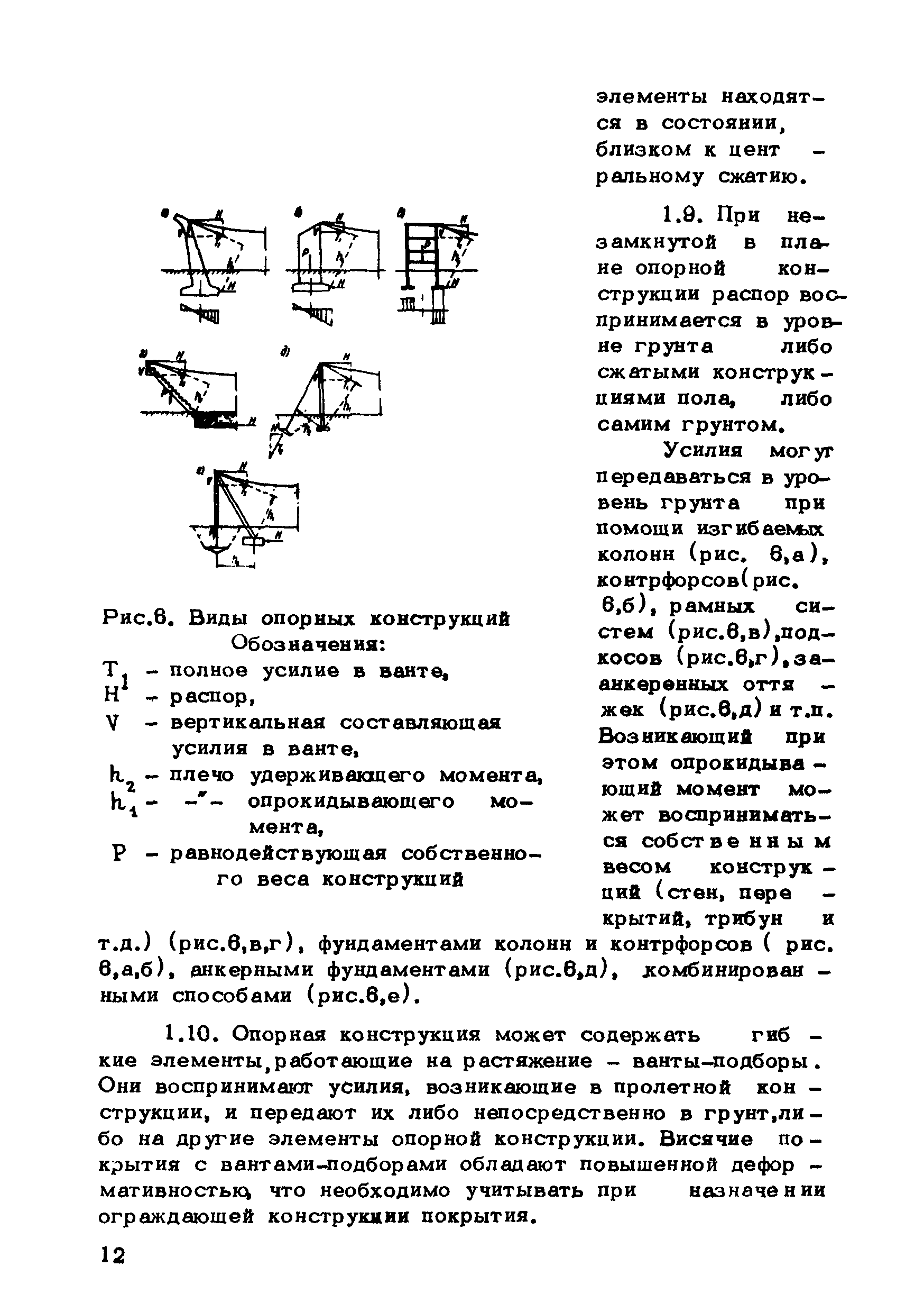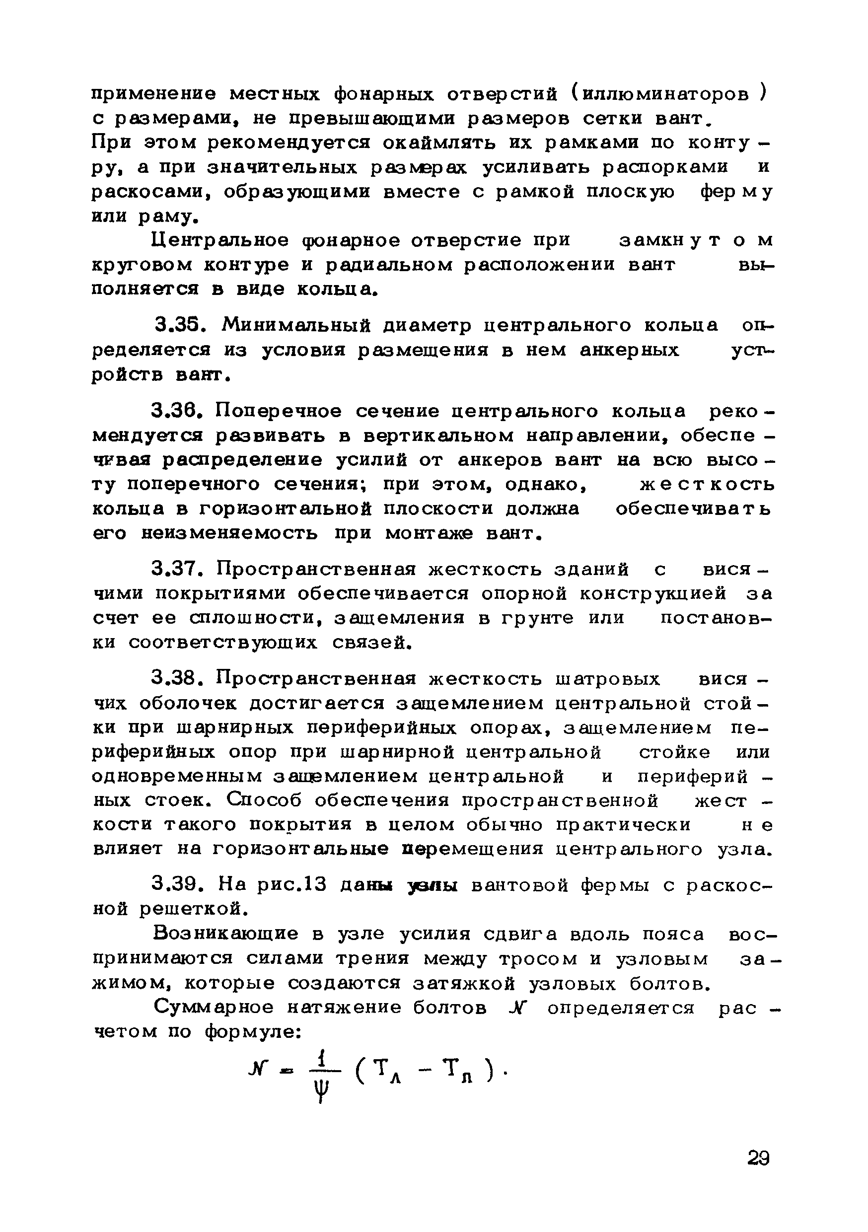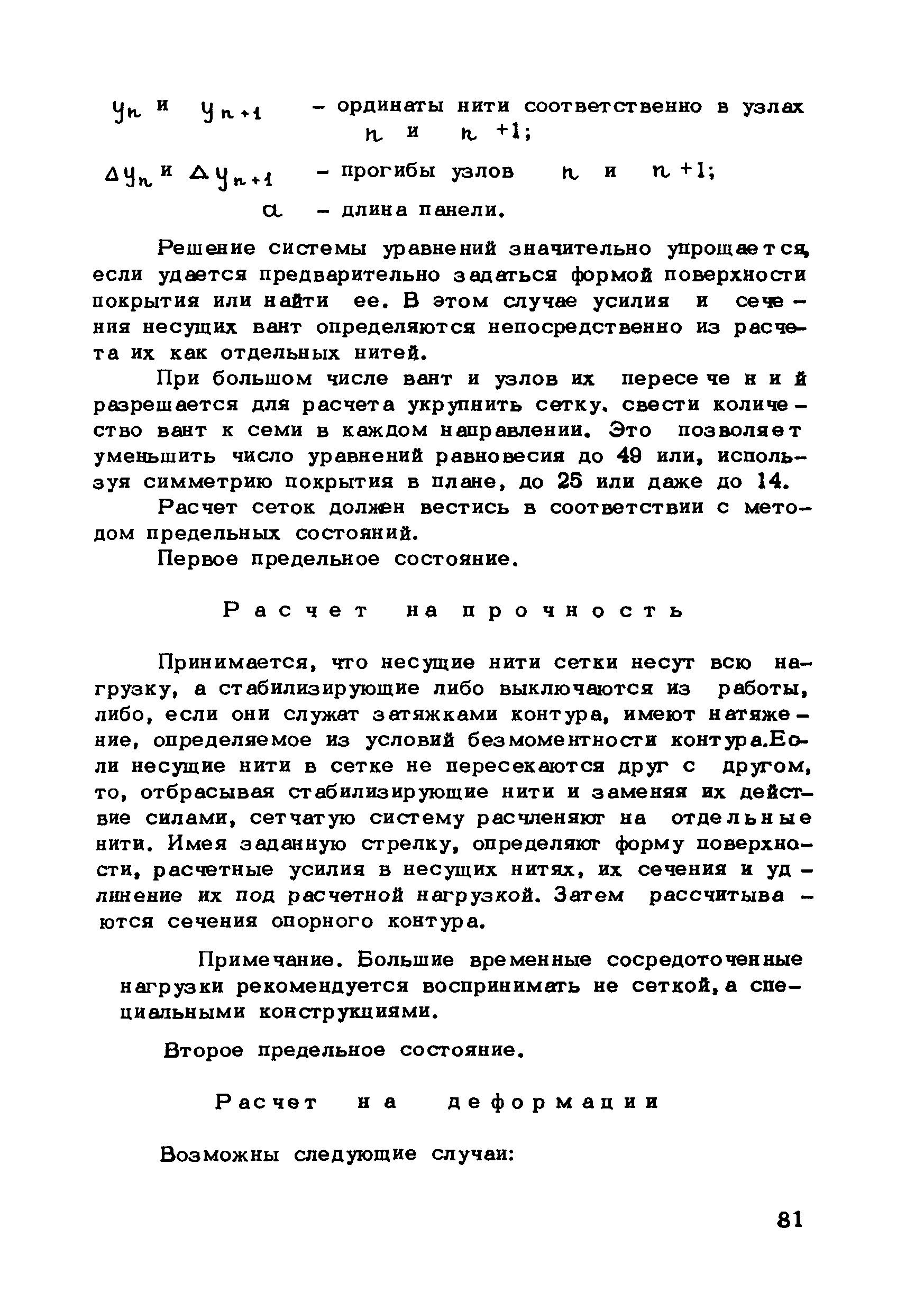 | Оглавление: | Предисловие 1. Общие указания 2. Материалы для висячих покрытий 3. Рекомендации по конструированию элементов и узлов висячих покрытий 4. Особенности возведения и изготовления элементов висячих покрытий 5. Основные расчетные положения 6. Расчет висячих покрытий а) Гибкая нить б) Расчет систем в) Расчет первоначально плоских круглых мембран на равномерную нагрузку г) Нити с изгибной жесткостью д) Опорные конструкции висячих покрытий Приложение 1. Формулы для определения характеристики D Приложение 2. Анкеровка вант с помощью гильзоклиновых анкеров Приложение 3. Анкеровка вант с заливкой во втулки Приложение 4. Данные по конструкции втулок Приложение 5. Расчет сжатой распорки в радиальном вантовом покрытии на устойчивость |