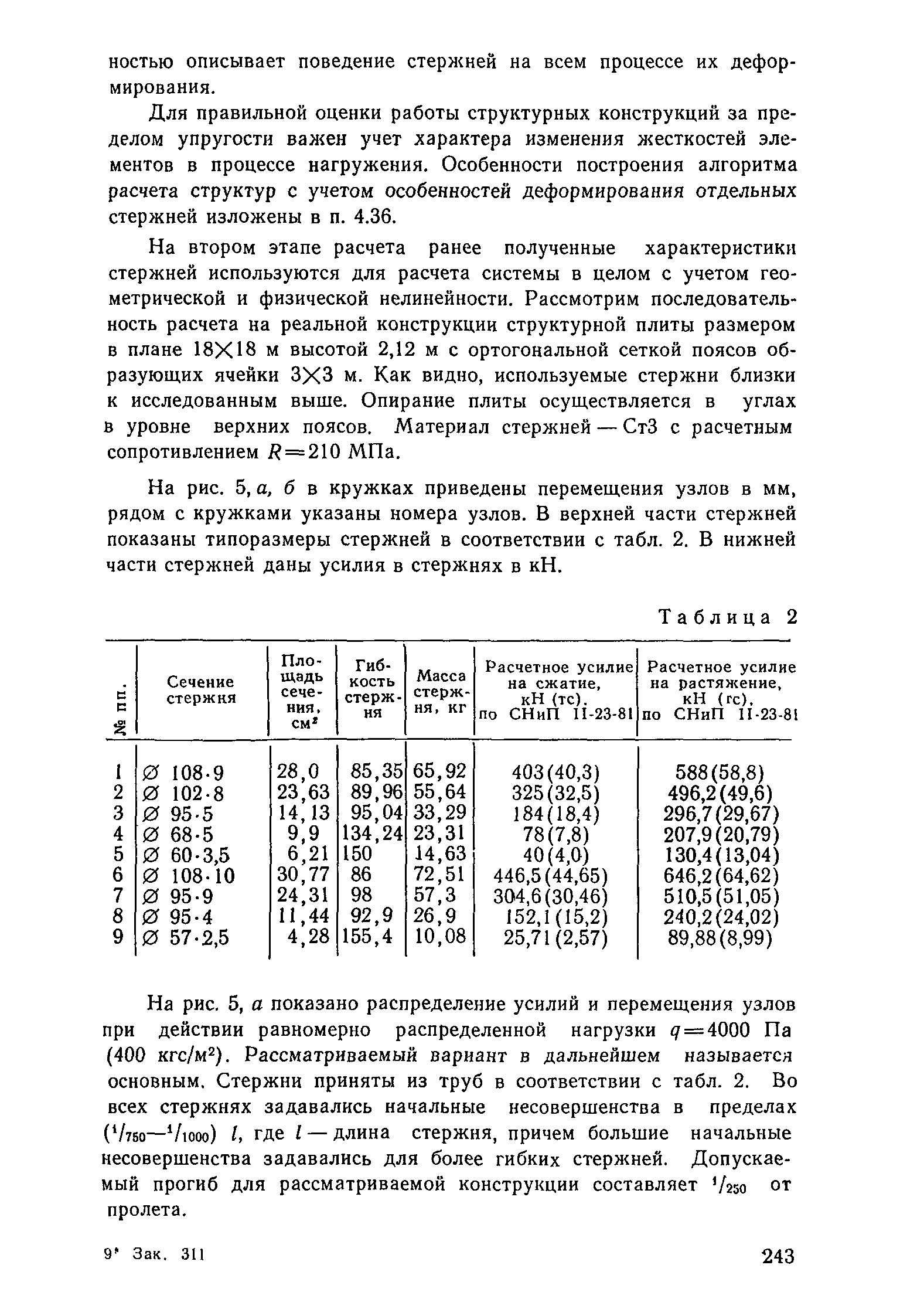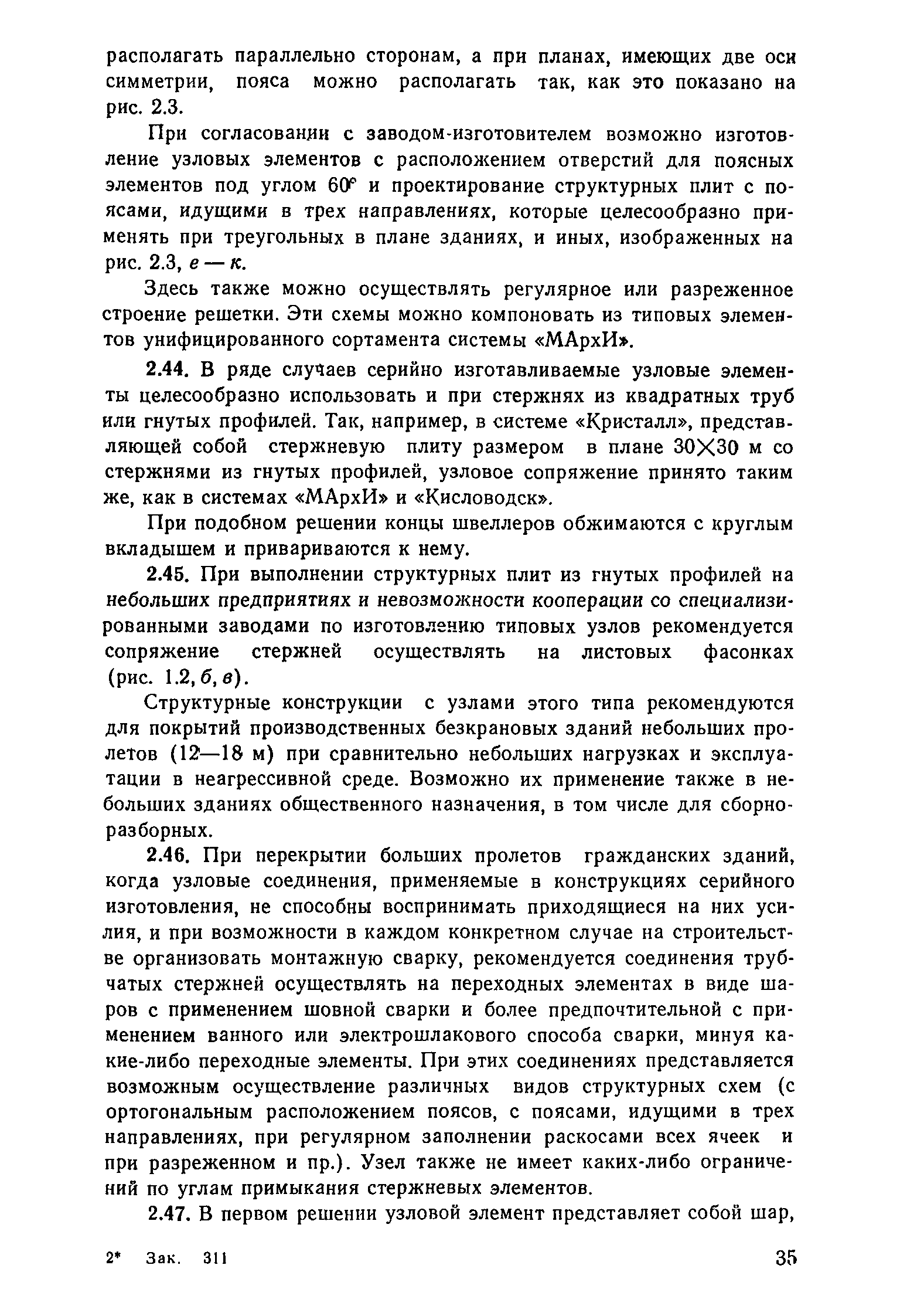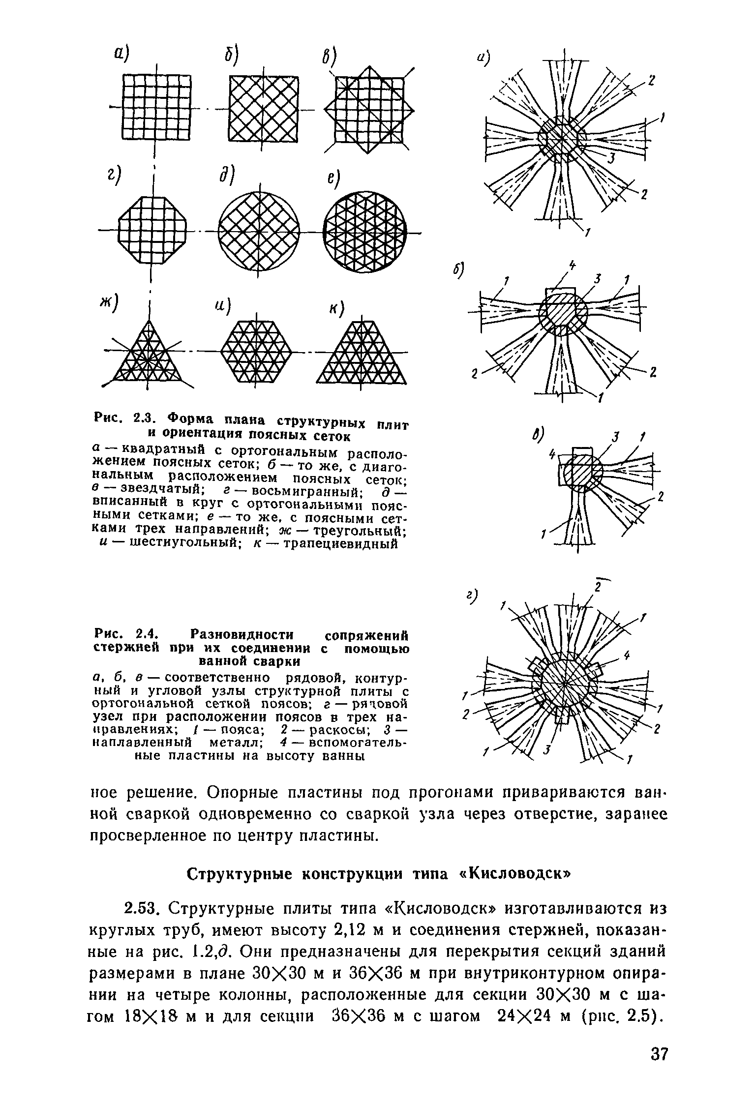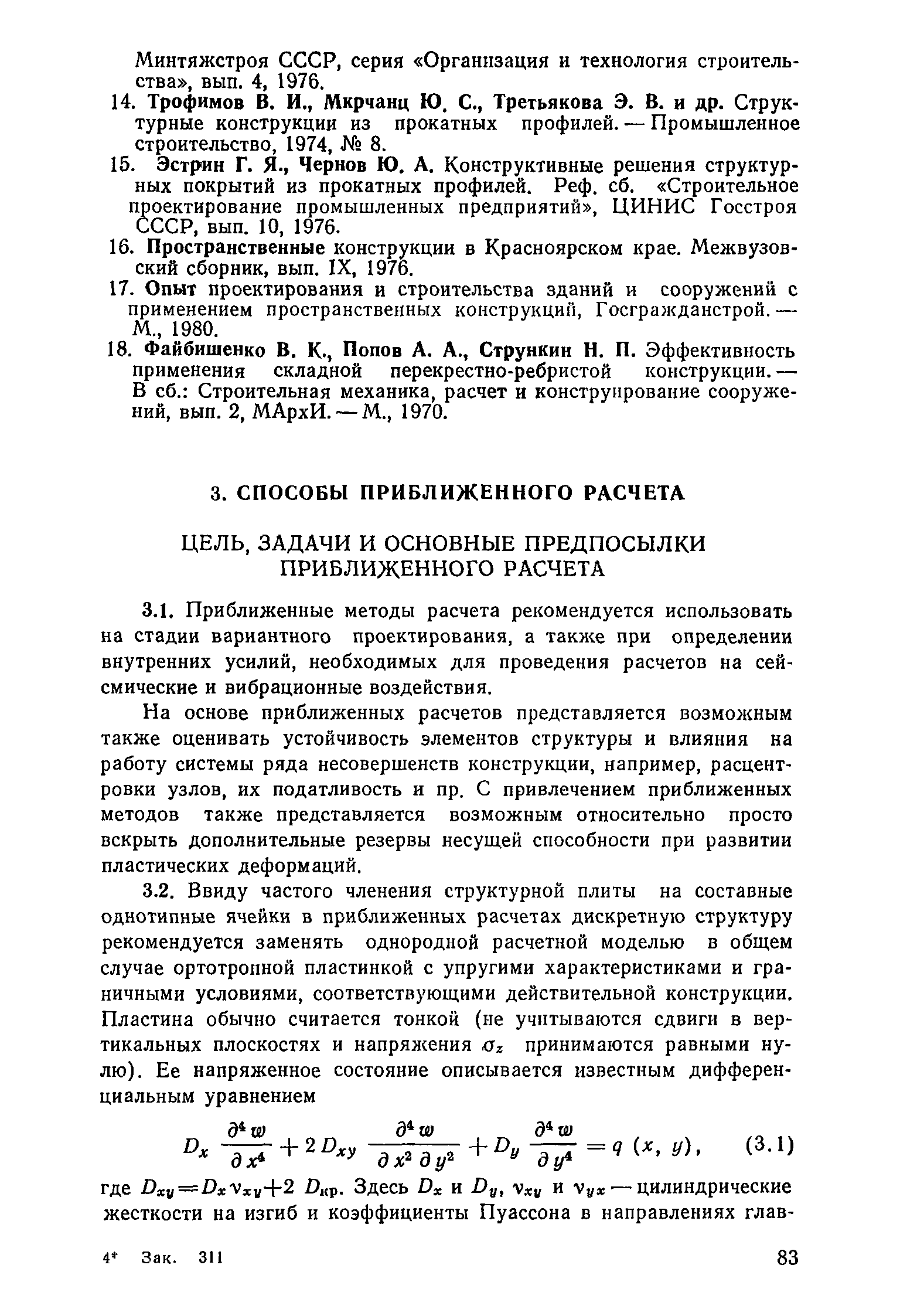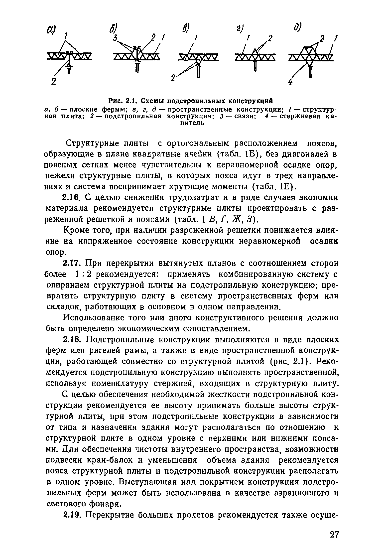Рекомендации по проектированию структурных конструкций| Статус: | справочные материалы, мп, тпр | | Название рус.: | Рекомендации по проектированию структурных конструкций | | Дата добавления в базу: | 01.09.2013 | | Дата актуализации: | 01.01.2021 | | Область применения: | Документ содержит положения по проектированию структурных конструкций, в том числе возводимых в сейсмических районах и районах с низкими температурами, а также при наличии вибрационных нагрузок. Даны рекомендации по выбору стержневых схем, узловых сопряжений и назначению оптимальных параметров структурных плит, изложены способы приближенных расчетов стержневой системы, а также расчетов с применением ЭВМ. Приведены наиболее характерные конструктивные решения структур массового и индивидуального применения. Освещены основные способы изготовления и монтажа, а также оценки экономической эффективности структурных конструкций. Даны примеры расчетов, методика моделирования и натурного эксперимента, проводимых на стадии проектирования, а также сведения в области развития конструктивных форм и методов расчета за рубежом. Для инженерно-технических работников проектных и научно-исследовательских организаций. | | Оглавление: | Предисловие 1. Стержневые схемы структур, их узловые сопряжения, рекомендации по назначению оптимальных параметров Характеристика структур Схемы структурных конструкций и их членение на отправочные марки Классификация узлов структурных конструкций Регулирование усилий в структурных плитах Границы назначения оптимальной по расходу материала высоты структурной плиты Основные положения по оптимальному проектированию структур 2. Конструкции структурных плит Общая часть Опирание структурных плит Структурные конструкции из стержневых элементов на одну ячейку Структурные конструкции типа "Кисловодск" Структурные конструкции из унифицированного сортамента системы "МАрхИ" Структурные конструкции с длинноразмерными поясами Типовые структурные конструкции из прокатных профилей системы "ЦНИИСК" Модификации типовых конструкций из прокатных профилей Структурные плиты из плоских ферм Структурные плиты из объемных стержневых пирамид Складываемые структурные конструкции Структурные плиты с включением неметаллических элементов Структурные конструкции с металлическими и деревянными элементами Структурные конструкции с применением железобетонных плит Особенности проектирования структурных конструкций для сейсмических районов и при наличии крышных вентиляторов Подбор сечений элементов структур Расчет на прочность и устойчивость Расчет по деформациям 3. Способы приближенного расчета Цель, задачи и основные предпосылки приближенного расчета Формулы упругих характеристик при аппроксимации стержневой системы ортотропной пластиной Методика расчета структур как трехслойной пластины со средним слоем конечной жесткости Влияние жесткости узлов на распределение внутренних усилий Расчет структурных конструкций с узловыми эксцентриситетами Оценка влияния податливости узловых сопряжений на напряженно-деформированное состояние конструкции Расчет сжатых стержней структуры на устойчивость Расчет структурной конструкции как перекрестной системы Особенности приближенного расчета многопролетных структур Расчет структурных конс