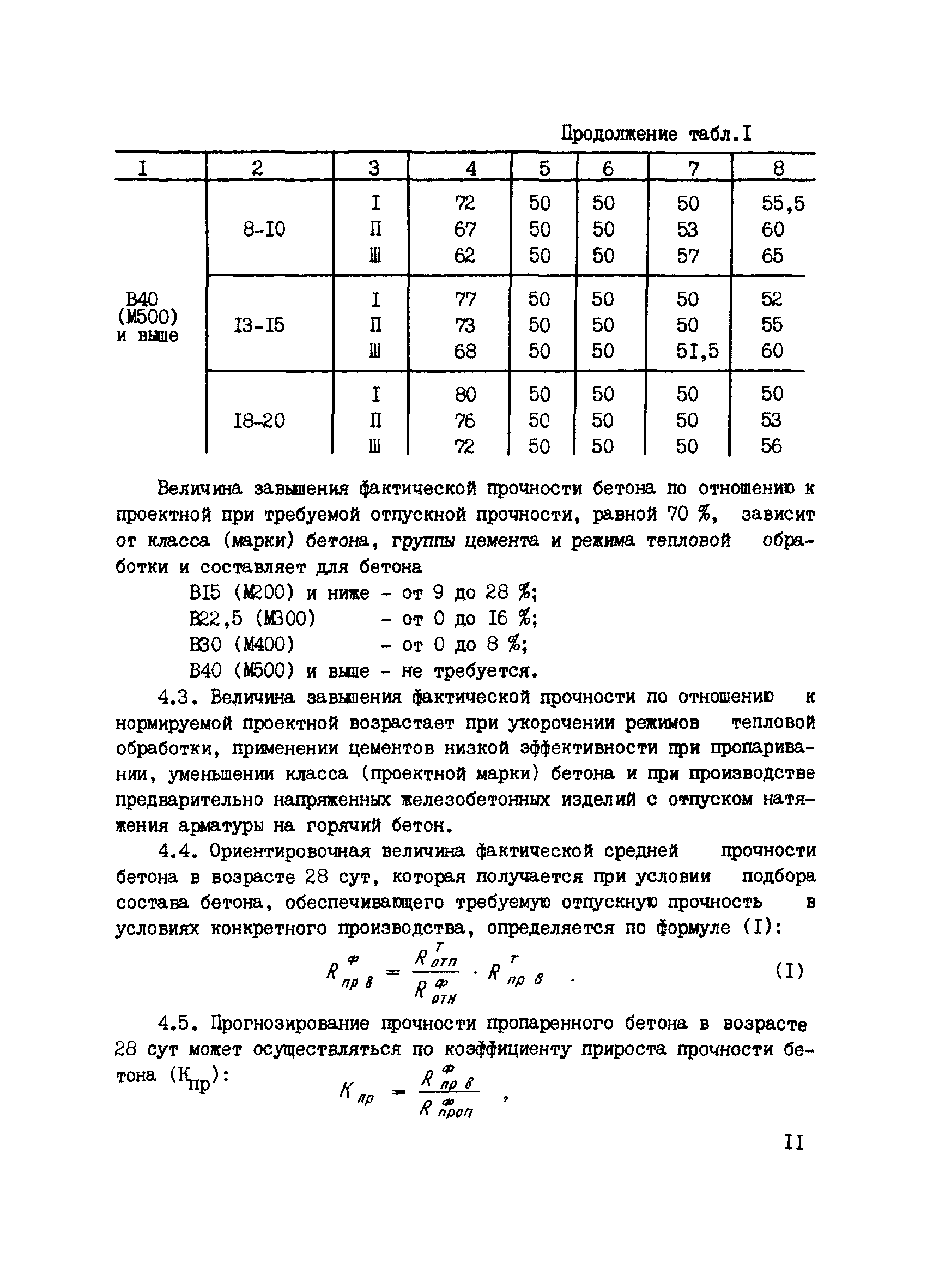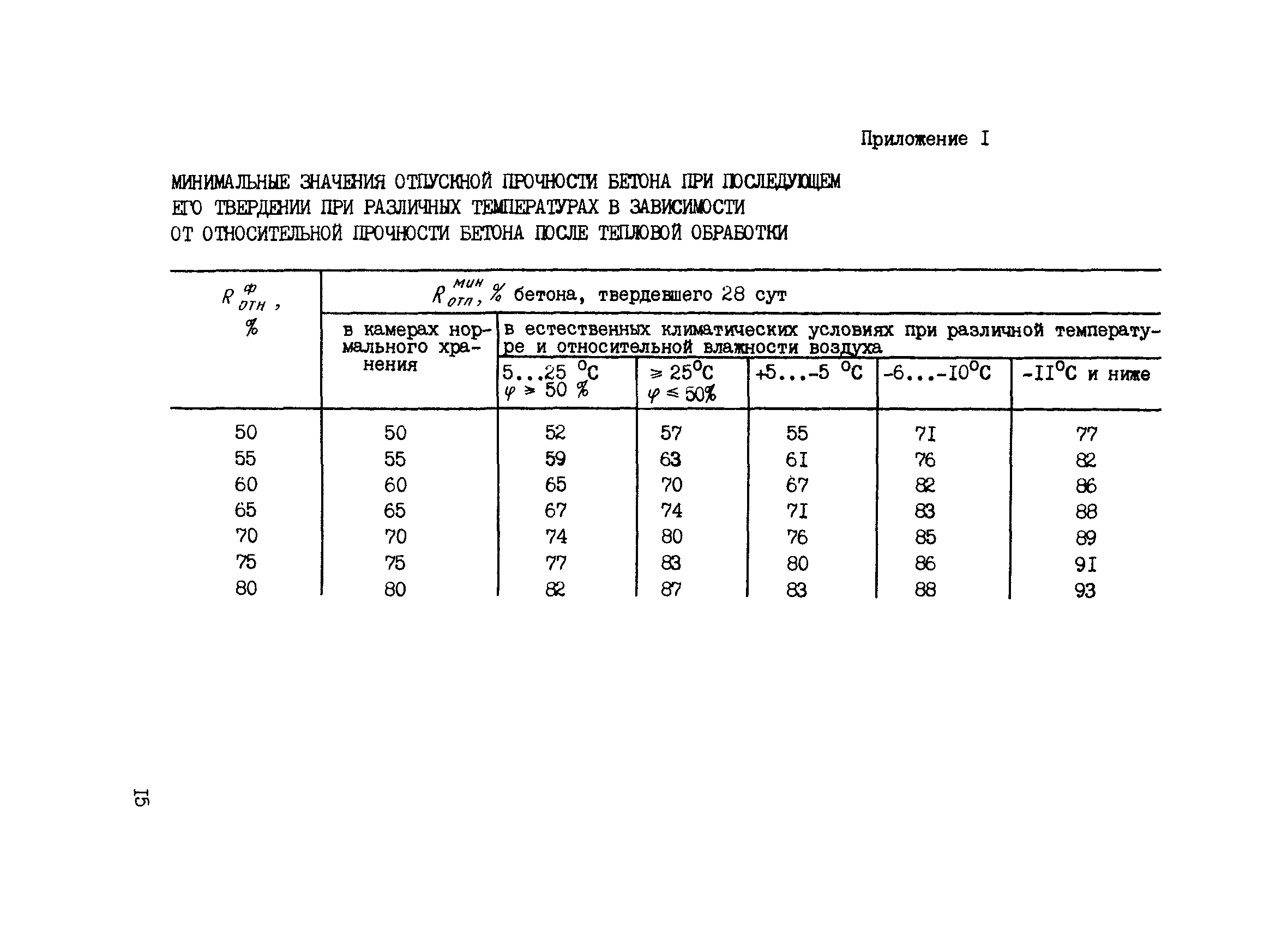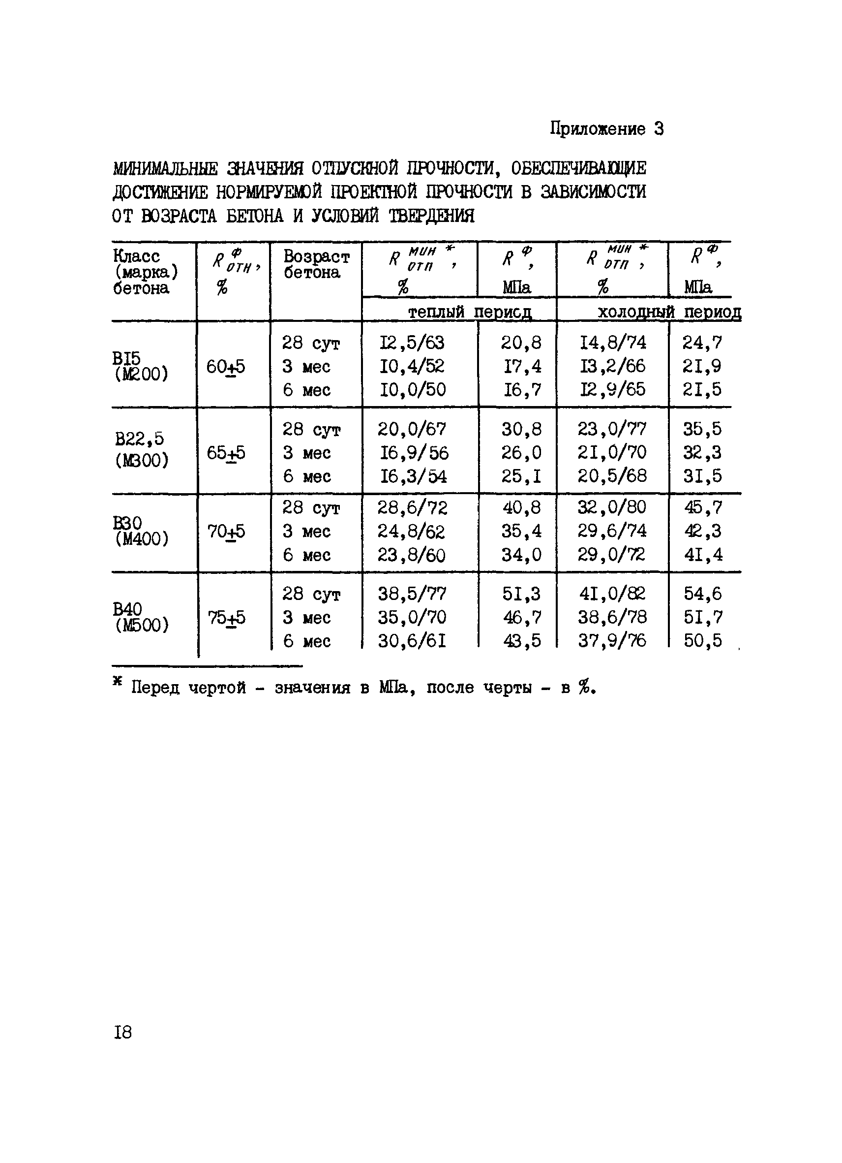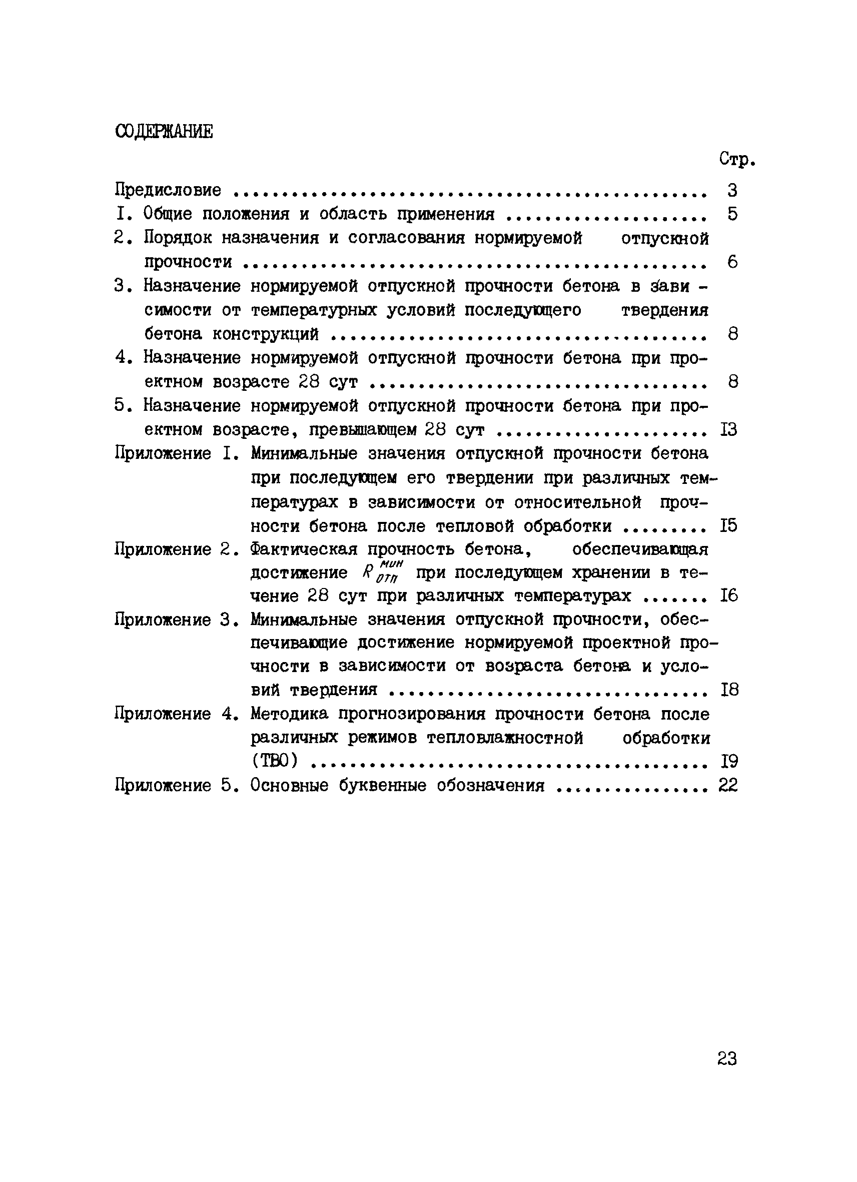 | Оглавление: | Предисловие 1. Общие положения и область применения 2. Порядок назначения и согласования нормируемой отпускной прочности 3. Назначение нормируемой отпускной прочности бетона в зависимости от температурных условий последующего твердения бетона конструкций 4. Назначение нормируемой отпускной прочности бетона при проектном возрасте 28 сут 5. Назначение нормируемой отпускной прочности бетона при проектном возрасте, превышающем 28 сут Приложение 1. Минимальные значения отпускной прочности бетона при последующем его твердении при различных температурах в зависимости от относительной прочности бетона после тепловой обработки Приложение 2. Фактическая прочность бетона, обеспечивающая достижение при последующем хранении в течение 28 сут при различных температурах Приложение 3. Минимальные значения отпускной прочности, обеспечивающие достижение нормируемой проектной прочности в зависимости от возраста бетона и условий твердения Приложение 4. Методика прогнозирования прочности бетона после различных режимов тепловлажностной обработки (ТВО) Приложение 5. Основные буквенные обозначения |
