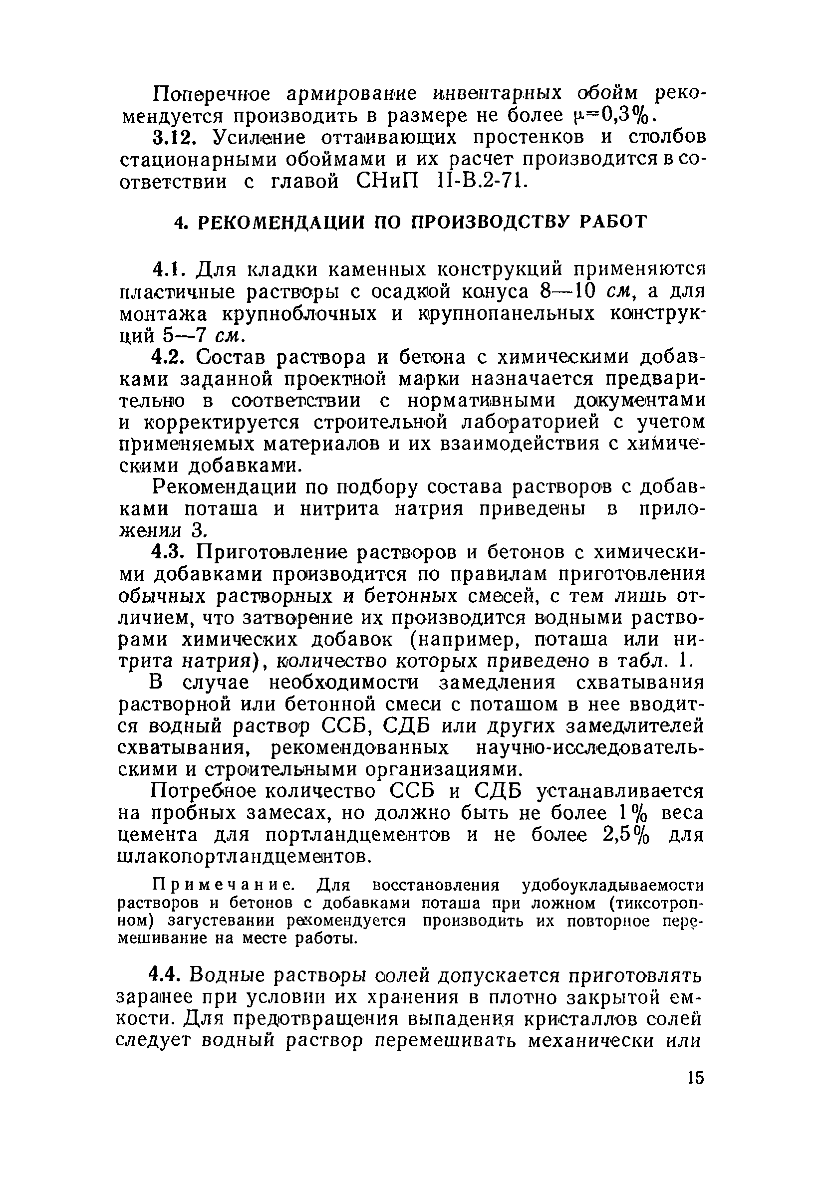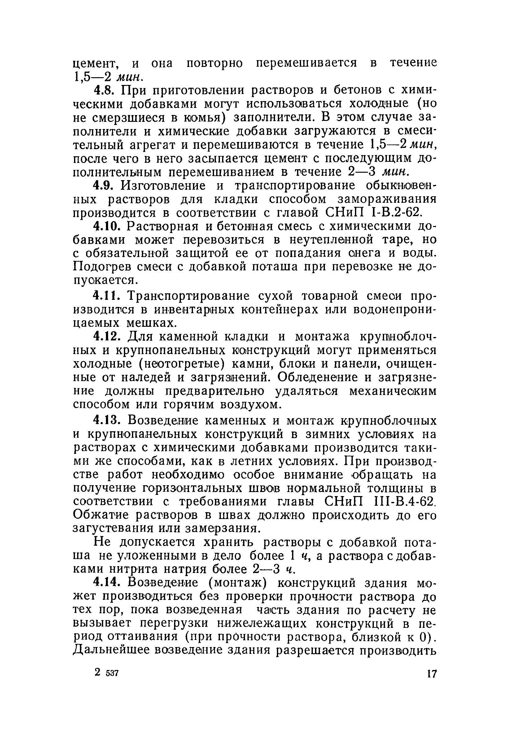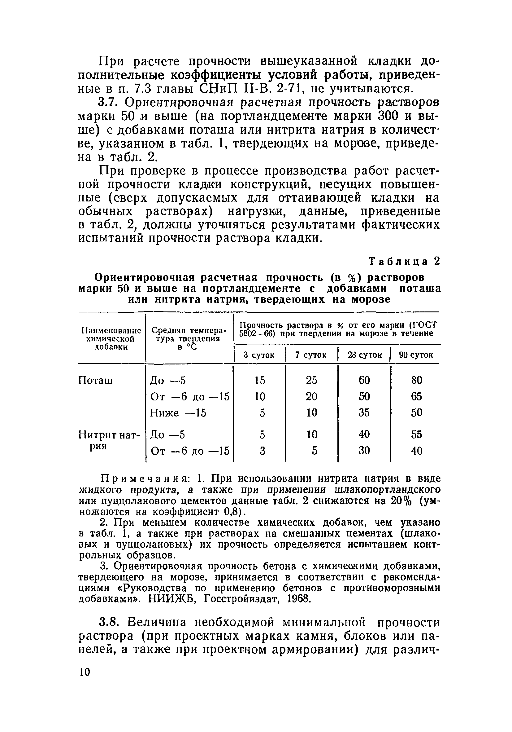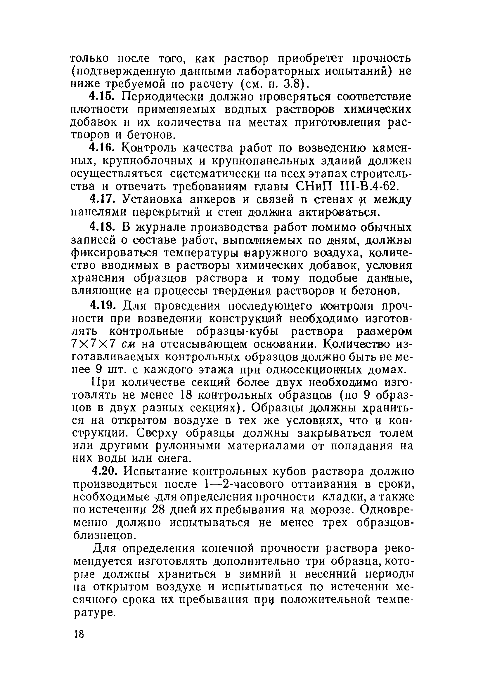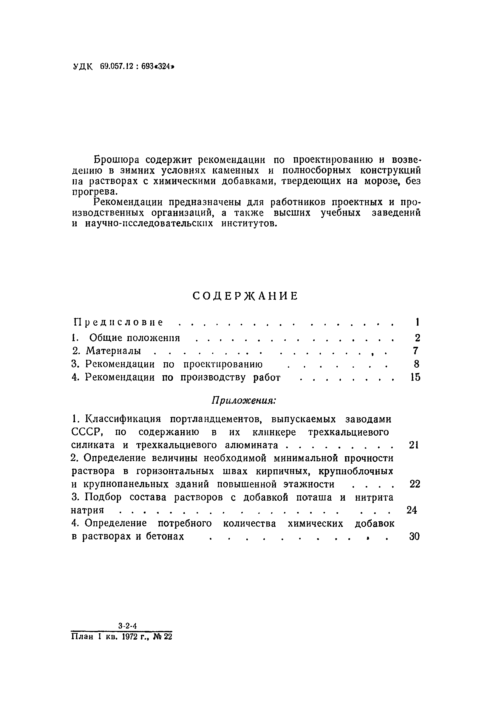 | Оглавление: | 1. Общие положения 2. Материалы 3. Рекомендации по проектированию 4. Рекомендации по производству работ Приложение 1. Классификация портландцементов, выпускаемых заводами СССР, по содержанию в их клинкере трехкальциевого силиката и трехкальциевого алюмината Приложение 2. Определение величины необходимой минимальной прочности раствора в горизонтальных швах кирпичных, крупноблочных и крупнопанельных зданий Повышенной этажности Приложение 3. Подбор состава растворов с добавкой поташа и нитрита натрия Приложение 4. Определение потребного количества химических добавок в растворах и бетонах |
