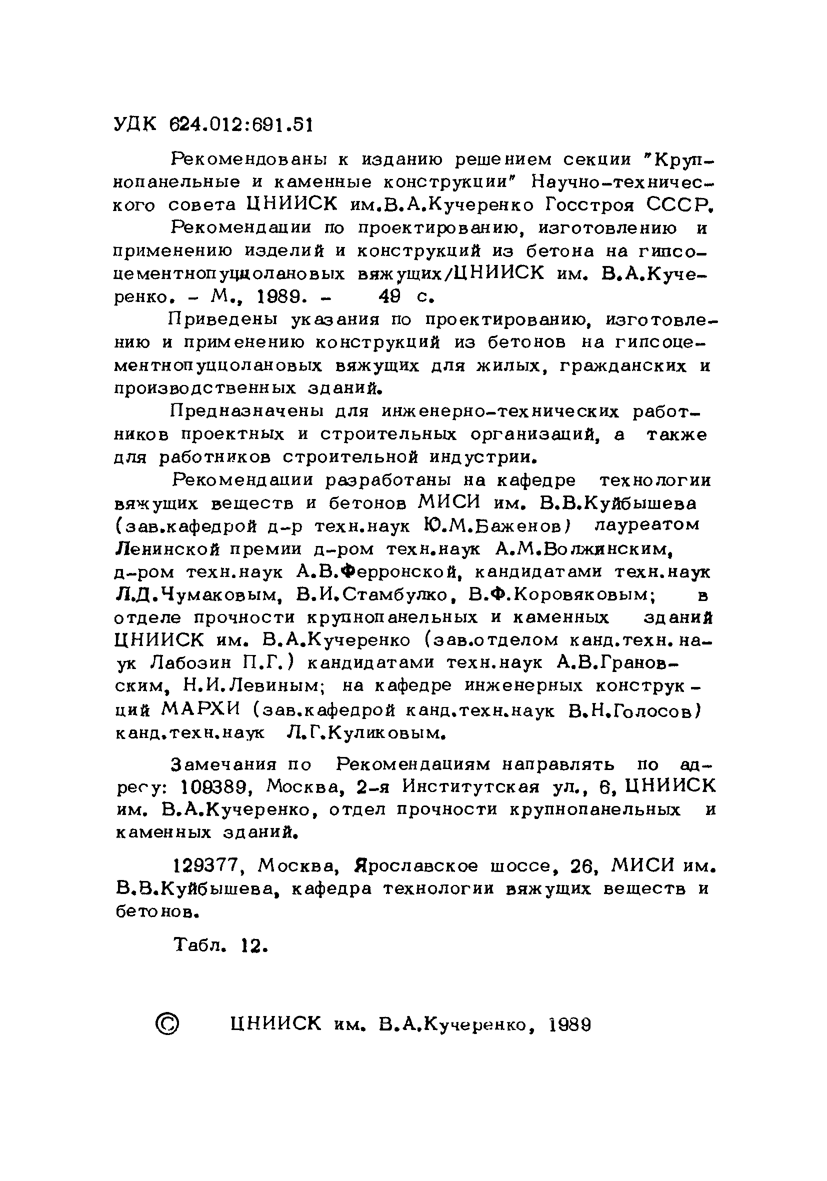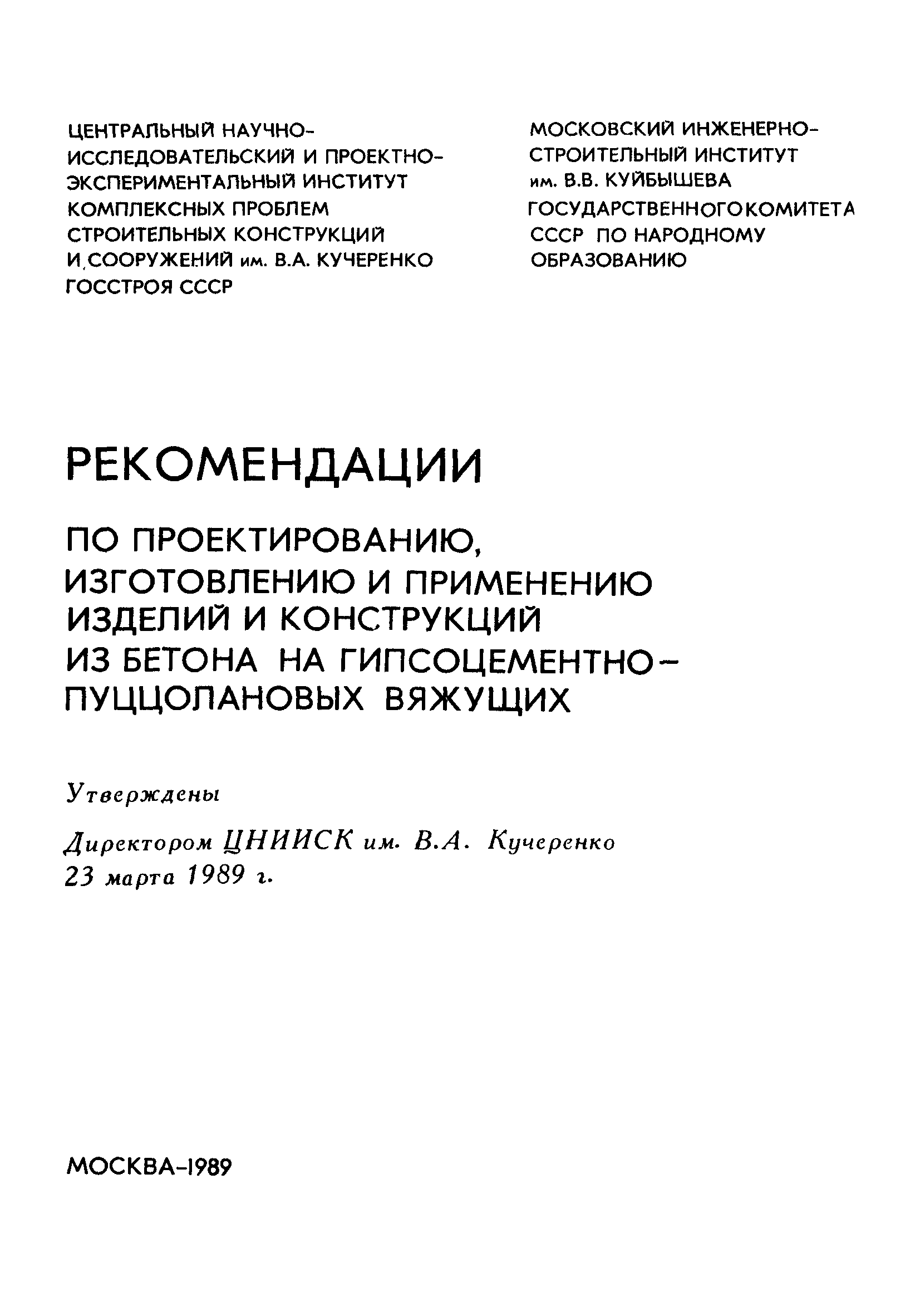 | Область применения: | Рекомендации распространяются на проектирование, изготовление и применение в городском и сельском строительстве жилых, общественных и производственных зданий следующих видов конструктивных элементов и изделий из бетонов на гипсоцементнопуццолановых вяжущих (ГЦПВ): - Стеновых панелей и блоков внутренних и наружных стен; - стеновых камней, плит и перегородок; - панелей и плит междуэтажных перекрытий и покрытий; - объемных элементов (санитарно-технические кабины, вентиляционные блоки и др.). |