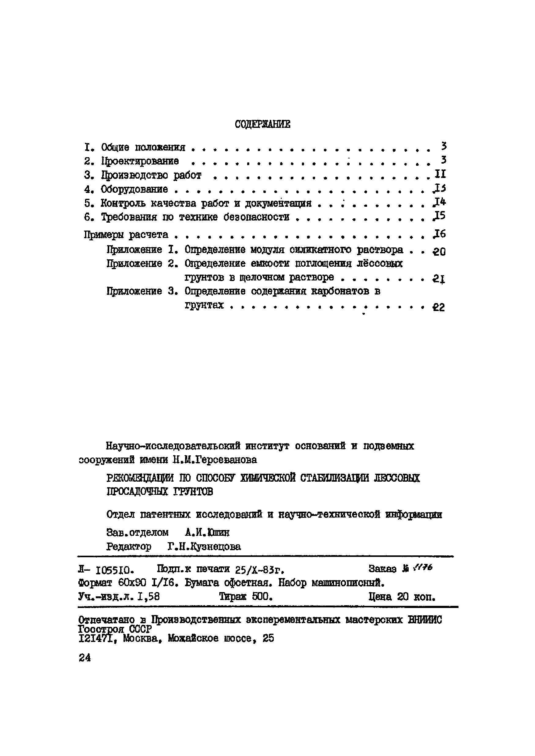 | Оглавление: | 1. Общие положения 2. Проектирование 3. Производство работ 4. Оборудование . 5. Контроль качества работ и документация 6. Требования тго технике безопасности Примеры расчета Приложение 1. Определение моля силикатного раствора Приложение 2. Определение емкости поглщения лессовых грунтов в щелочном растворе Приложение 3. Определение содержания карбонатов в грунтах |