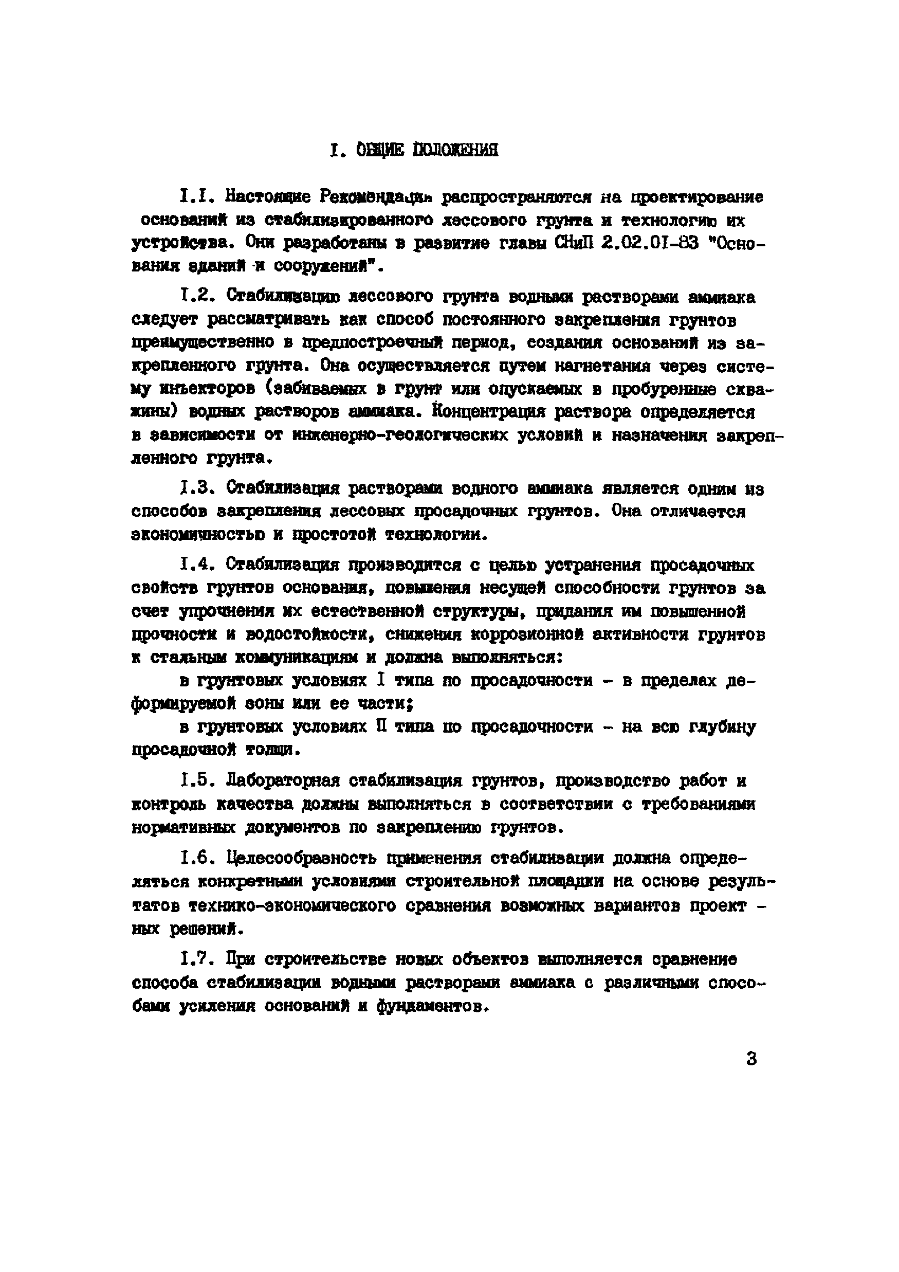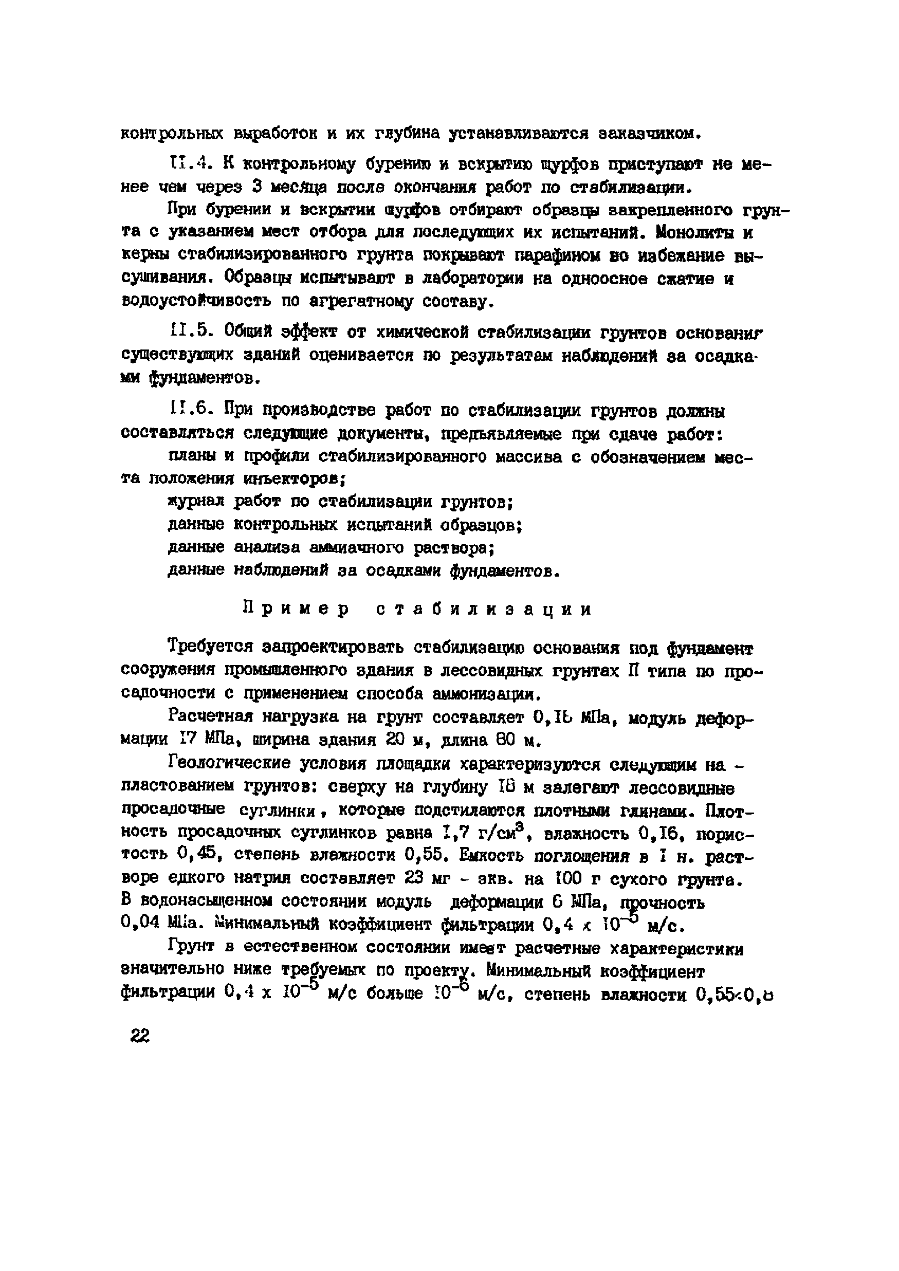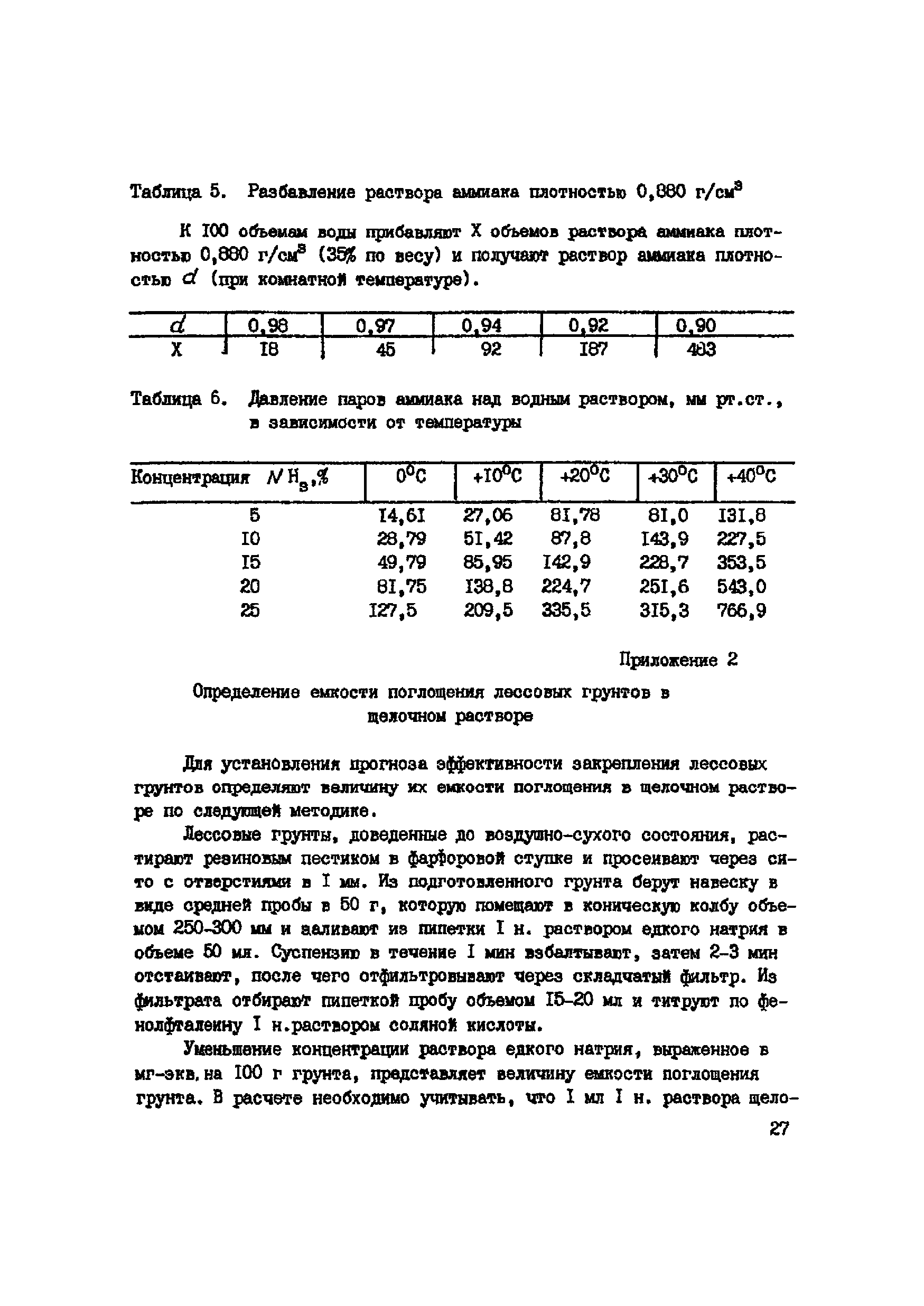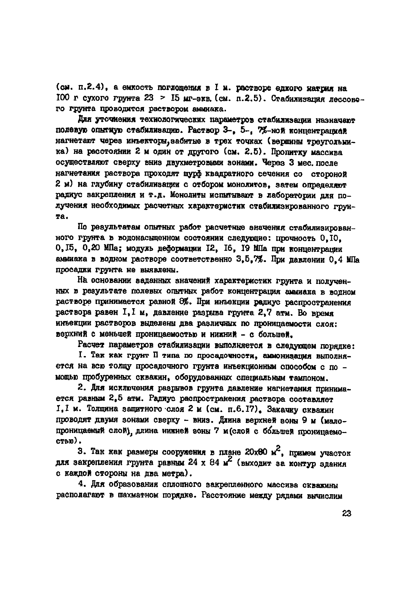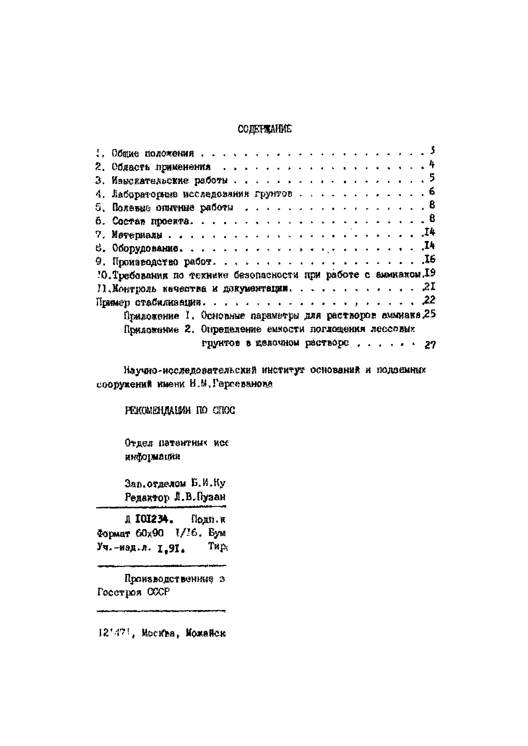 | Оглавление: | 1. Общие положения 2. Область применения 3. Изыскательские работы 4. Лабораторные исследования грунтов 5. Полевые опытные работы 6. Состав проекта 7. Материалы 8. Оборудование 9. Производство работ 10 Требования по технике безопасности при работе с аммиаком 11. Контроль качества к документации Пример стабилизации Приложение 1. Основные параметры для растворов аммиака Приложение 2. Определение емкости поглощения лессовых грунтов в щелочном растворе |