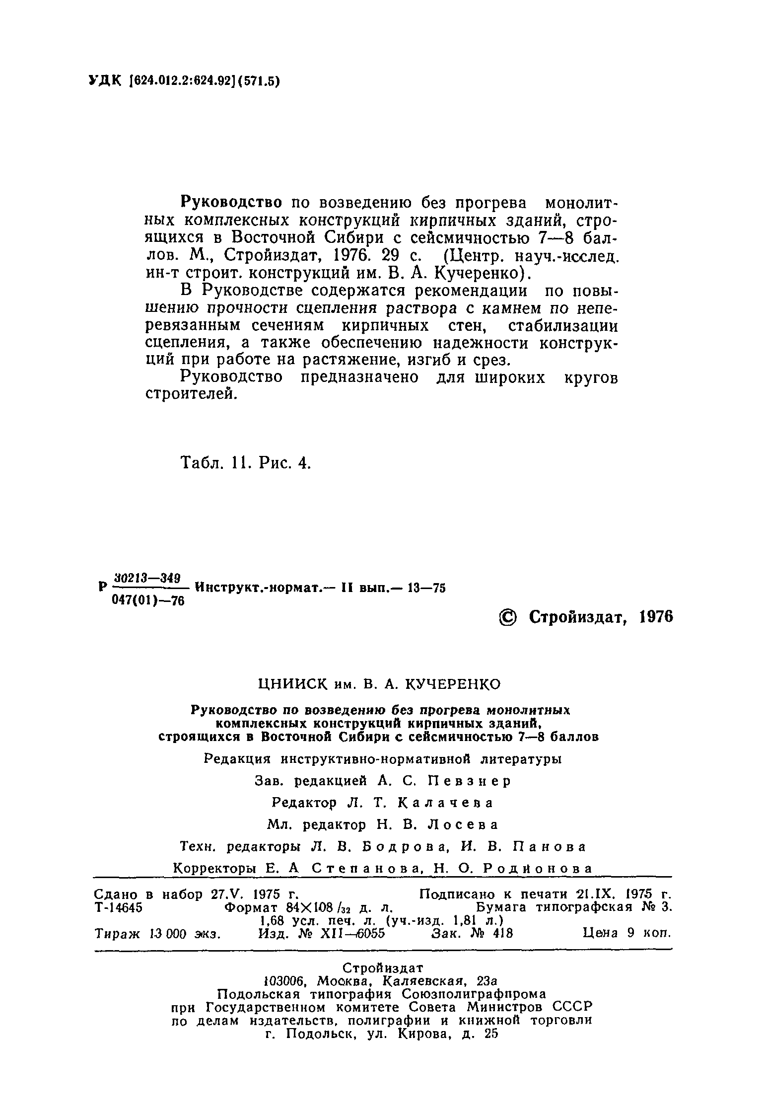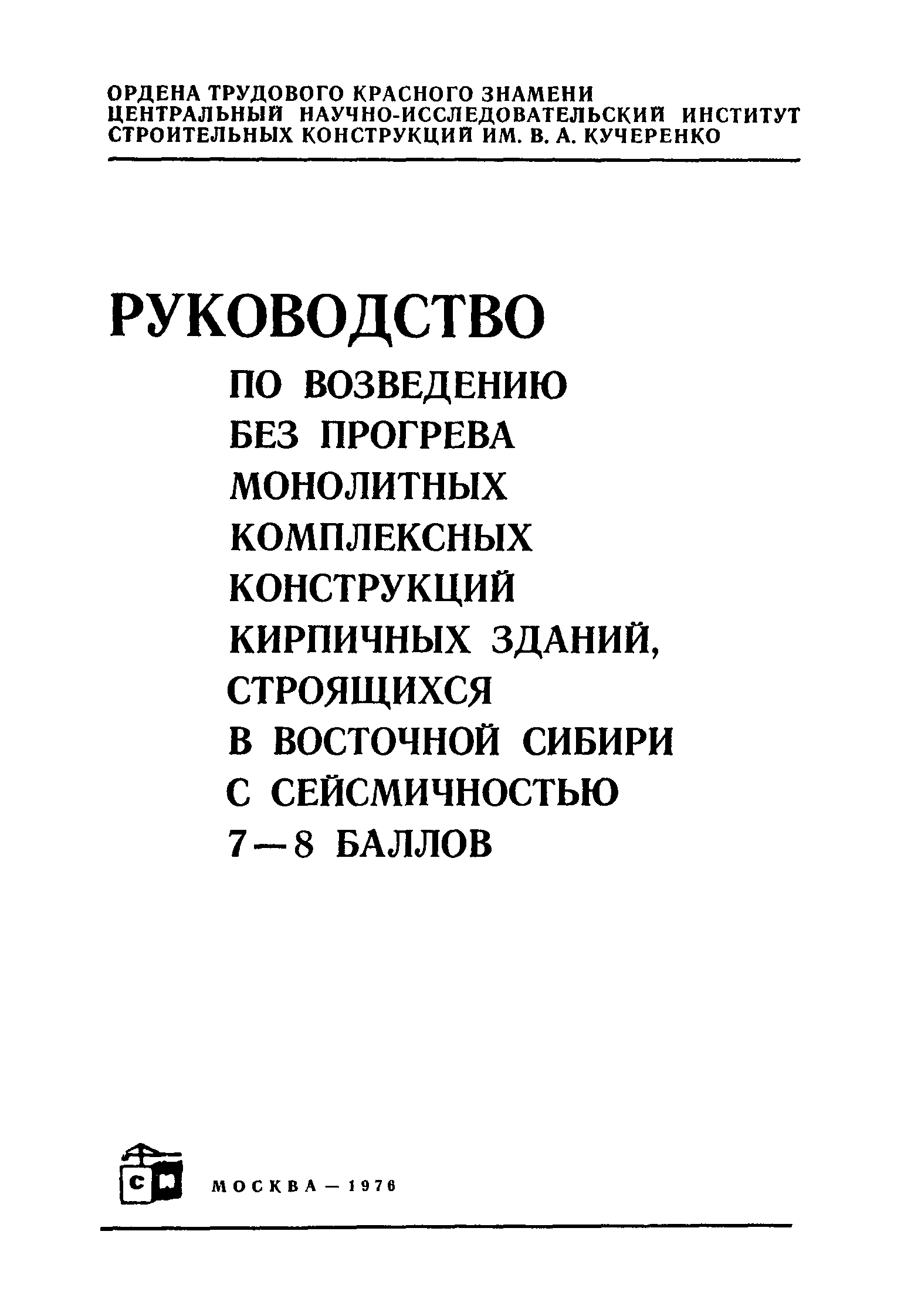 | Название рус.: | Руководство по возведению без прогрева монолитных комплексных конструкций кирпичных зданий, строящихся в Восточной Сибири с сейсмичностью 7 - 8 баллов |