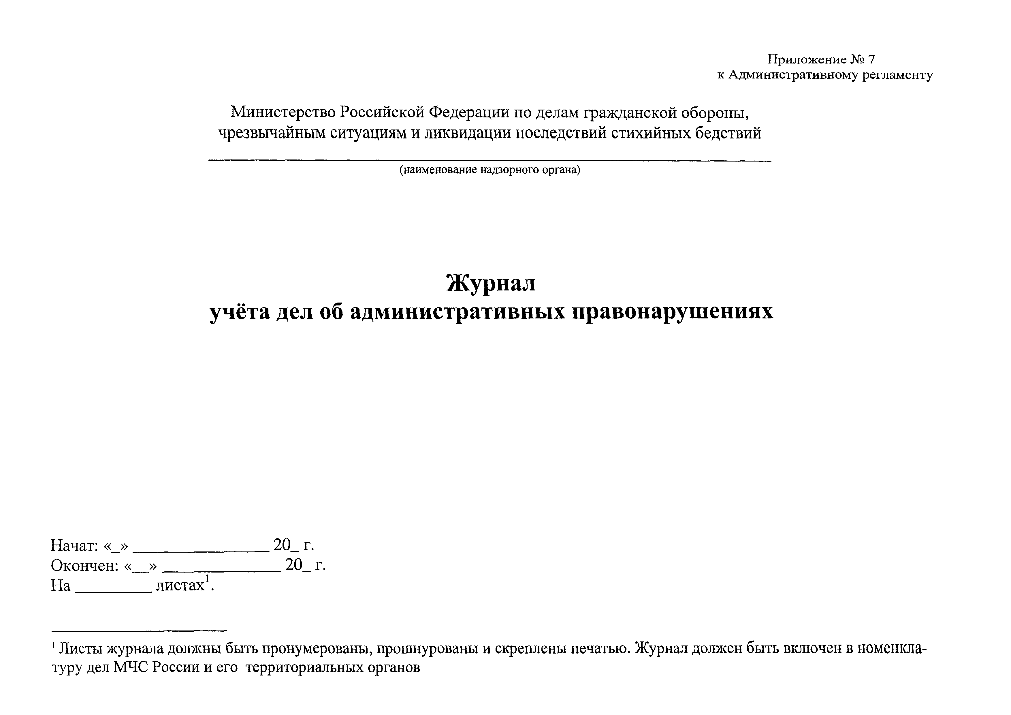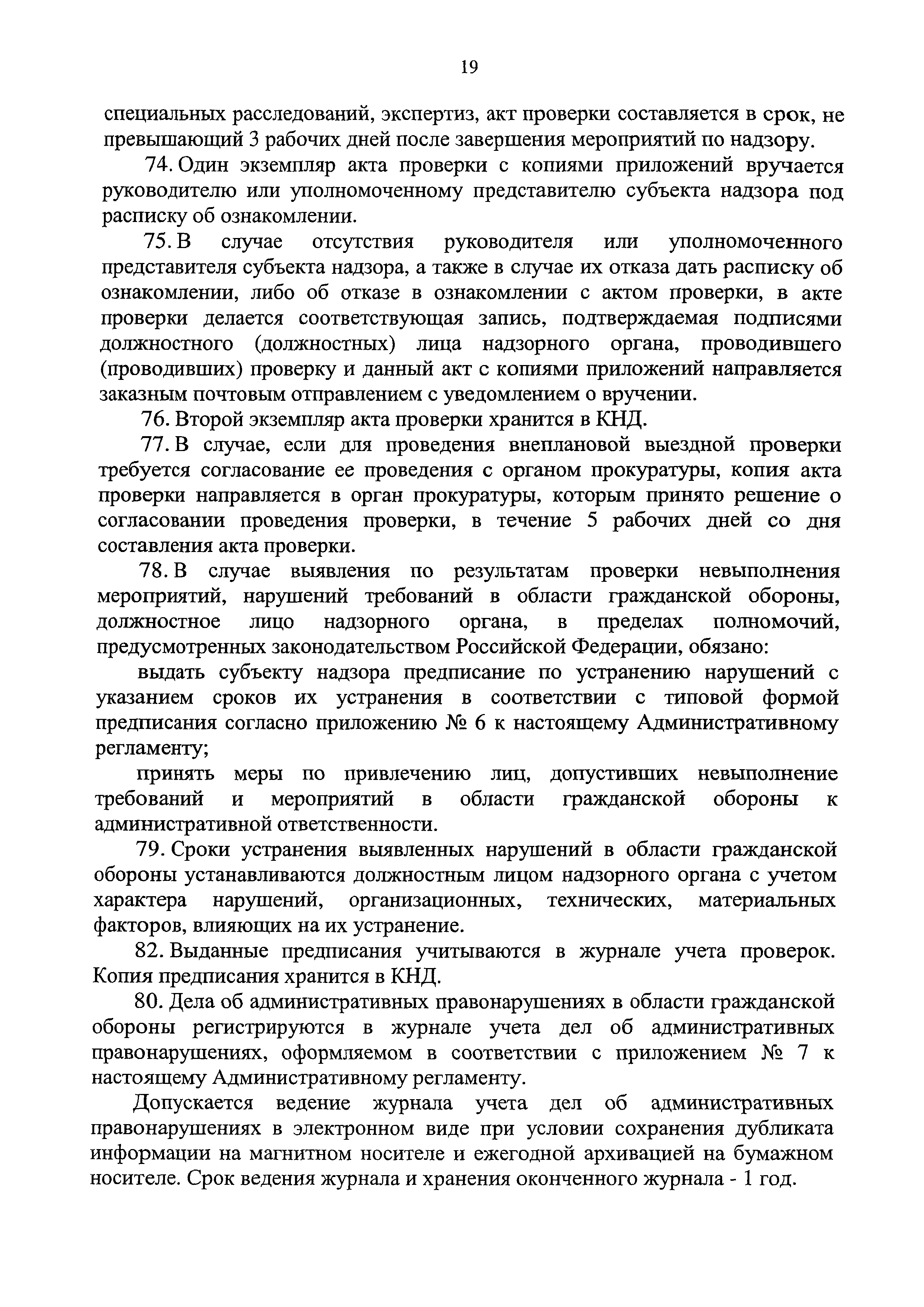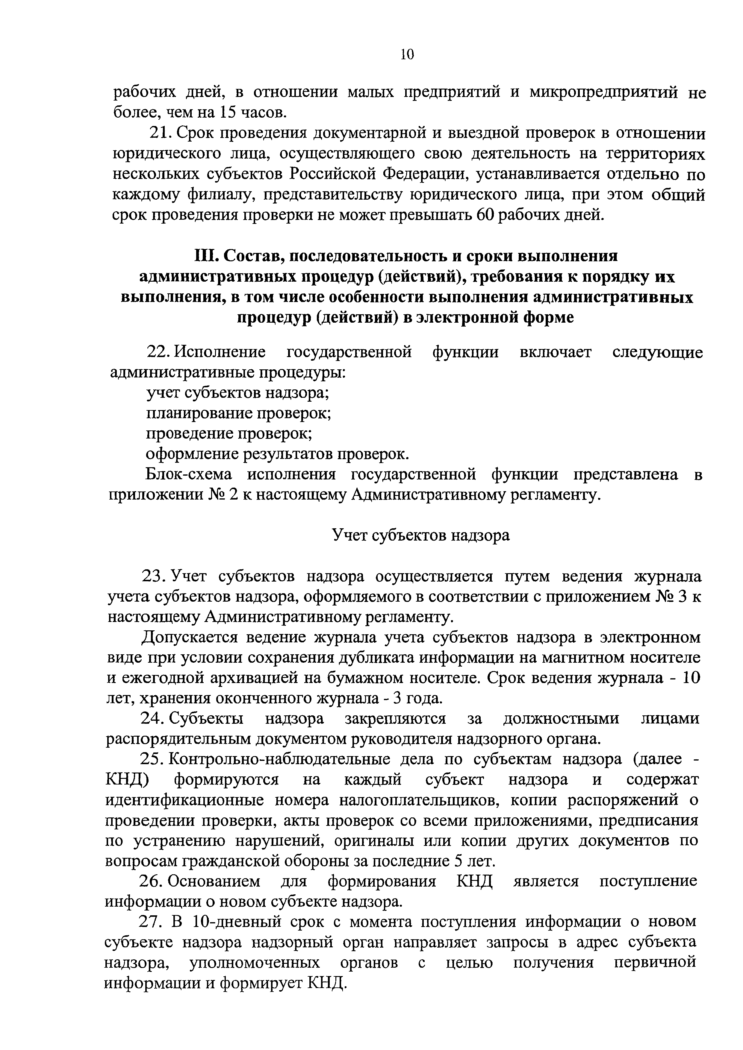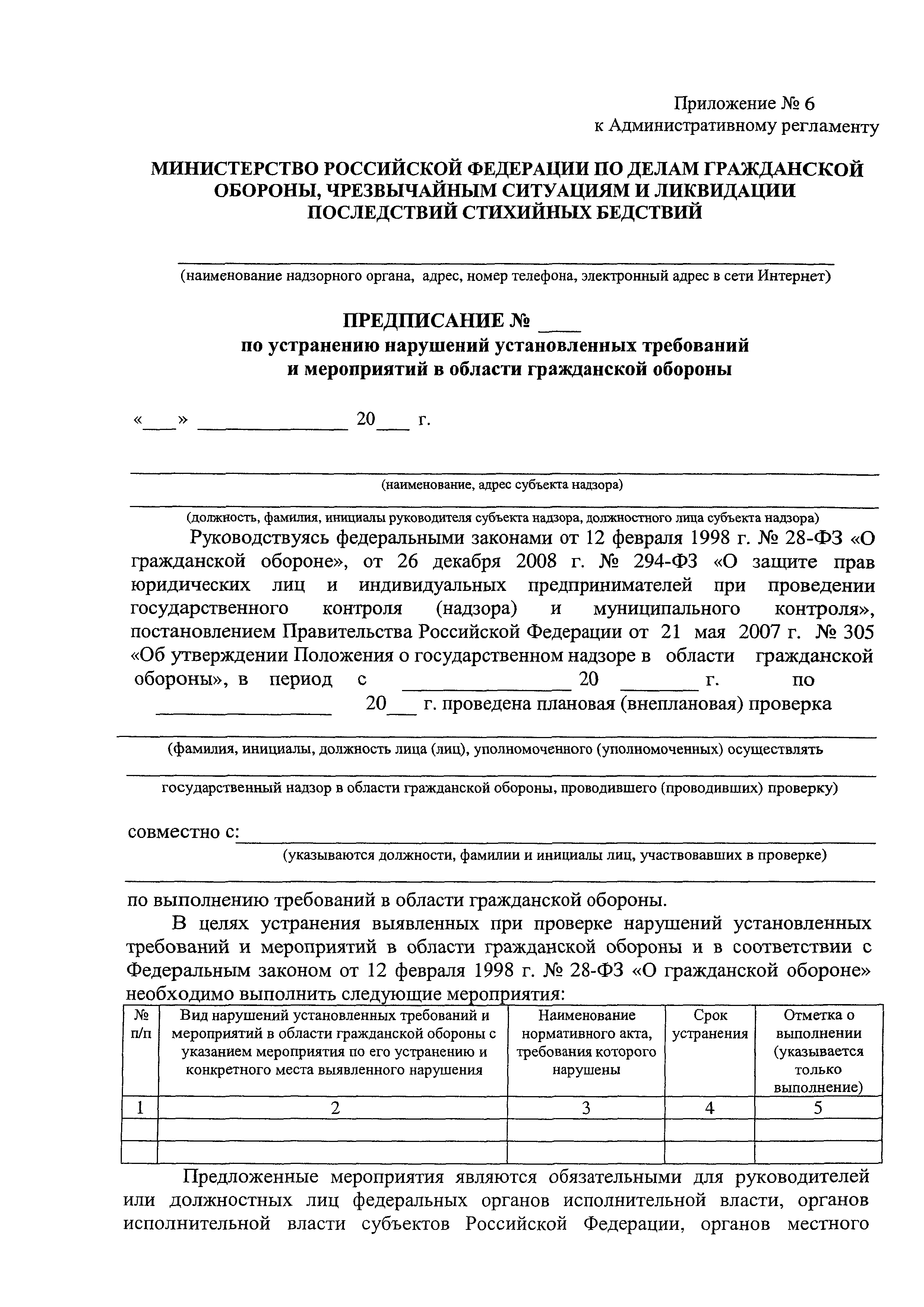 | Оглавление: | 1. Общие положения II. Требования к порядку исполнения государственной функции III. Состав, последовательность и сроки выполнения административных процедур (действий), требования к порядку их выполнения, в том числе особенности выполнения административных процедур (действий) в электронной форме IV. Порядок и формы контроля за исполнением государственной функции V. Досудебный (внесудебный) порядок обжалования решений и действий (бездействия) надзорных органов, а также их должностных лиц Приложение № 1 Перечень органов, осуществляющих государственный надзор в области гражданской обороны Приложение № 2 Блок-схема исполнения государственной функции Приложение № 3 Журнал учета субъектов надзора Приложение № 4 План проведения плановых проверок субъектов надзора Приложение № 5 Журнал учета проверок Приложение № 6 Предписание Приложение № 7 Журнал учета дел об административных правонарушениях |