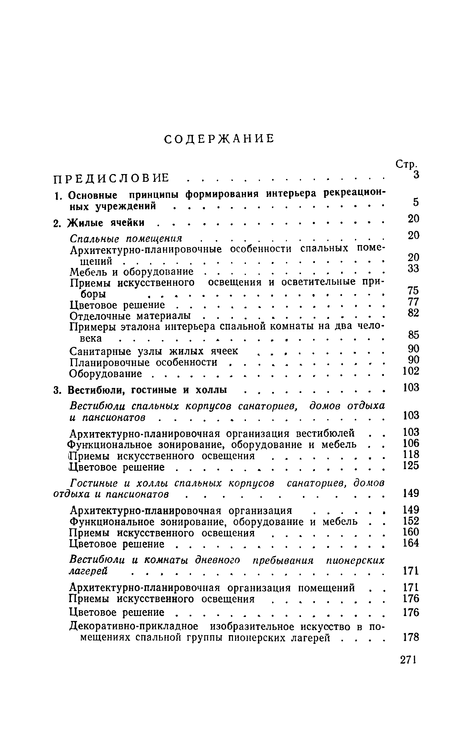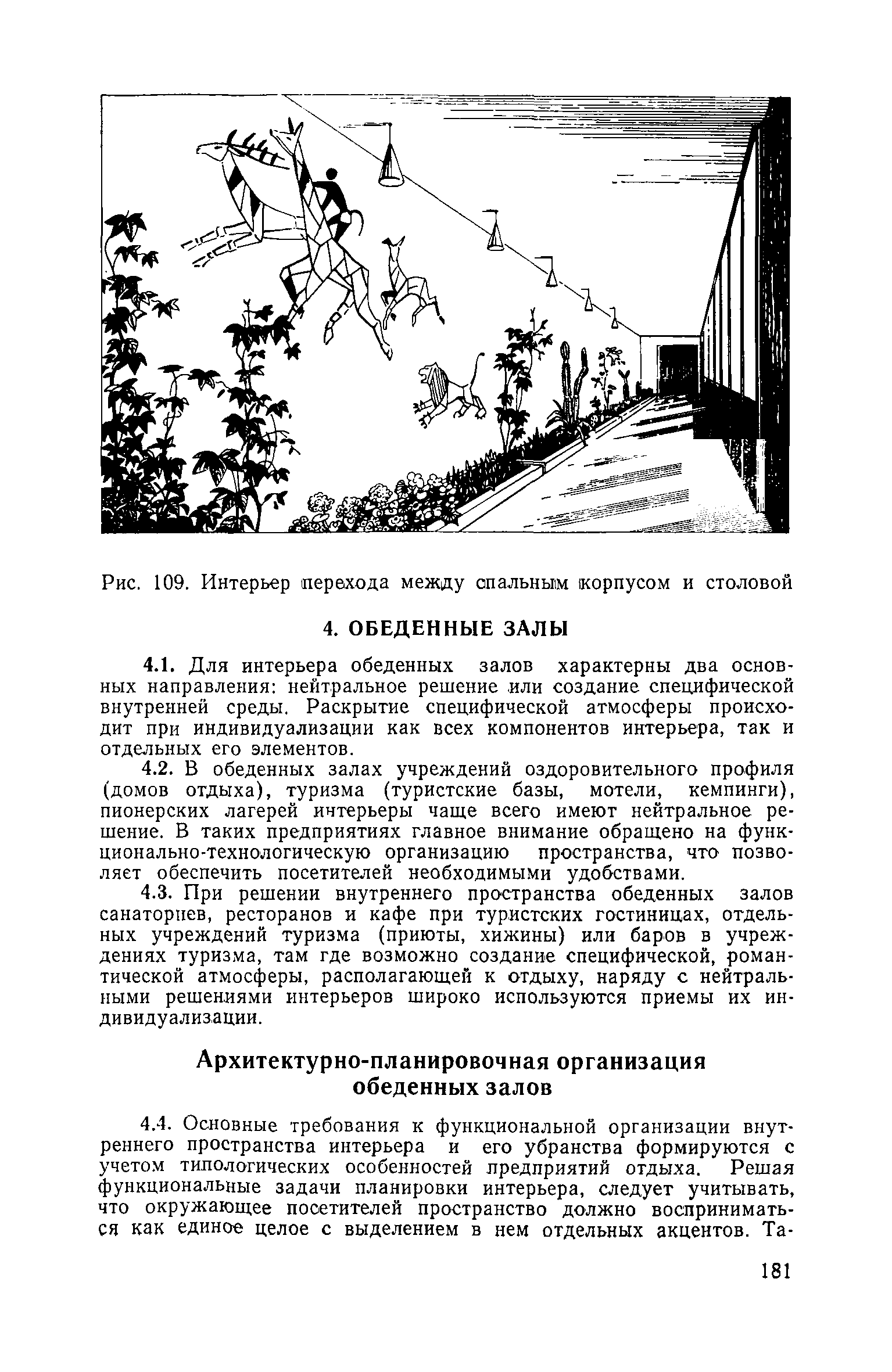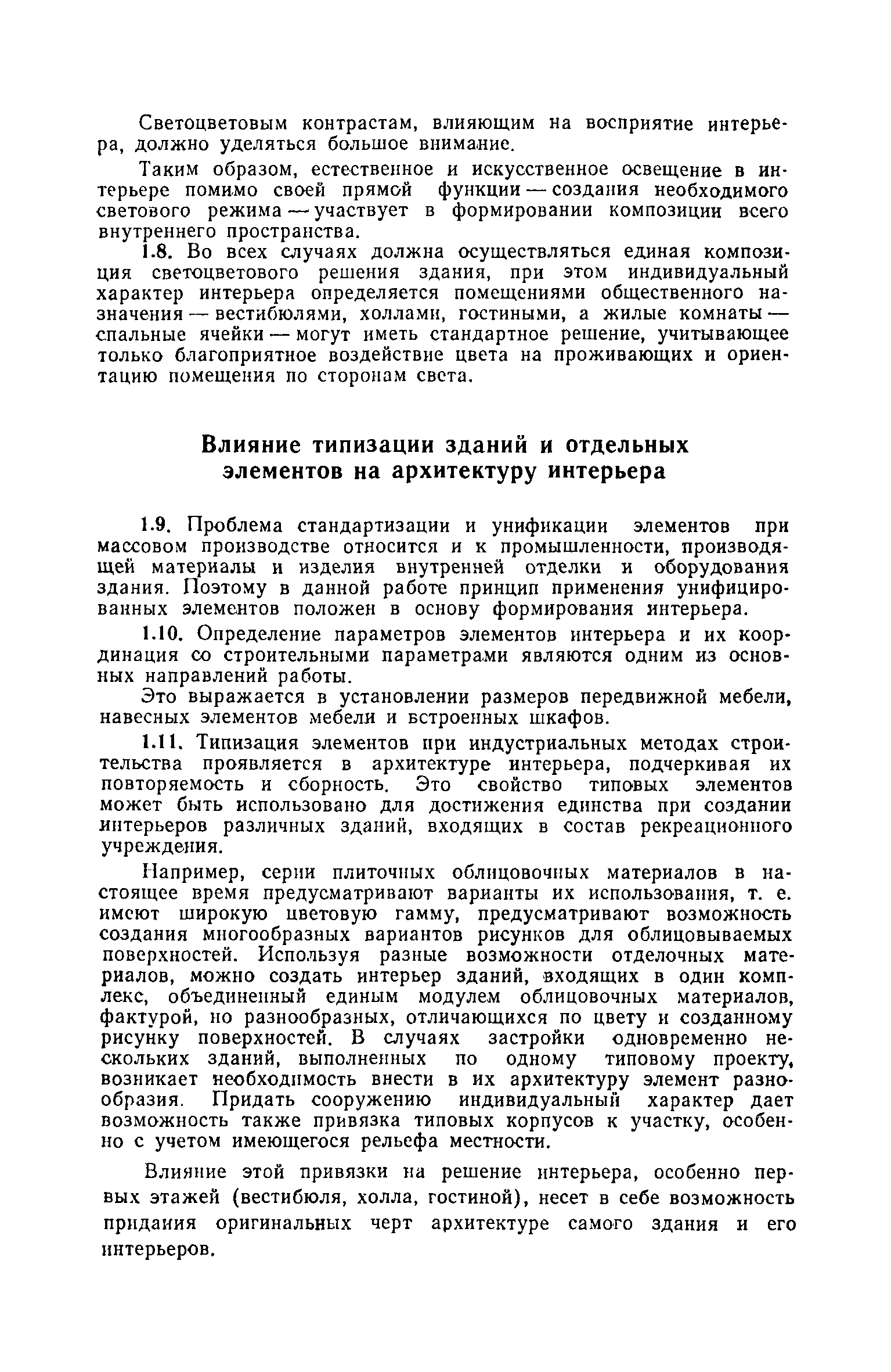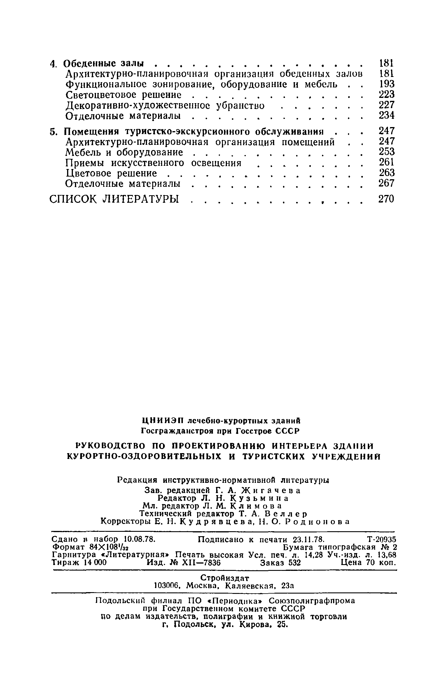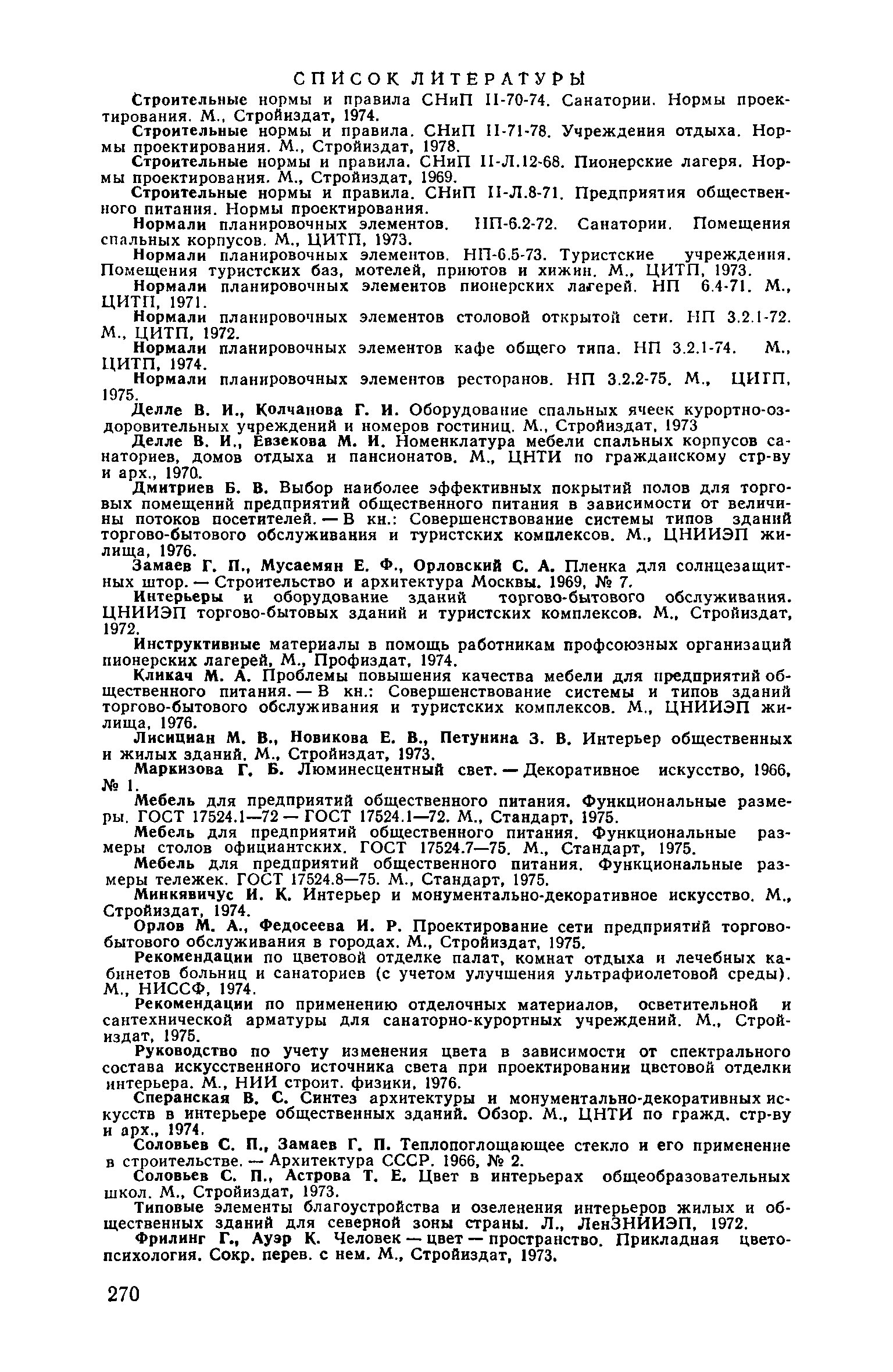 | Оглавление: | 1. Основные принципы формирования интерьера рекреационных учреждений 2. Жилые ячейки Спальные помещения Архитектурно-планировочные особенности спальных помещений Мебель и оборудование Приемы искусственного освещения и осветительные приборы Цветовое решение Отделочные материалы Примеры эталона интерьера спальной комнаты на два человека Санитарные узлы жилых ячеек Планировочные особенности Оборудование 3. Вестибюли, гостиные и холлы Вестибюли спальных корпусов санаториев, домов отдыха и пансионатов Архитектурно-планировочная организация вестибюлей Функциональное зонирование, оборудование и мебель Приемы искусственного освещения Цветовое решение Гостиные и холлы спальных корпусов санаториев, домов отдыха и пансионатов Архитектурно-планировочная организация Функциональное зонирование, оборудование и мебель Приемы искусственного освещения Цветовое решение Вестибюли и комнаты дневного пребывания пионерских лагерей Архитектурно-планировочная организация помещений Приемы искусственного освещения Цветовое решение Декоративно-прикладное изобразительное искусство в помещениях спальной группы пионерских лагерей 4. Обеденные залы Архитектурно-планировочная организация обеденных залов Функциональное зонирование, оборудование в мебель Светоцветовое решение Декоративно-художественное убранство Отделочные материалы 5. Помещения туристско-экскурсионного обслуживания Архитектурно-планировочная организация помещений Мебель и оборудование Приемы искусственного освещения Цветовое решение Отделочные материалы Список литературы |