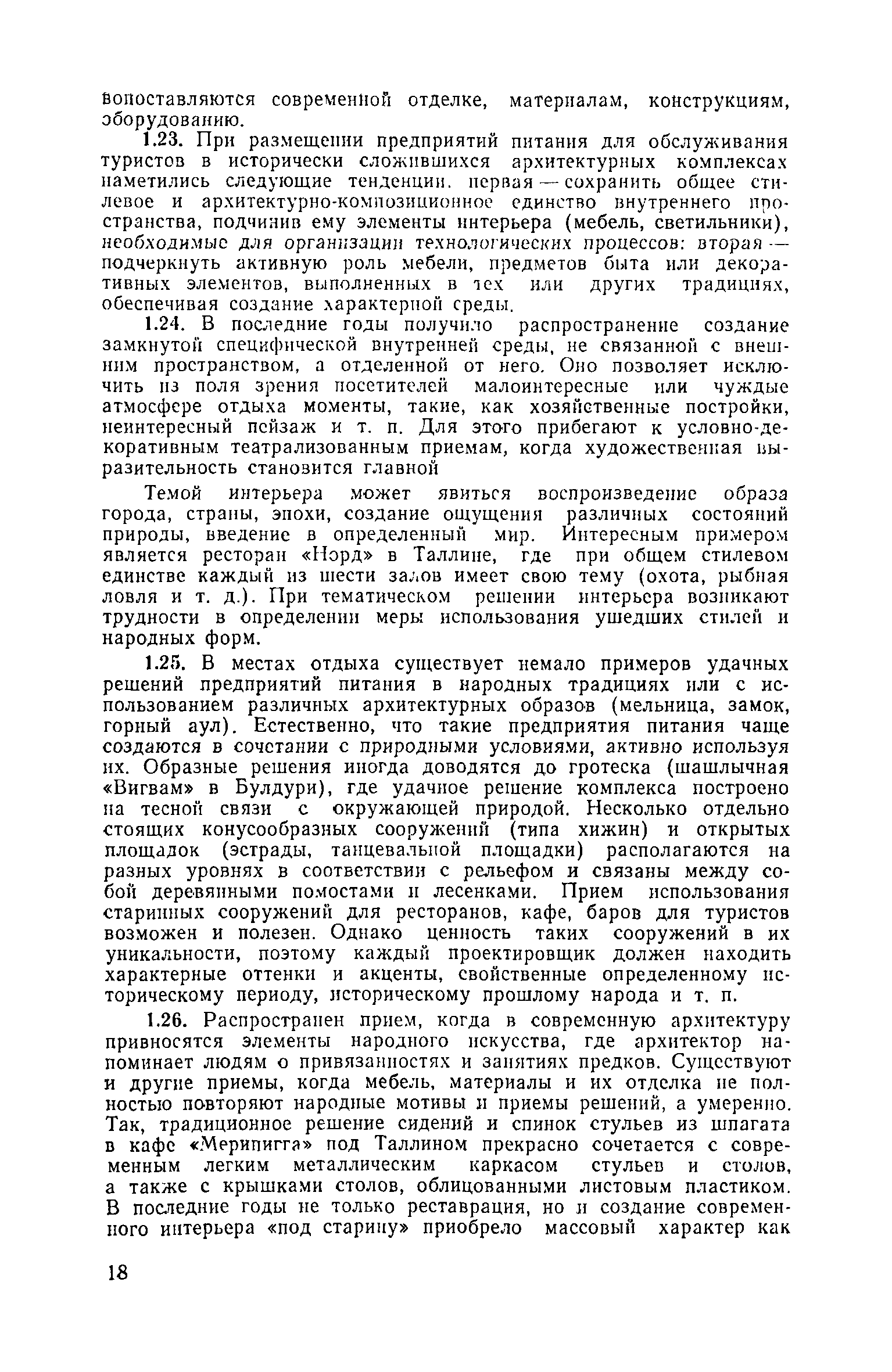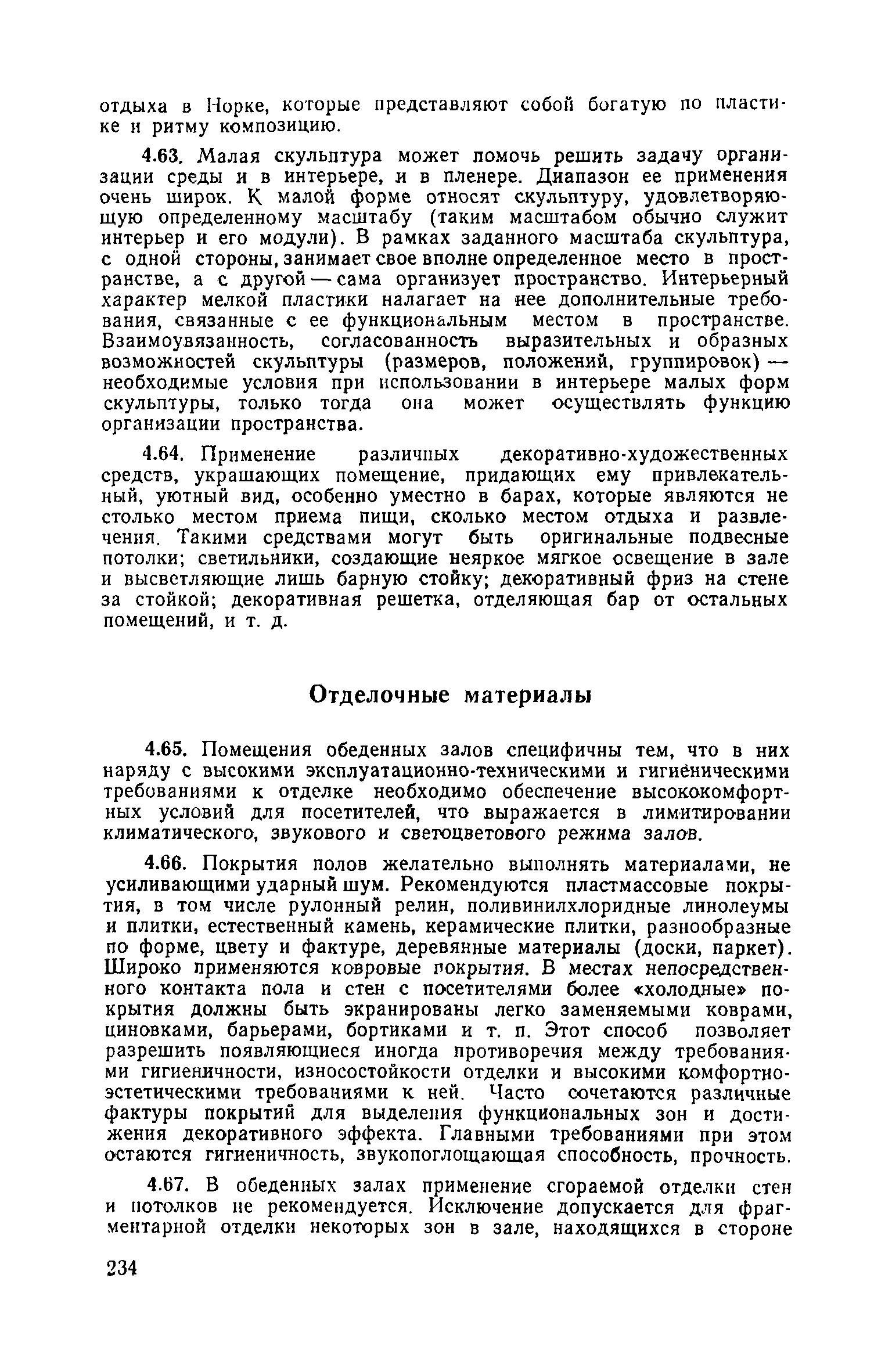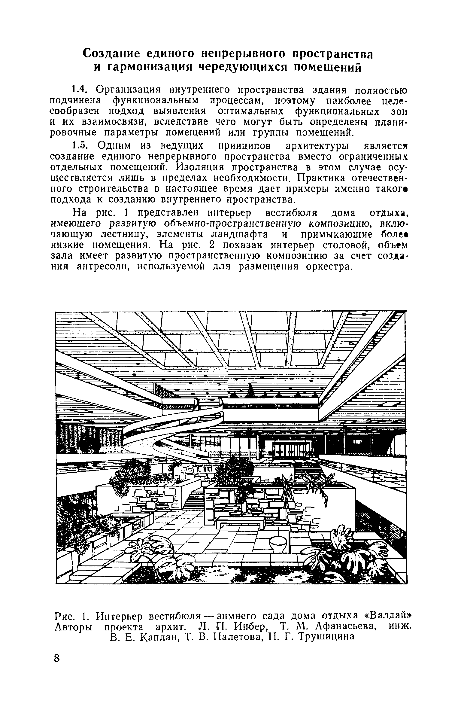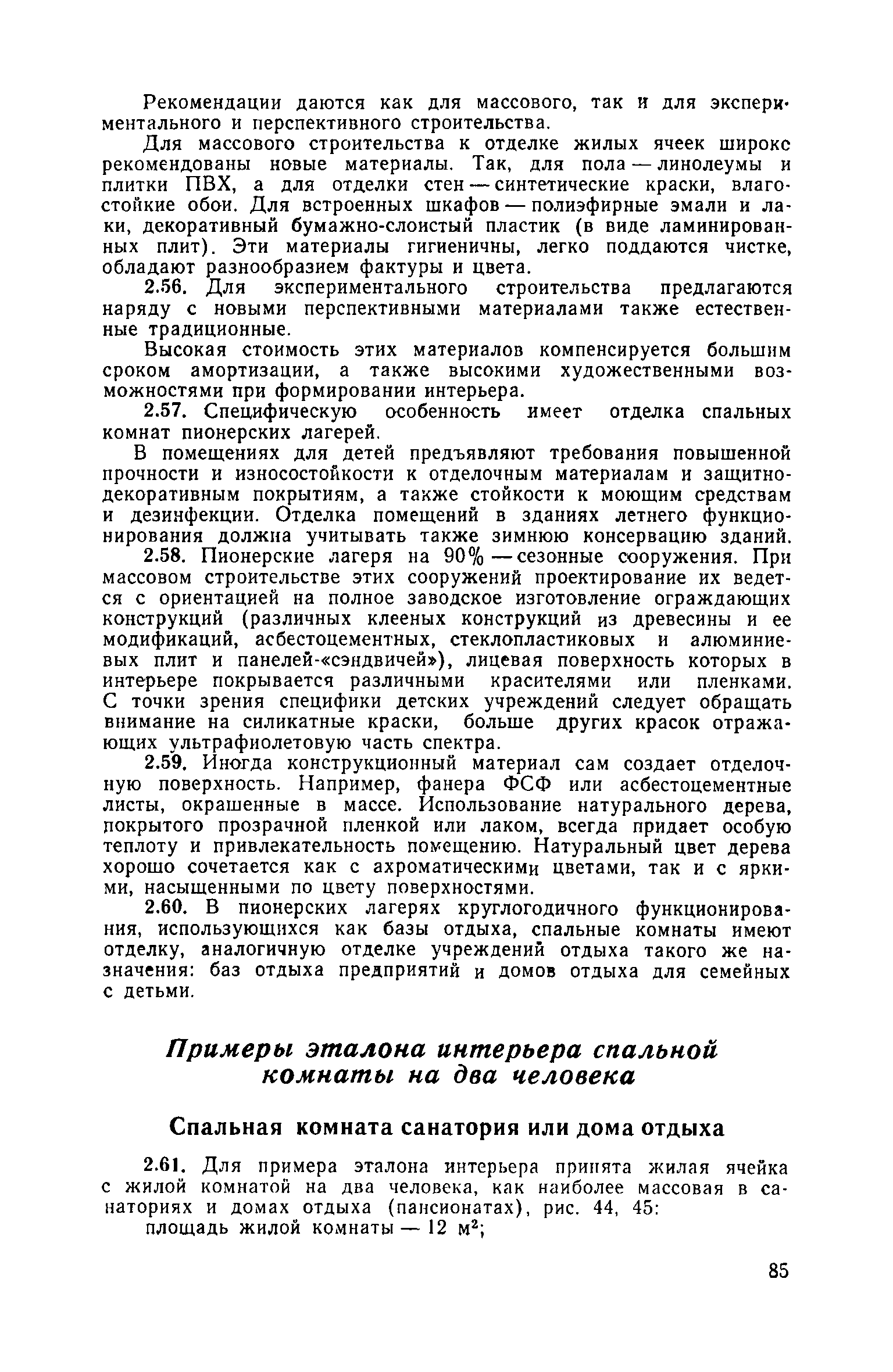 | Оглавление: | 1. Основные принципы формирования интерьера рекреационных учреждений 2. Жилые ячейки Спальные помещения Архитектурно-планировочные особенности спальных помещений Мебель и оборудование Приемы искусственного освещения и осветительные приборы Цветовое решение Отделочные материалы Примеры эталона интерьера спальной комнаты на два человека Санитарные узлы жилых ячеек Планировочные особенности Оборудование 3. Вестибюли, гостиные и холлы Вестибюли спальных корпусов санаториев, домов отдыха и пансионатов Архитектурно-планировочная организация вестибюлей Функциональное зонирование, оборудование и мебель Приемы искусственного освещения Цветовое решение Гостиные и холлы спальных корпусов санаториев, домов отдыха и пансионатов Архитектурно-планировочная организация Функциональное зонирование, оборудование и мебель Приемы искусственного освещения Цветовое решение Вестибюли и комнаты дневного пребывания пионерских лагерей Архитектурно-планировочная организация помещений Приемы искусственного освещения Цветовое решение Декоративно-прикладное изобразительное искусство в помещениях спальной группы пионерских лагерей 4. Обеденные залы Архитектурно-планировочная организация обеденных залов Функциональное зонирование, оборудование в мебель Светоцветовое решение Декоративно-художественное убранство Отделочные материалы 5. Помещения туристско-экскурсионного обслуживания Архитектурно-планировочная организация помещений Мебель и оборудование Приемы искусственного освещения Цветовое решение Отделочные материалы Список литературы |