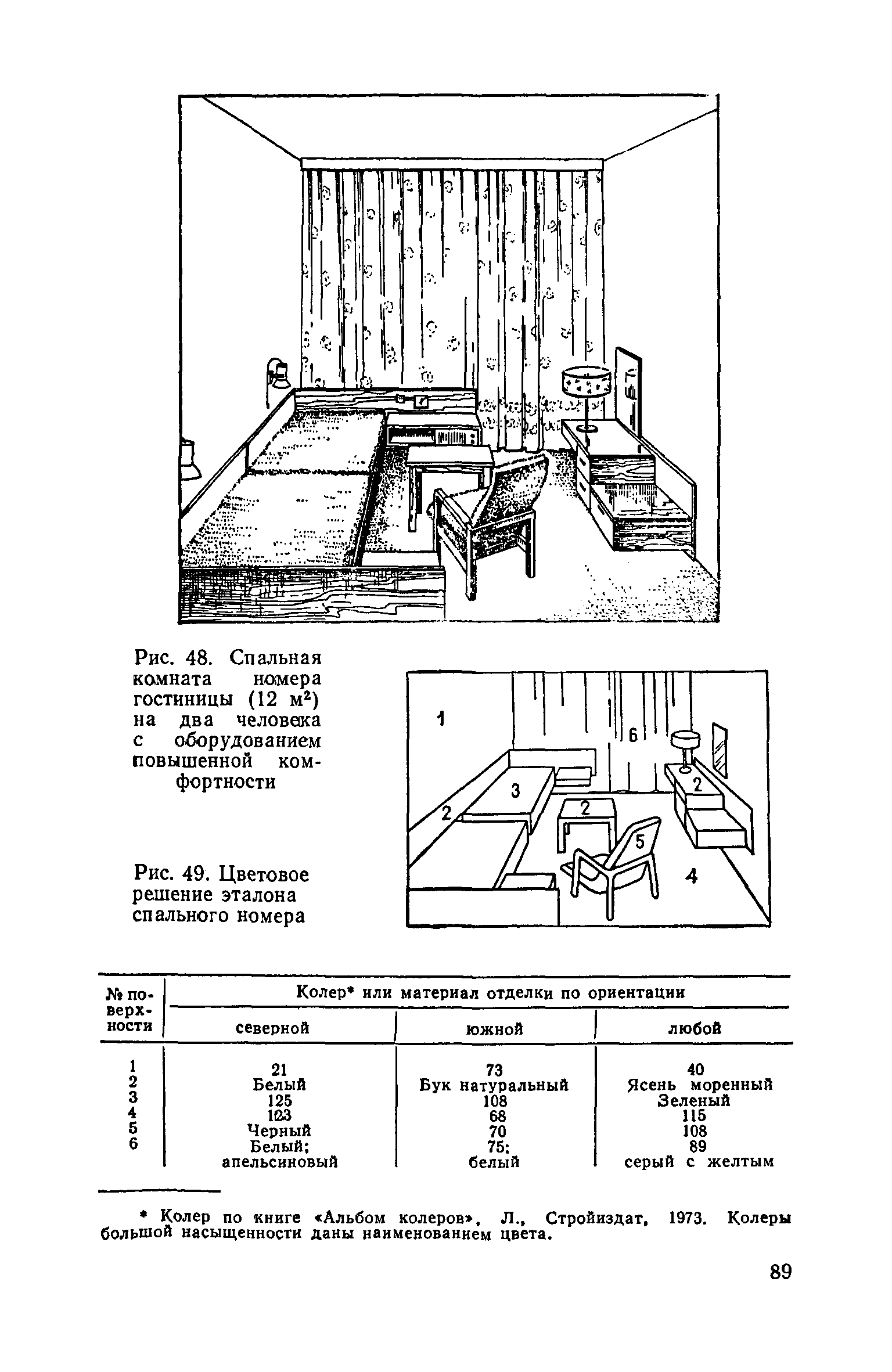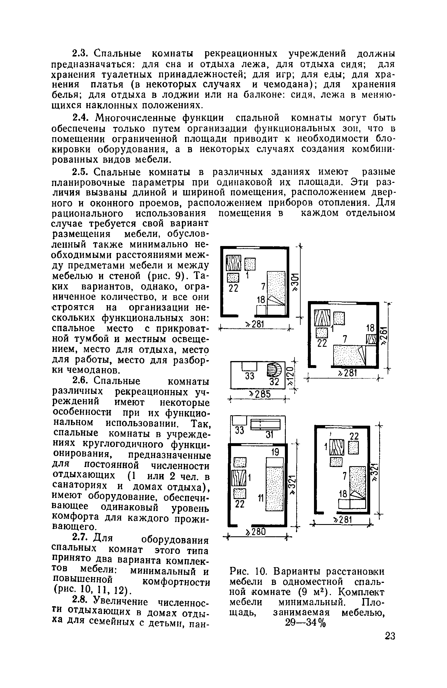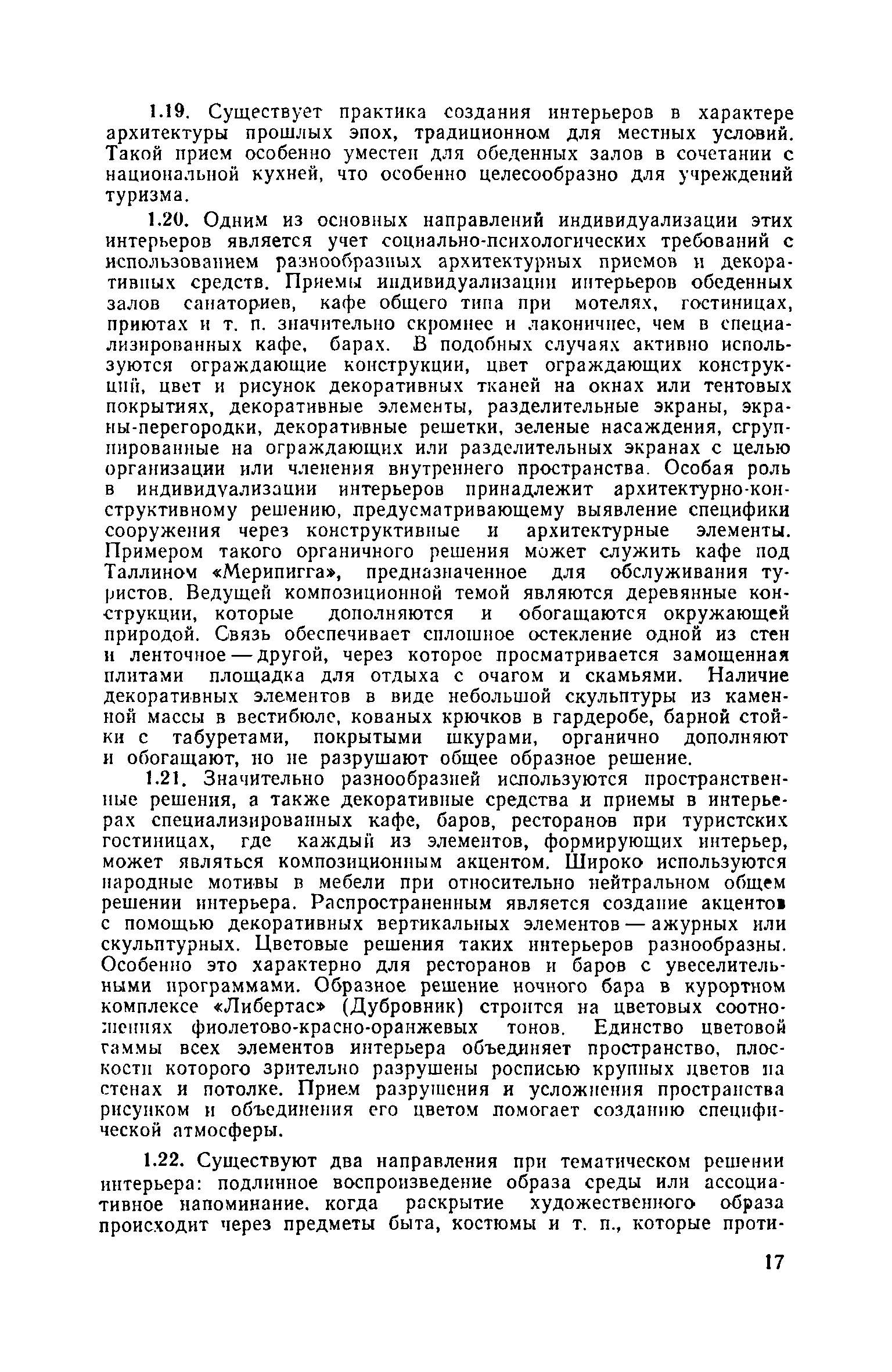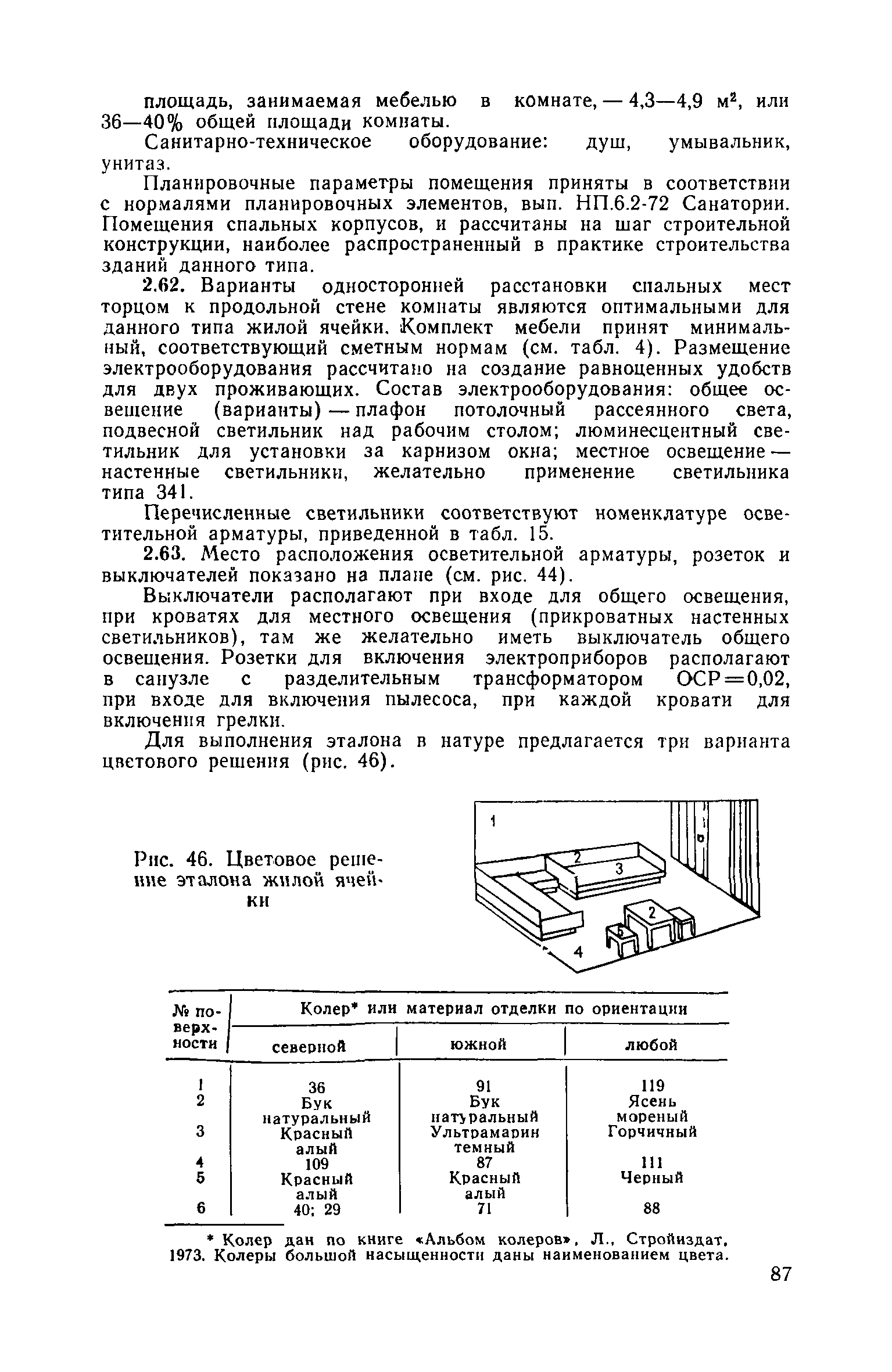 | Оглавление: | 1. Основные принципы формирования интерьера рекреационных учреждений 2. Жилые ячейки Спальные помещения Архитектурно-планировочные особенности спальных помещений Мебель и оборудование Приемы искусственного освещения и осветительные приборы Цветовое решение Отделочные материалы Примеры эталона интерьера спальной комнаты на два человека Санитарные узлы жилых ячеек Планировочные особенности Оборудование 3. Вестибюли, гостиные и холлы Вестибюли спальных корпусов санаториев, домов отдыха и пансионатов Архитектурно-планировочная организация вестибюлей Функциональное зонирование, оборудование и мебель Приемы искусственного освещения Цветовое решение Гостиные и холлы спальных корпусов санаториев, домов отдыха и пансионатов Архитектурно-планировочная организация Функциональное зонирование, оборудование и мебель Приемы искусственного освещения Цветовое решение Вестибюли и комнаты дневного пребывания пионерских лагерей Архитектурно-планировочная организация помещений Приемы искусственного освещения Цветовое решение Декоративно-прикладное изобразительное искусство в помещениях спальной группы пионерских лагерей 4. Обеденные залы Архитектурно-планировочная организация обеденных залов Функциональное зонирование, оборудование в мебель Светоцветовое решение Декоративно-художественное убранство Отделочные материалы 5. Помещения туристско-экскурсионного обслуживания Архитектурно-планировочная организация помещений Мебель и оборудование Приемы искусственного освещения Цветовое решение Отделочные материалы Список литературы |
