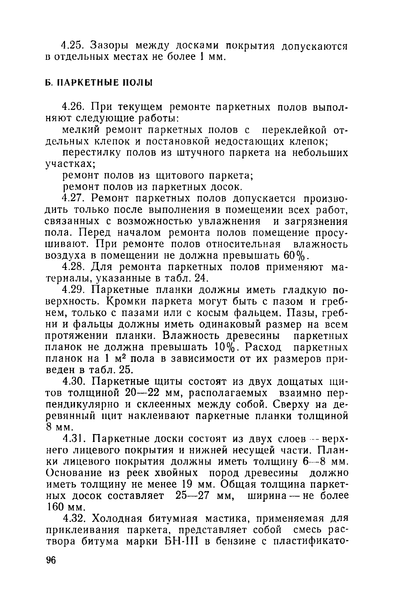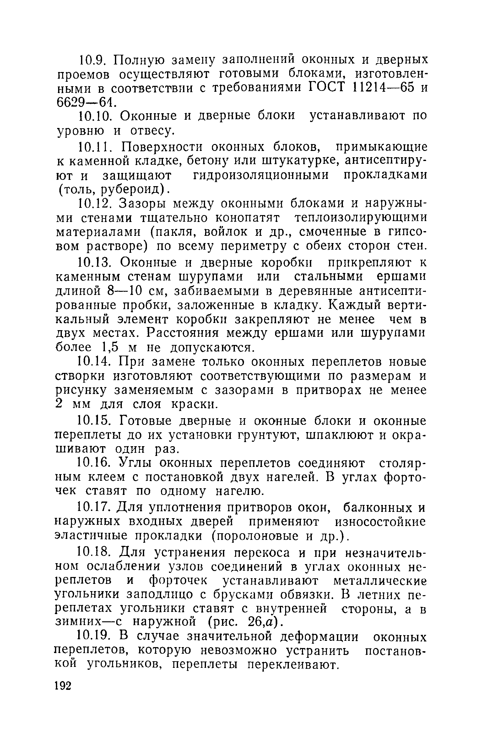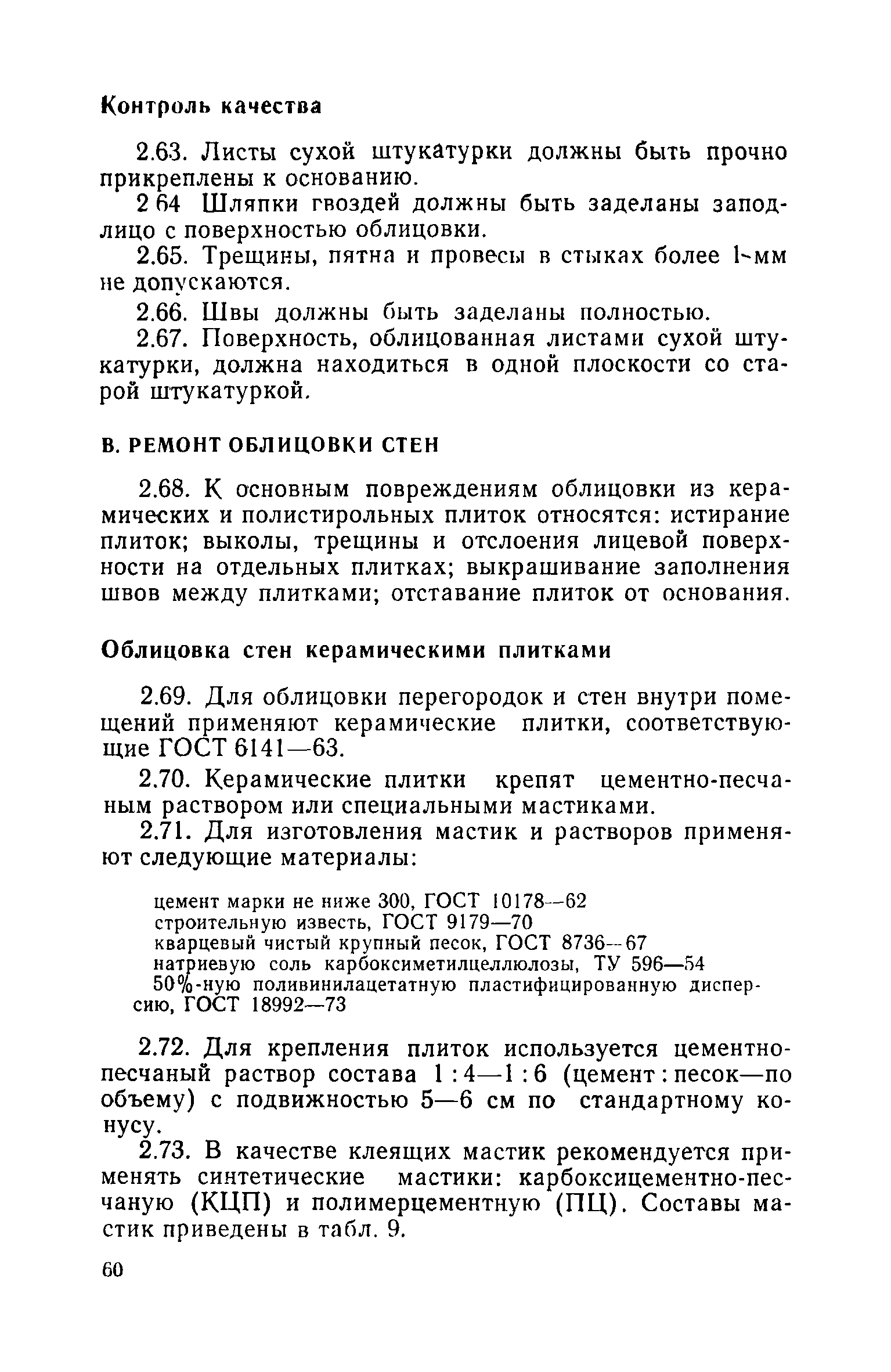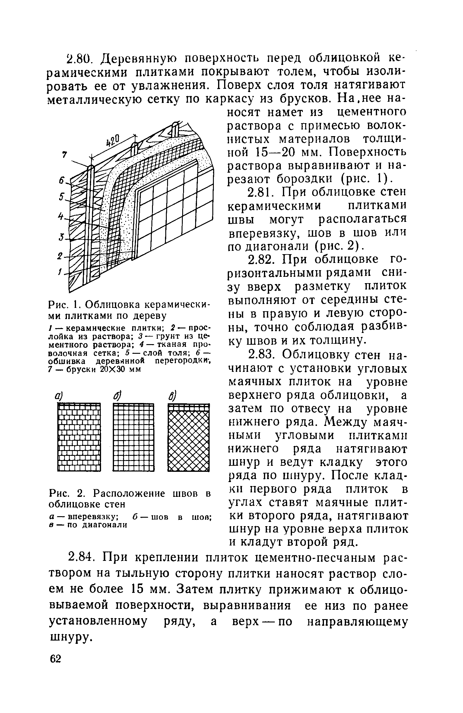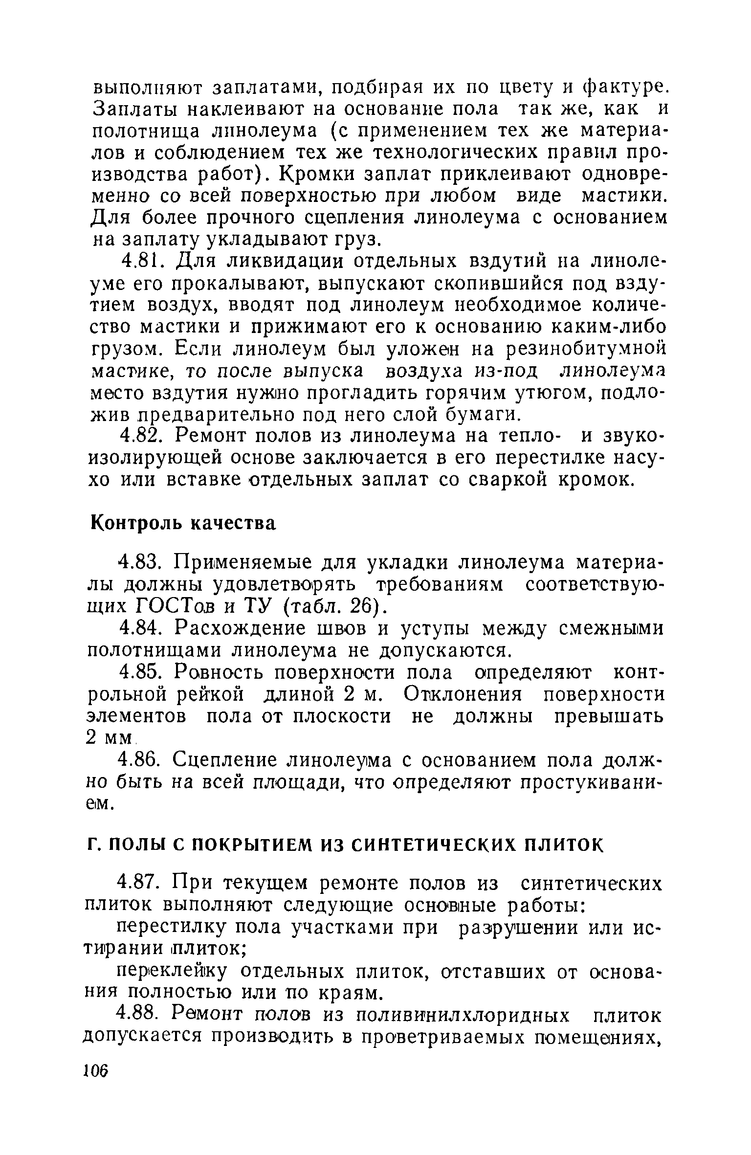 | Оглавление: | Предисловие Глава 1. Организация текущего ремонта жилых зданий 1. Планово-предупредительный текущий ремонт 2. Планирование текущего ремонта 3. Организация профилактического текущего ремонта 4. Учет выполнения текущего ремонта Глава II. Технология текущего ремонта жилых зданий 1. Организация ремонтных работ 2. Ремонт штукатурки и облицовки внутри помещений 3. Малярные и обойные работы 4. Ремонт полов 5. Ремонт перегородок 6. Ремонт лестниц 7. Ремонт стен 8. Ремонт крыш и кровель 9. Ремонт и очистка от загрязнений фасадов зданий 10. Ремонт оконных и дверных заполнений в каменных стенах 11. Остекление оконных переплетов и дверных полотен 12. Ремонт печей и дымовых труб 13. Антисептирование органических материалов при текущем ремонте жилых зданий 14. Ремонт санитарно-технических устройств Глава III. Организация мастерских и баз проката средств механизации 1. Рекомендации по улучшению работы мастерских текущего ремонта жилых домов 2. Рекомендации по организации баз проката и комплектованию их машинами и оборудованием Приложения |