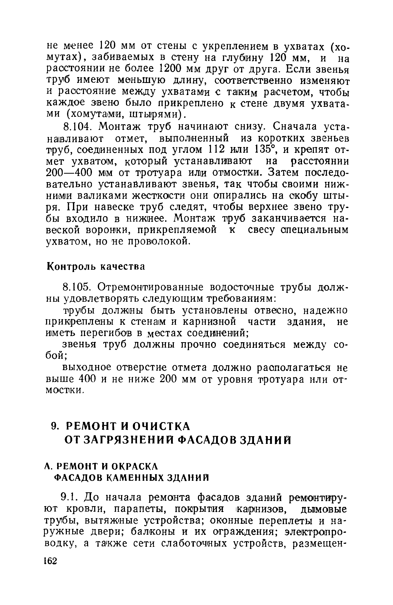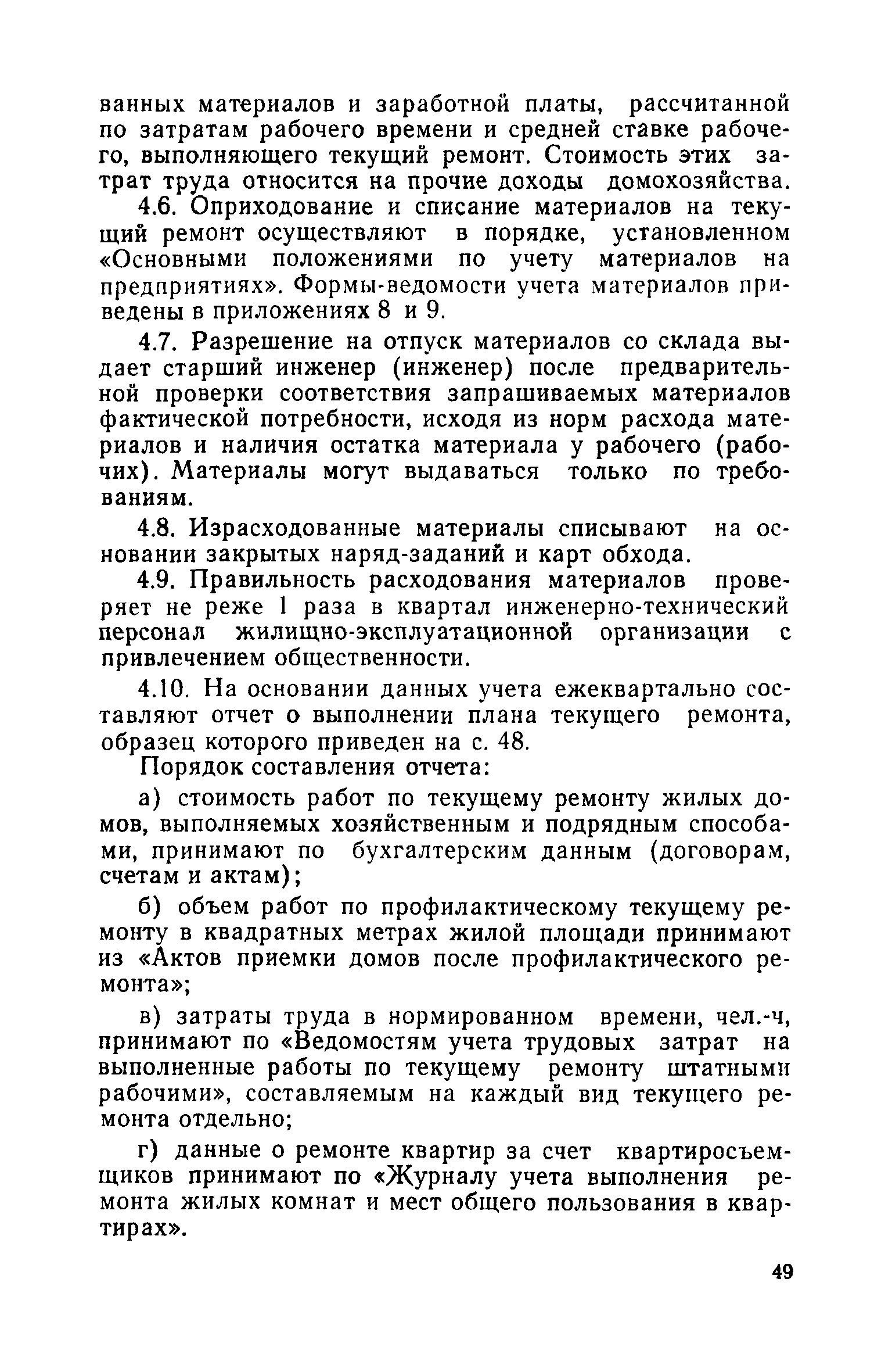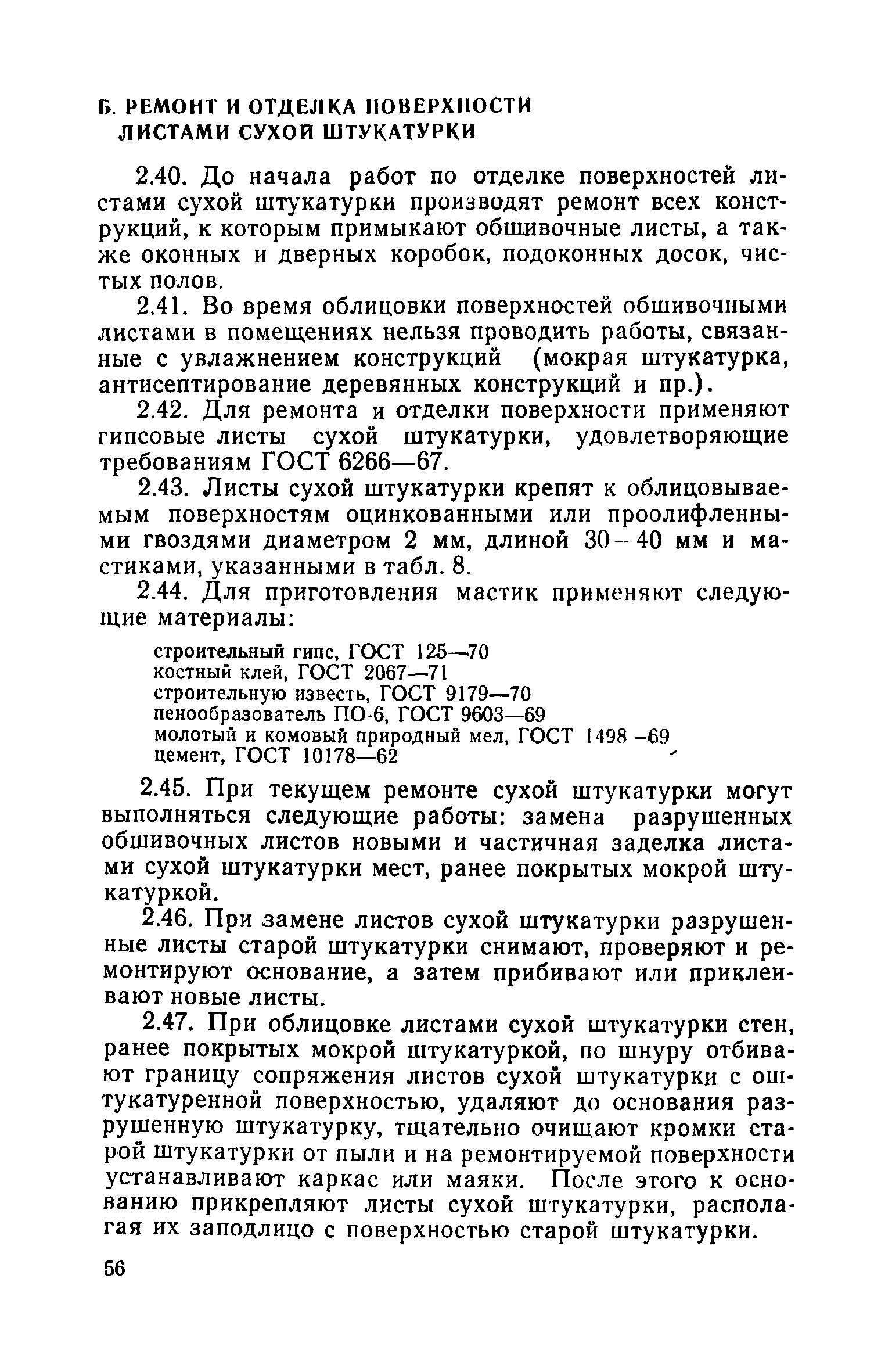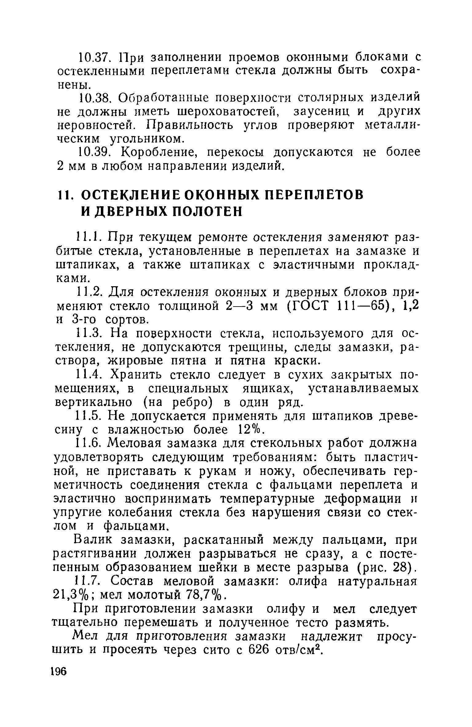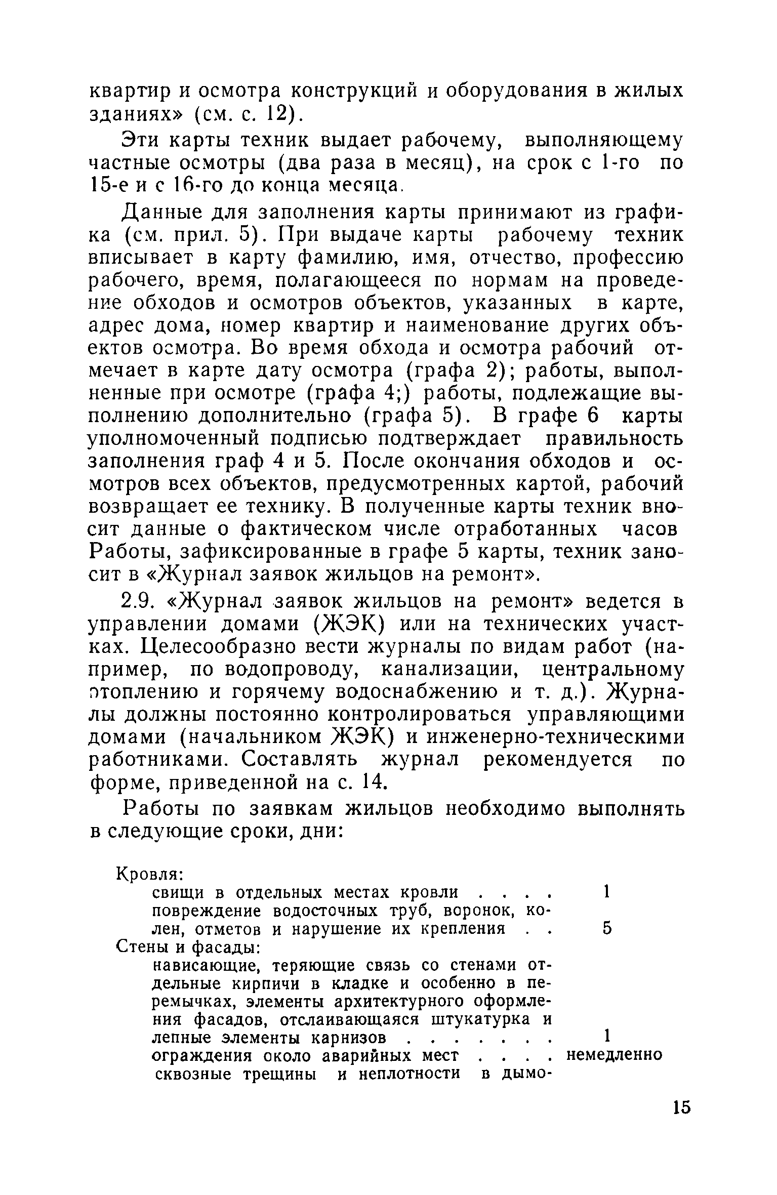 | Оглавление: | Предисловие Глава 1. Организация текущего ремонта жилых зданий 1. Планово-предупредительный текущий ремонт 2. Планирование текущего ремонта 3. Организация профилактического текущего ремонта 4. Учет выполнения текущего ремонта Глава II. Технология текущего ремонта жилых зданий 1. Организация ремонтных работ 2. Ремонт штукатурки и облицовки внутри помещений 3. Малярные и обойные работы 4. Ремонт полов 5. Ремонт перегородок 6. Ремонт лестниц 7. Ремонт стен 8. Ремонт крыш и кровель 9. Ремонт и очистка от загрязнений фасадов зданий 10. Ремонт оконных и дверных заполнений в каменных стенах 11. Остекление оконных переплетов и дверных полотен 12. Ремонт печей и дымовых труб 13. Антисептирование органических материалов при текущем ремонте жилых зданий 14. Ремонт санитарно-технических устройств Глава III. Организация мастерских и баз проката средств механизации 1. Рекомендации по улучшению работы мастерских текущего ремонта жилых домов 2. Рекомендации по организации баз проката и комплектованию их машинами и оборудованием Приложения |