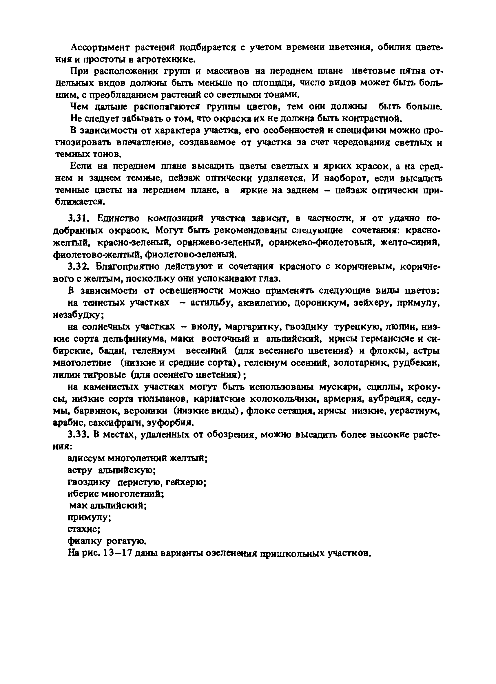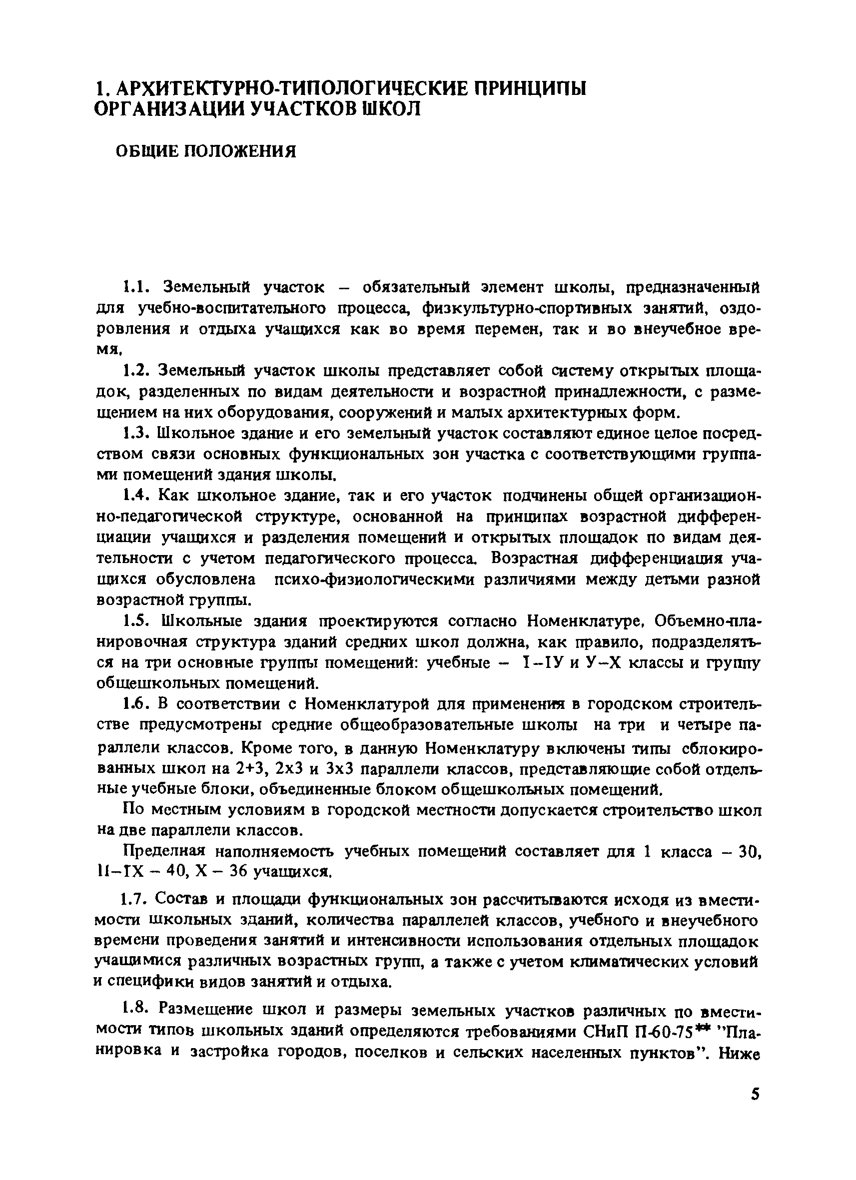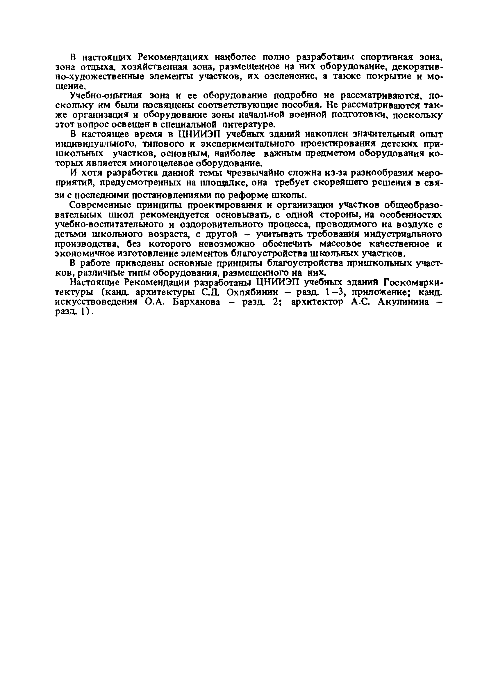 | Оглавление: | Введение 1. Архитектурно-типологические принципы организации участков школ Общие положения Функциональная и архитектурно-планировочная организация участков 2. Особенности эксплуатации пришкольных участков и современные требования к их благоустройству Функциональное зонирование площадок пришкольного участка Номенклатура типовых сооружений, оборудования и элементов благоустройства участков общеобразовательных школ Общие требования к элементам благоустройства пришкольных участков Специальные требования к проектированию типовых сооружений, оборудования и элементов благоустройства 3. Декоративно-художественные элементы участков Номенклатура декоративно-художественных элементов, размещенных на пришкольных участках Озеленение пришкольных участков Особенности покрытий и мощений участков Заключение Приложение. Классификация древесных пород |