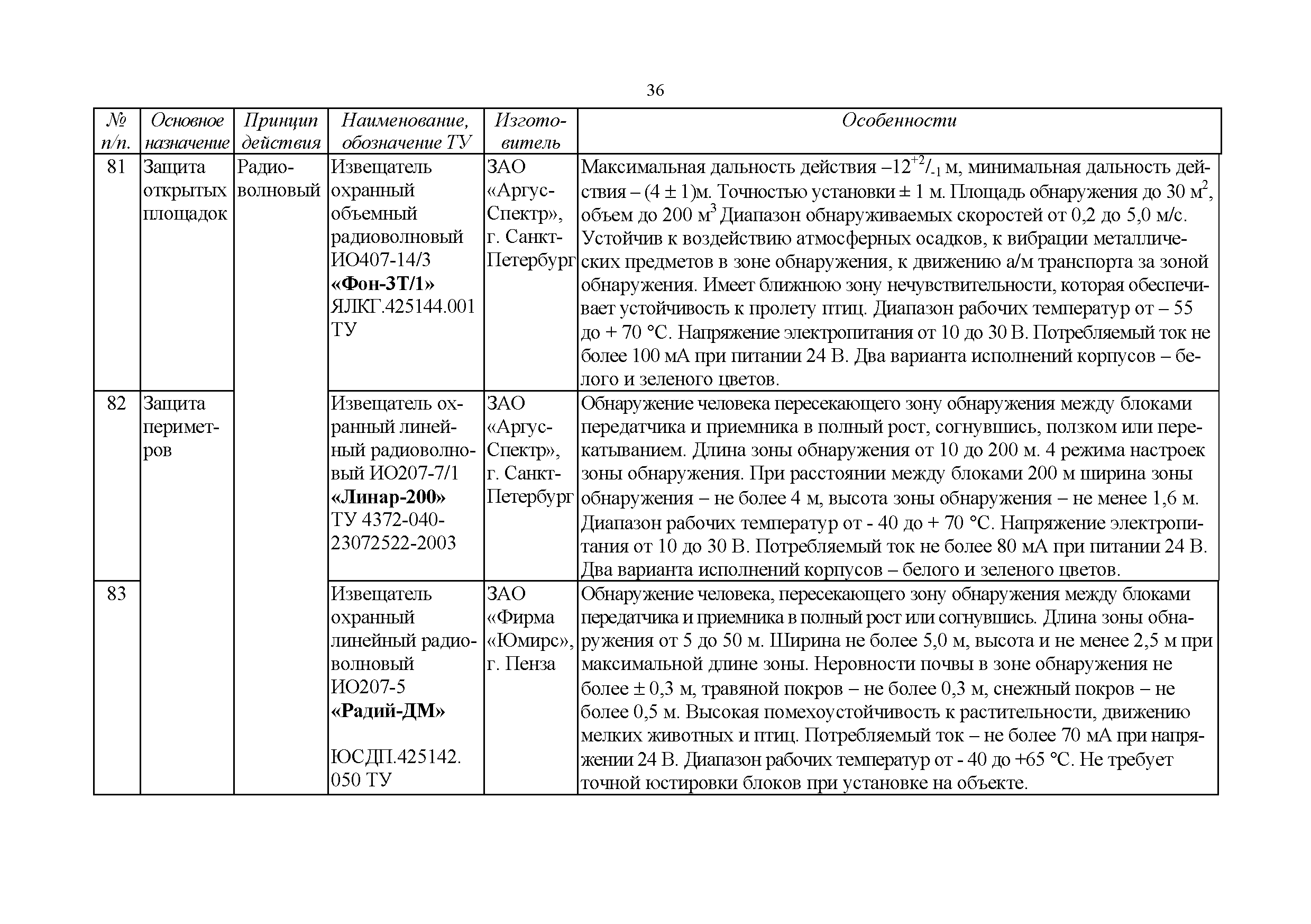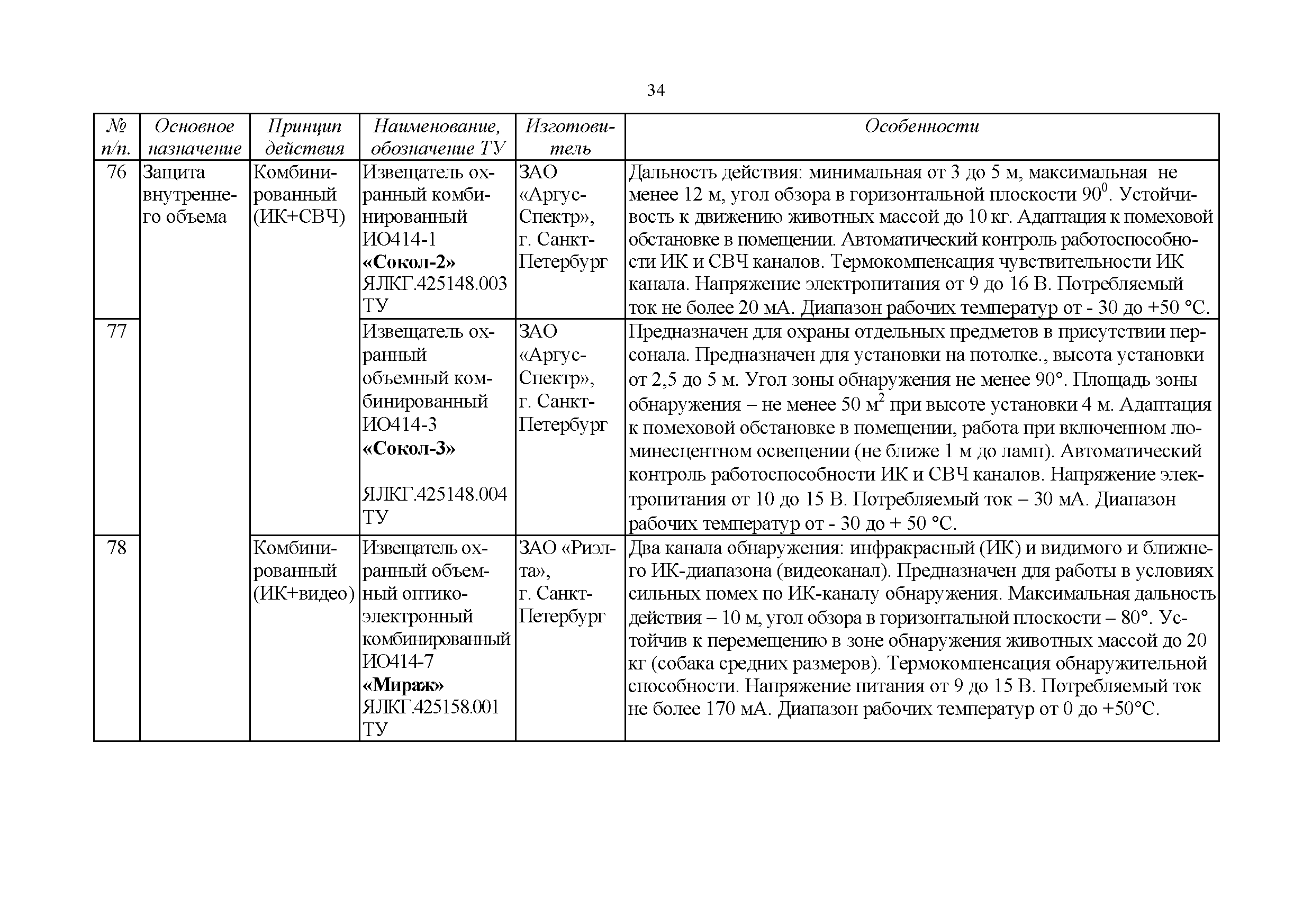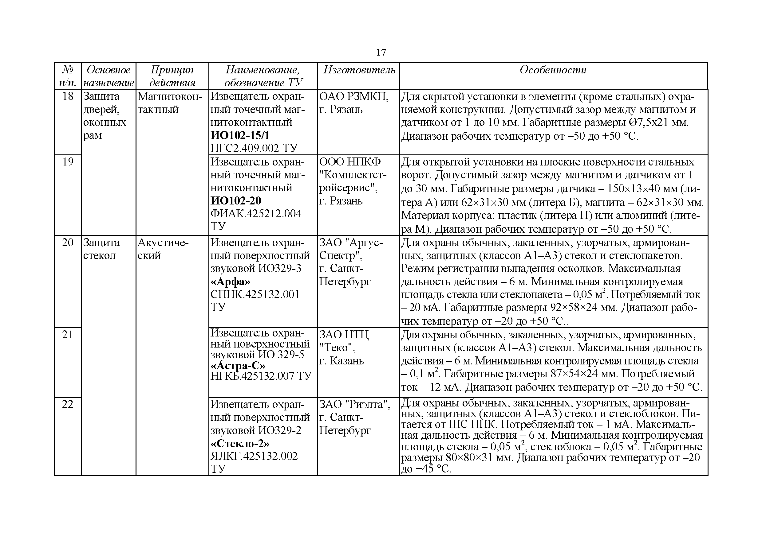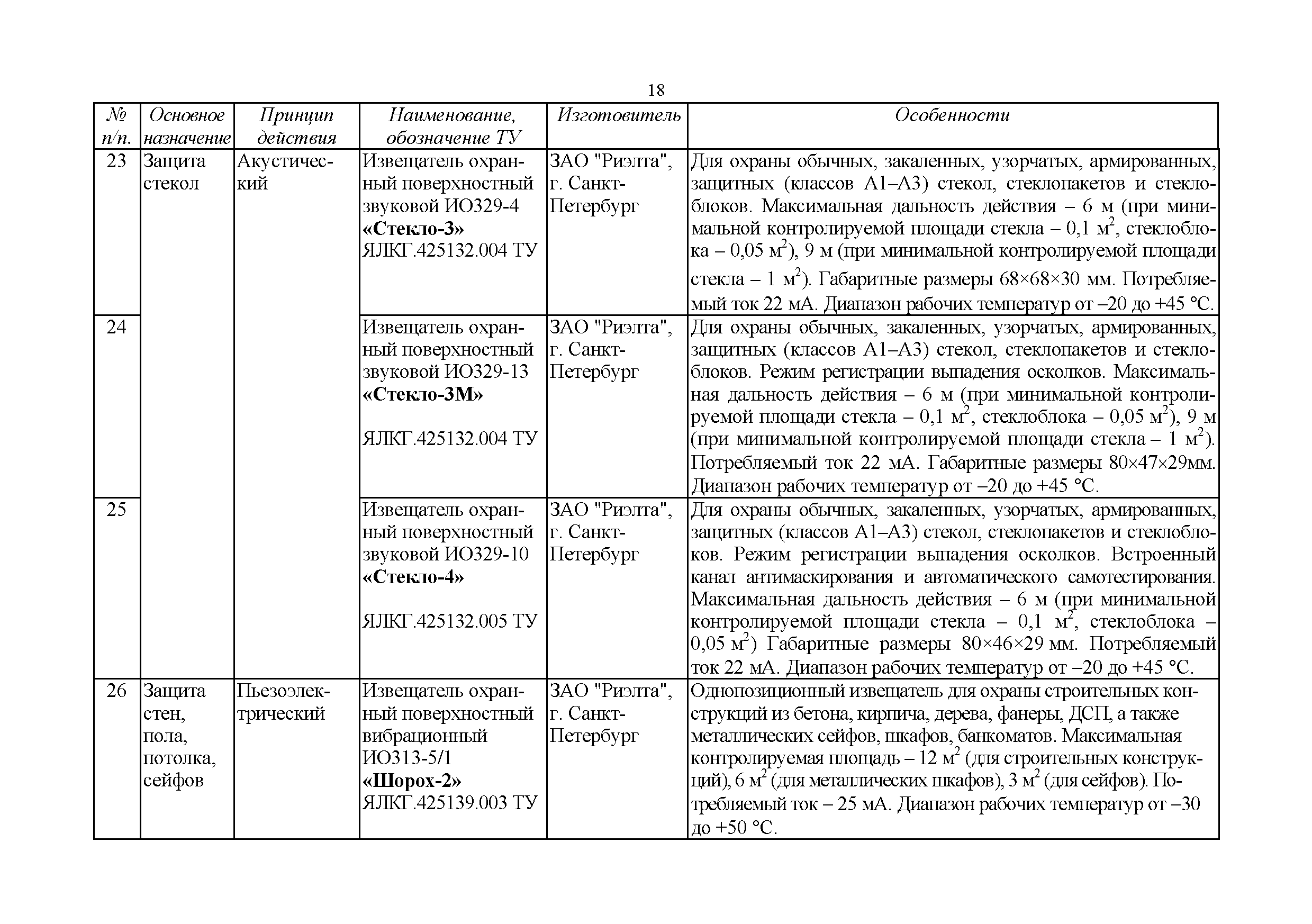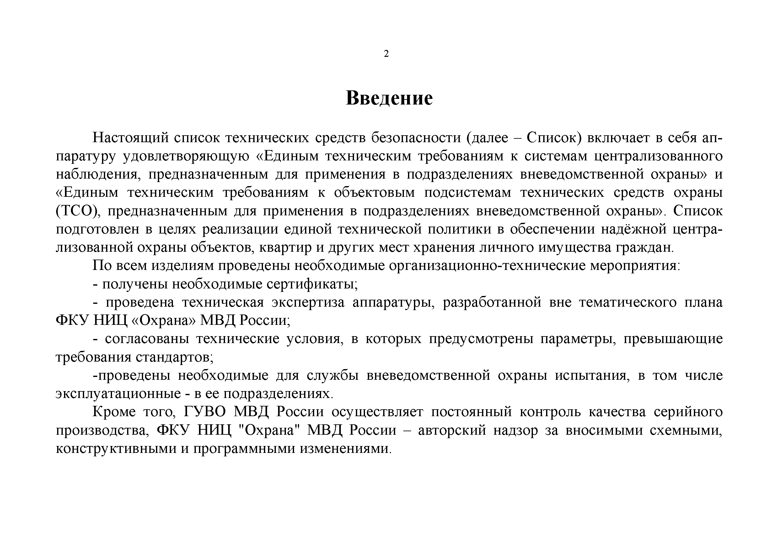 Список технических средств безопасности удовлетворяющую "Единым техническим требованиям к системам централизованного наблюдения, предназначенным для применения в подразделениях вневедомственной охраны" и "Единым техническим требованиям к объектовым подсистемам охраны, предназначенным для применения в подразделениях вневедомственной охраны"| Статус: | не действует | | Название рус.: | Список технических средств безопасности удовлетворяющую "Единым техническим требованиям к системам централизованного наблюдения, предназначенным для применения в подразделениях вневедомственной охраны" и "Единым техническим требованиям к объектовым подсистемам охраны, предназначенным для применения в подразделениях вневедомственной охраны" | | Дата добавления в базу: | 01.09.2013 | | Дата актуализации: | 01.01.2021 | | Область применения: | Список технических средств безопасности включает в себя аппаратуру удовлетворяющую "Единым техническим требованиям к системам централизованного наблюдения, предназначенным для применения в подразделениях вневедомственной охраны" и "Единым техническим требованиям к объектовым подсистемам технических средств охраны (ТСО), предназначенным для применения в подразделениях вневедомственной охраны". Список подготовлен в целях реализации единой технической политики в обеспечении надежной централизованной охраны объектов, квартир и других мест хранения личного имущества граждан. | | Оглавление: | Введение 1 Аппаратура централизованного наблюдения 2 Средства обнаружения 2.1 Извещатели для помещений 2.2 Извещатели для открытых площадок 3 Объектовые средства 3.1 Интегрированные системы безопасности 3.2 Домофоны с функцией охраны 3.3 Источники электропитания 3.4 Средства тревожной сигнализации 3.5 Средства беспроводной охранной сигнализации | | Разработан: | ФКУ НИЦ Охрана МВД России