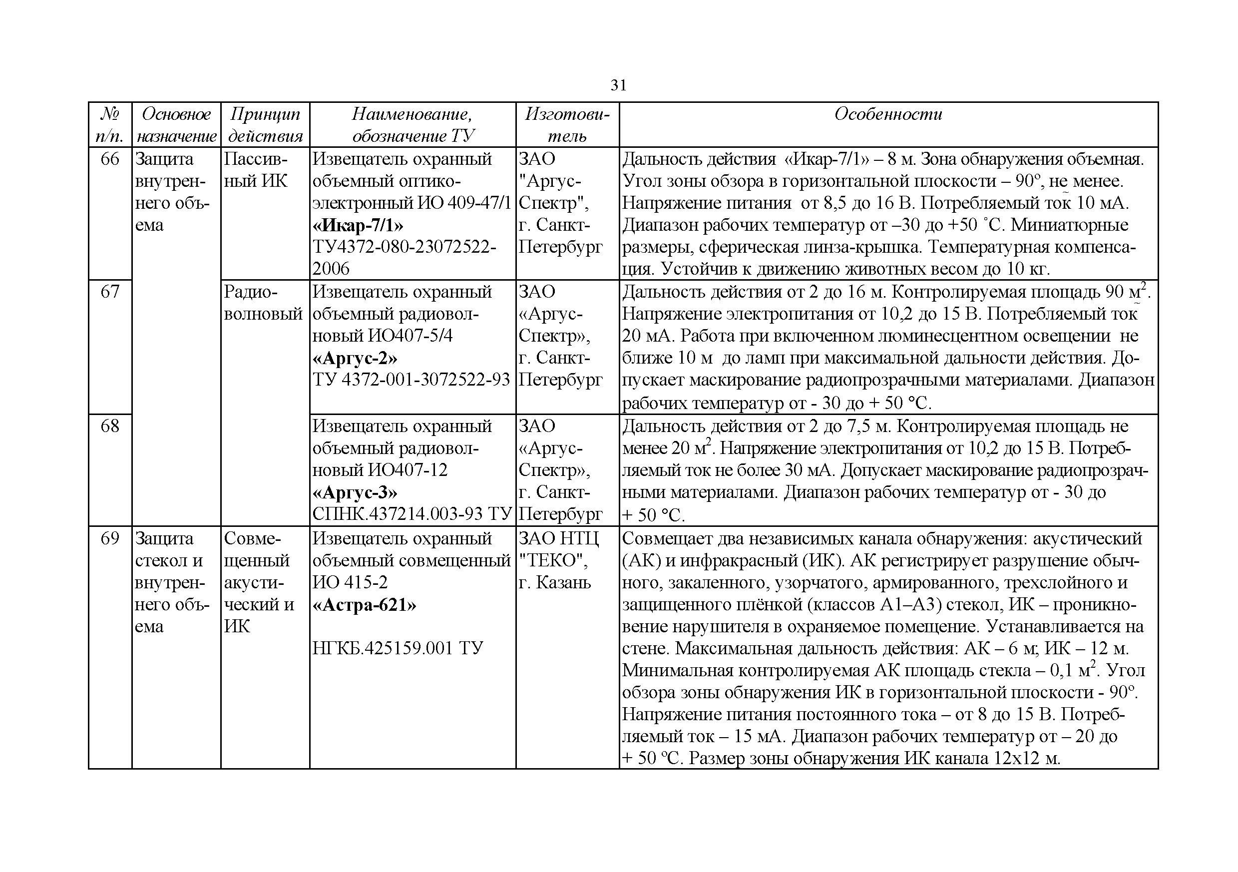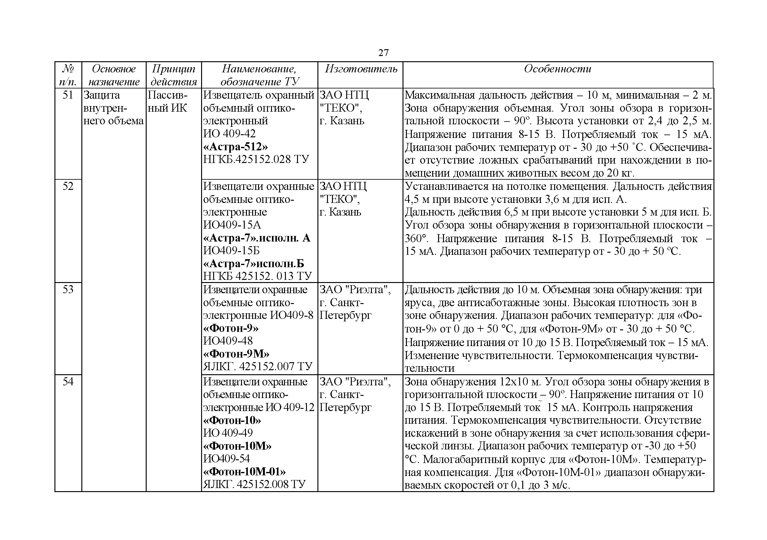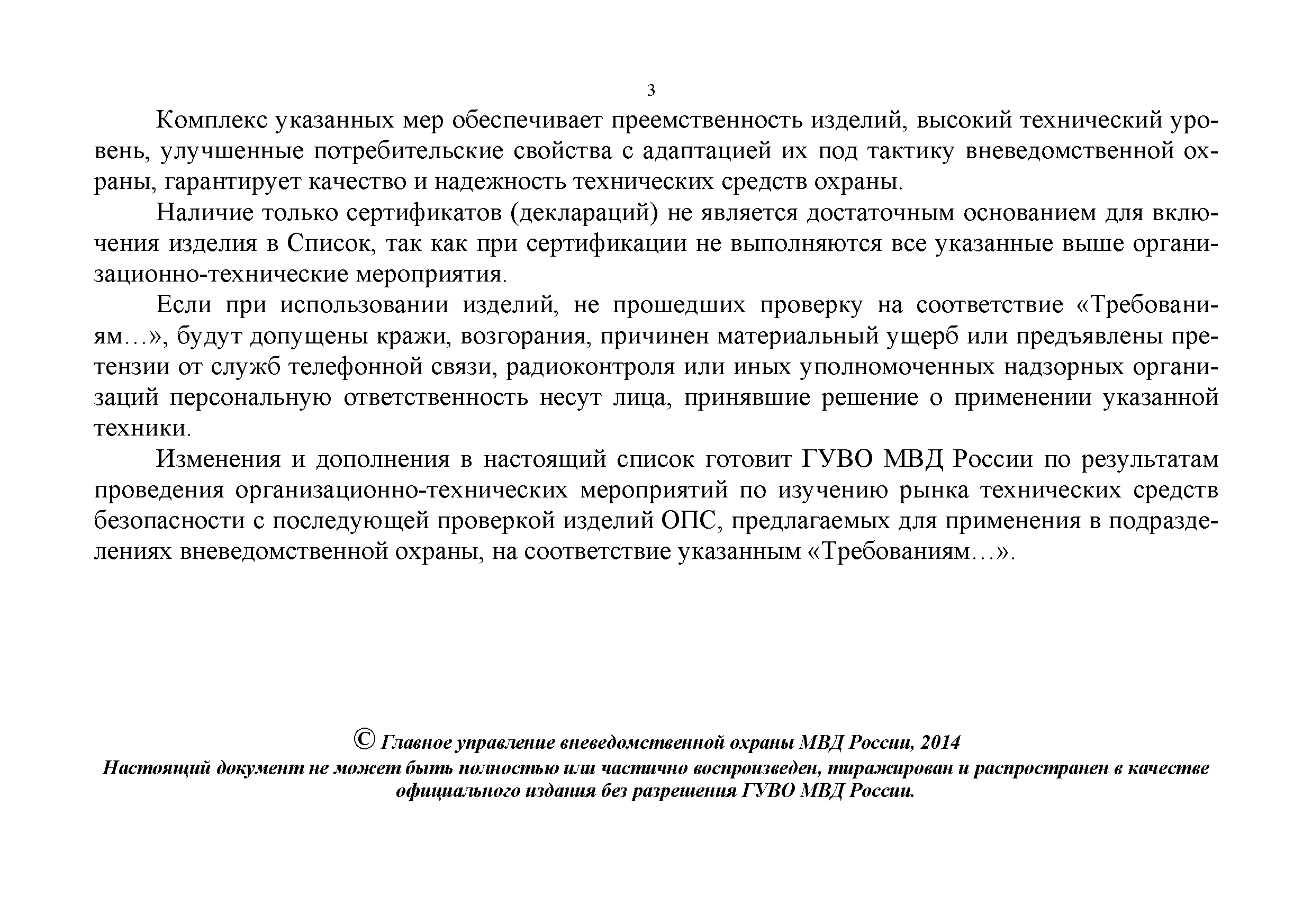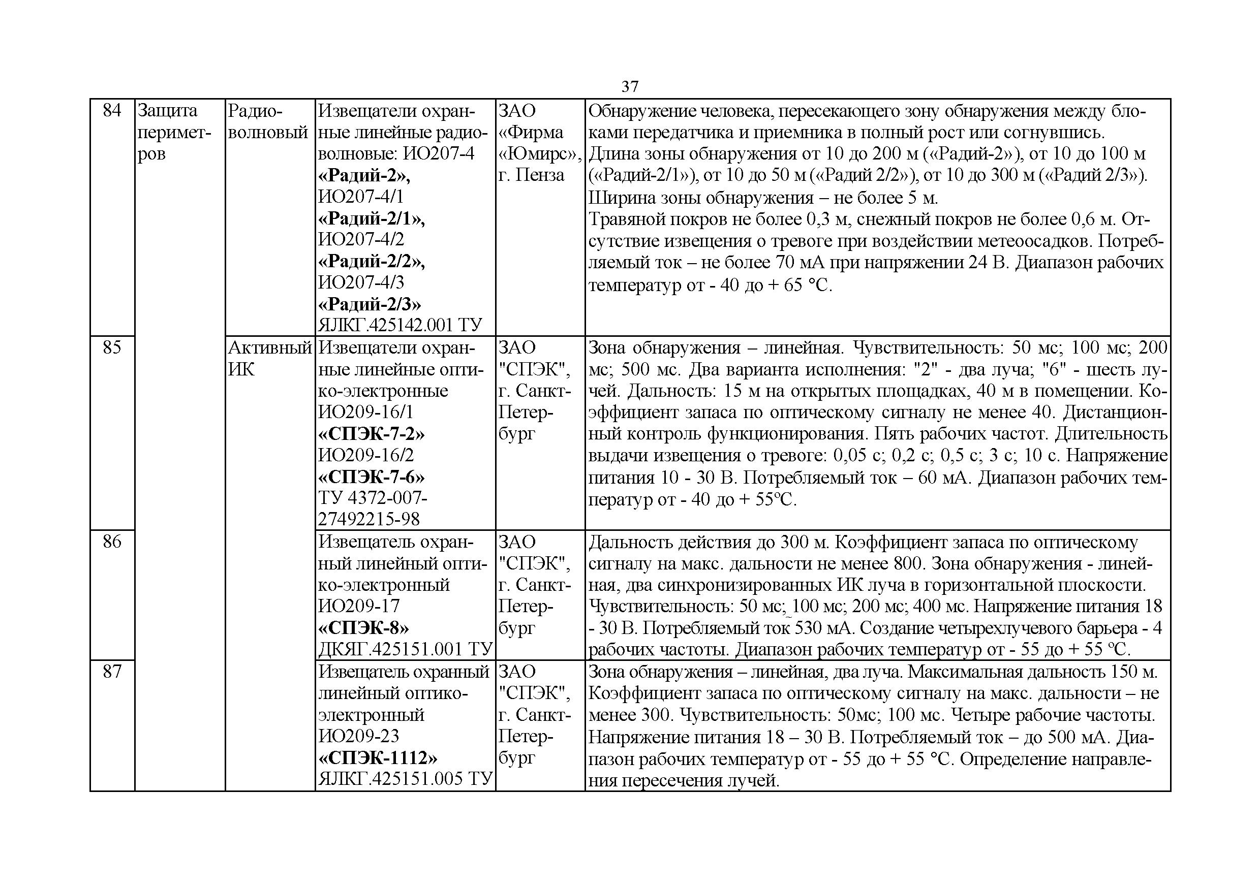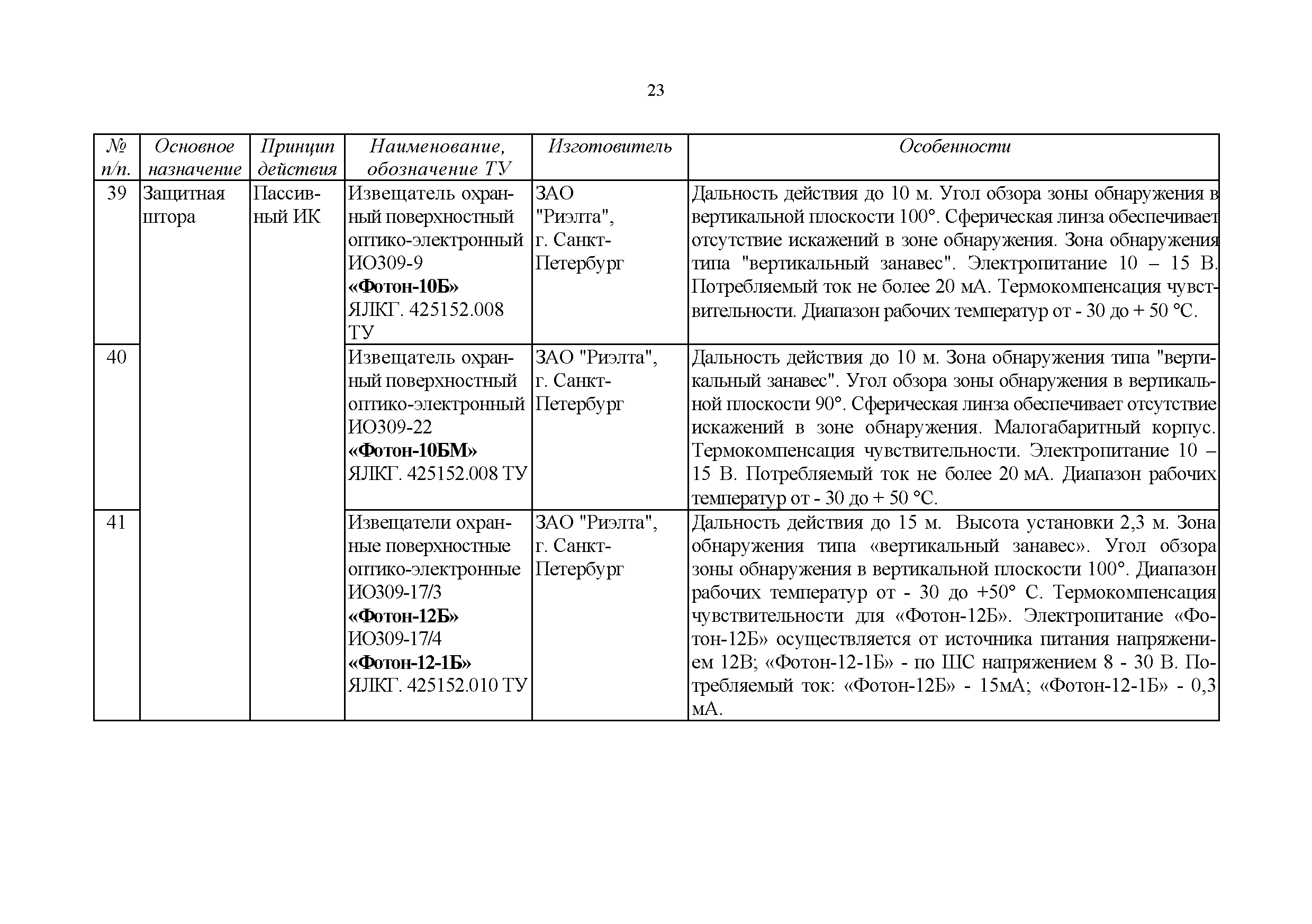 Список технических средств безопасности удовлетворяющую "Единым техническим требованиям к системам централизованного наблюдения, предназначенным для применения в подразделениях вневедомственной охраны" и "Единым техническим требованиям к объектовым подсистемам охраны, предназначенным для применения в подразделениях вневедомственной охраны"| Статус: | не действует | | Название рус.: | Список технических средств безопасности удовлетворяющую "Единым техническим требованиям к системам централизованного наблюдения, предназначенным для применения в подразделениях вневедомственной охраны" и "Единым техническим требованиям к объектовым подсистемам охраны, предназначенным для применения в подразделениях вневедомственной охраны" | | Дата добавления в базу: | 01.09.2013 | | Дата актуализации: | 01.01.2021 | | Область применения: | Список технических средств безопасности включает в себя аппаратуру удовлетворяющую "Единым техническим требованиям к системам централизованного наблюдения, предназначенным для применения в подразделениях вневедомственной охраны" и "Единым техническим требованиям к объектовым подсистемам технических средств охраны (ТСО), предназначенным для применения в подразделениях вневедомственной охраны". Список подготовлен в целях реализации единой технической политики в обеспечении надежной централизованной охраны объектов, квартир и других мест хранения личного имущества граждан. | | Оглавление: | Введение 1 Аппаратура централизованного наблюдения 2 Средства обнаружения 2.1 Извещатели для помещений 2.2 Извещатели для открытых площадок 3 Объектовые средства 3.1 Интегрированные системы безопасности 3.2 Домофоны с функцией охраны 3.3 Источники электропитания 3.4 Средства тревожной сигнализации 3.5 Средства беспроводной охранной сигнализации | | Разработан: | ФКУ НИЦ Охрана МВД России
