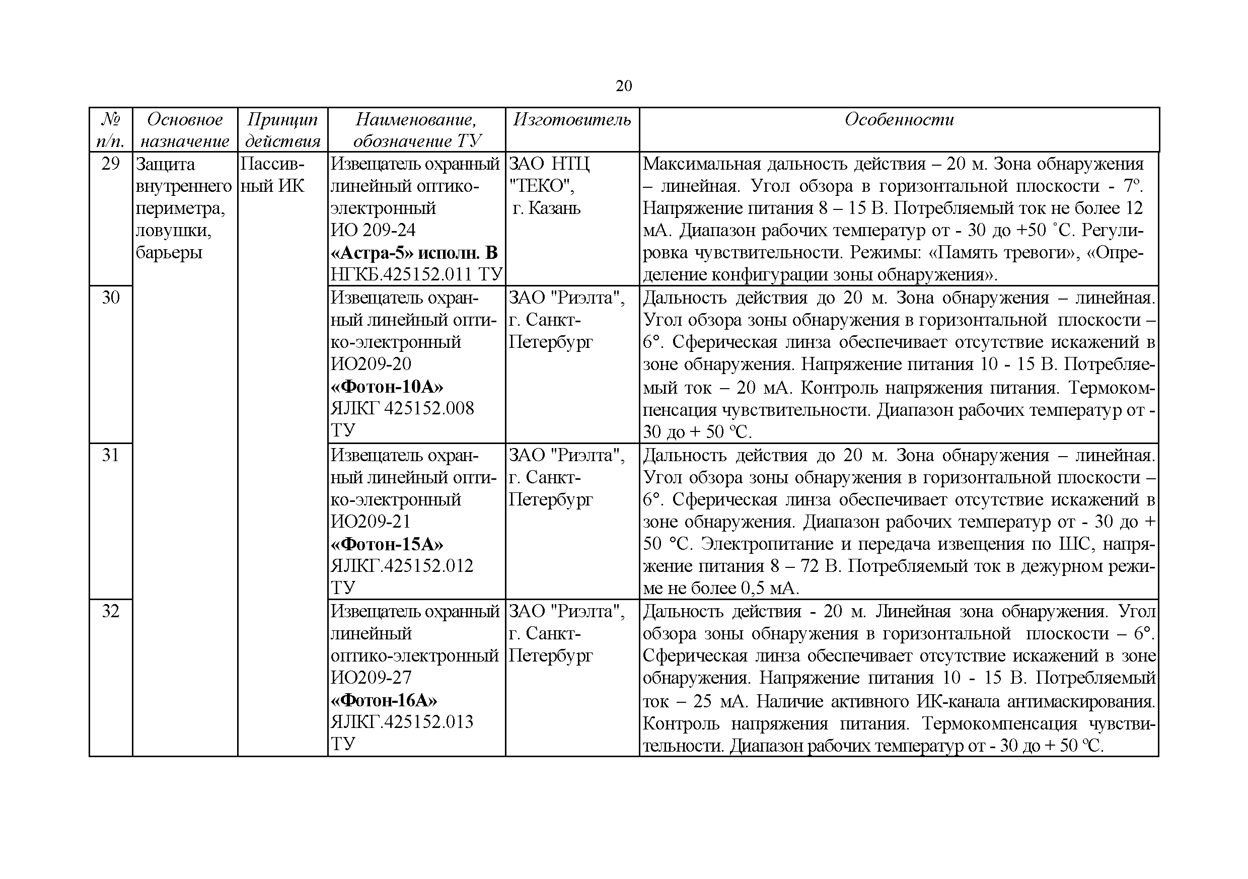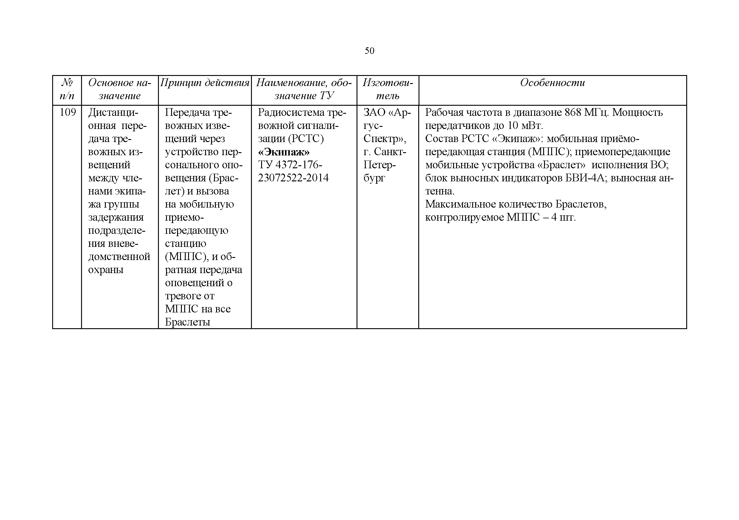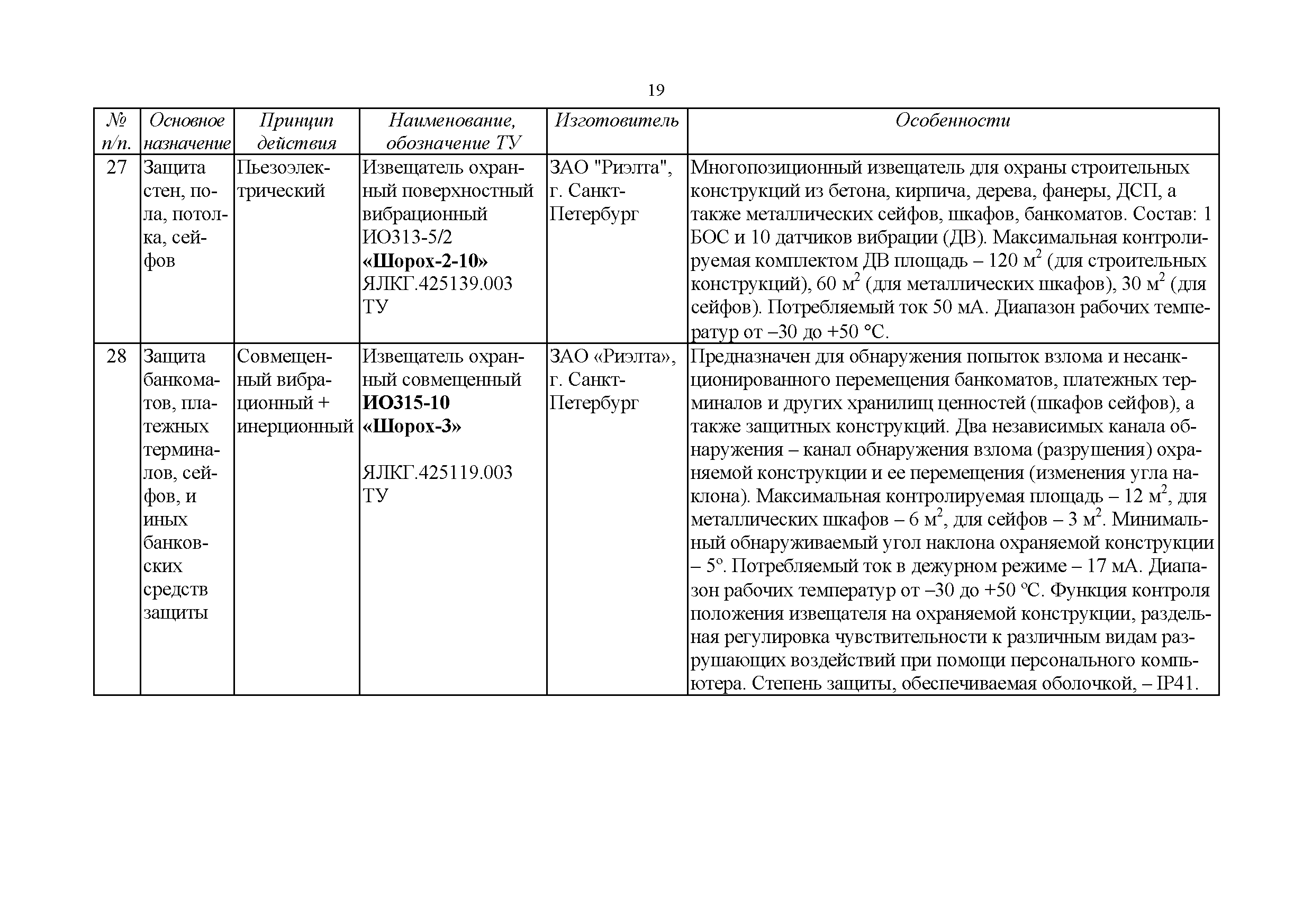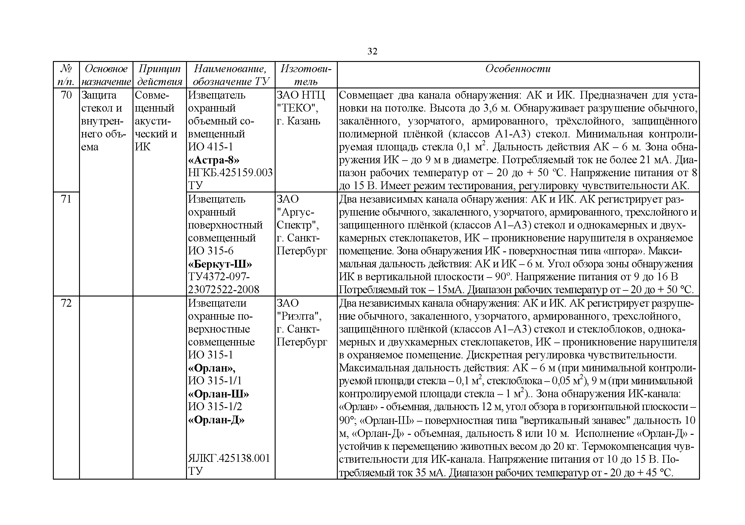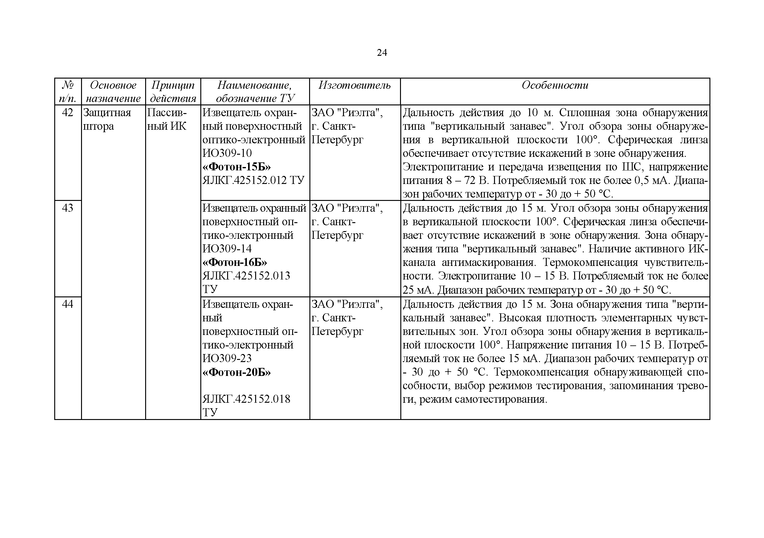 Список технических средств безопасности удовлетворяющую "Единым техническим требованиям к системам централизованного наблюдения, предназначенным для применения в подразделениях вневедомственной охраны" и "Единым техническим требованиям к объектовым подсистемам охраны, предназначенным для применения в подразделениях вневедомственной охраны"| Статус: | не действует | | Название рус.: | Список технических средств безопасности удовлетворяющую "Единым техническим требованиям к системам централизованного наблюдения, предназначенным для применения в подразделениях вневедомственной охраны" и "Единым техническим требованиям к объектовым подсистемам охраны, предназначенным для применения в подразделениях вневедомственной охраны" | | Дата добавления в базу: | 01.09.2013 | | Дата актуализации: | 01.01.2021 | | Область применения: | Список технических средств безопасности включает в себя аппаратуру удовлетворяющую "Единым техническим требованиям к системам централизованного наблюдения, предназначенным для применения в подразделениях вневедомственной охраны" и "Единым техническим требованиям к объектовым подсистемам технических средств охраны (ТСО), предназначенным для применения в подразделениях вневедомственной охраны". Список подготовлен в целях реализации единой технической политики в обеспечении надежной централизованной охраны объектов, квартир и других мест хранения личного имущества граждан. | | Оглавление: | Введение 1 Аппаратура централизованного наблюдения 2 Средства обнаружения 2.1 Извещатели для помещений 2.2 Извещатели для открытых площадок 3 Объектовые средства 3.1 Интегрированные системы безопасности 3.2 Домофоны с функцией охраны 3.3 Источники электропитания 3.4 Средства тревожной сигнализации 3.5 Средства беспроводной охранной сигнализации | | Разработан: | ФКУ НИЦ Охрана МВД России