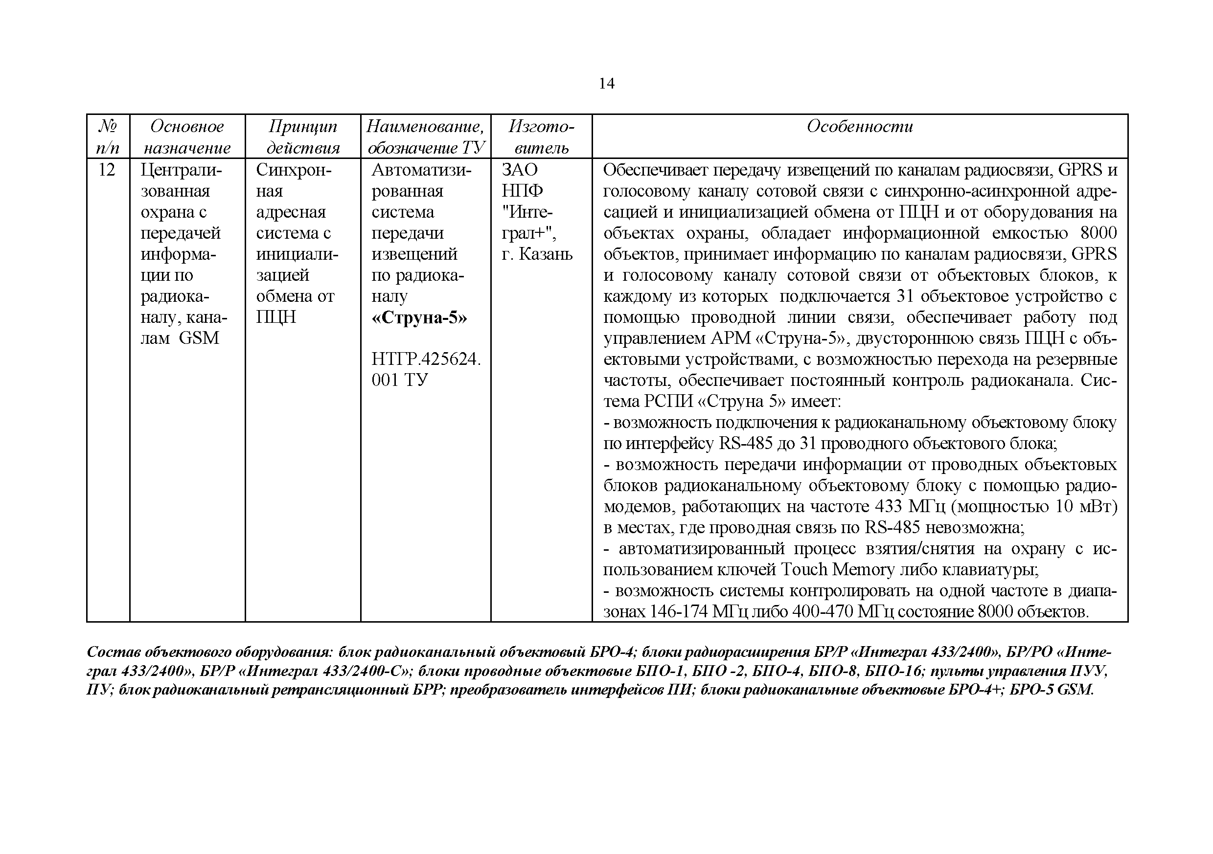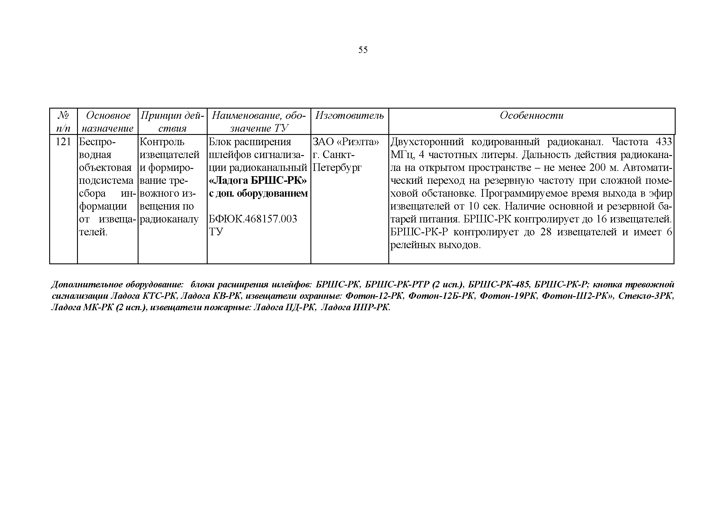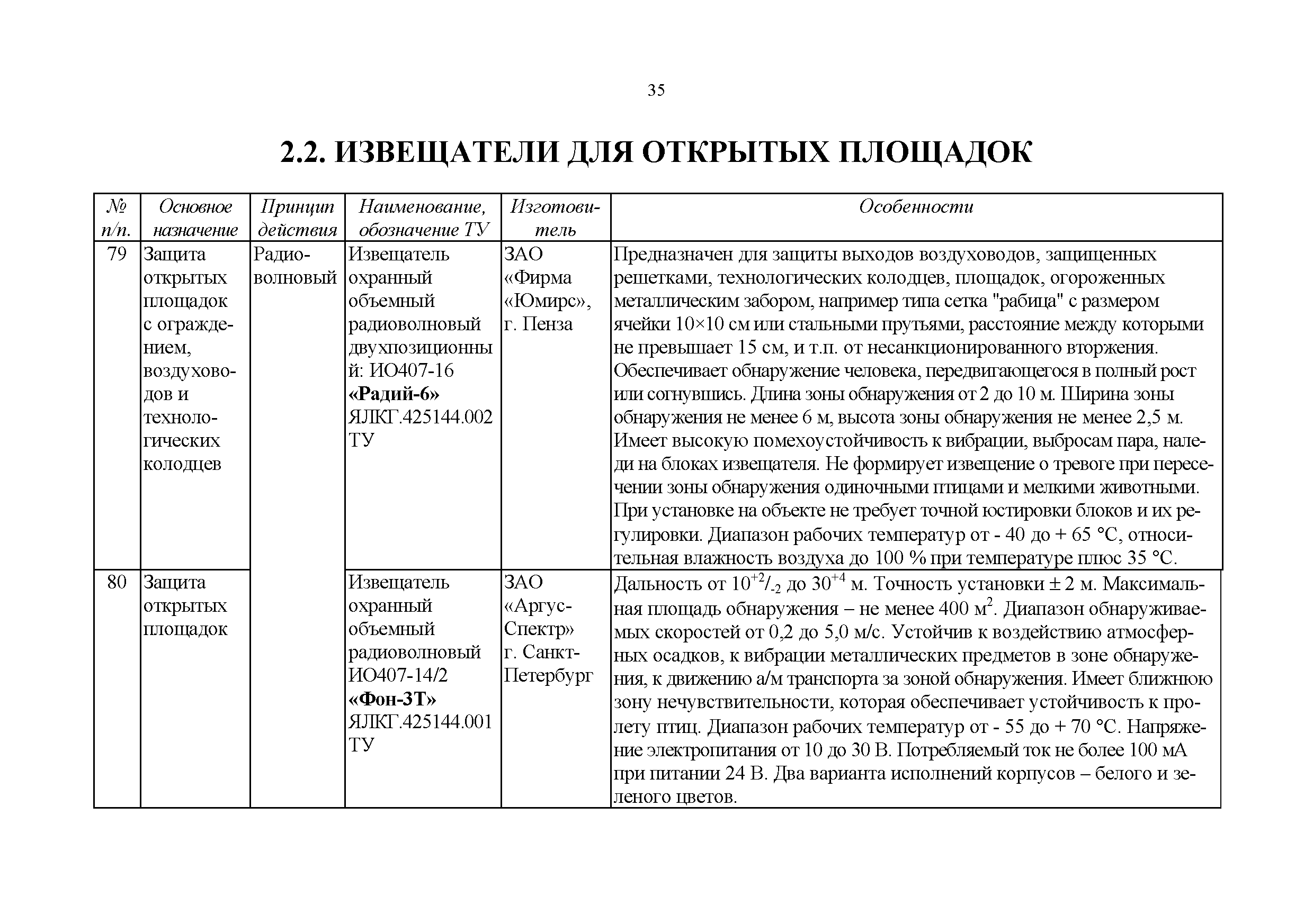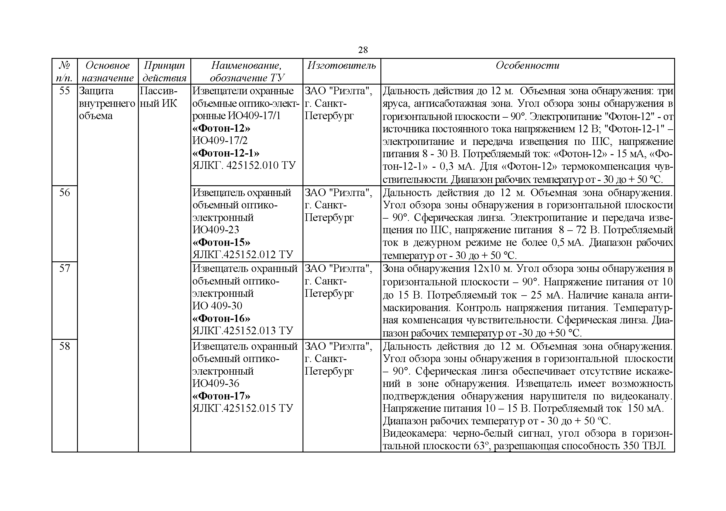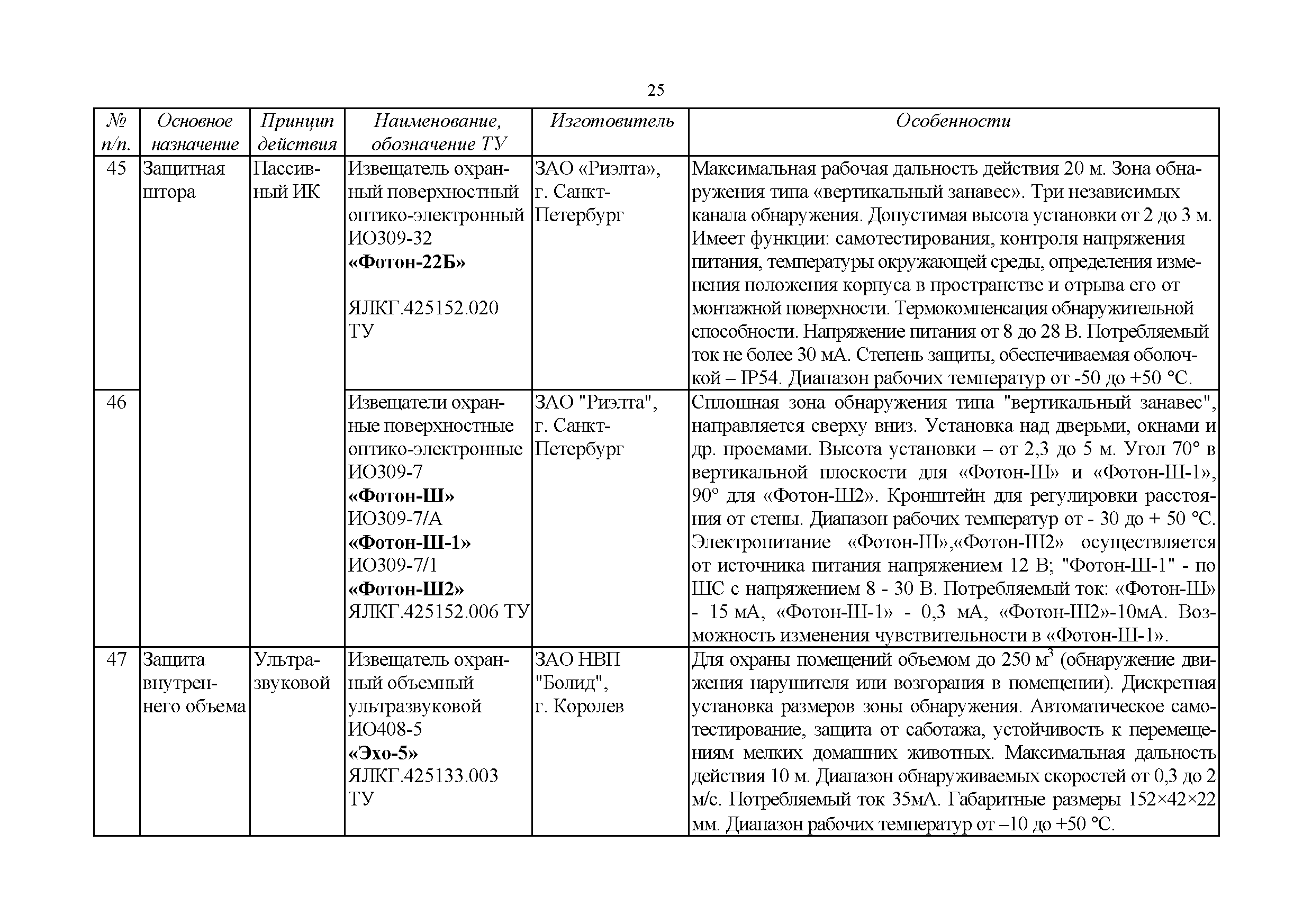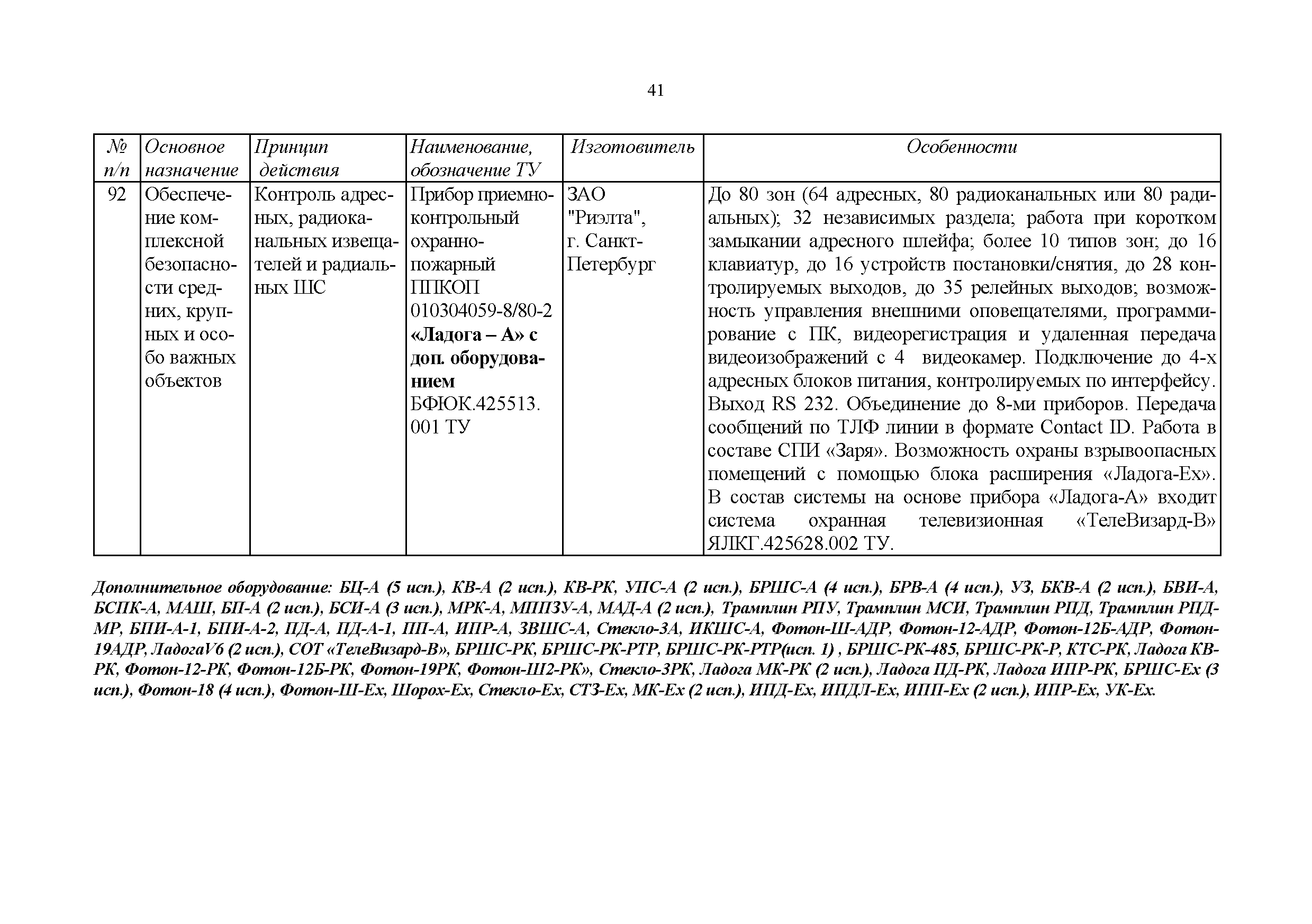 Список технических средств безопасности удовлетворяющую "Единым техническим требованиям к системам централизованного наблюдения, предназначенным для применения в подразделениях вневедомственной охраны" и "Единым техническим требованиям к объектовым подсистемам охраны, предназначенным для применения в подразделениях вневедомственной охраны"| Статус: | не действует | | Название рус.: | Список технических средств безопасности удовлетворяющую "Единым техническим требованиям к системам централизованного наблюдения, предназначенным для применения в подразделениях вневедомственной охраны" и "Единым техническим требованиям к объектовым подсистемам охраны, предназначенным для применения в подразделениях вневедомственной охраны" | | Дата добавления в базу: | 01.09.2013 | | Дата актуализации: | 01.01.2021 | | Область применения: | Список технических средств безопасности включает в себя аппаратуру удовлетворяющую "Единым техническим требованиям к системам централизованного наблюдения, предназначенным для применения в подразделениях вневедомственной охраны" и "Единым техническим требованиям к объектовым подсистемам технических средств охраны (ТСО), предназначенным для применения в подразделениях вневедомственной охраны". Список подготовлен в целях реализации единой технической политики в обеспечении надежной централизованной охраны объектов, квартир и других мест хранения личного имущества граждан. | | Оглавление: | Введение 1 Аппаратура централизованного наблюдения 2 Средства обнаружения 2.1 Извещатели для помещений 2.2 Извещатели для открытых площадок 3 Объектовые средства 3.1 Интегрированные системы безопасности 3.2 Домофоны с функцией охраны 3.3 Источники электропитания 3.4 Средства тревожной сигнализации 3.5 Средства беспроводной охранной сигнализации | | Разработан: | ФКУ НИЦ Охрана МВД России