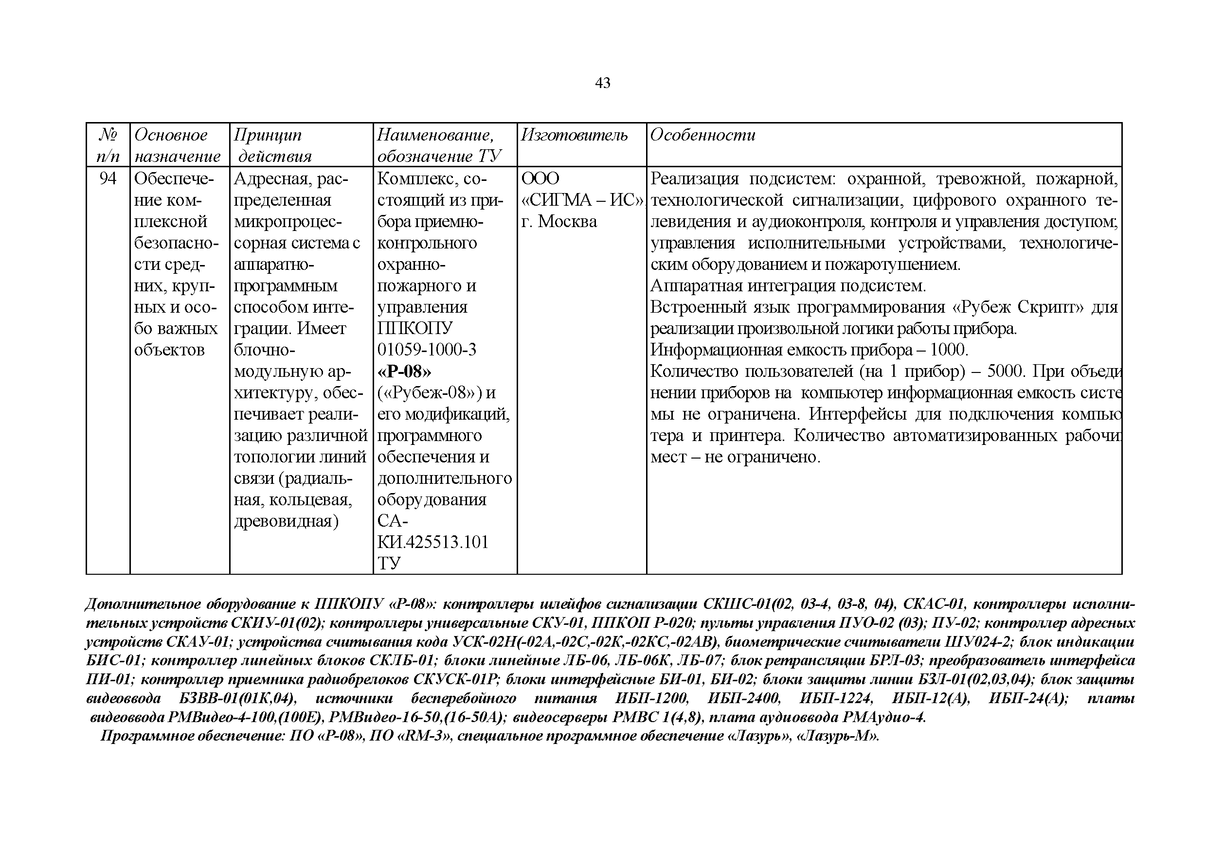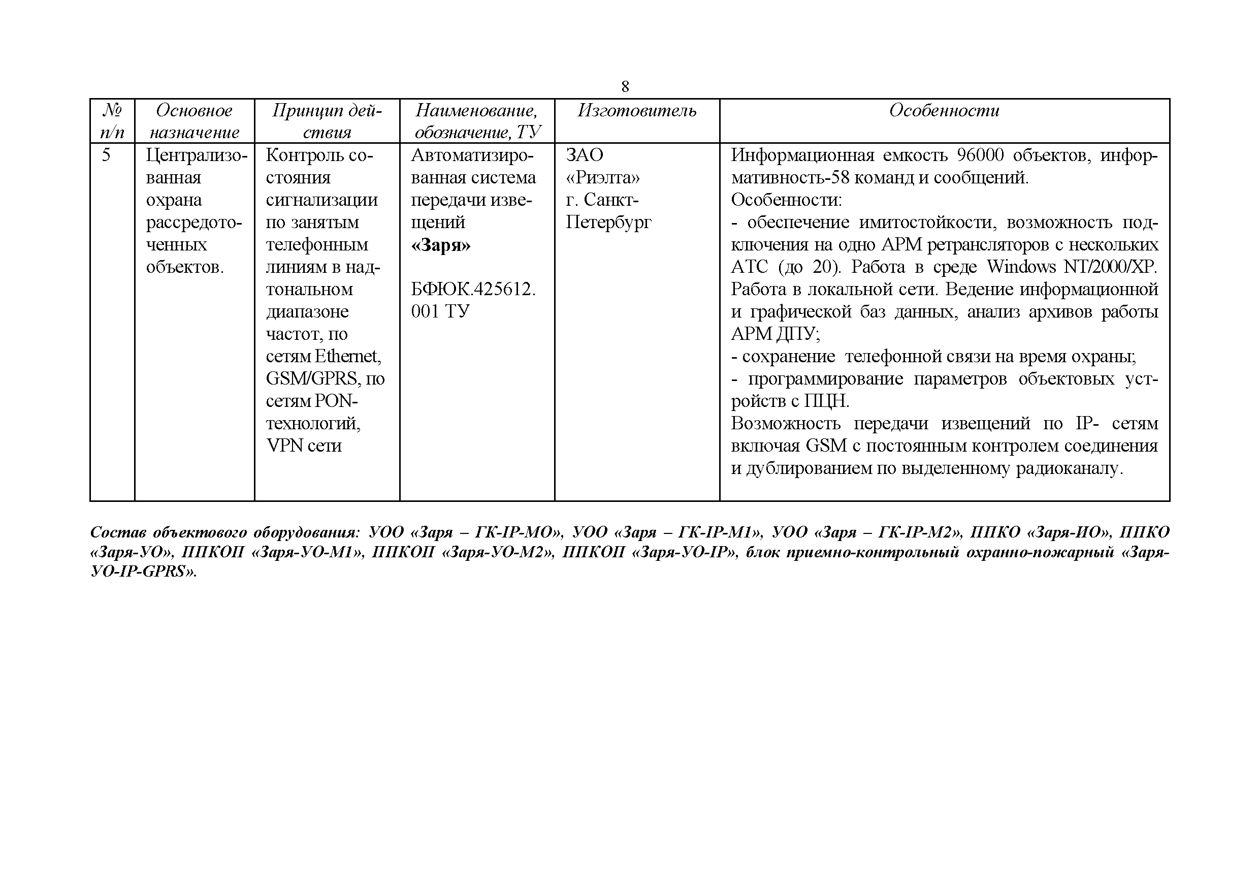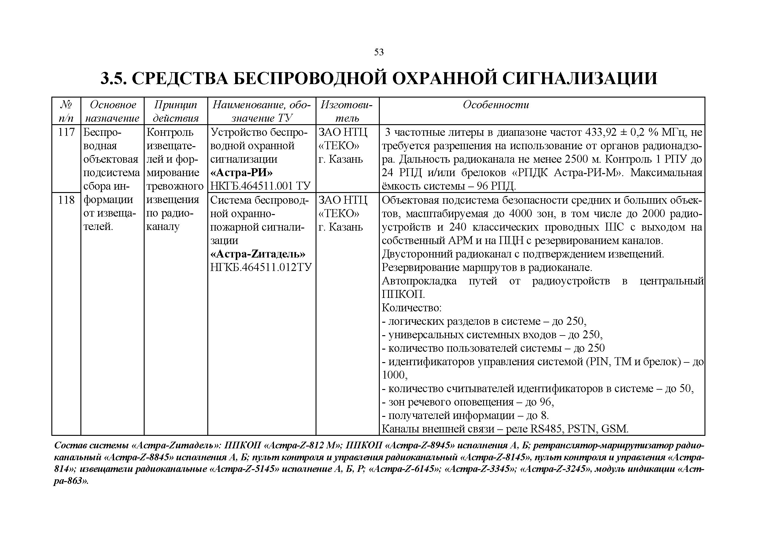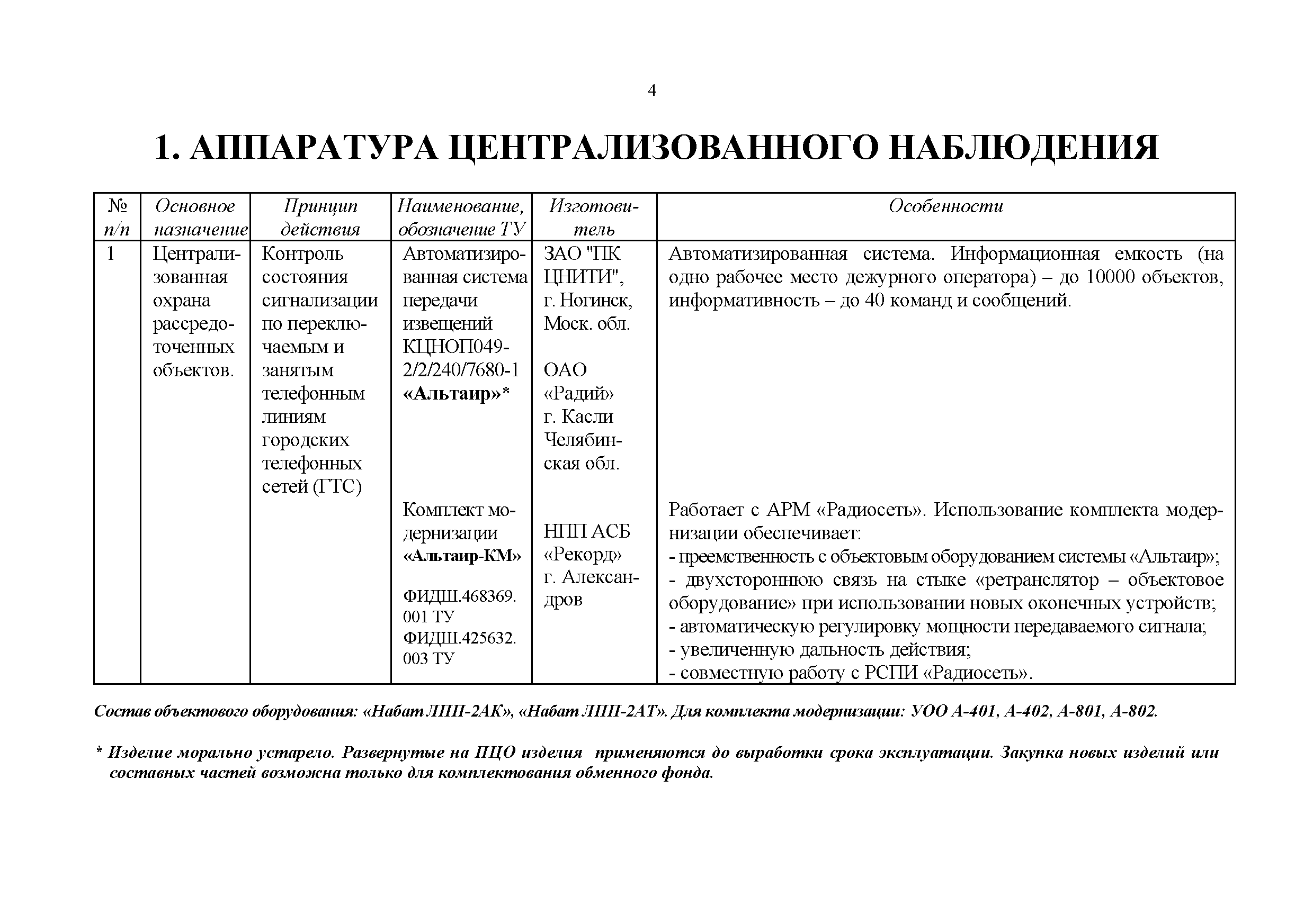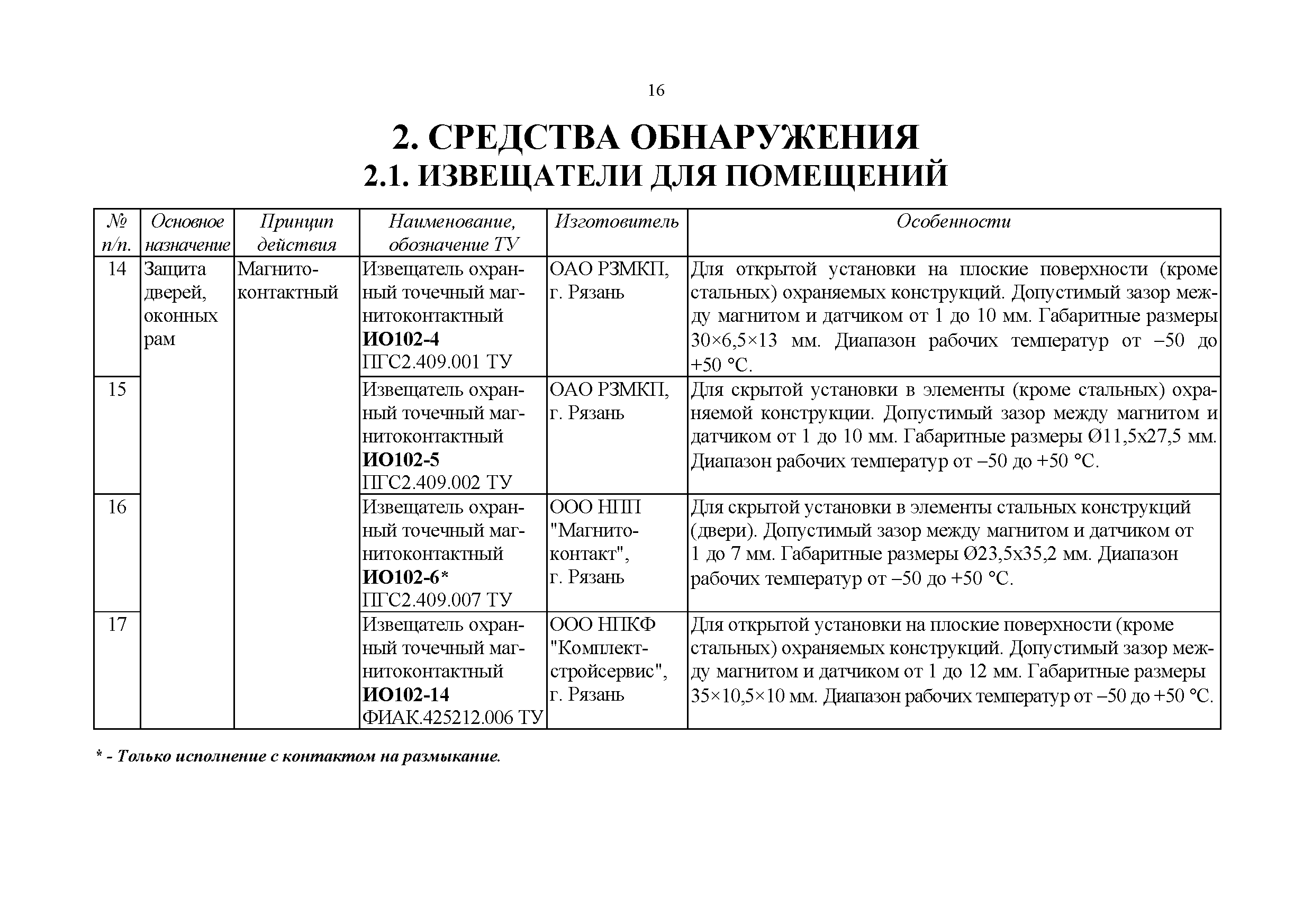 Список технических средств безопасности удовлетворяющую "Единым техническим требованиям к системам централизованного наблюдения, предназначенным для применения в подразделениях вневедомственной охраны" и "Единым техническим требованиям к объектовым подсистемам охраны, предназначенным для применения в подразделениях вневедомственной охраны"| Статус: | не действует | | Название рус.: | Список технических средств безопасности удовлетворяющую "Единым техническим требованиям к системам централизованного наблюдения, предназначенным для применения в подразделениях вневедомственной охраны" и "Единым техническим требованиям к объектовым подсистемам охраны, предназначенным для применения в подразделениях вневедомственной охраны" | | Дата добавления в базу: | 01.09.2013 | | Дата актуализации: | 01.01.2021 | | Область применения: | Список технических средств безопасности включает в себя аппаратуру удовлетворяющую "Единым техническим требованиям к системам централизованного наблюдения, предназначенным для применения в подразделениях вневедомственной охраны" и "Единым техническим требованиям к объектовым подсистемам технических средств охраны (ТСО), предназначенным для применения в подразделениях вневедомственной охраны". Список подготовлен в целях реализации единой технической политики в обеспечении надежной централизованной охраны объектов, квартир и других мест хранения личного имущества граждан. | | Оглавление: | Введение 1 Аппаратура централизованного наблюдения 2 Средства обнаружения 2.1 Извещатели для помещений 2.2 Извещатели для открытых площадок 3 Объектовые средства 3.1 Интегрированные системы безопасности 3.2 Домофоны с функцией охраны 3.3 Источники электропитания 3.4 Средства тревожной сигнализации 3.5 Средства беспроводной охранной сигнализации | | Разработан: | ФКУ НИЦ Охрана МВД России