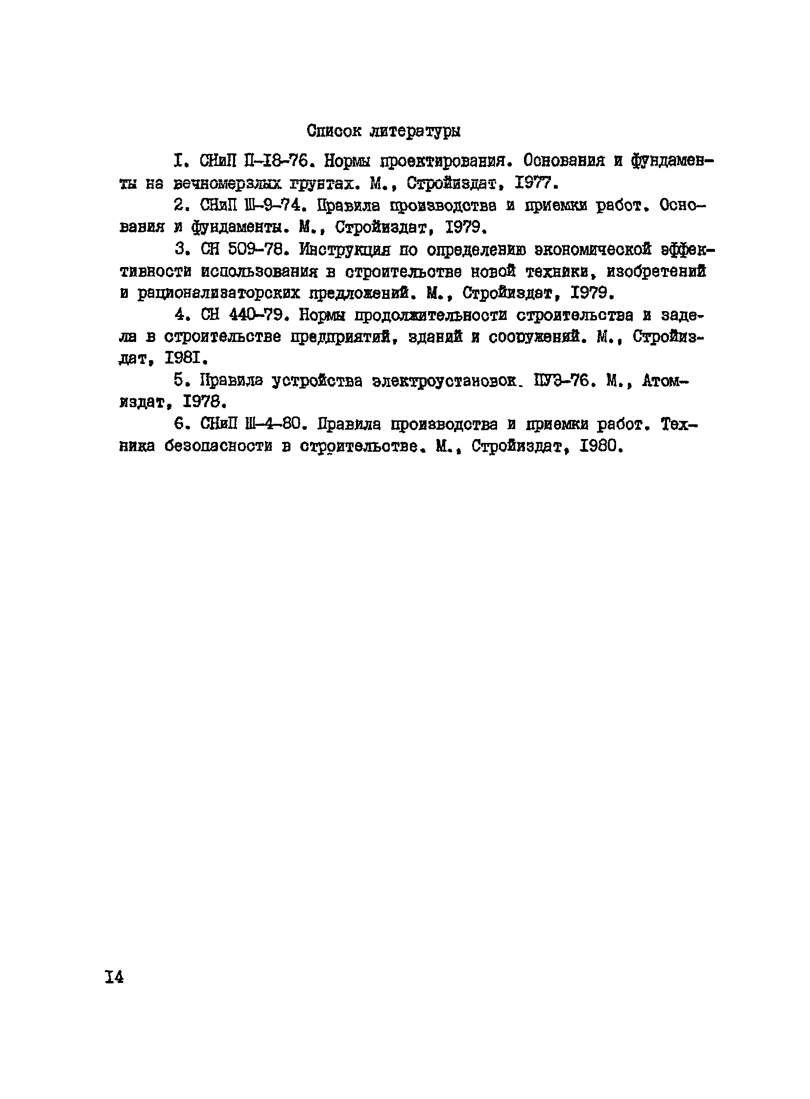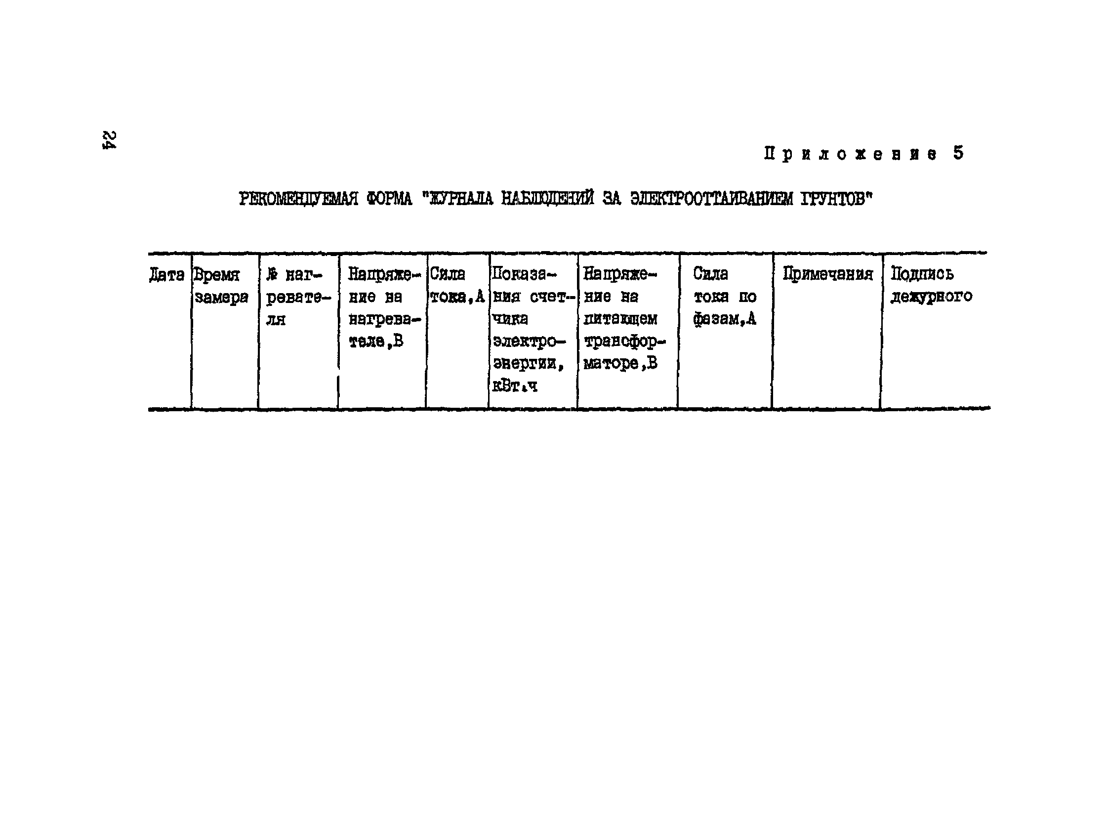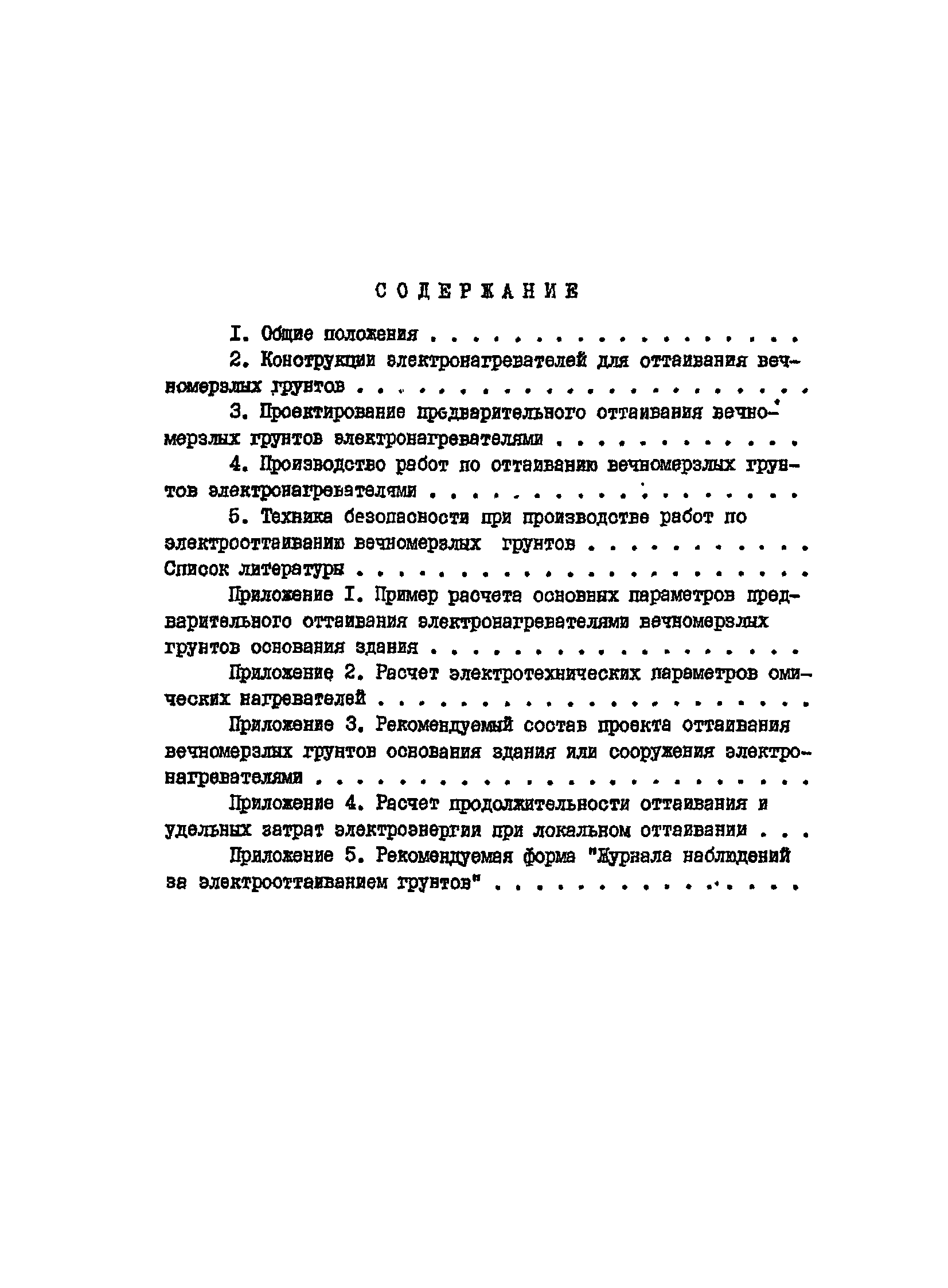 | Оглавление: | 1.Общие положения 2. Конструкция электронагревателей для оттаивания вечномерзлых грунтов 3. Проектирование предварительного оттаивания вечномерзлых грунтов электронагревателями 4. Производство работ по оттаиванию вечномерзлых грунтов электронагревателями 5. Техника безопасности при производстве работ по электрооттаиванию вечномерзлых грунтов Список литературы Приложение 1. Пример расчета основных параметров предварительного оттаивания электронагревателями вечномерзлых грунтов основания здания Приложение 2. Расчет электротехнических параметров омических нагревателей Приложение 3. Рекомендуемый состав проекта оттаивания вечномерзлых грунтов основания здания или сооружения электронагревателями Приложение 4. Расчет продолжительности оттаивания и удельных затрат электроэнергии при локальном оттаивании Приложение 5. Рекомендуемая форма "Журнала наблюдений за электрооттаиванием грунтов" |
