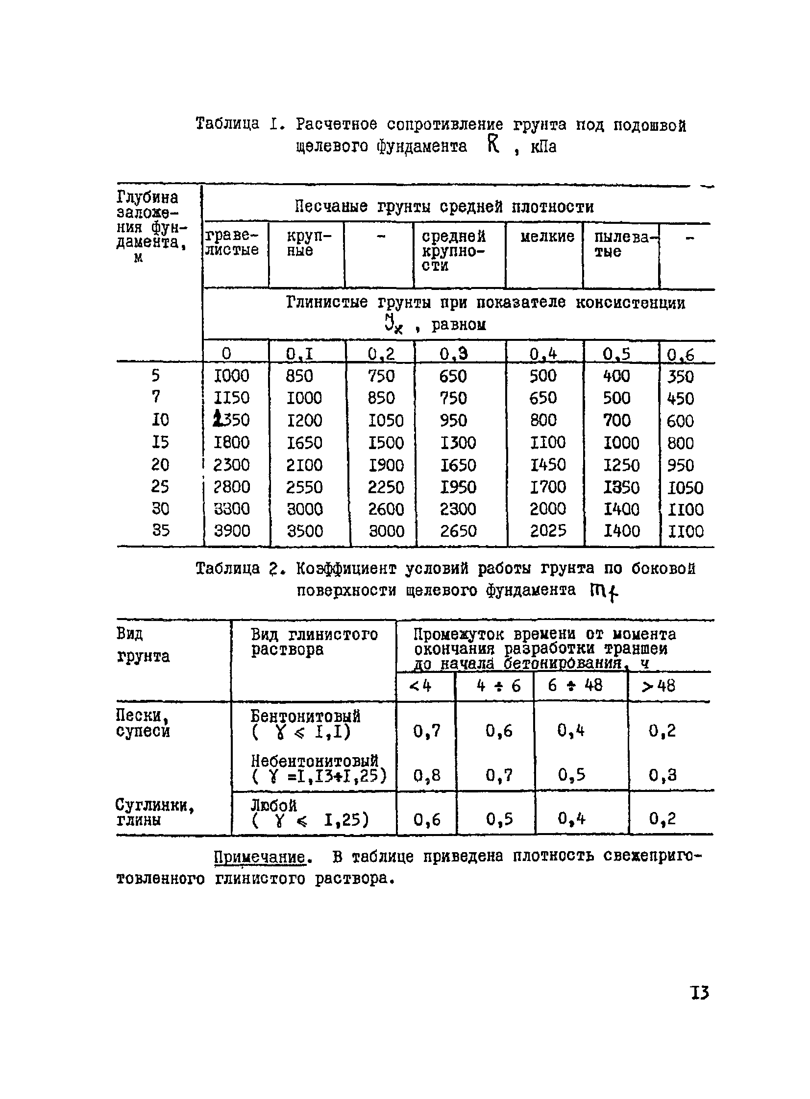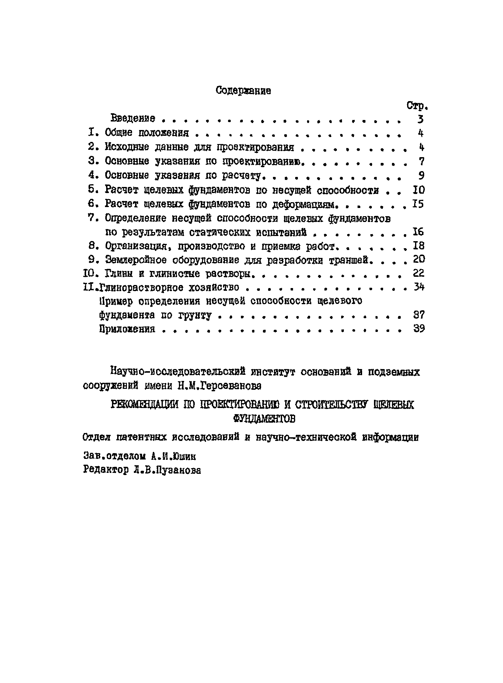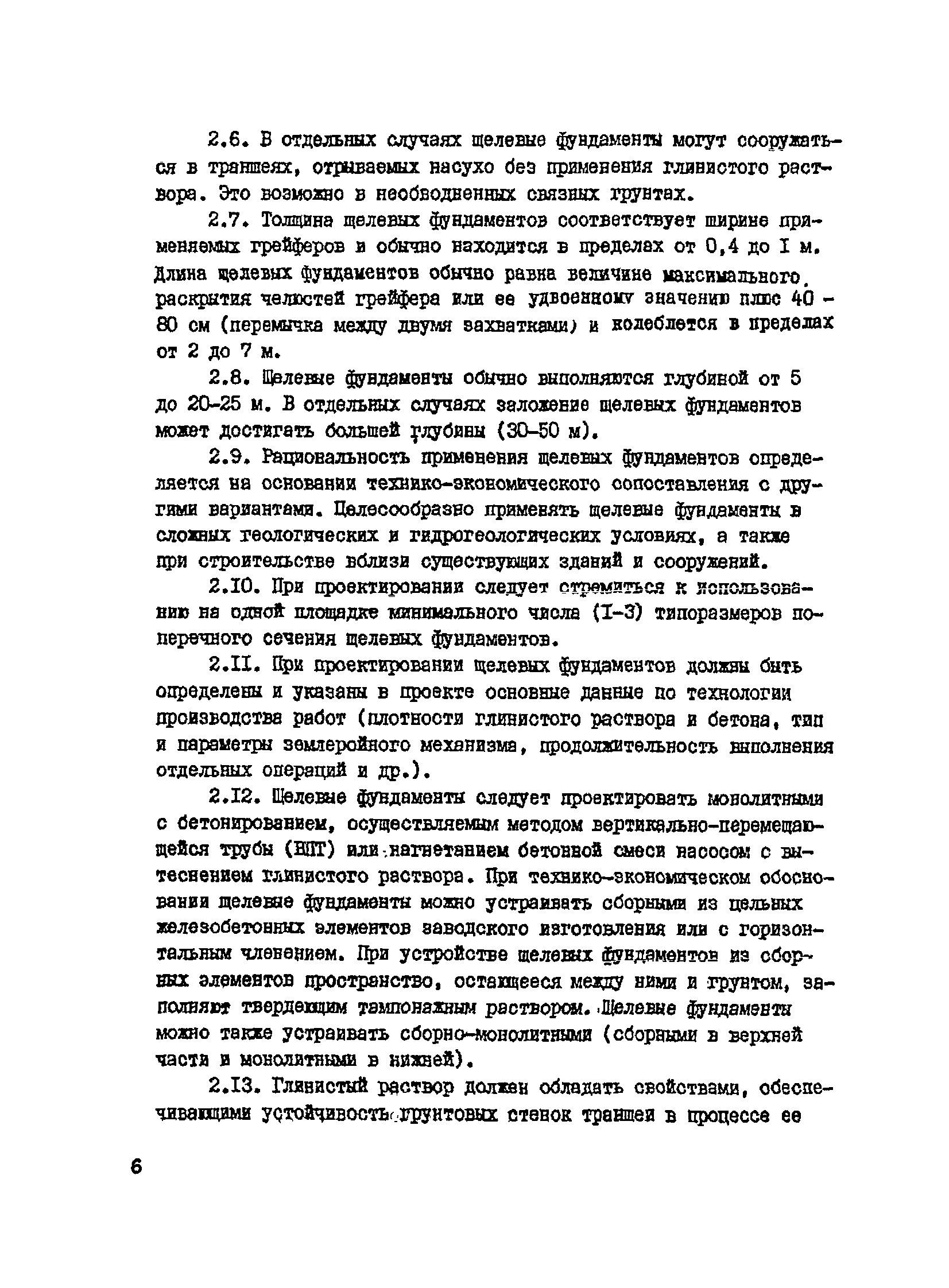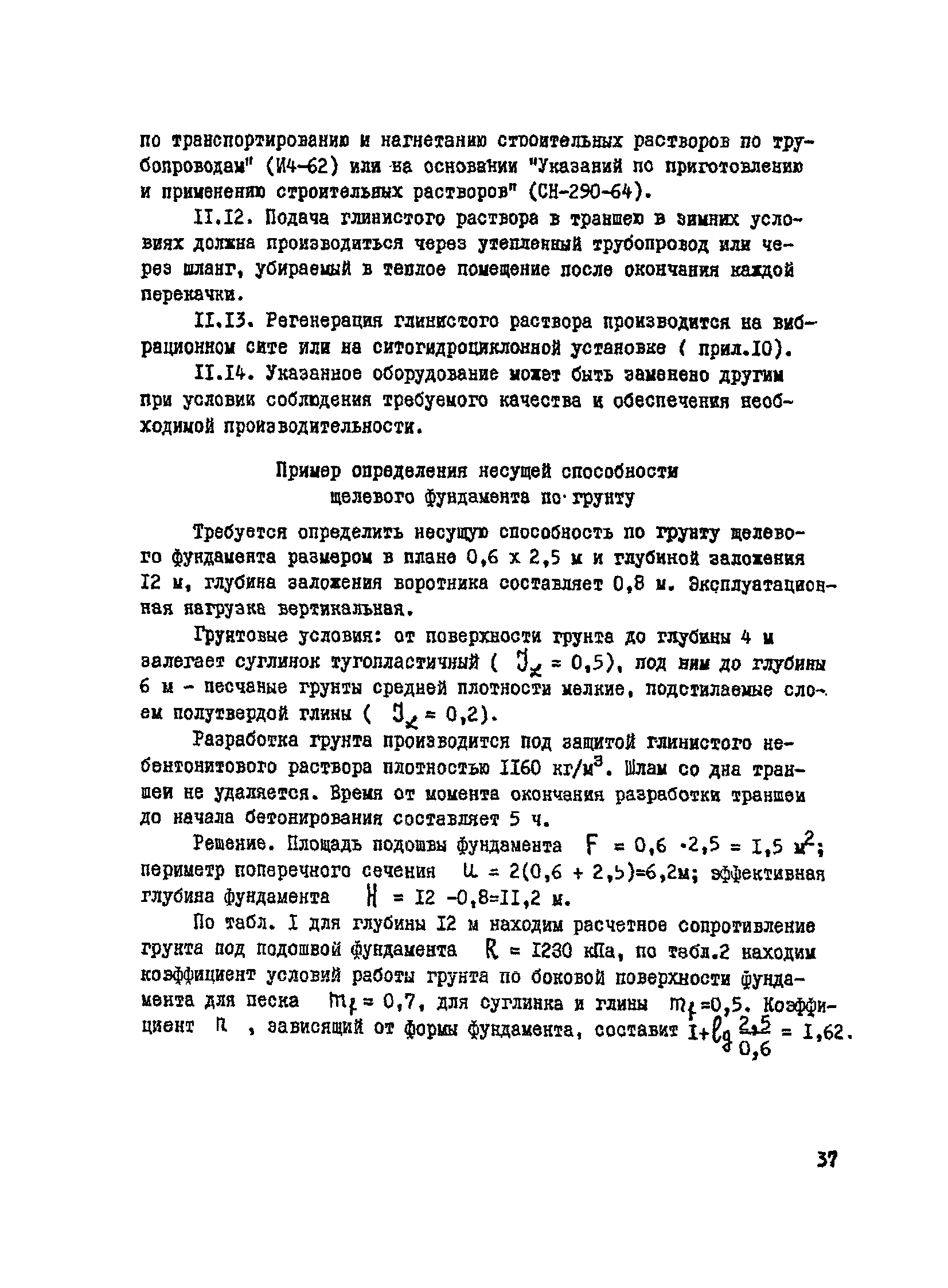 | Оглавление: | Введение 1. Общие положения 2. Исходные данные для проектирования 3. Основные указания по проектированию 4. Основные указания по расчету . 5. Расчет щелевых фундаментов по несущей способности 6. Расчет щелевых моментов по деформациям 7. Определение несущей способности щелевых фундаментов по результатам статических испытаний 8. Организация. производство и приемка работ 9. Землеройное оборудование для разработка траншей 10. Глины и глинистые растворы 1I. Глинорастворное хозяйство Пример определения несущей способности щелевого фундамента по грунту Приложения. |