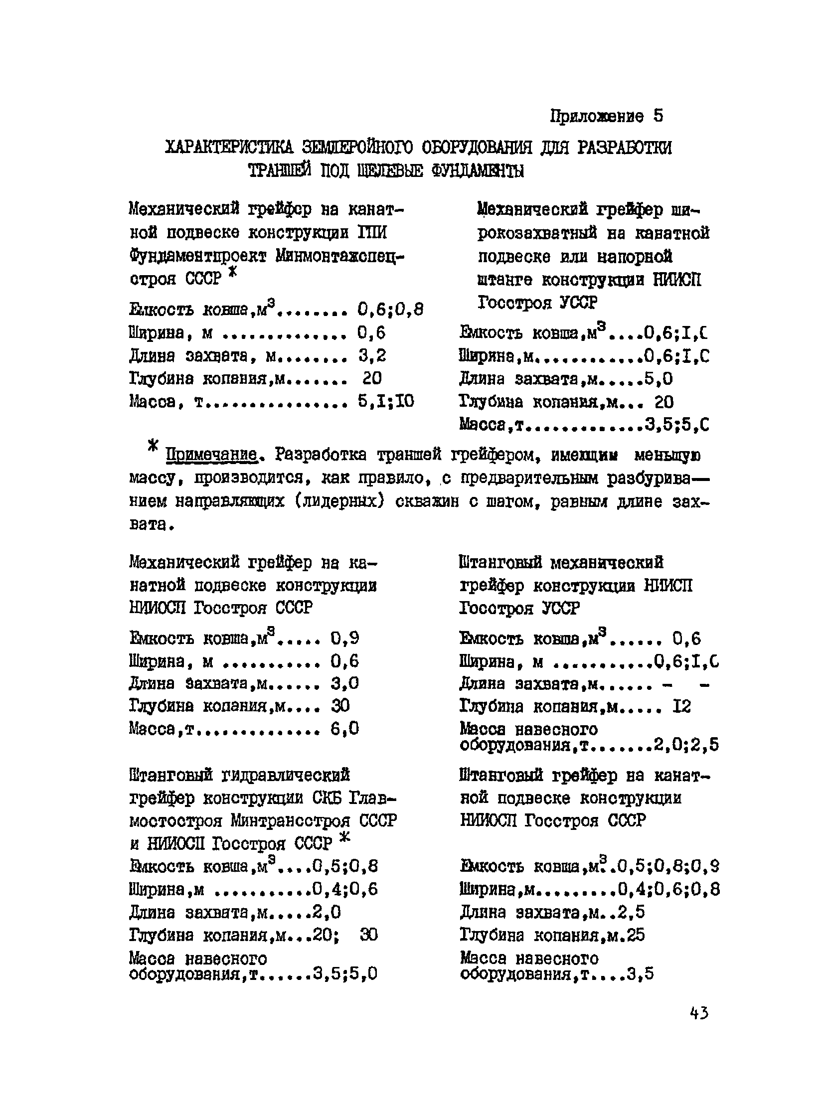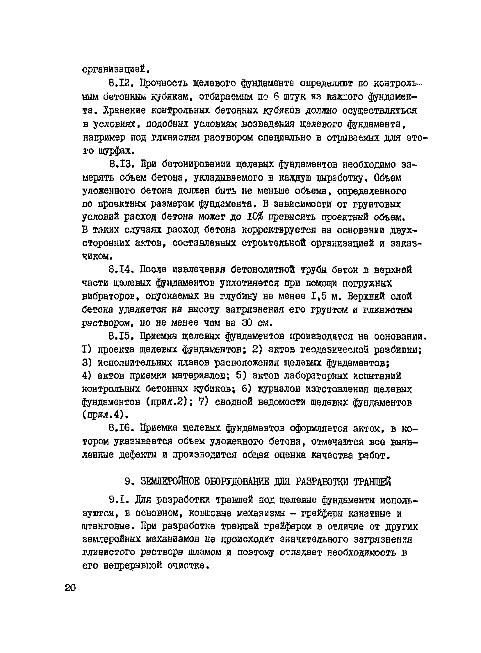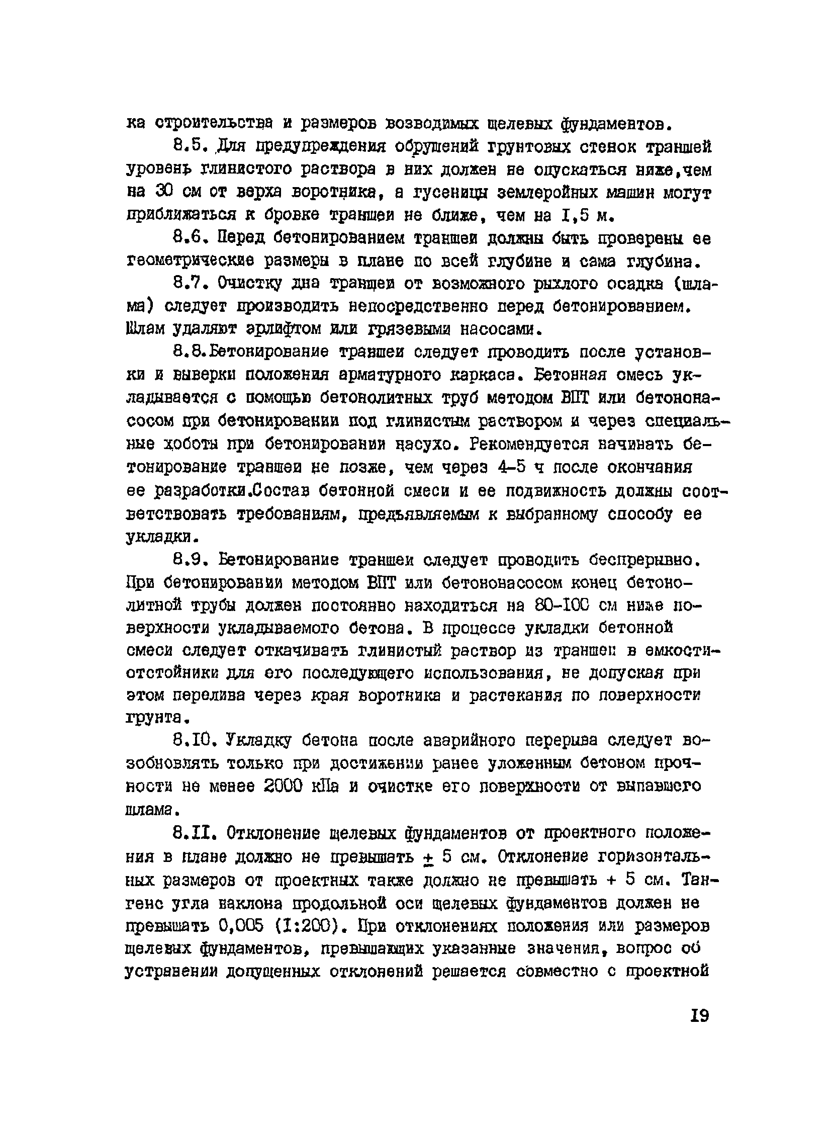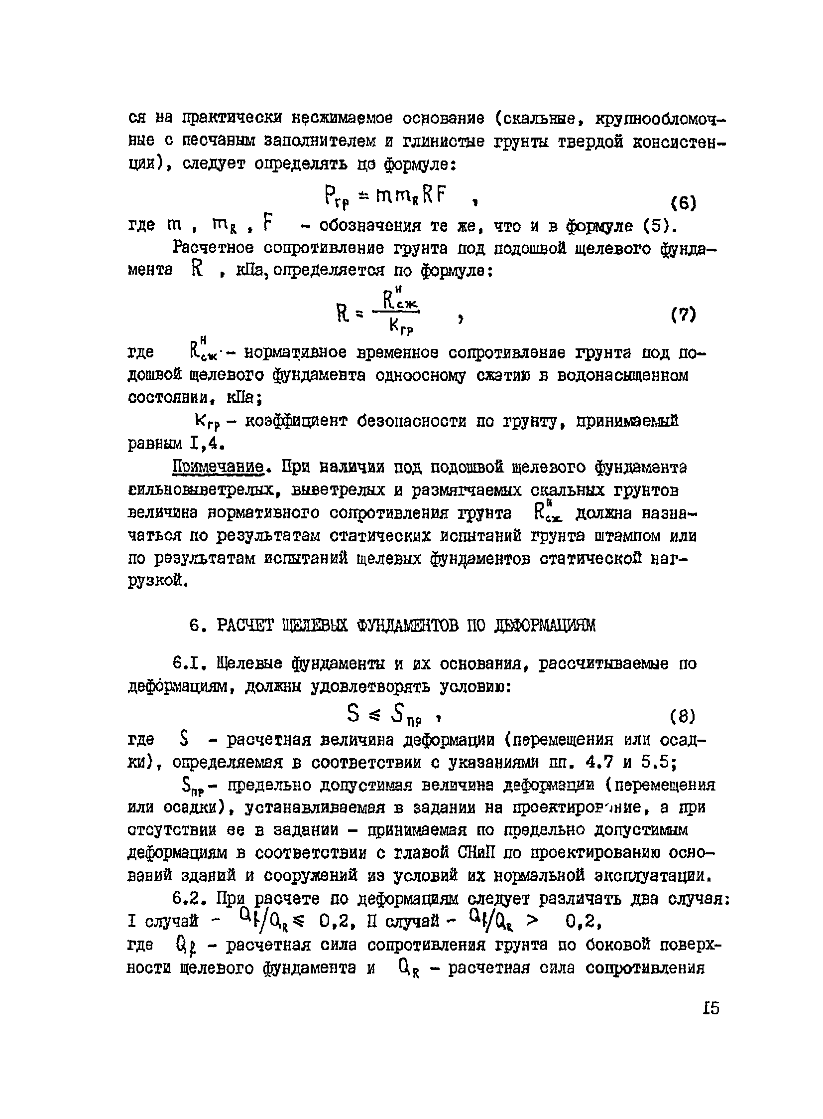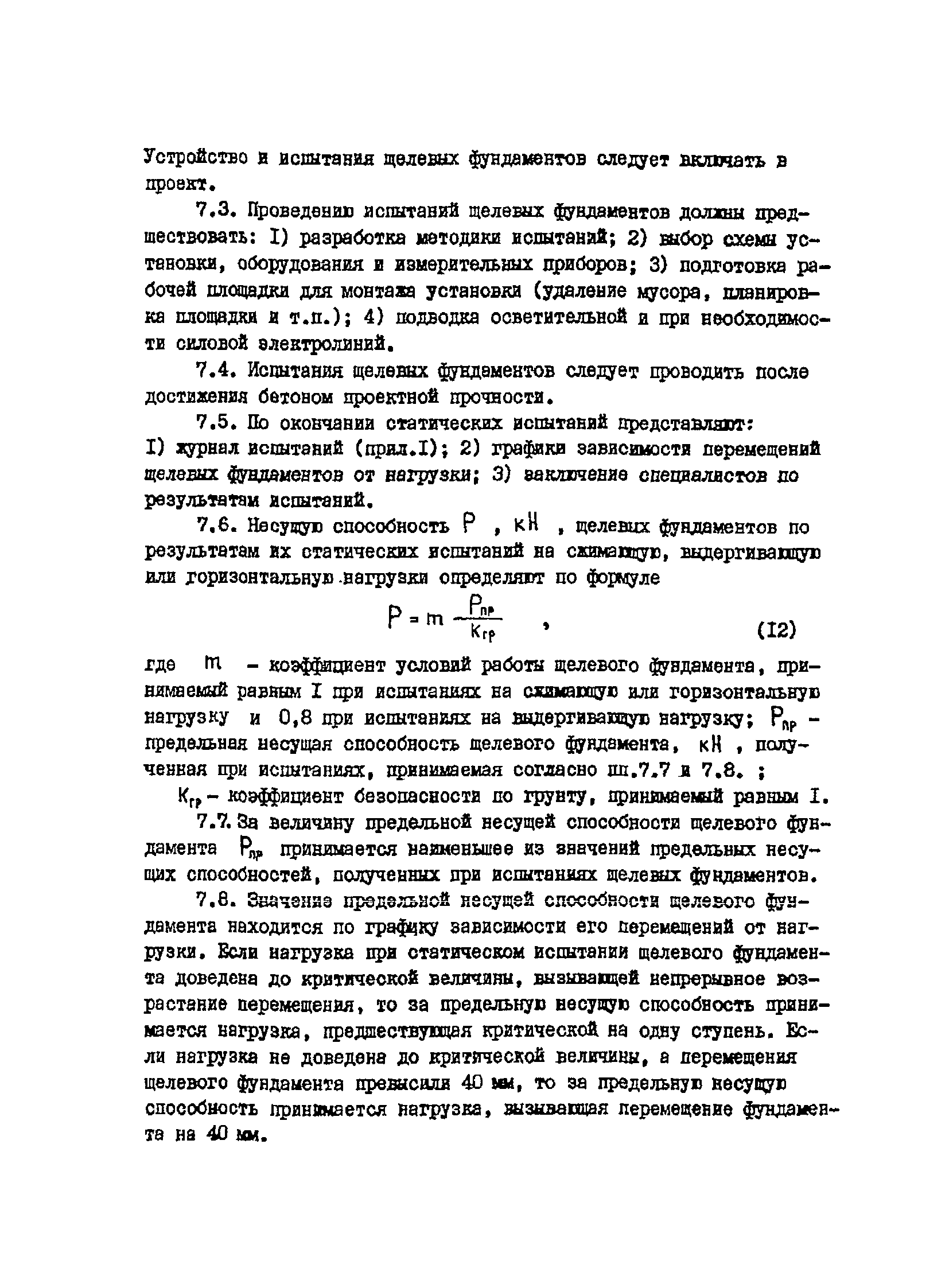 | Оглавление: | Введение 1. Общие положения 2. Исходные данные для проектирования 3. Основные указания по проектированию 4. Основные указания по расчету . 5. Расчет щелевых фундаментов по несущей способности 6. Расчет щелевых моментов по деформациям 7. Определение несущей способности щелевых фундаментов по результатам статических испытаний 8. Организация. производство и приемка работ 9. Землеройное оборудование для разработка траншей 10. Глины и глинистые растворы 1I. Глинорастворное хозяйство Пример определения несущей способности щелевого фундамента по грунту Приложения. |