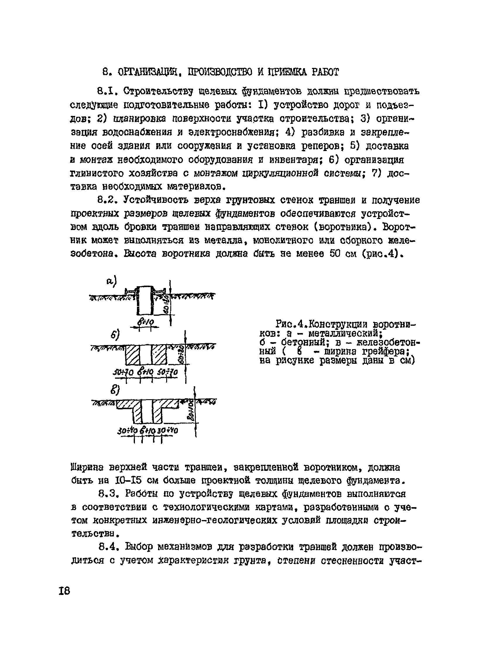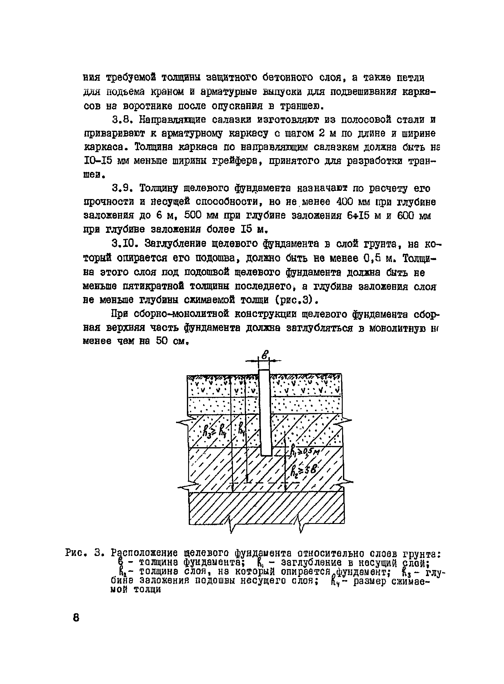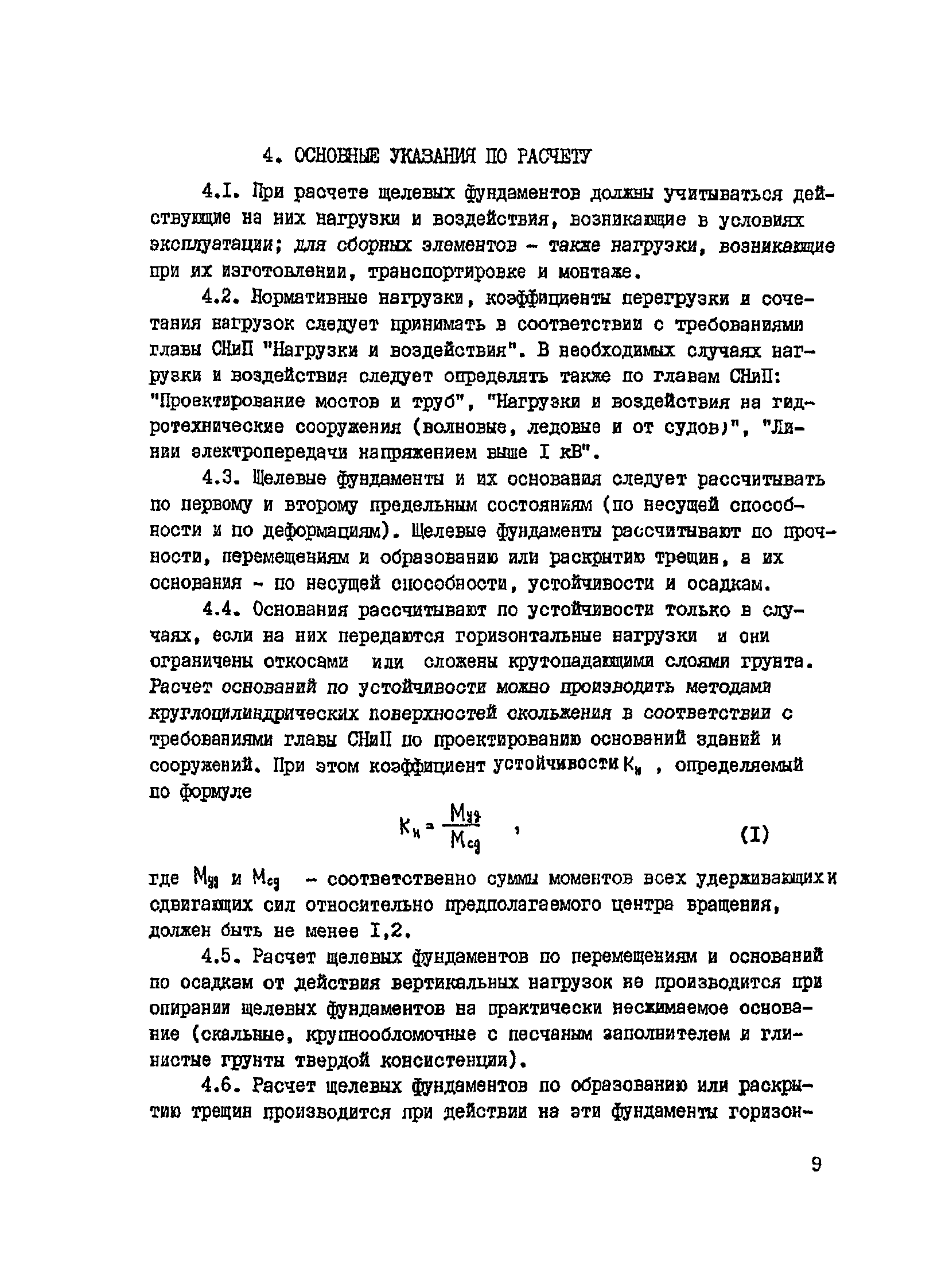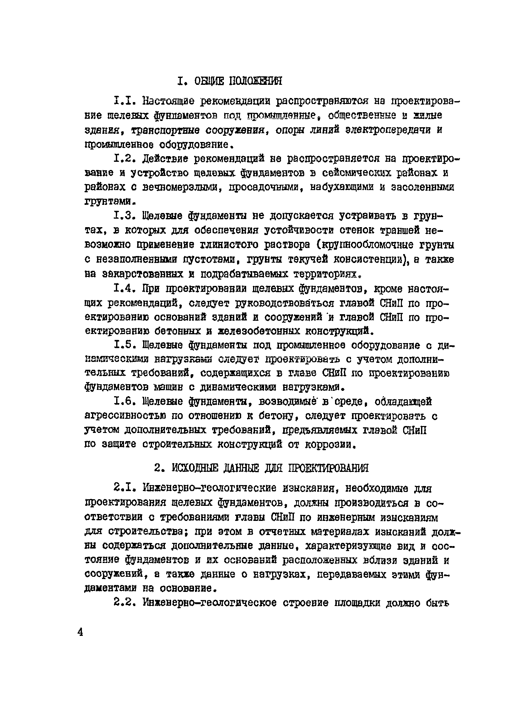 | Оглавление: | Введение 1. Общие положения 2. Исходные данные для проектирования 3. Основные указания по проектированию 4. Основные указания по расчету . 5. Расчет щелевых фундаментов по несущей способности 6. Расчет щелевых моментов по деформациям 7. Определение несущей способности щелевых фундаментов по результатам статических испытаний 8. Организация. производство и приемка работ 9. Землеройное оборудование для разработка траншей 10. Глины и глинистые растворы 1I. Глинорастворное хозяйство Пример определения несущей способности щелевого фундамента по грунту Приложения. |