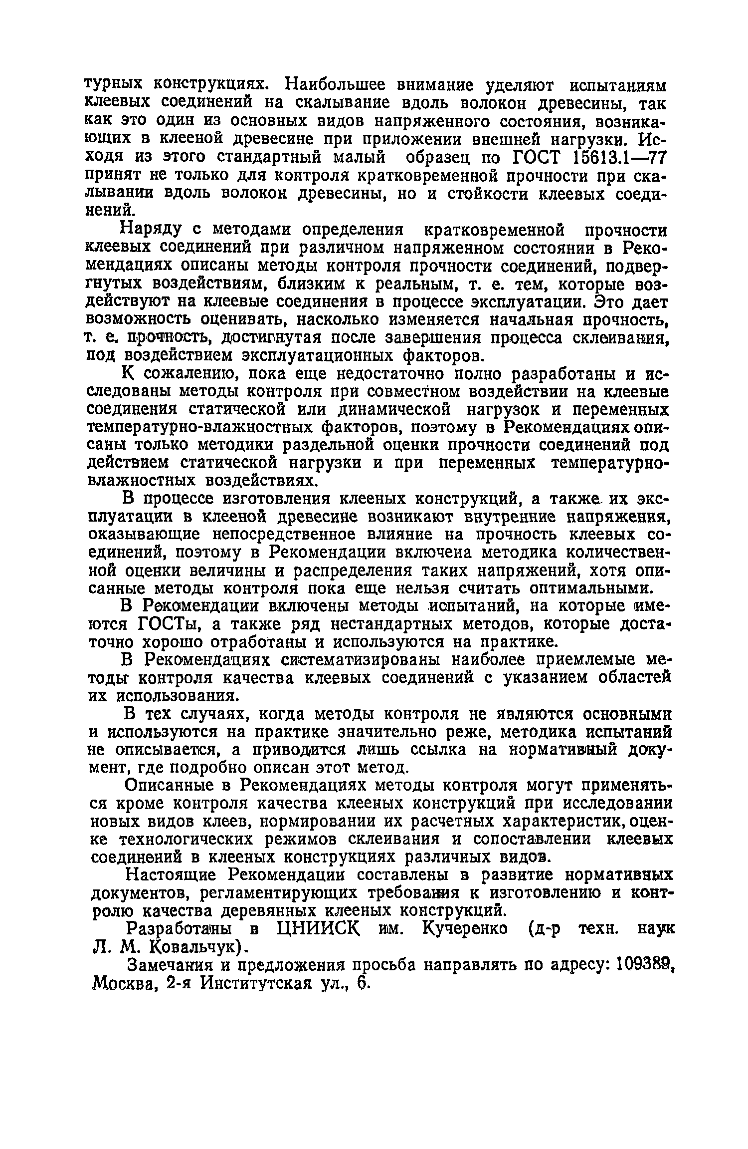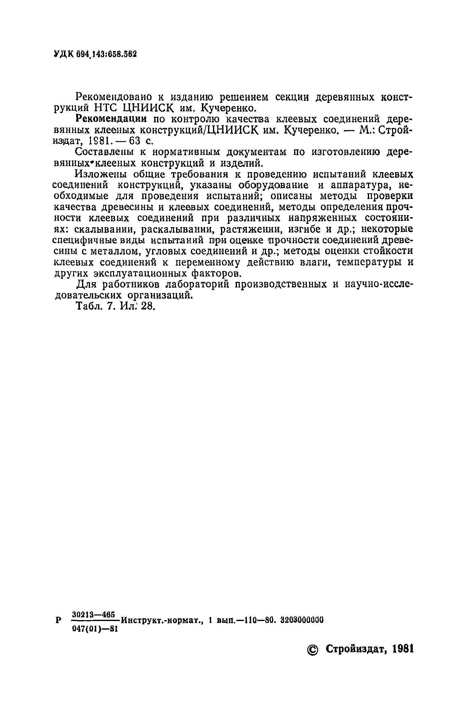 | Область применения: | В документе изложены общие требования к проведению испытаний клеевых соединений конструкций, указаны оборудование и аппаратура, необходимые для проведения испытаний; описаны методы проверки качества древесины и клеевых соединений, методы определения прочности клеевых соединений при различных напряженных состояниях: скалывании, раскалывании, растяжении, изгибе и другие; некоторые специфичные виды испытаний при оценке прочности соединений древесины с металлом, угловых соединений и другие; методы оценки стойкости клееных соединений к переменному действию влаги, температуры и других эксплуатационных факторов. Для работников лабораторий производственных и научно-исследовательских организаций. |