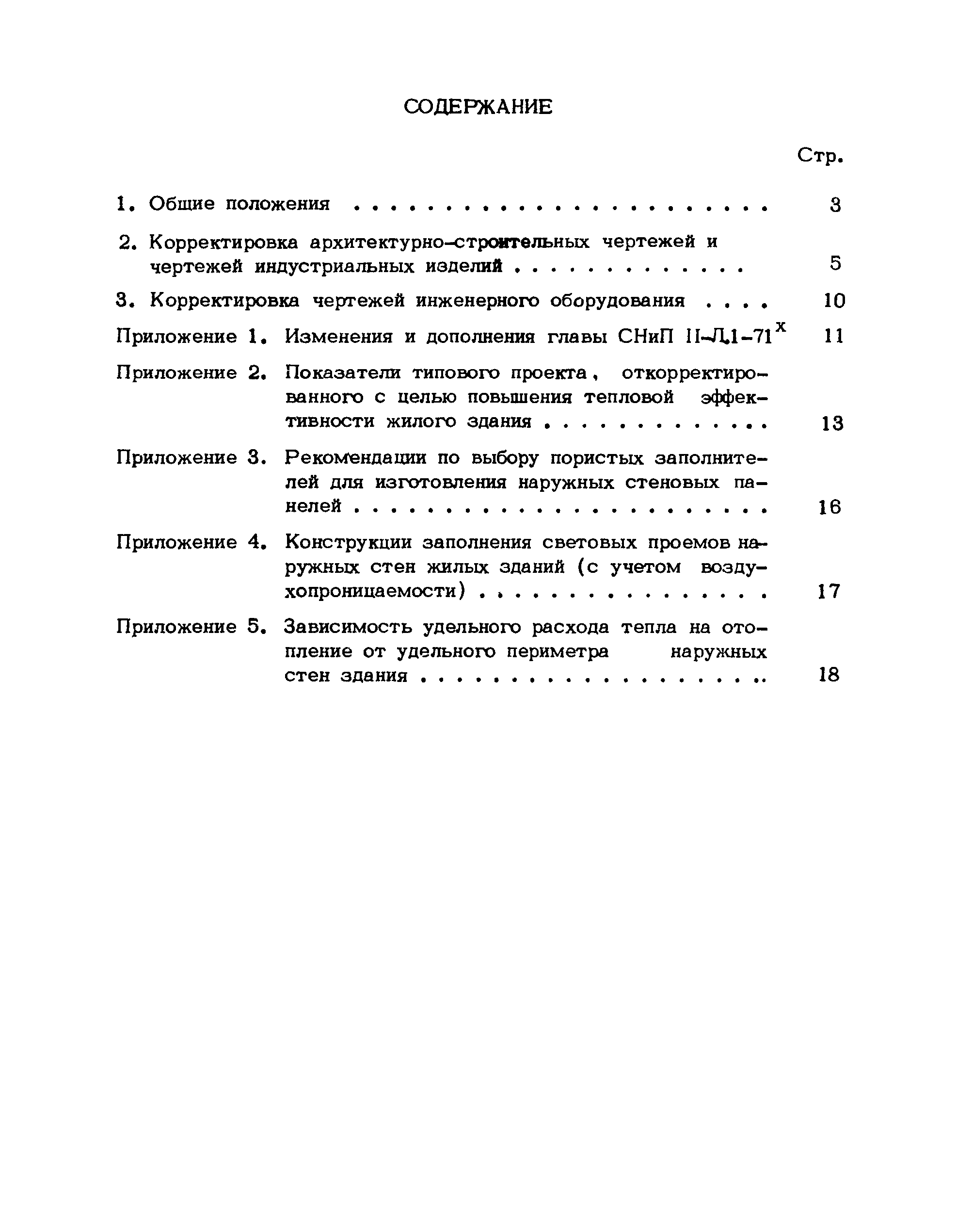 | Оглавление: | 1 Общие положения 2. Корректировка архитектурно-строительных чертежей и чертежей индустриальных изделий 3. Корректировка чертежей инженерного оборудования Приложение 1. Изменения и дополнения главы СНиП II-Л.1-71 Приложение 2. Показатели типового проекта, откорректированного с целью повышения тепловой эффективности жилого здания Приложение 3. Рекомендации по выбору пористых заполнителей для изготовления наружных стеновых панелей Приложение 4. Конструкции заполнения световых проемов наружных стен жилых зданий (с учетом воздухопроницаемости) Приложение 5. Зависимость удельного расхода тепла на отопление от удельного периметра наружных стен здания |