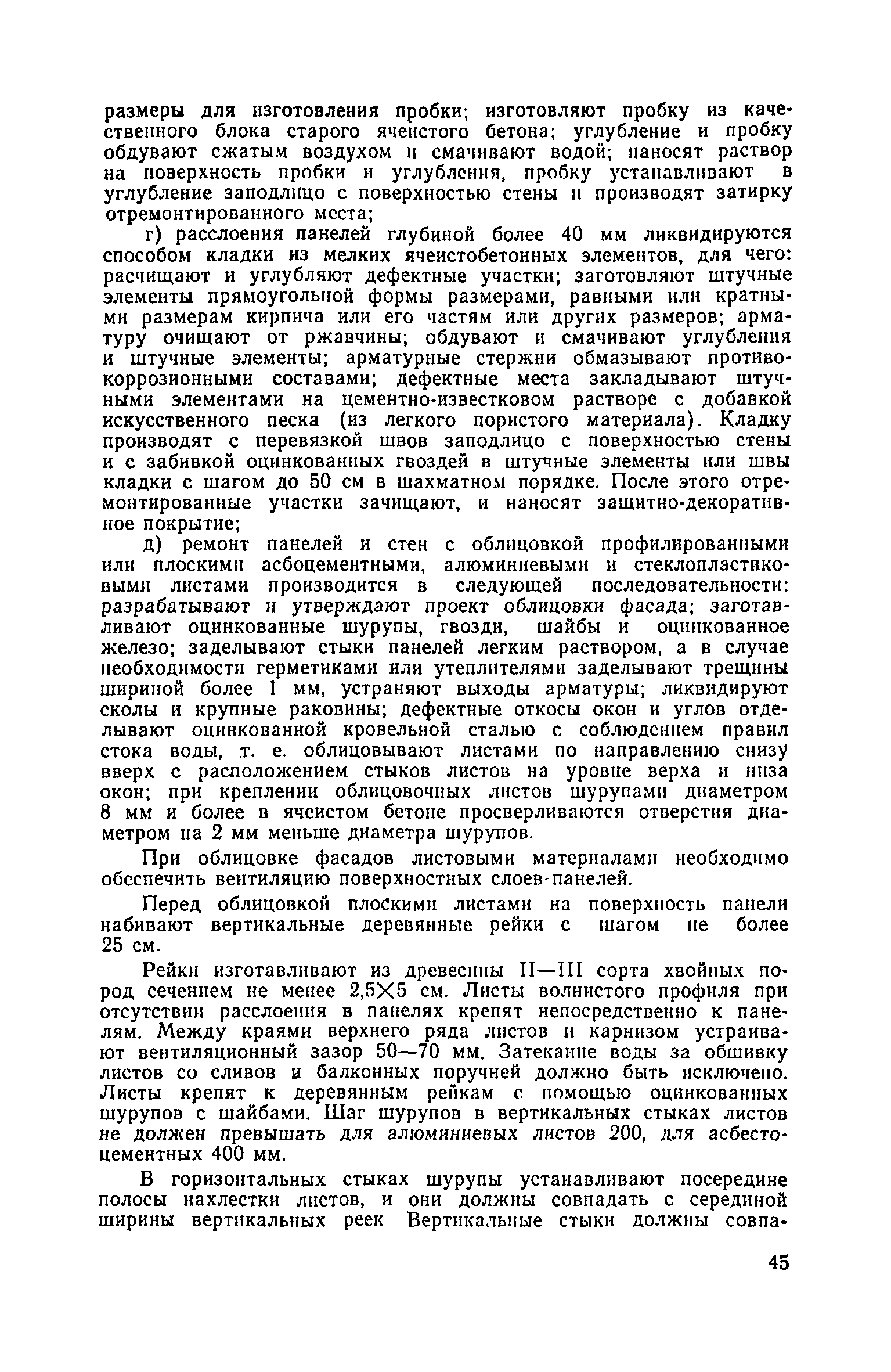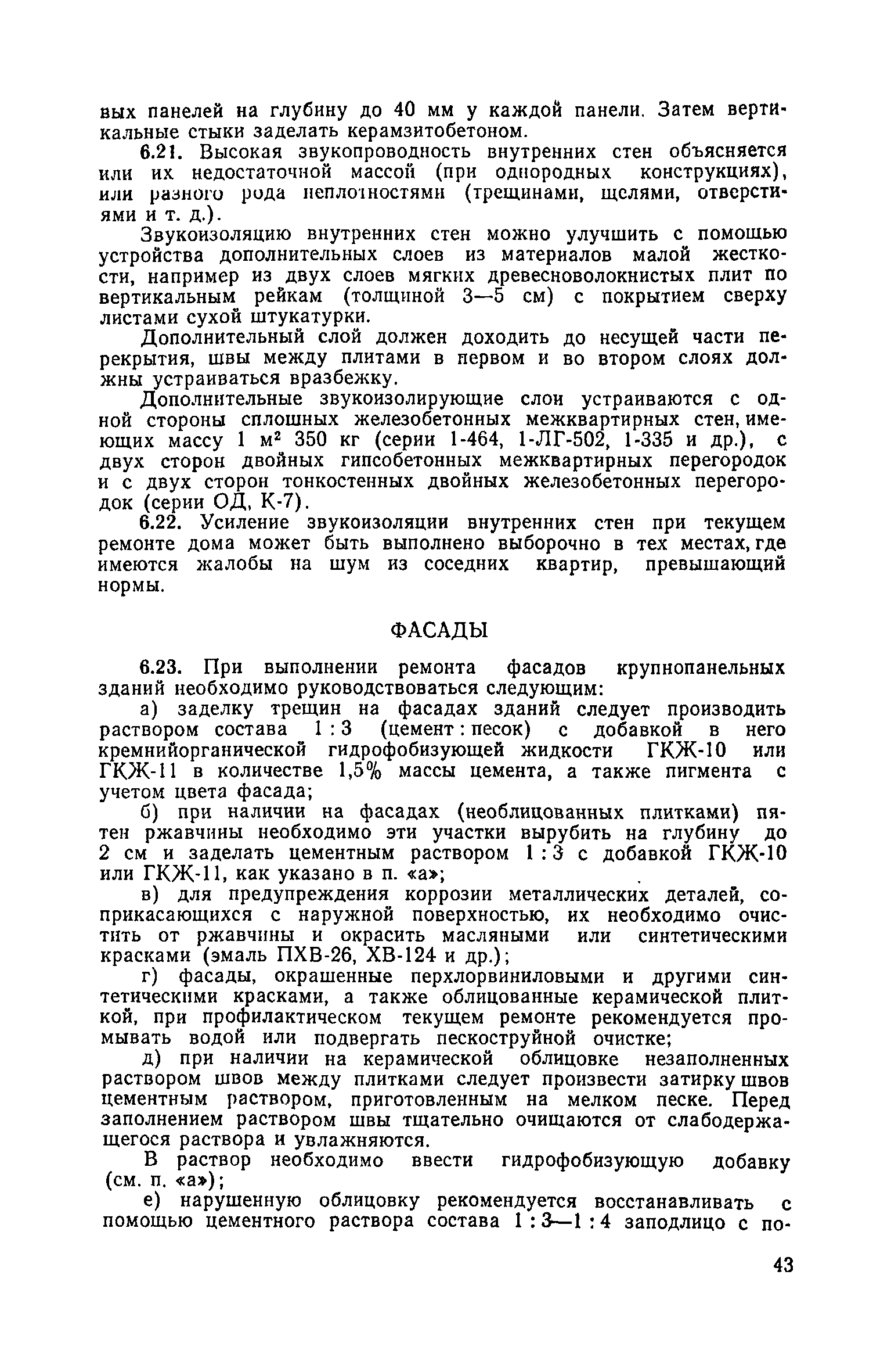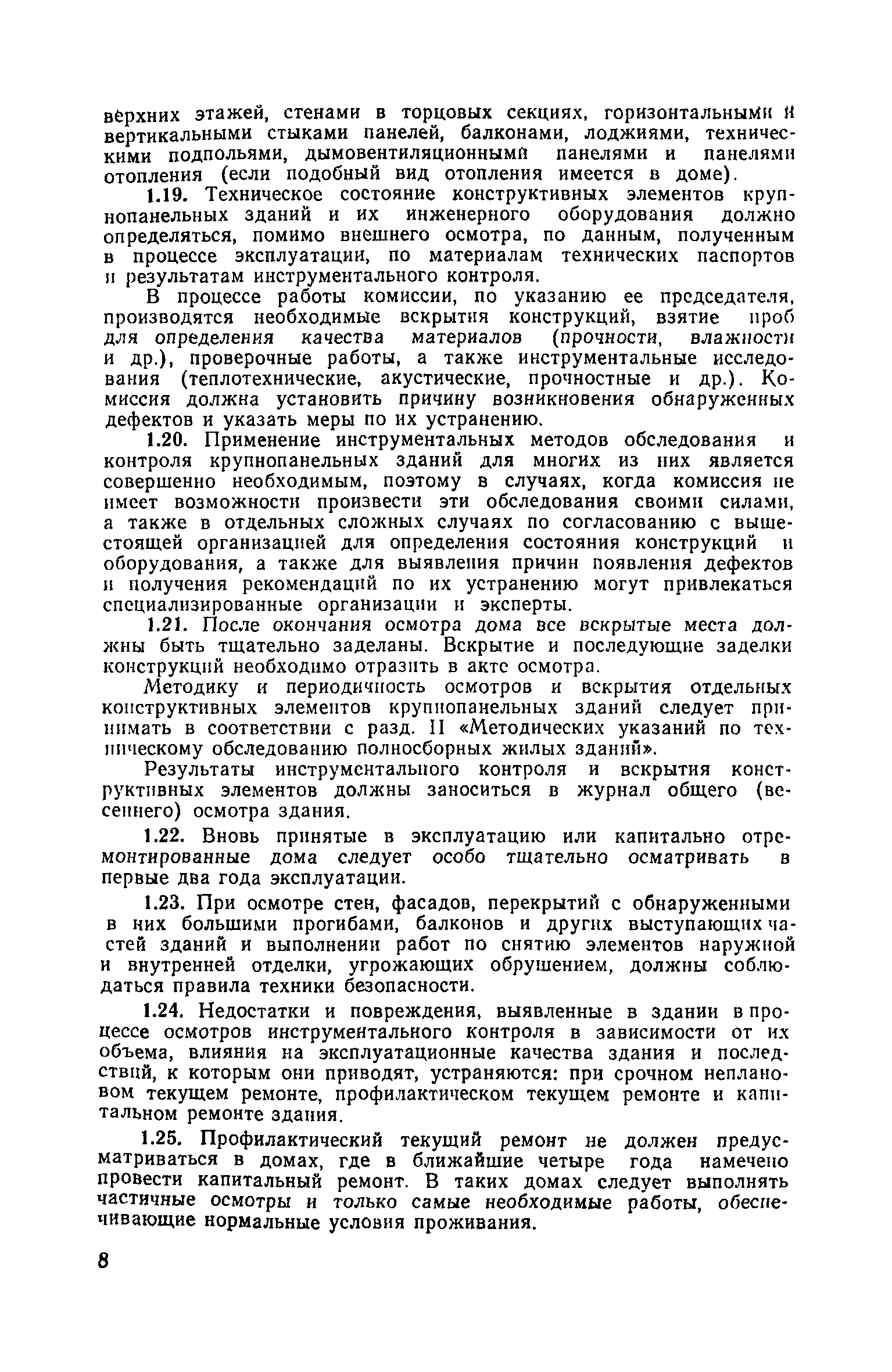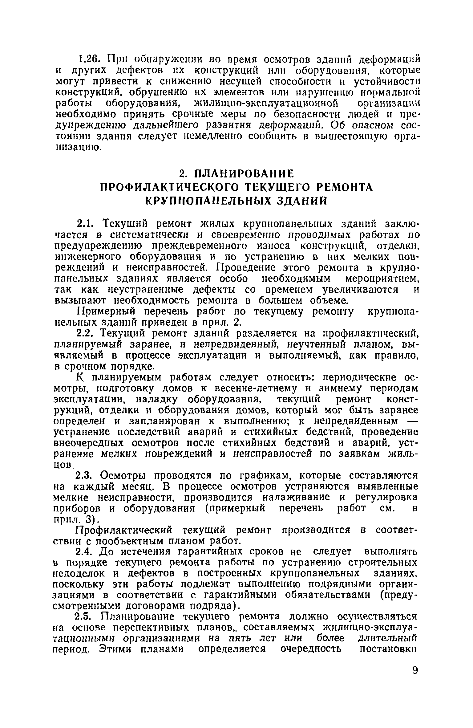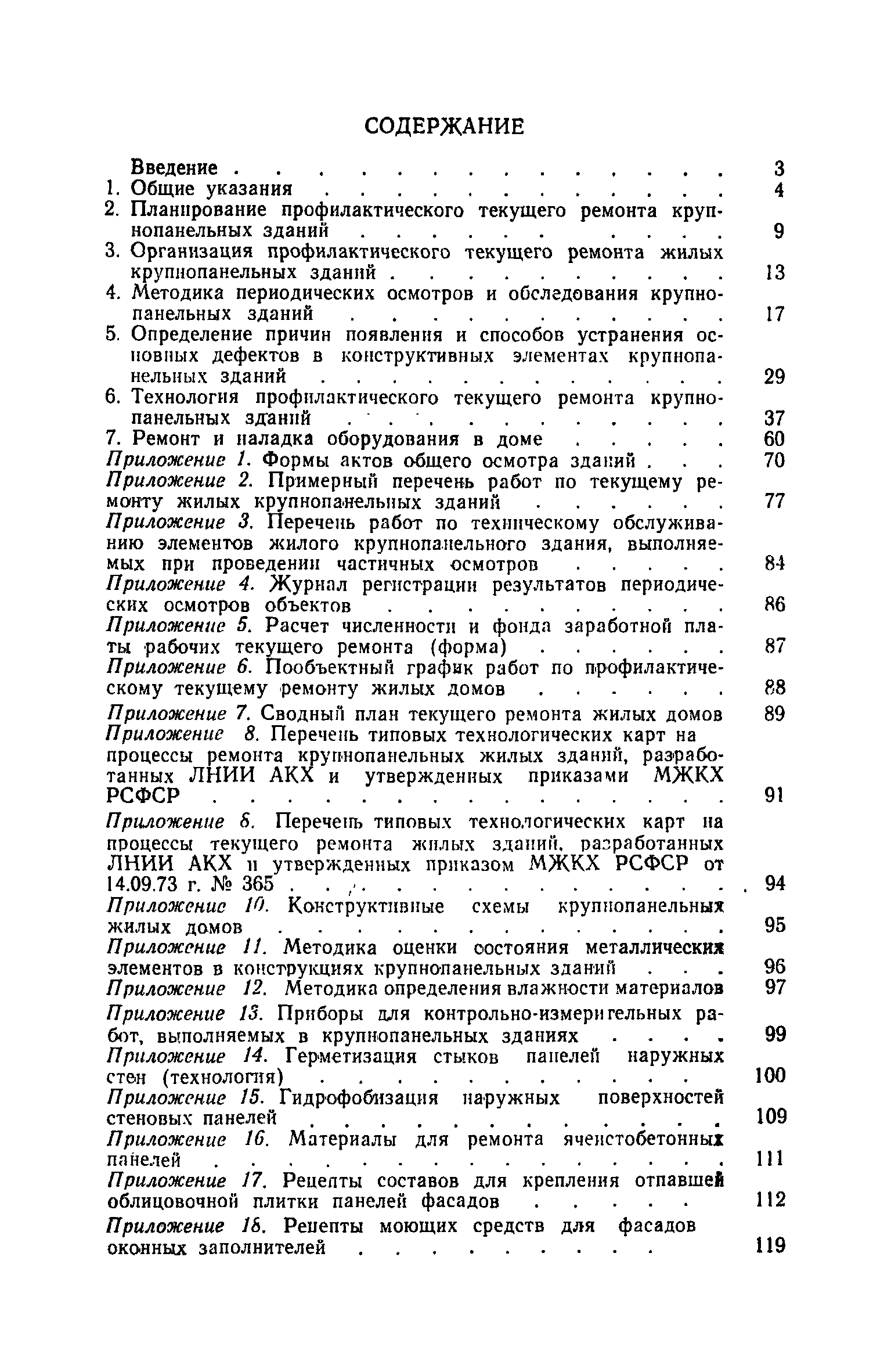 | Оглавление: | Введение 1. Общие указания 2. Планирование профилактического текущего ремонта крупнопанельных зданий 3. Организация профилактического текущего ремонта жилых крупнопанельных зданий 4. Методика периодических осмотров и обследования крупнопанельных зданий 5. Определение причин появления и способов устранения основных дефектов в конструктивных элементах крупнопанельных зданий 6. Технология профилактического текущего ремонта крупнопанельных зданий 7. Ремонт и наладка оборудования в доме Приложение 1. Формы актов общего осмотра зданий Приложение 2. Примерный перечень работ по текущему ремонту жилых крупнопанельных зданий Приложение 3. Перечень работ по техническому обслуживанию элементов жилого крупнопанельного здания, выполняемых при проведении частичных осмотров Приложение 4. Журнал регистрации результатов периодических осмотров объектов Приложение 5. Расчет численности и фонда заработной платы рабочих текущего ремонта (форма) Приложение 6. Пообьектный график работ по профилактическому текущему ремонту жилых домов Приложение 7. Сводный план текущего ремонта жилых домов Приложение 8. Перечень типовых технологических карт на процессы ремонта крупнопанельных жилых зданий, разработанных ЛНИИ АКХ и утвержденных приказами МЖКХ РСФСР Приложение 9. Перечень типовых технологических карт на процессы текущего ремонта жилых зданий. Разработанных ЛНИИ АКХ и утвержденных приказом МЖКХ РСФСР от 14.09.73 г. № 365 Приложение 10. Конструктивные схемы крупнопанельных жилых домов Приложение 11. Методика оценки состояния металлических элементов в конструкциях крупнопанельных зданий . . . Приложение 12. Методика определения влажности материалов Приложение 13. Приборы для контрольно-измерительных работ, выполняемых в крупнопанельных зданиях Приложение 14. Герметизация стыков панелей наружных стен (технология) Приложение 15. Гидрофобизация наружных поверхностей стеновых панелей Приложение 16. Материалы для ремонта ячеистобетонных панелей Приложение 17. Рецепты составов для крепления отпавшей облицовочной плитки панелей фасадов Приложение 18. Рецепты моющих средств для фасадов оконных заполнителей |