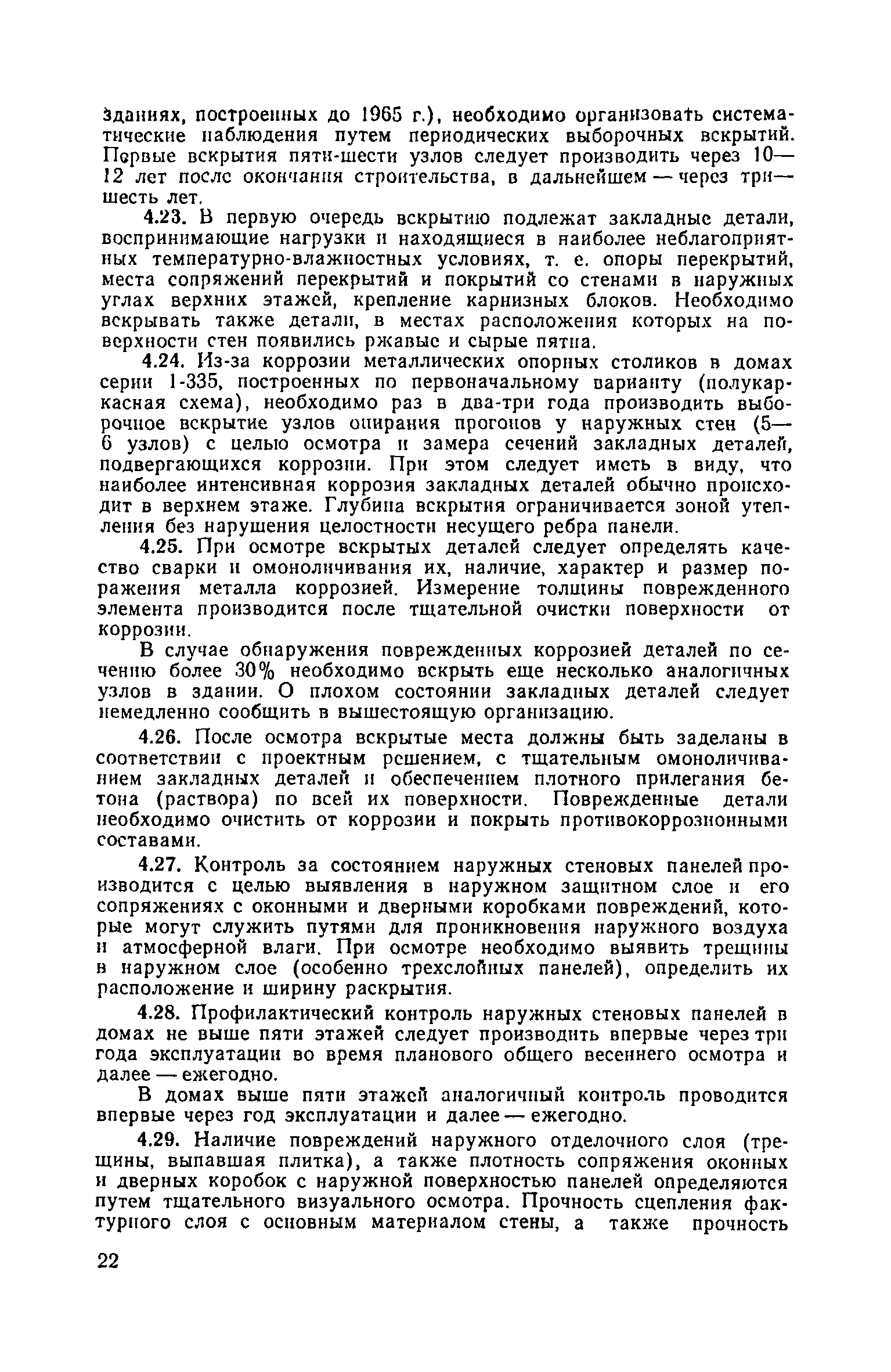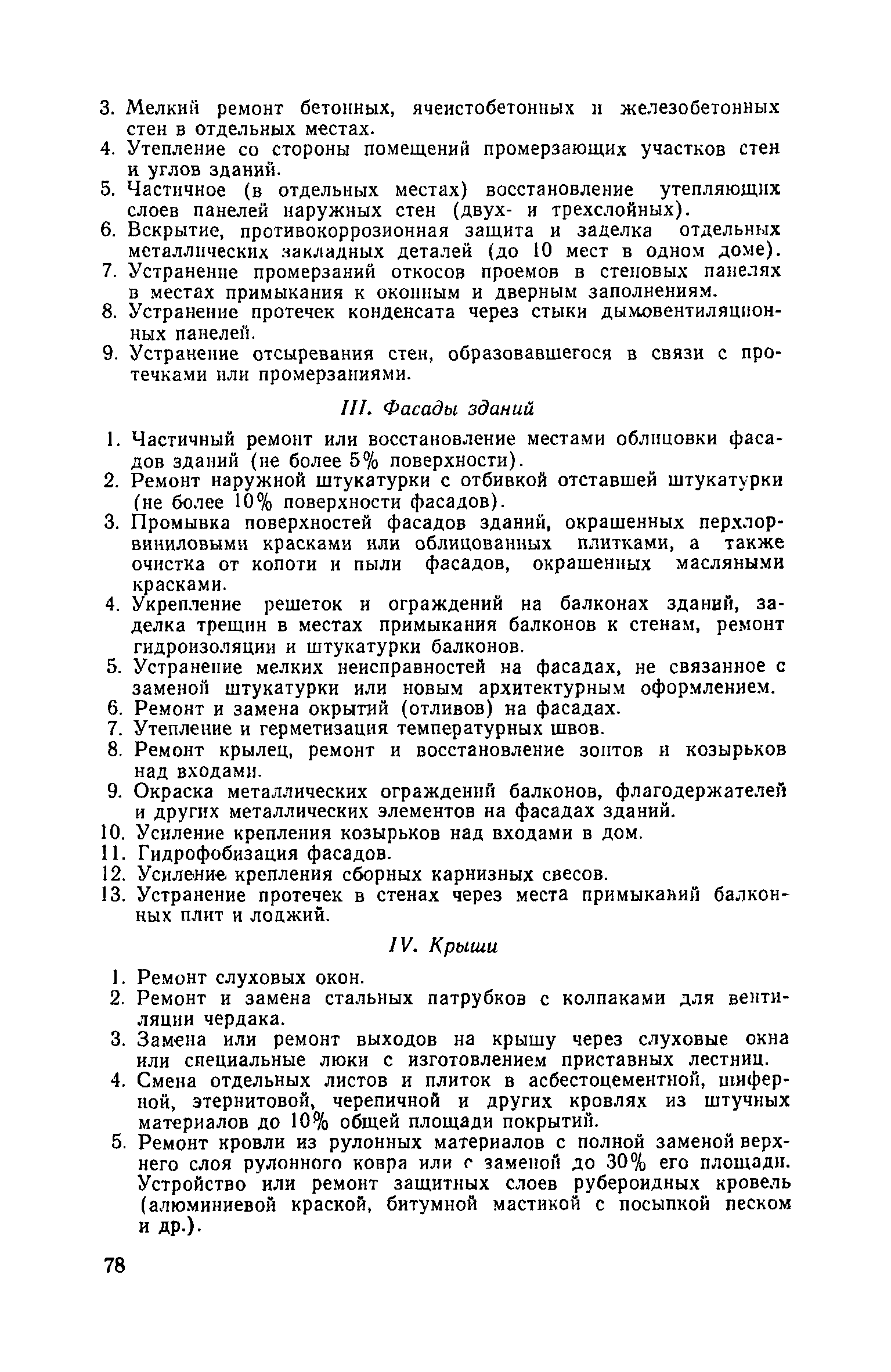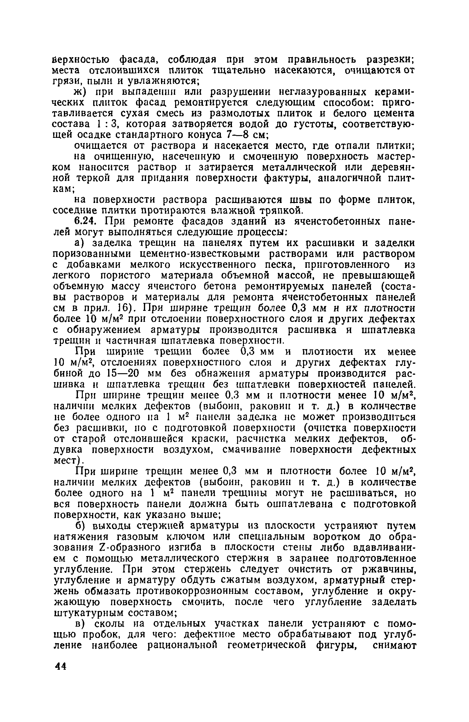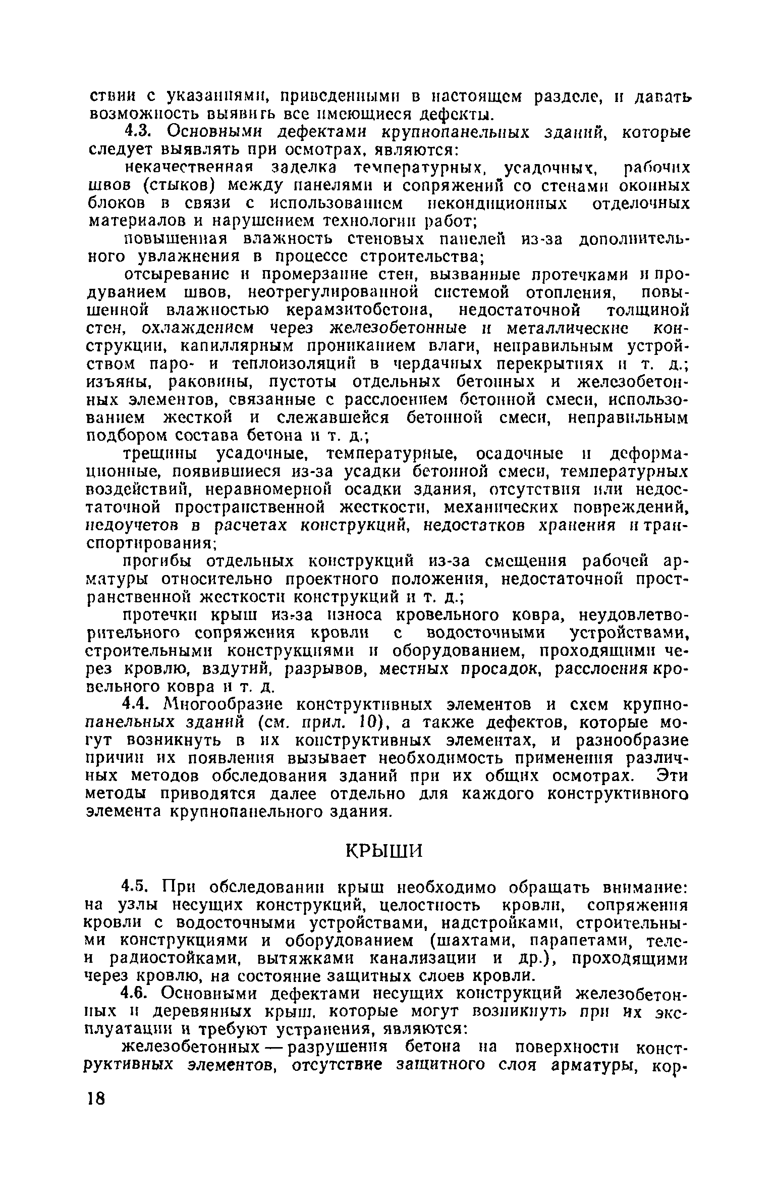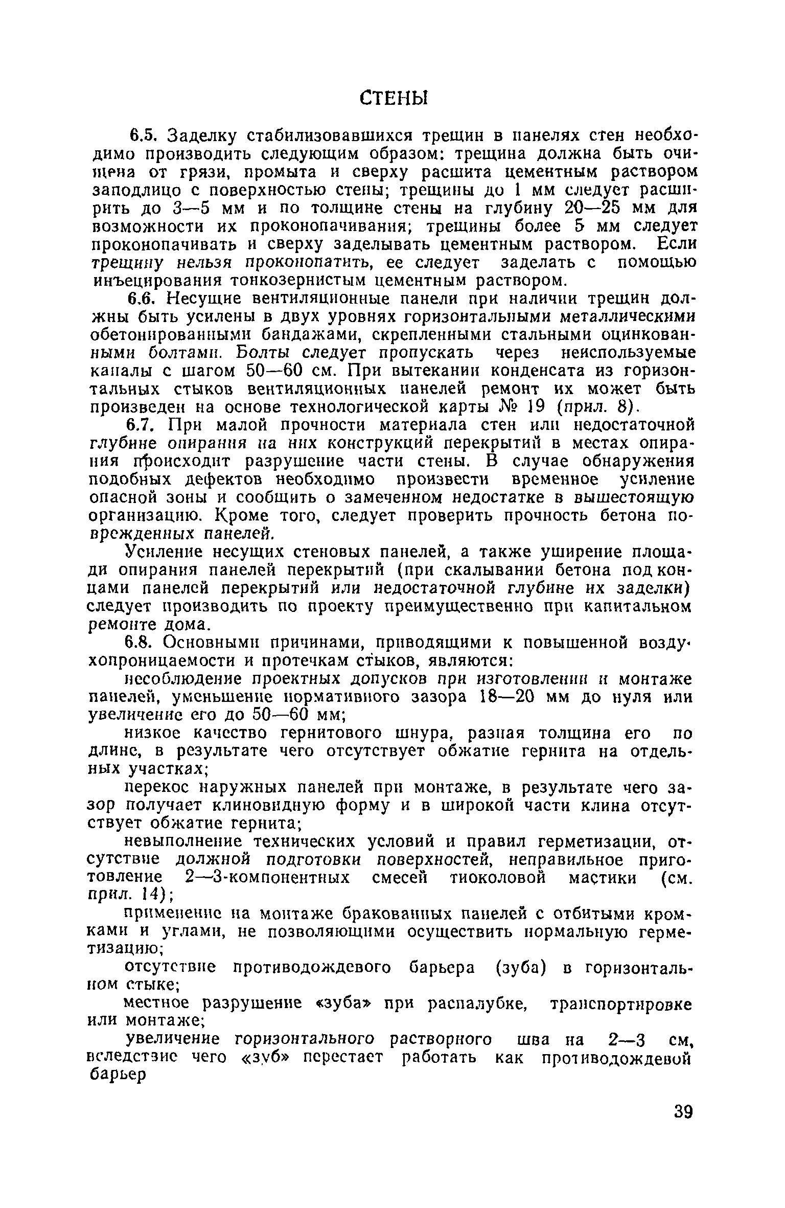 | Оглавление: | Введение 1. Общие указания 2. Планирование профилактического текущего ремонта крупнопанельных зданий 3. Организация профилактического текущего ремонта жилых крупнопанельных зданий 4. Методика периодических осмотров и обследования крупнопанельных зданий 5. Определение причин появления и способов устранения основных дефектов в конструктивных элементах крупнопанельных зданий 6. Технология профилактического текущего ремонта крупнопанельных зданий 7. Ремонт и наладка оборудования в доме Приложение 1. Формы актов общего осмотра зданий Приложение 2. Примерный перечень работ по текущему ремонту жилых крупнопанельных зданий Приложение 3. Перечень работ по техническому обслуживанию элементов жилого крупнопанельного здания, выполняемых при проведении частичных осмотров Приложение 4. Журнал регистрации результатов периодических осмотров объектов Приложение 5. Расчет численности и фонда заработной платы рабочих текущего ремонта (форма) Приложение 6. Пообьектный график работ по профилактическому текущему ремонту жилых домов Приложение 7. Сводный план текущего ремонта жилых домов Приложение 8. Перечень типовых технологических карт на процессы ремонта крупнопанельных жилых зданий, разработанных ЛНИИ АКХ и утвержденных приказами МЖКХ РСФСР Приложение 9. Перечень типовых технологических карт на процессы текущего ремонта жилых зданий. Разработанных ЛНИИ АКХ и утвержденных приказом МЖКХ РСФСР от 14.09.73 г. № 365 Приложение 10. Конструктивные схемы крупнопанельных жилых домов Приложение 11. Методика оценки состояния металлических элементов в конструкциях крупнопанельных зданий . . . Приложение 12. Методика определения влажности материалов Приложение 13. Приборы для контрольно-измерительных работ, выполняемых в крупнопанельных зданиях Приложение 14. Герметизация стыков панелей наружных стен (технология) Приложение 15. Гидрофобизация наружных поверхностей стеновых панелей Приложение 16. Материалы для ремонта ячеистобетонных панелей Приложение 17. Рецепты составов для крепления отпавшей облицовочной плитки панелей фасадов Приложение 18. Рецепты моющих средств для фасадов оконных заполнителей |