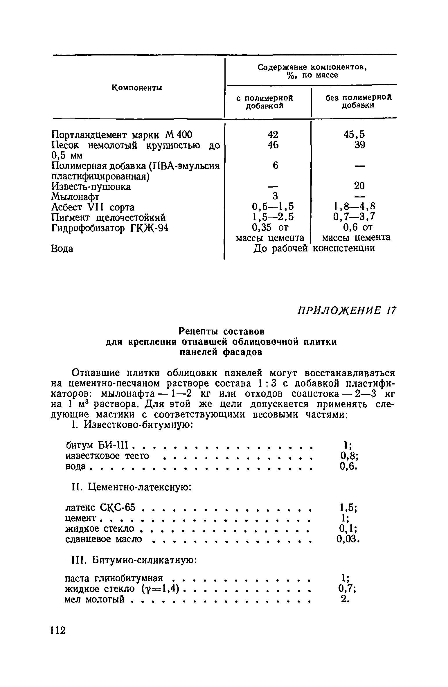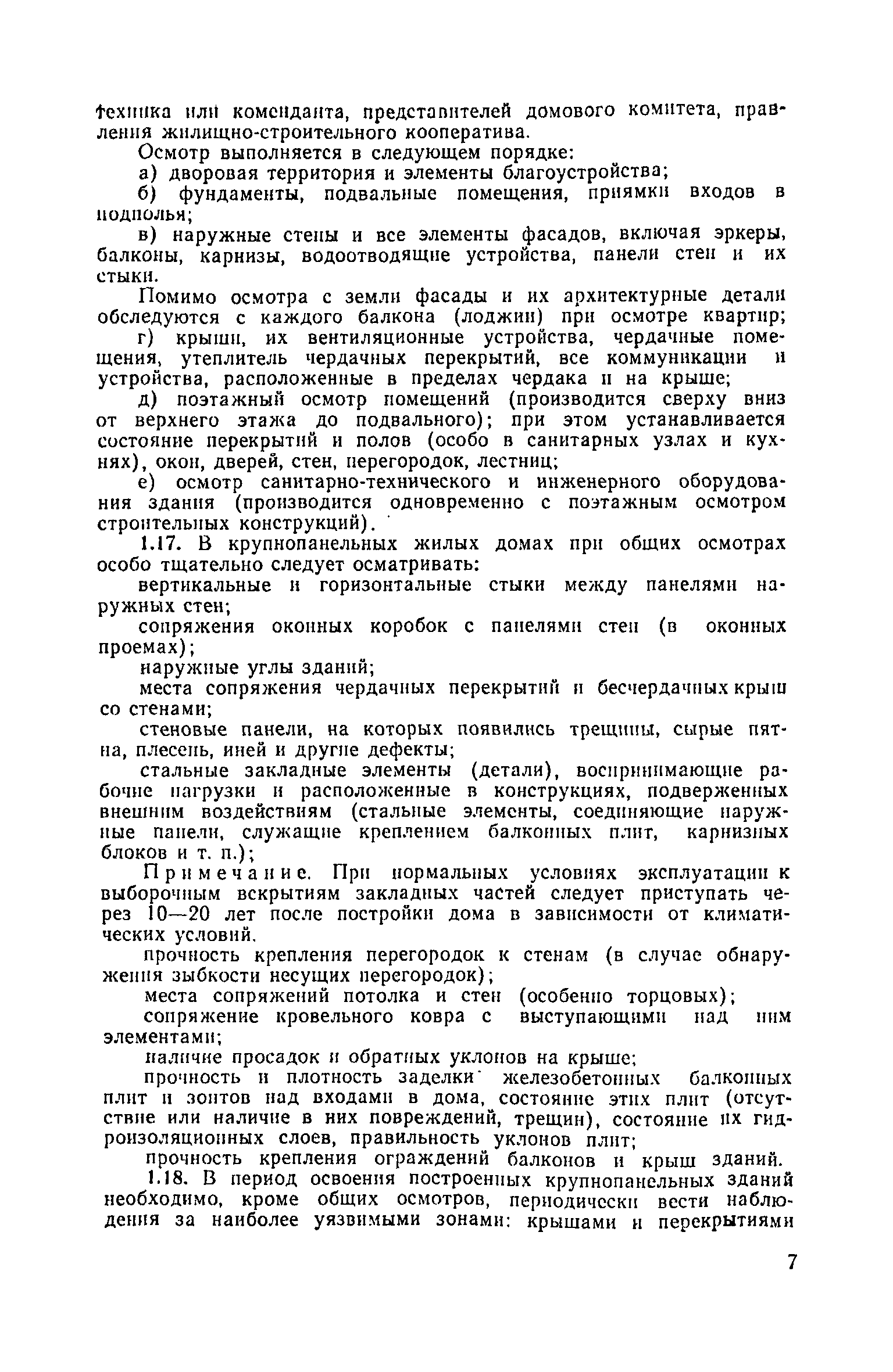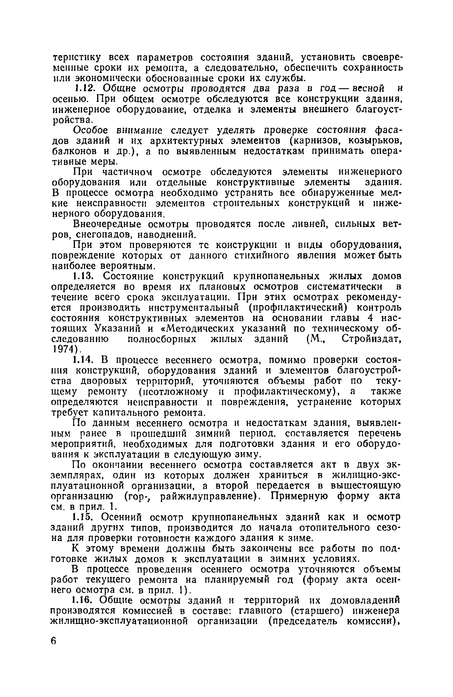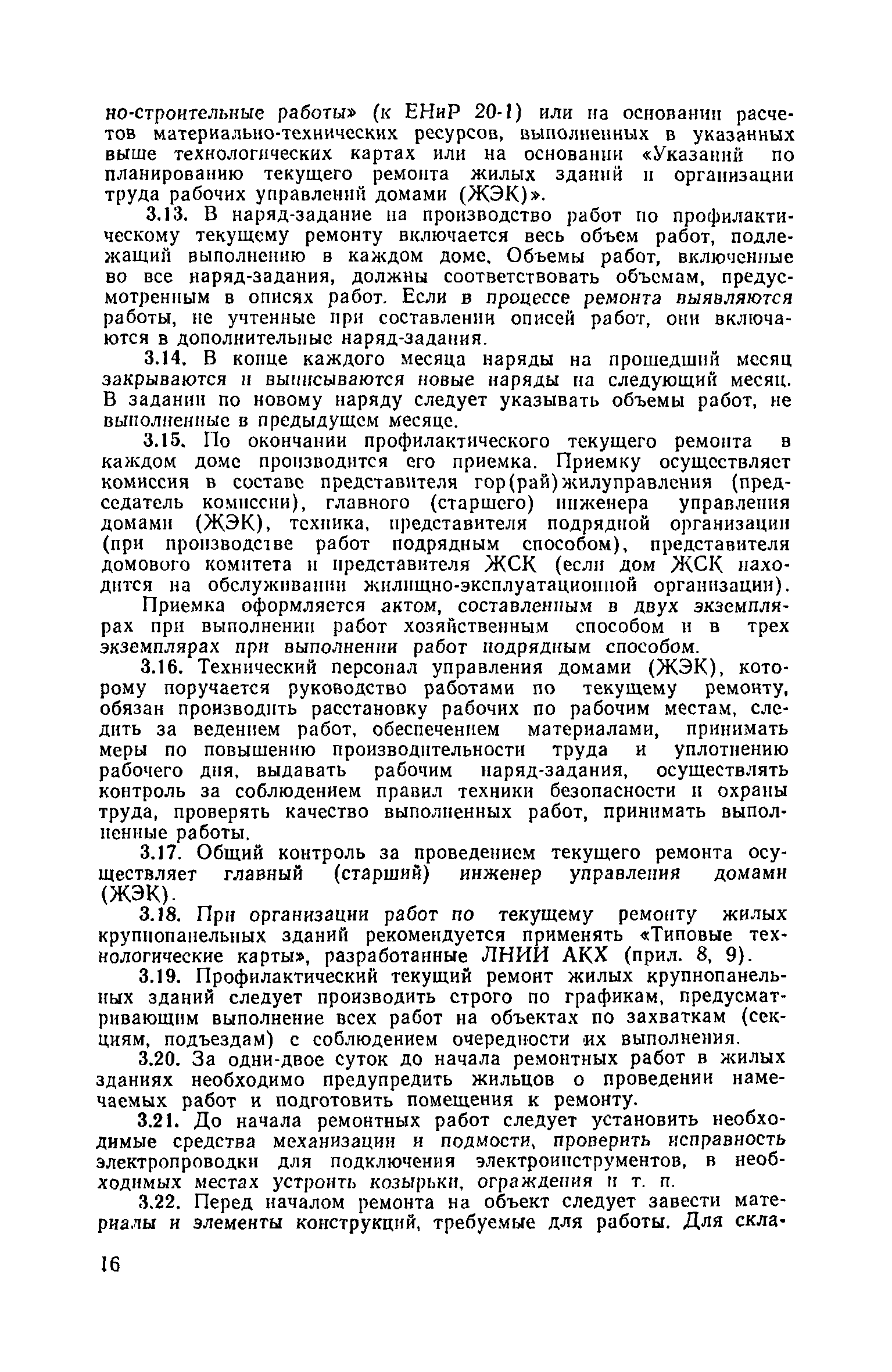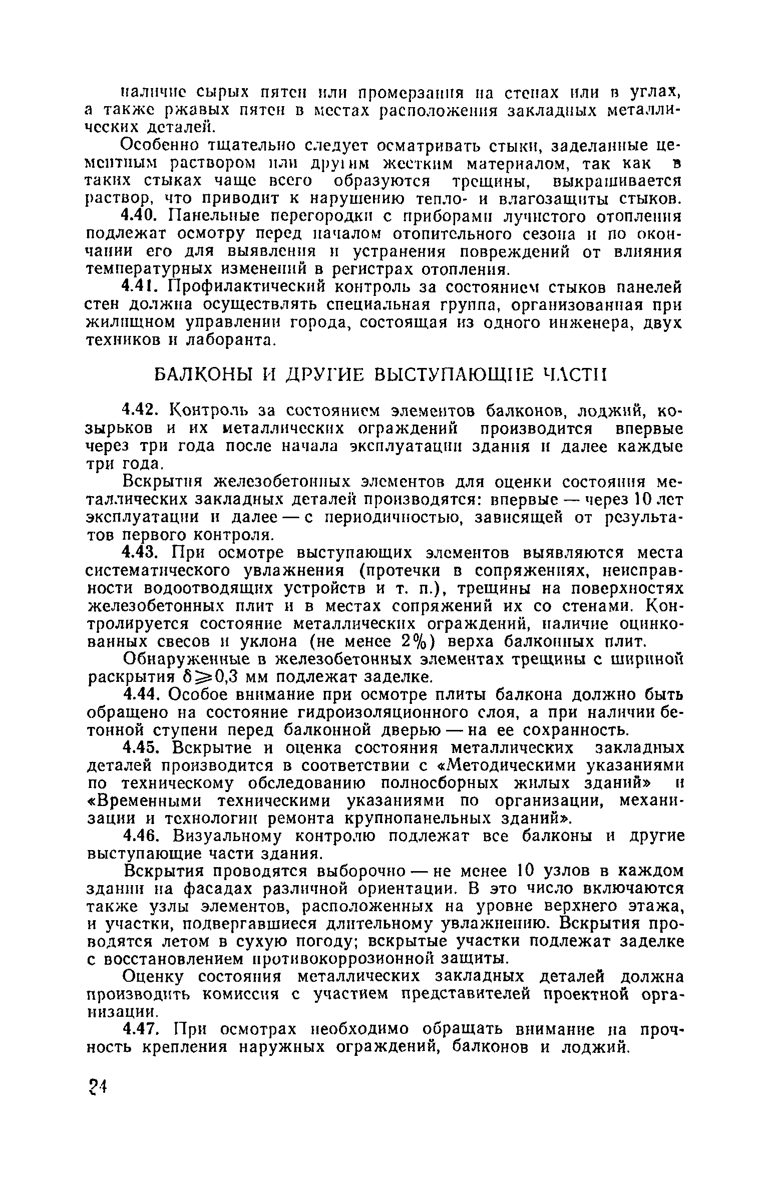 | Оглавление: | Введение 1. Общие указания 2. Планирование профилактического текущего ремонта крупнопанельных зданий 3. Организация профилактического текущего ремонта жилых крупнопанельных зданий 4. Методика периодических осмотров и обследования крупнопанельных зданий 5. Определение причин появления и способов устранения основных дефектов в конструктивных элементах крупнопанельных зданий 6. Технология профилактического текущего ремонта крупнопанельных зданий 7. Ремонт и наладка оборудования в доме Приложение 1. Формы актов общего осмотра зданий Приложение 2. Примерный перечень работ по текущему ремонту жилых крупнопанельных зданий Приложение 3. Перечень работ по техническому обслуживанию элементов жилого крупнопанельного здания, выполняемых при проведении частичных осмотров Приложение 4. Журнал регистрации результатов периодических осмотров объектов Приложение 5. Расчет численности и фонда заработной платы рабочих текущего ремонта (форма) Приложение 6. Пообьектный график работ по профилактическому текущему ремонту жилых домов Приложение 7. Сводный план текущего ремонта жилых домов Приложение 8. Перечень типовых технологических карт на процессы ремонта крупнопанельных жилых зданий, разработанных ЛНИИ АКХ и утвержденных приказами МЖКХ РСФСР Приложение 9. Перечень типовых технологических карт на процессы текущего ремонта жилых зданий. Разработанных ЛНИИ АКХ и утвержденных приказом МЖКХ РСФСР от 14.09.73 г. № 365 Приложение 10. Конструктивные схемы крупнопанельных жилых домов Приложение 11. Методика оценки состояния металлических элементов в конструкциях крупнопанельных зданий . . . Приложение 12. Методика определения влажности материалов Приложение 13. Приборы для контрольно-измерительных работ, выполняемых в крупнопанельных зданиях Приложение 14. Герметизация стыков панелей наружных стен (технология) Приложение 15. Гидрофобизация наружных поверхностей стеновых панелей Приложение 16. Материалы для ремонта ячеистобетонных панелей Приложение 17. Рецепты составов для крепления отпавшей облицовочной плитки панелей фасадов Приложение 18. Рецепты моющих средств для фасадов оконных заполнителей |