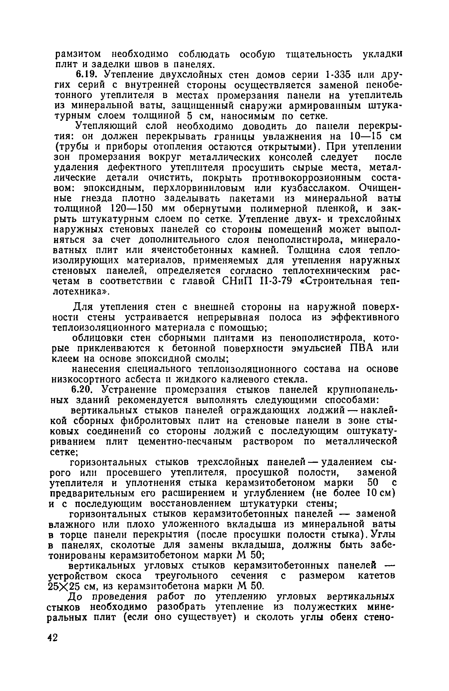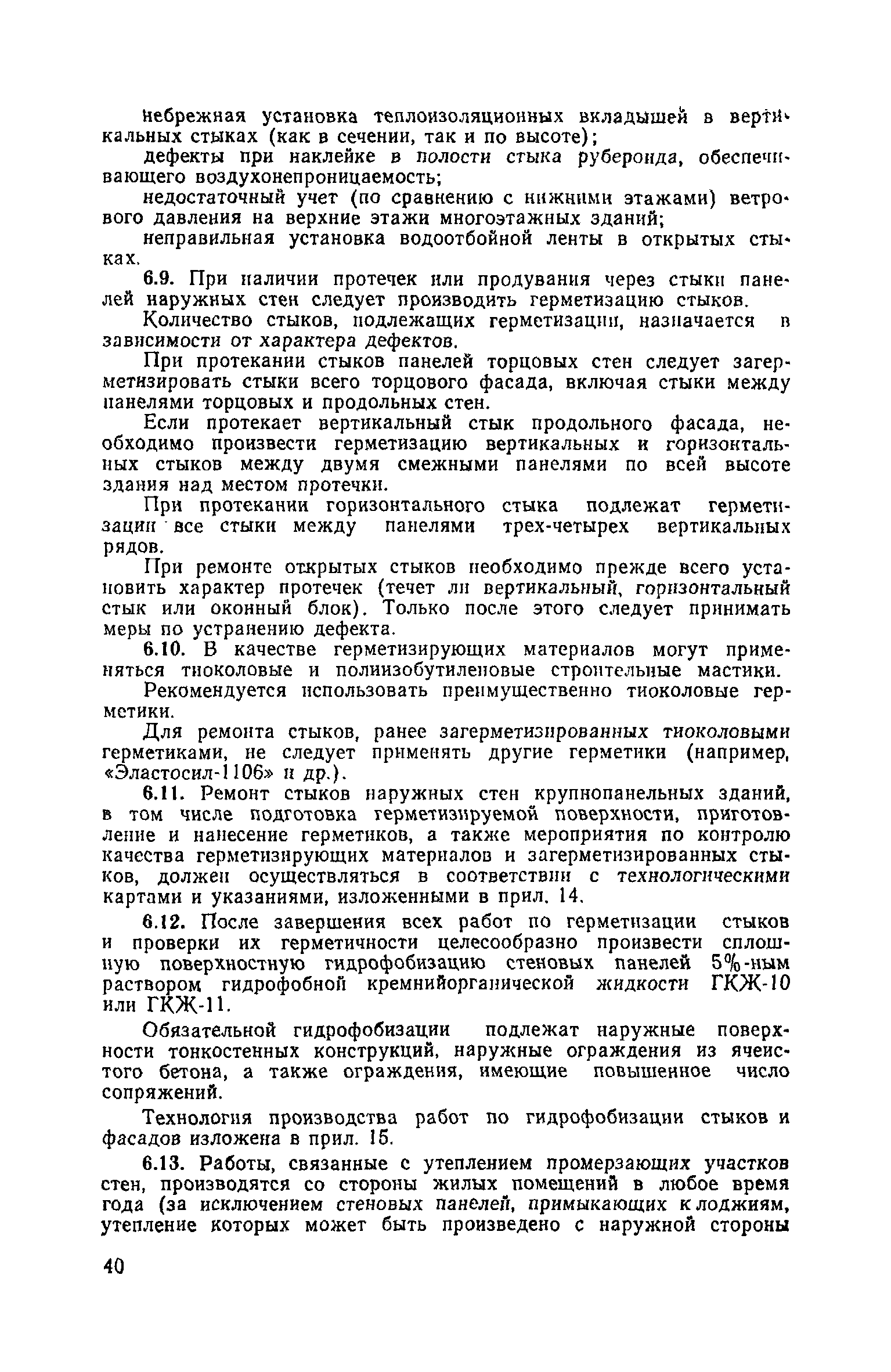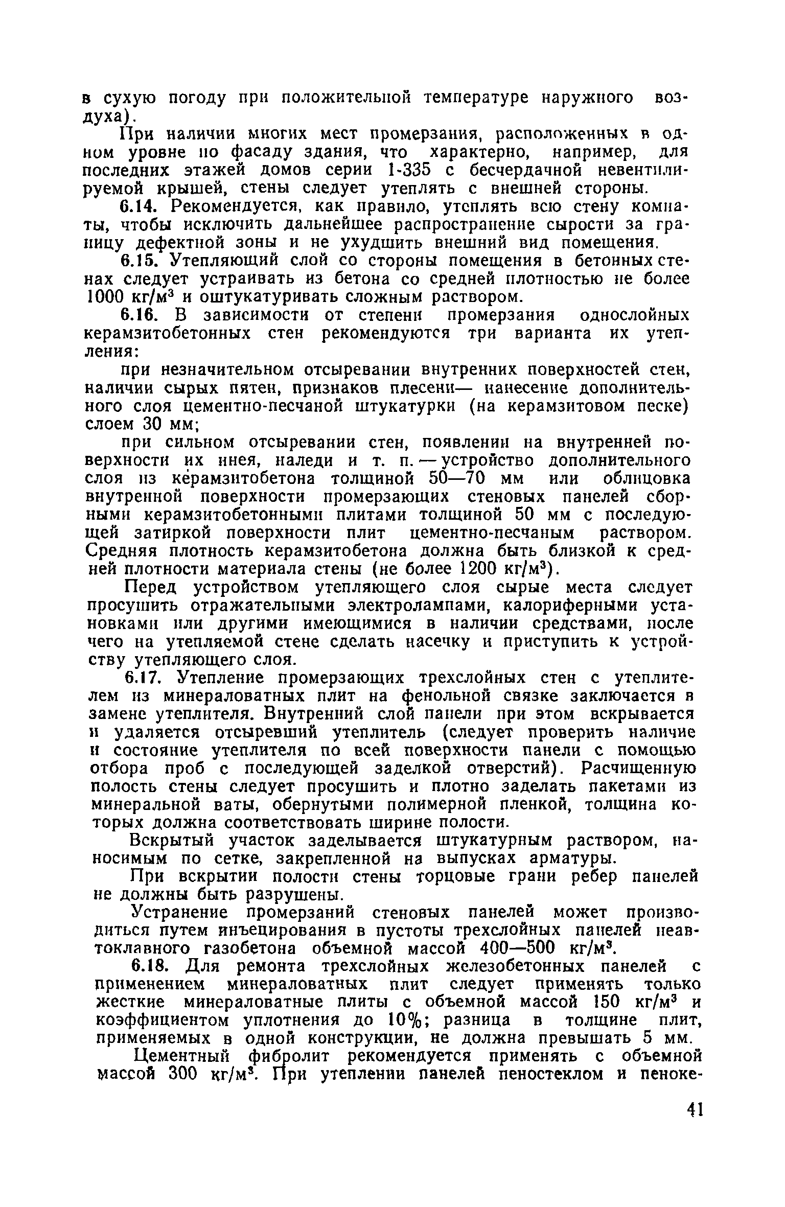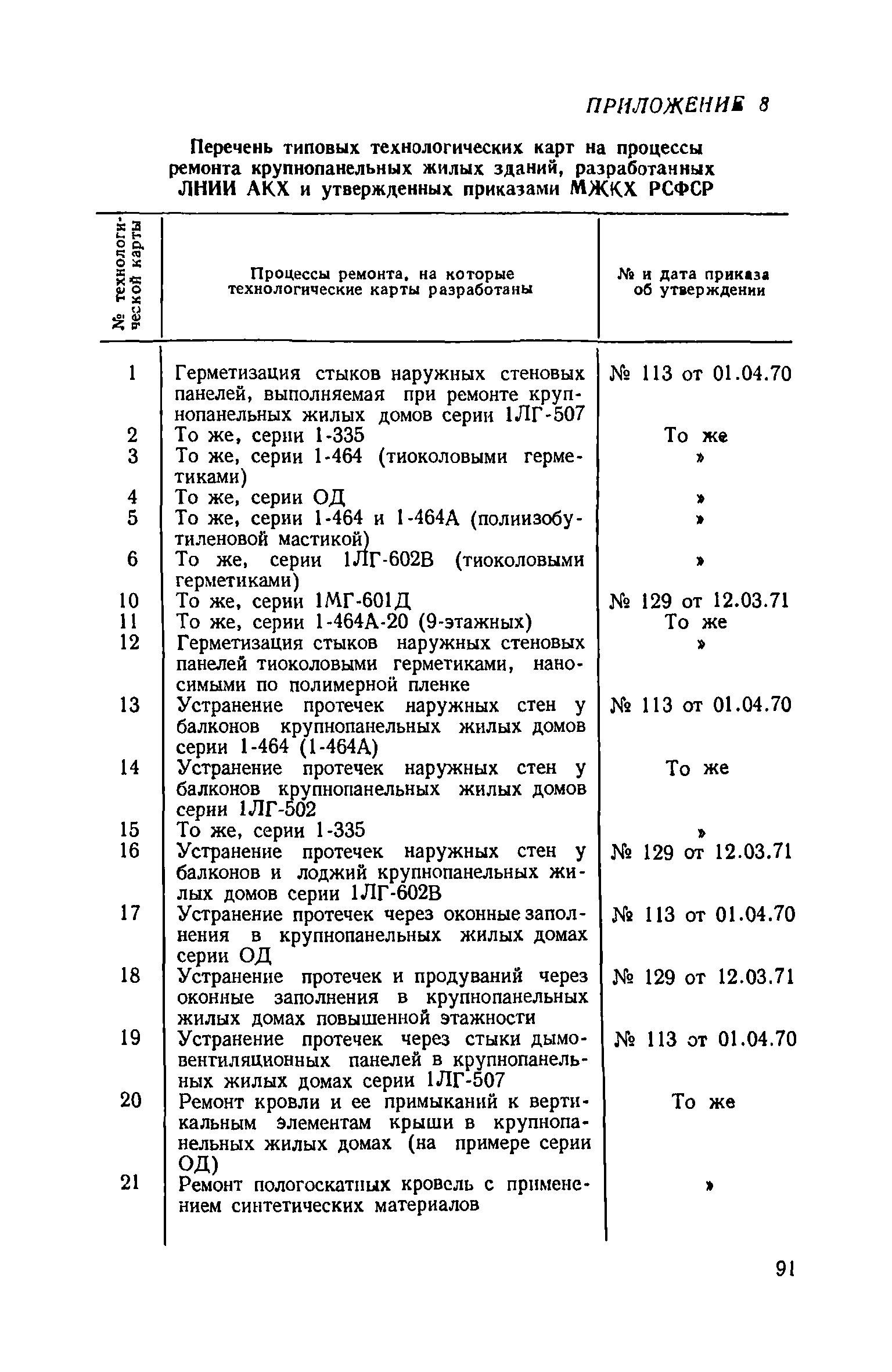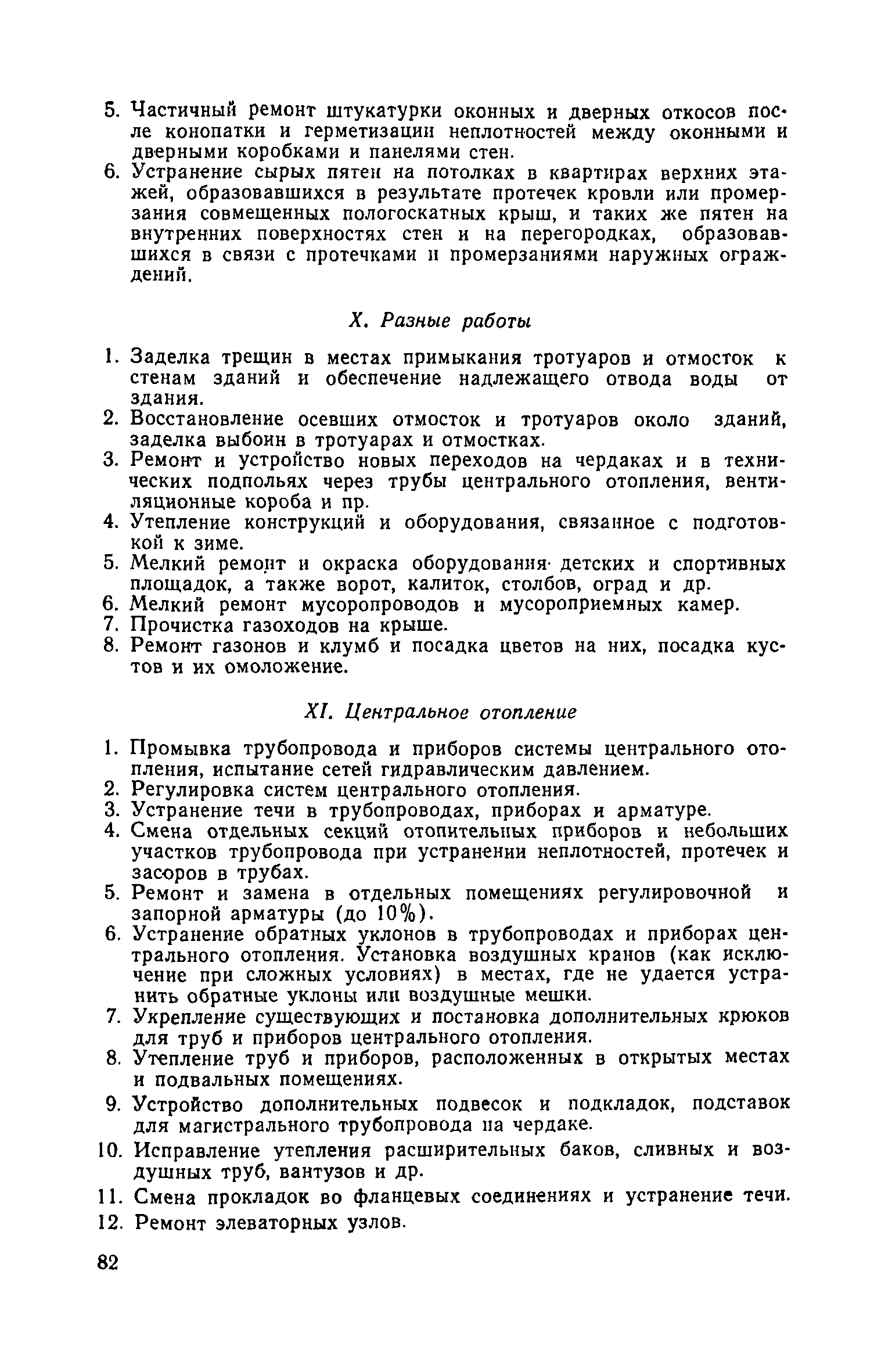 | Оглавление: | Введение 1. Общие указания 2. Планирование профилактического текущего ремонта крупнопанельных зданий 3. Организация профилактического текущего ремонта жилых крупнопанельных зданий 4. Методика периодических осмотров и обследования крупнопанельных зданий 5. Определение причин появления и способов устранения основных дефектов в конструктивных элементах крупнопанельных зданий 6. Технология профилактического текущего ремонта крупнопанельных зданий 7. Ремонт и наладка оборудования в доме Приложение 1. Формы актов общего осмотра зданий Приложение 2. Примерный перечень работ по текущему ремонту жилых крупнопанельных зданий Приложение 3. Перечень работ по техническому обслуживанию элементов жилого крупнопанельного здания, выполняемых при проведении частичных осмотров Приложение 4. Журнал регистрации результатов периодических осмотров объектов Приложение 5. Расчет численности и фонда заработной платы рабочих текущего ремонта (форма) Приложение 6. Пообьектный график работ по профилактическому текущему ремонту жилых домов Приложение 7. Сводный план текущего ремонта жилых домов Приложение 8. Перечень типовых технологических карт на процессы ремонта крупнопанельных жилых зданий, разработанных ЛНИИ АКХ и утвержденных приказами МЖКХ РСФСР Приложение 9. Перечень типовых технологических карт на процессы текущего ремонта жилых зданий. Разработанных ЛНИИ АКХ и утвержденных приказом МЖКХ РСФСР от 14.09.73 г. № 365 Приложение 10. Конструктивные схемы крупнопанельных жилых домов Приложение 11. Методика оценки состояния металлических элементов в конструкциях крупнопанельных зданий . . . Приложение 12. Методика определения влажности материалов Приложение 13. Приборы для контрольно-измерительных работ, выполняемых в крупнопанельных зданиях Приложение 14. Герметизация стыков панелей наружных стен (технология) Приложение 15. Гидрофобизация наружных поверхностей стеновых панелей Приложение 16. Материалы для ремонта ячеистобетонных панелей Приложение 17. Рецепты составов для крепления отпавшей облицовочной плитки панелей фасадов Приложение 18. Рецепты моющих средств для фасадов оконных заполнителей |