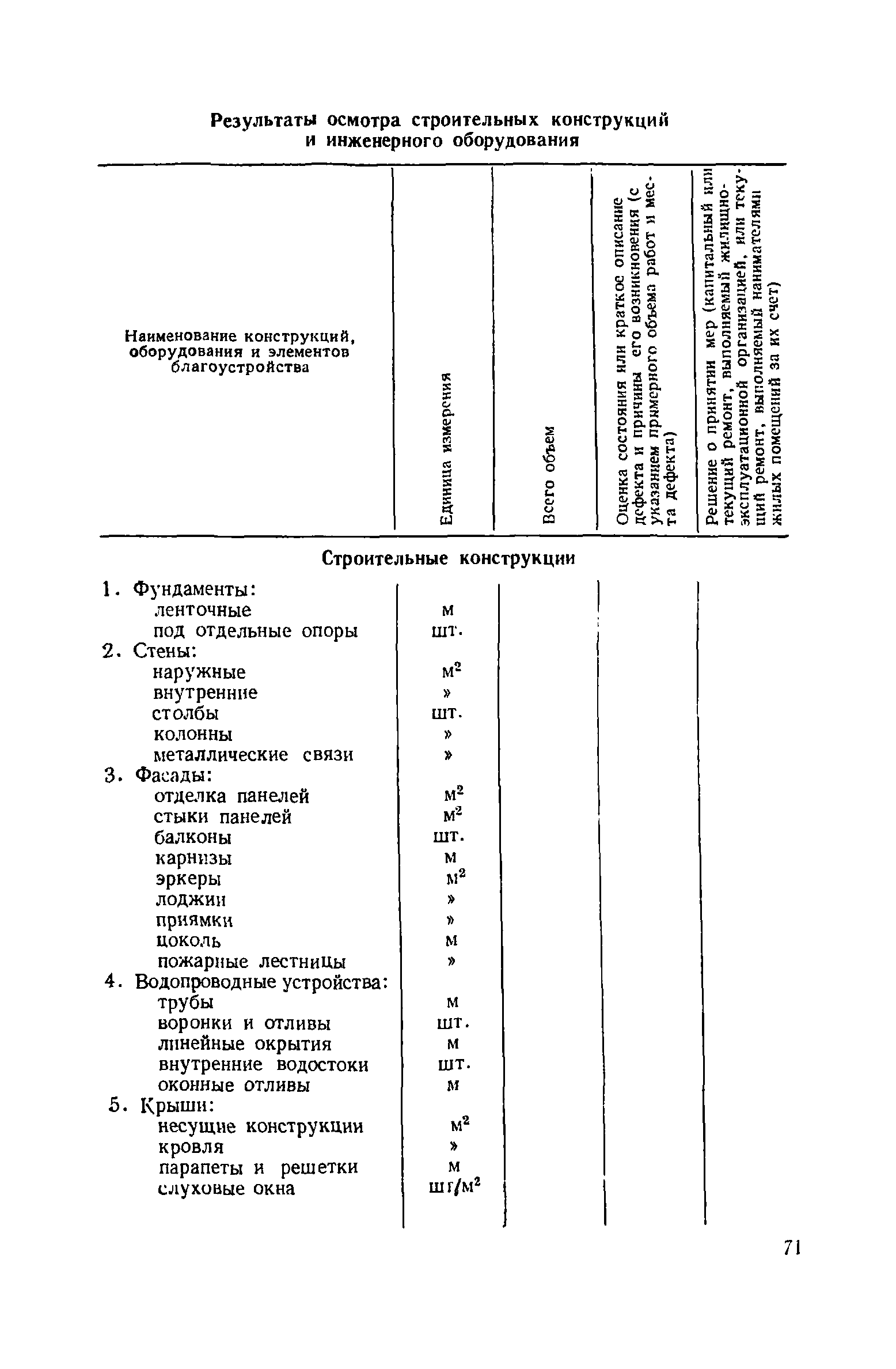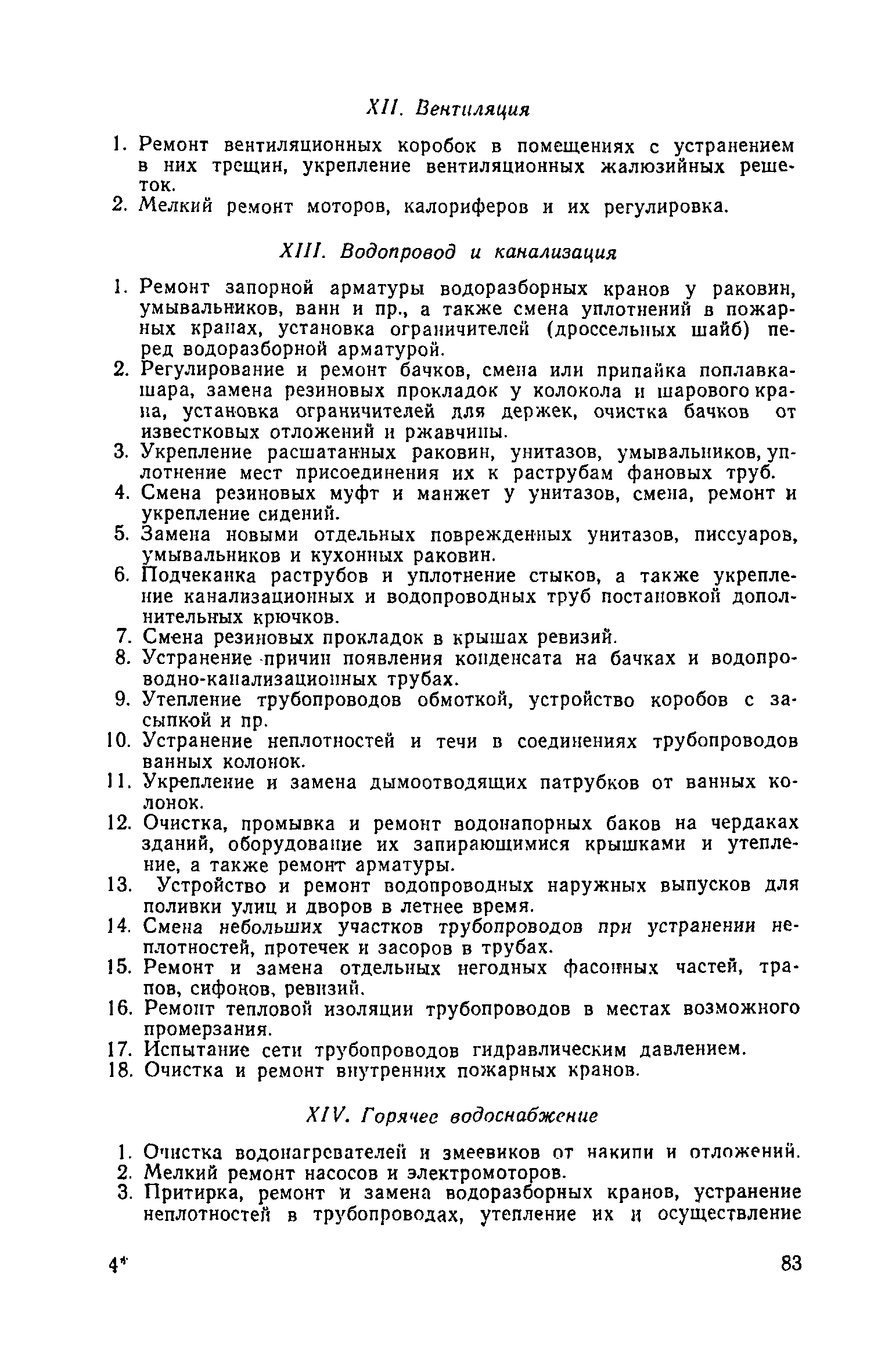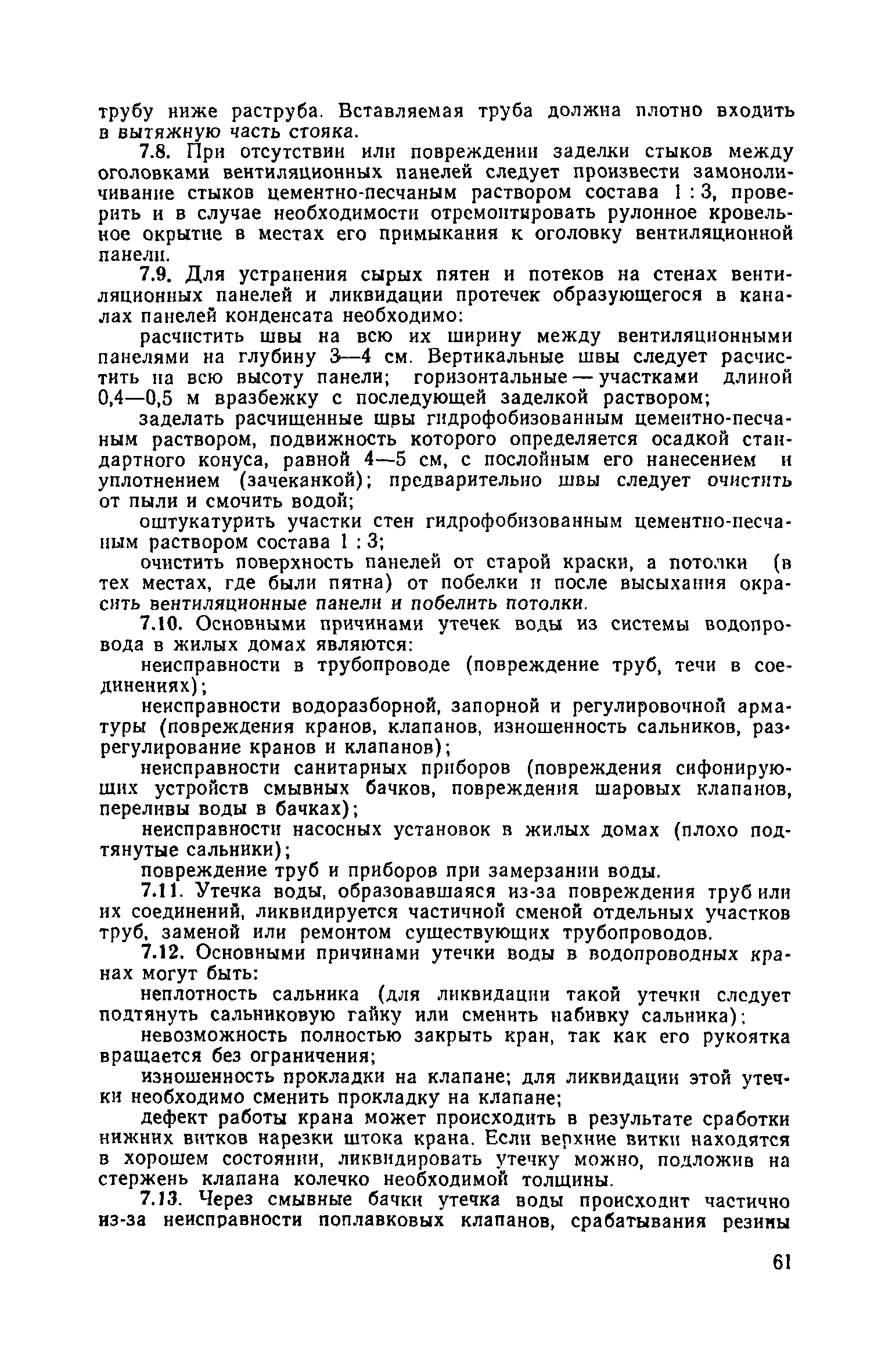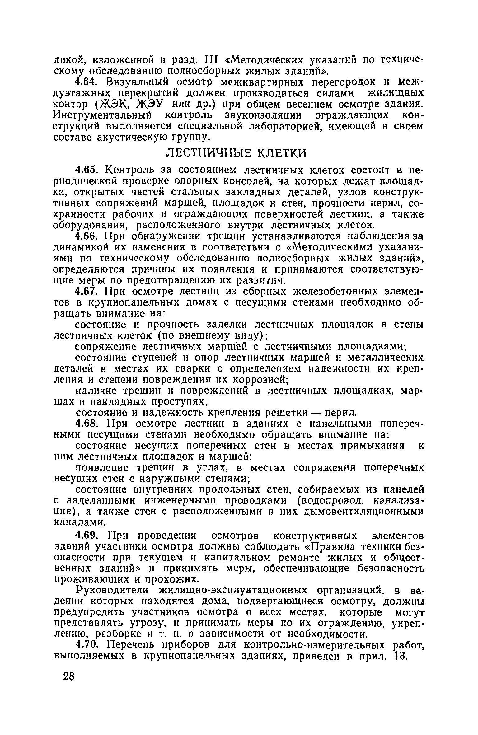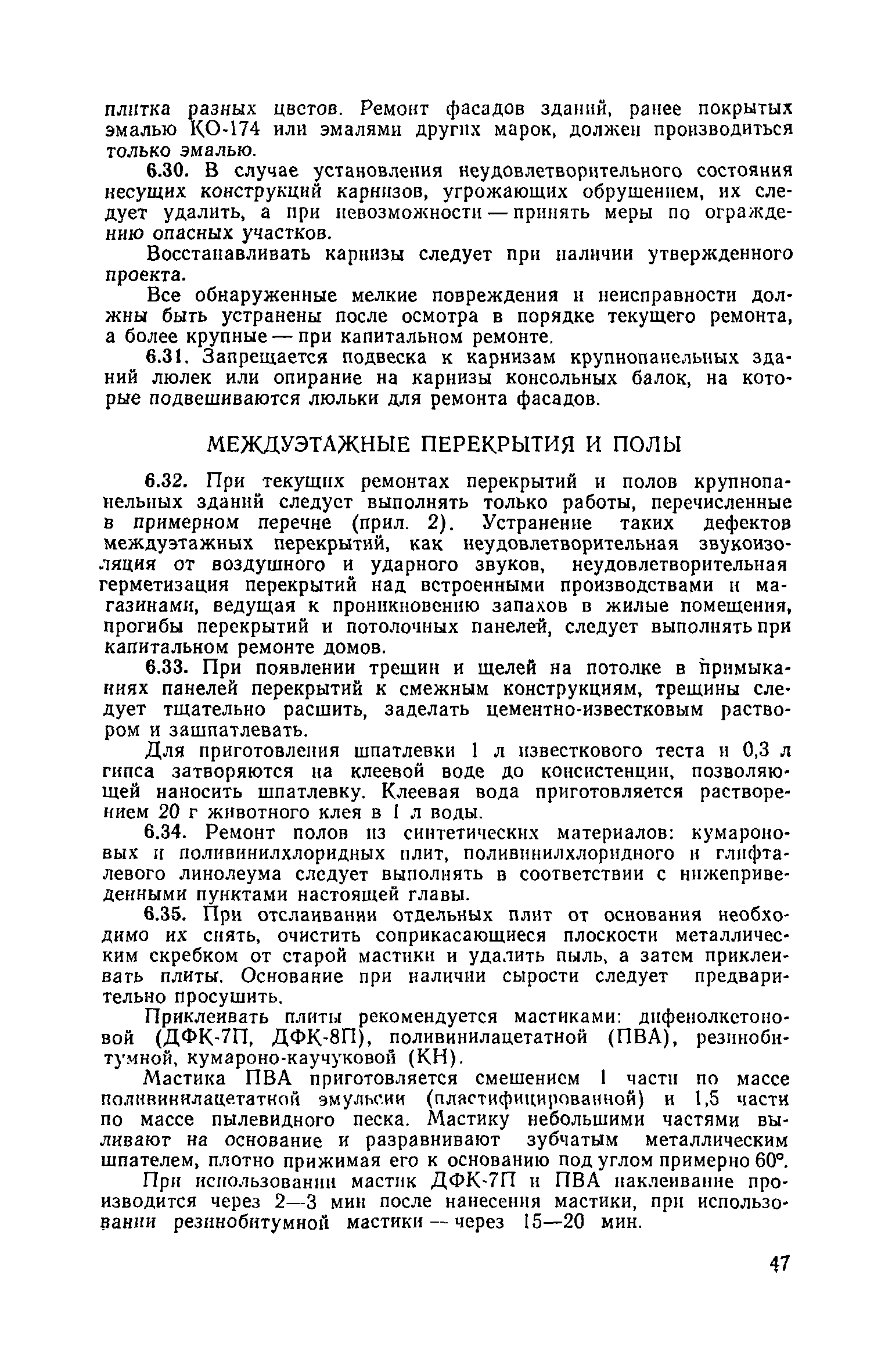 | Оглавление: | Введение 1. Общие указания 2. Планирование профилактического текущего ремонта крупнопанельных зданий 3. Организация профилактического текущего ремонта жилых крупнопанельных зданий 4. Методика периодических осмотров и обследования крупнопанельных зданий 5. Определение причин появления и способов устранения основных дефектов в конструктивных элементах крупнопанельных зданий 6. Технология профилактического текущего ремонта крупнопанельных зданий 7. Ремонт и наладка оборудования в доме Приложение 1. Формы актов общего осмотра зданий Приложение 2. Примерный перечень работ по текущему ремонту жилых крупнопанельных зданий Приложение 3. Перечень работ по техническому обслуживанию элементов жилого крупнопанельного здания, выполняемых при проведении частичных осмотров Приложение 4. Журнал регистрации результатов периодических осмотров объектов Приложение 5. Расчет численности и фонда заработной платы рабочих текущего ремонта (форма) Приложение 6. Пообьектный график работ по профилактическому текущему ремонту жилых домов Приложение 7. Сводный план текущего ремонта жилых домов Приложение 8. Перечень типовых технологических карт на процессы ремонта крупнопанельных жилых зданий, разработанных ЛНИИ АКХ и утвержденных приказами МЖКХ РСФСР Приложение 9. Перечень типовых технологических карт на процессы текущего ремонта жилых зданий. Разработанных ЛНИИ АКХ и утвержденных приказом МЖКХ РСФСР от 14.09.73 г. № 365 Приложение 10. Конструктивные схемы крупнопанельных жилых домов Приложение 11. Методика оценки состояния металлических элементов в конструкциях крупнопанельных зданий . . . Приложение 12. Методика определения влажности материалов Приложение 13. Приборы для контрольно-измерительных работ, выполняемых в крупнопанельных зданиях Приложение 14. Герметизация стыков панелей наружных стен (технология) Приложение 15. Гидрофобизация наружных поверхностей стеновых панелей Приложение 16. Материалы для ремонта ячеистобетонных панелей Приложение 17. Рецепты составов для крепления отпавшей облицовочной плитки панелей фасадов Приложение 18. Рецепты моющих средств для фасадов оконных заполнителей |