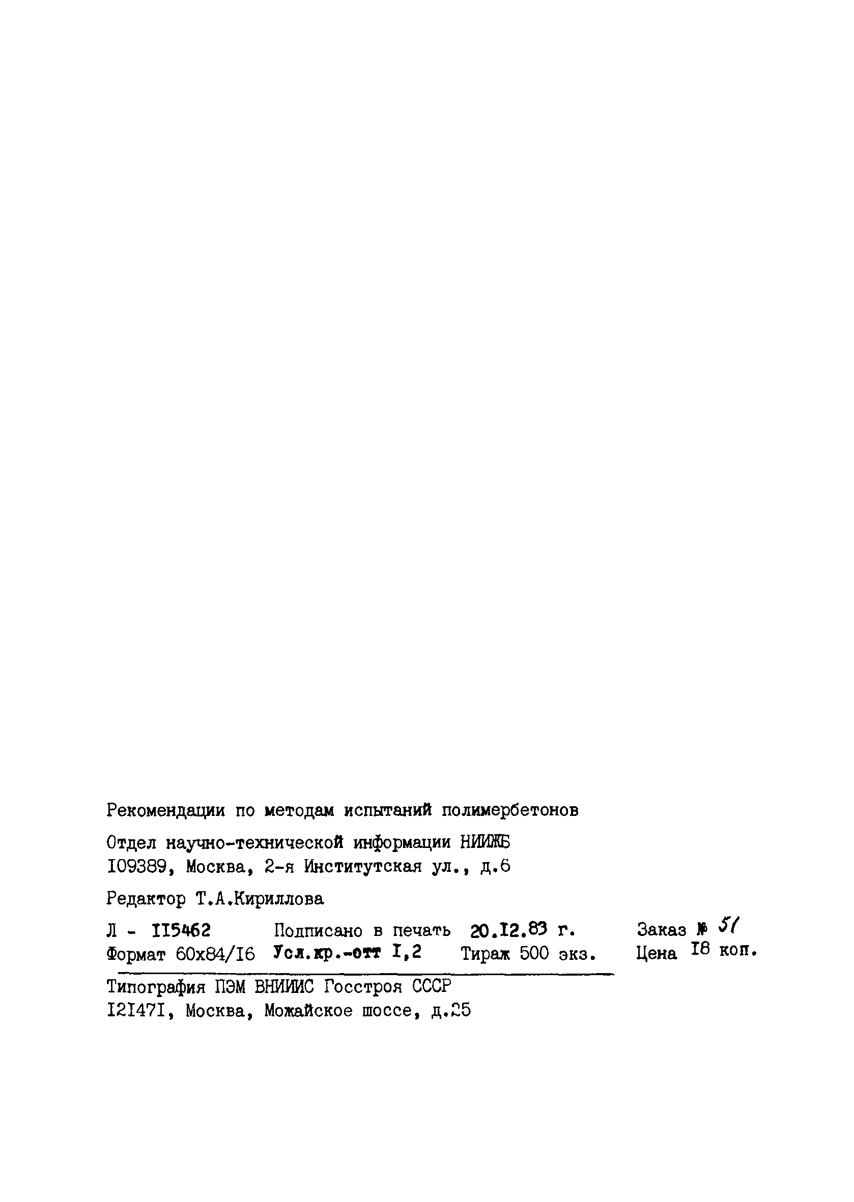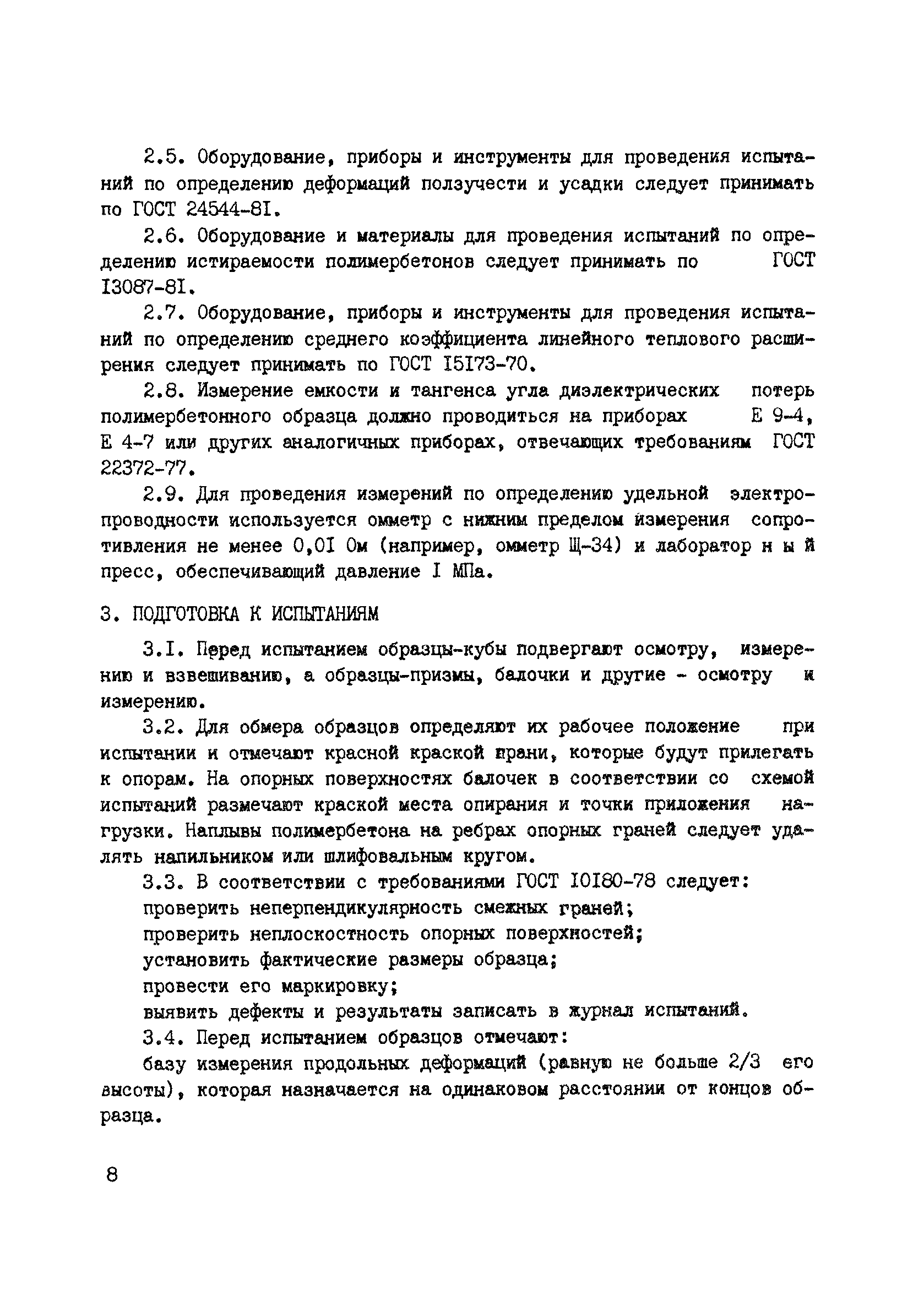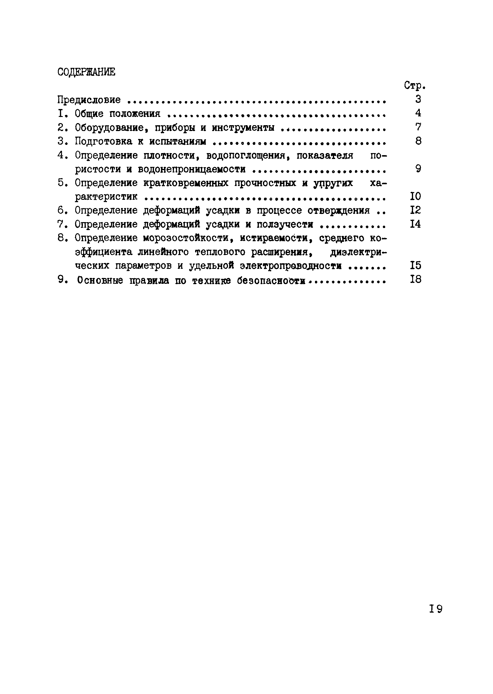 | Оглавление: | Предисловие 1. Общие положения 2. Оборудование, приборы и инструменты 3. Подготовка к испытаниям . 4. Определение плотности, водопоглощения, показателя пористости и водонепроницаемости 5. Определение кратковременных прочностных и упругих характеристик 6. Определение деформаций усадки в процессе отверждения 7. Определение деформаций усадки и ползучести 8. Определение морозостойкости, истираемости, среднего коэффициента линейного теплового расширения, диэлектрических параметров и удельной электропроводности 9. Основные правила по технике безопасности |