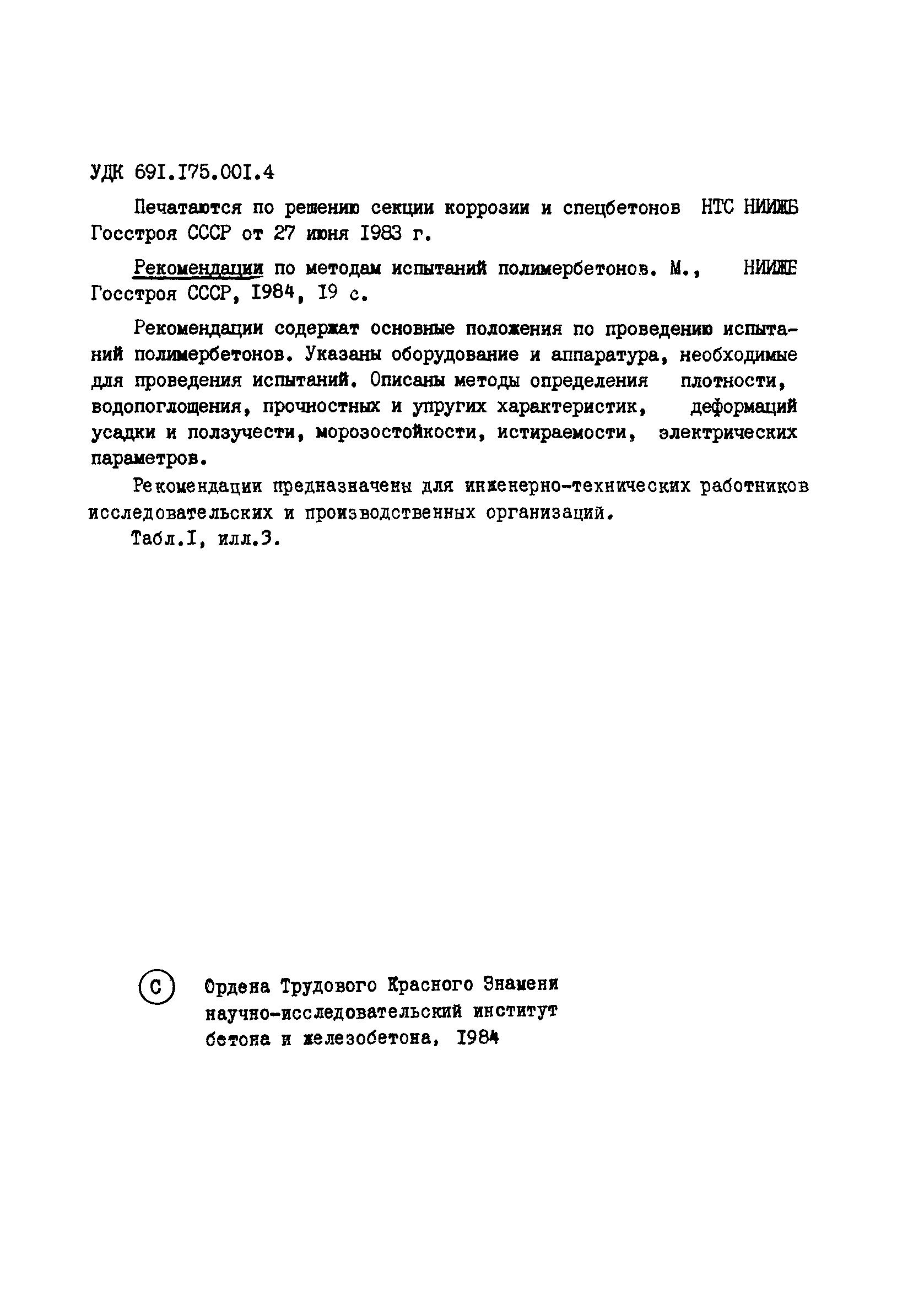 | Область применения: | Рекомендации содержат основные положения по проведению испытаний полимербетонов. Указаны оборудование и аппаратура, необходимые для проведения испытаний. Описаны методы определения плотности, водопоглощения, прочностных и упругих характеристик, деформаций усадки и ползучести, морозостойкости, истираемости, электрических параметров. Рекомендации предназначены для инженерно—технических работников исследовательских и производственных организаций. |