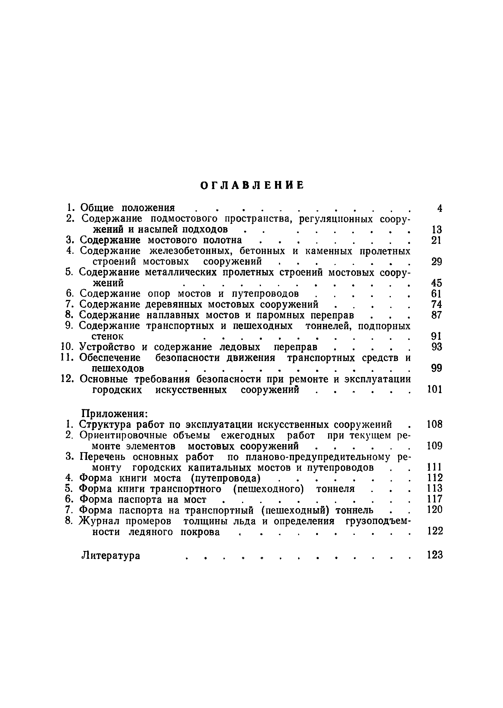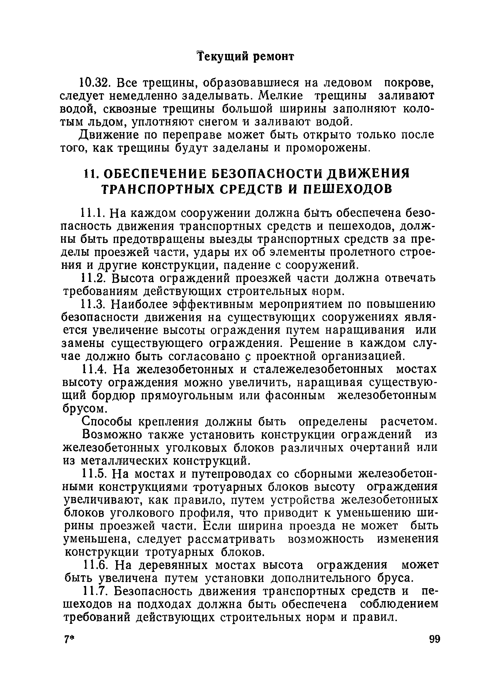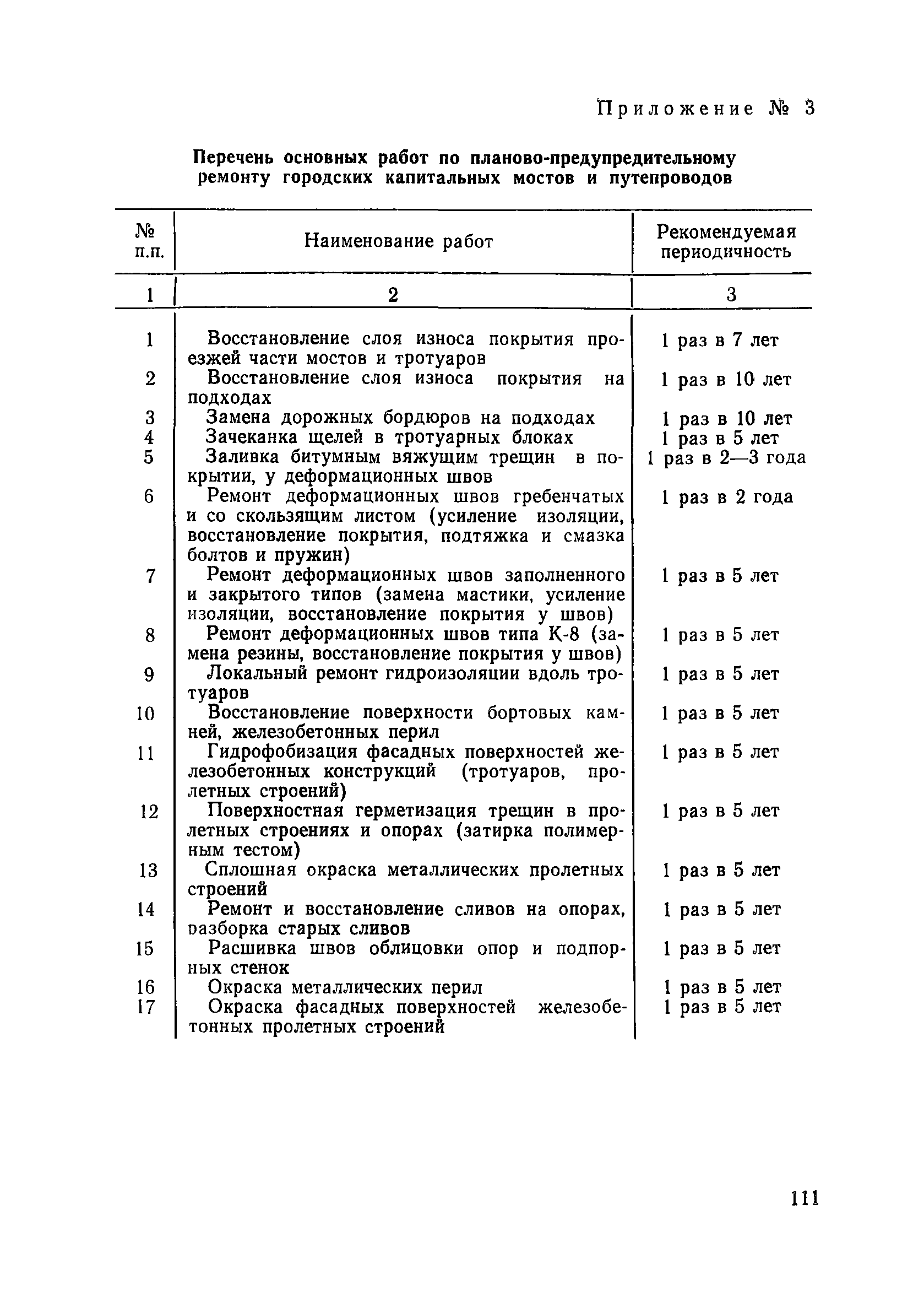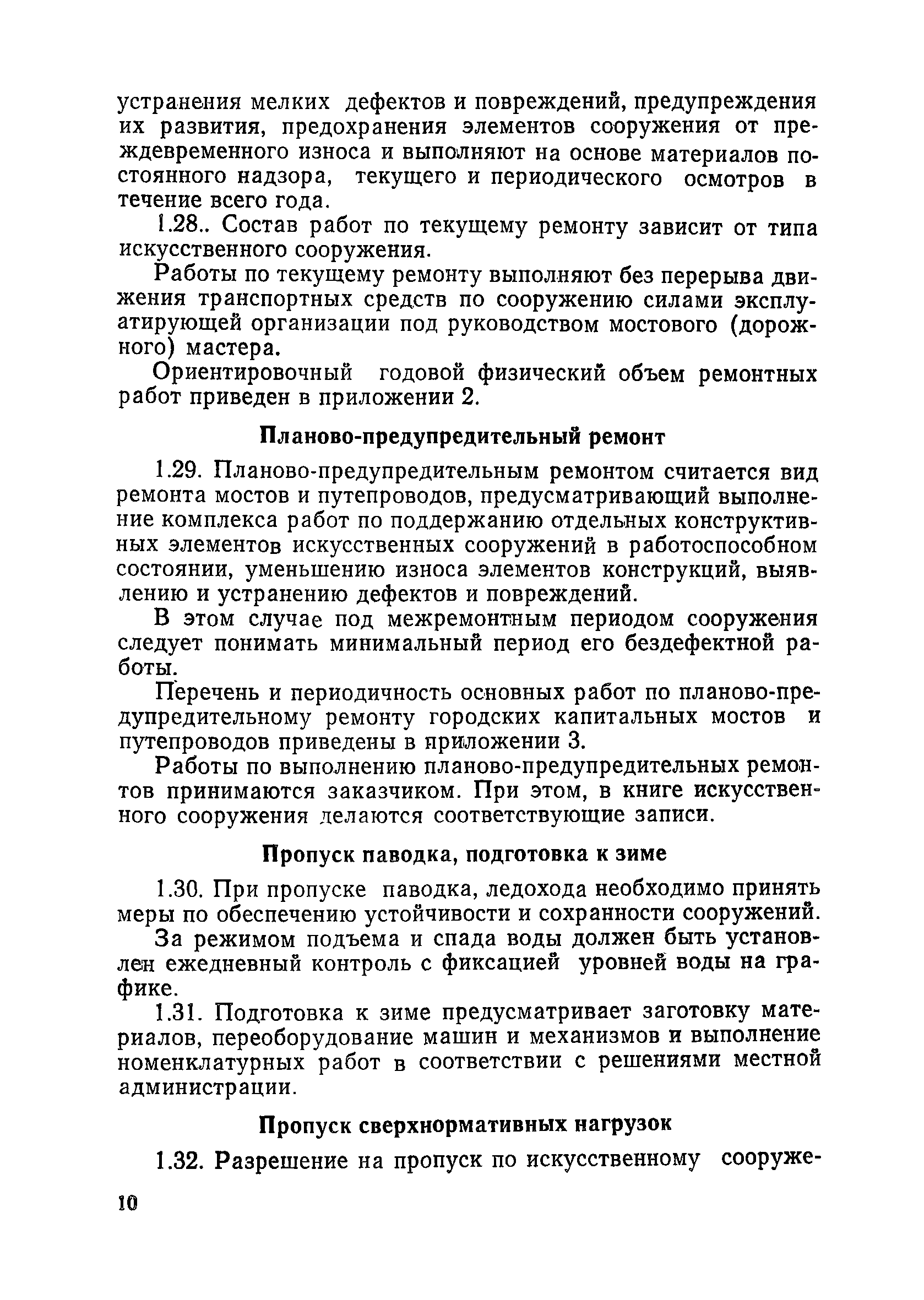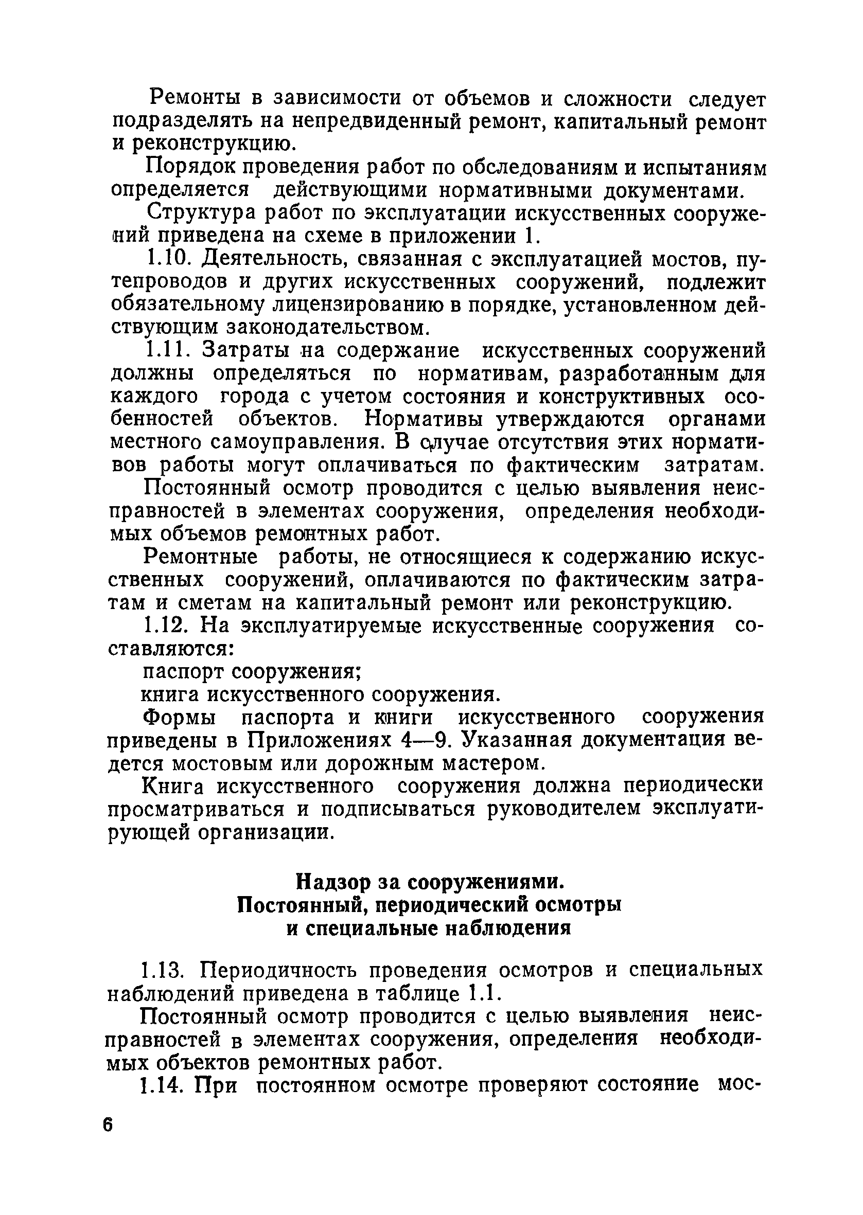 Правила эксплуатации городских искусственных сооружений| Статус: | действует | | Название рус.: | Правила эксплуатации городских искусственных сооружений | | Дата добавления в базу: | 01.09.2013 | | Дата актуализации: | 01.01.2021 | | Область применения: | Правила содержат классификацию работ и основные положения по организации содержания и ремонта городских искусственных сооружений: мостов и путепроводов с подходами к ним, труб, транспортных и пешеходных тоннелей, наплавных мостов, паромных и ледовых переправ. | | Оглавление: | 1. Общие положения 2. Содержание подмостового пространства, регуляционных сооружений и насыпей подходов 3. Содержание мостового полотна 4. Содержание железобетонных, бетонных и каменных пролетных строений мостовых сооружений 5. Содержание металлических пролетных строений мостовых сооружений 6. Содержание опор мостов и путепроводов 7. Содержание деревянных мостовых сооружений 8. Содержание наплавных мостов и паромных переправ 9. Содержание транспортных и пешеходных тоннелей, подпорных стенок 10. Устройство и содержание ледовых переправ 11. Обеспечение безопасности движения транспортных средств и пешеходов 12. Основные требования безопасности при ремонте и эксплуатации городских искусственных сооружений Приложения: 1. Структура работ по эксплуатации искусственных сооружений 2. Ориентировочные объемы ежегодных работ при текущем ремонте элементов мостовых сооружений 3. Перечень основных работ по планово-предупредительному ремонту городских капитальных мостов и путепроводов 4. Форма книги моста (путепровода) 5. Форма книги транспортного (пешеходного) тоннеля 6. Форма паспорта на мост 7. Форма паспорта на транспортный (пешеходный) тоннель 8. Журнал промеров толщины льда и определения грузоподъемности ледяного покрова Литература | | Разработан: | Саратовский институт Проектмостреконструкция