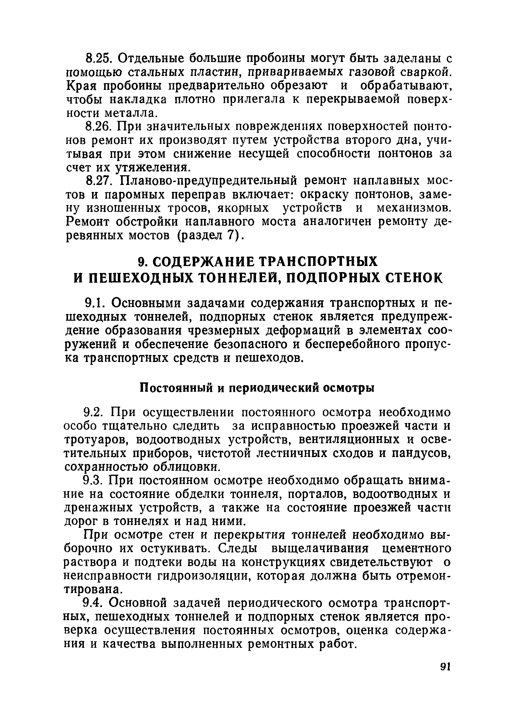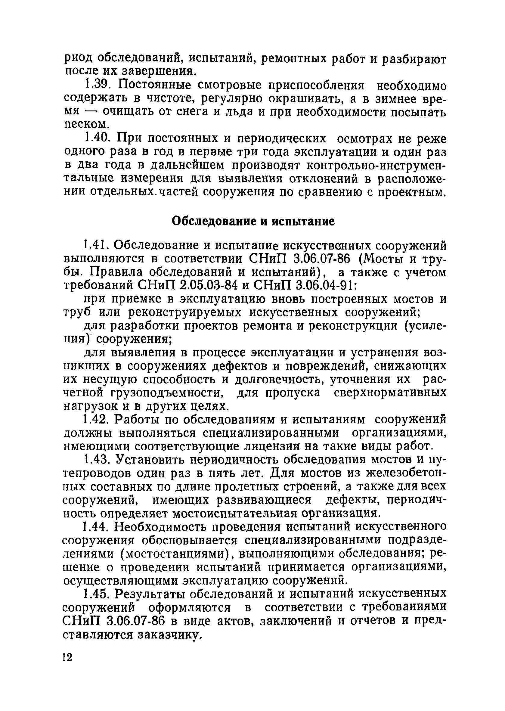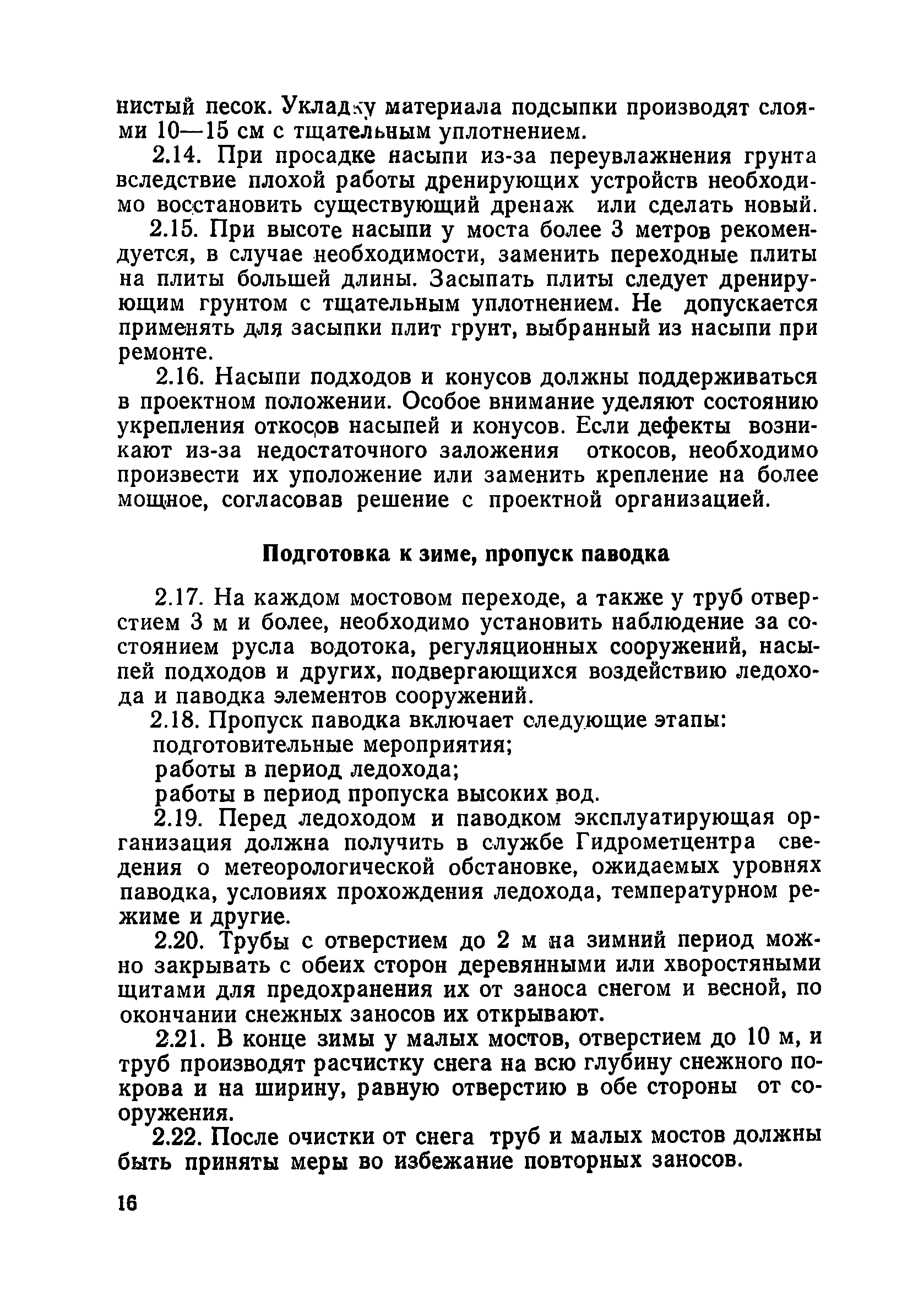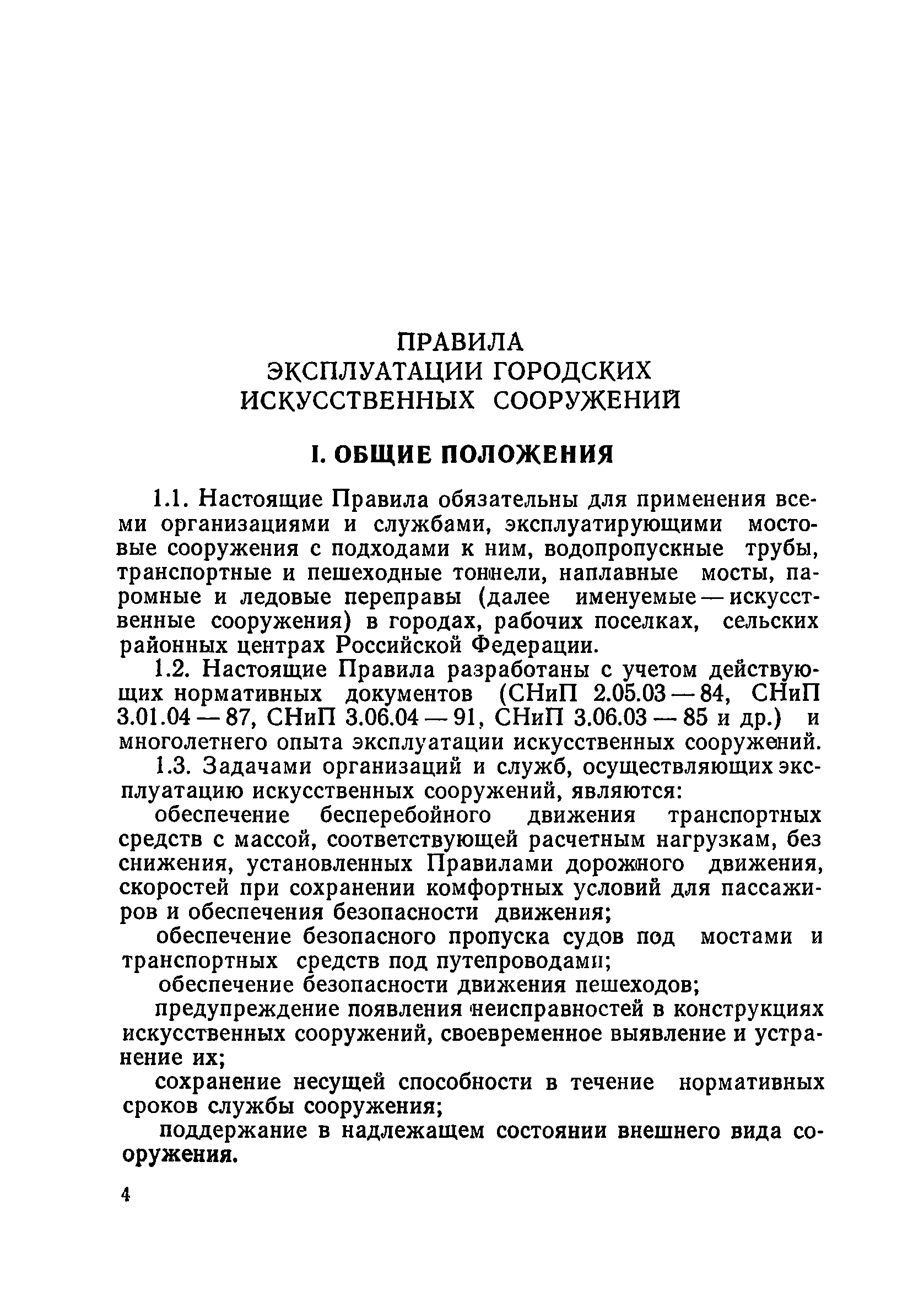 Правила эксплуатации городских искусственных сооружений| Статус: | действует | | Название рус.: | Правила эксплуатации городских искусственных сооружений | | Дата добавления в базу: | 01.09.2013 | | Дата актуализации: | 01.01.2021 | | Область применения: | Правила содержат классификацию работ и основные положения по организации содержания и ремонта городских искусственных сооружений: мостов и путепроводов с подходами к ним, труб, транспортных и пешеходных тоннелей, наплавных мостов, паромных и ледовых переправ. | | Оглавление: | 1. Общие положения 2. Содержание подмостового пространства, регуляционных сооружений и насыпей подходов 3. Содержание мостового полотна 4. Содержание железобетонных, бетонных и каменных пролетных строений мостовых сооружений 5. Содержание металлических пролетных строений мостовых сооружений 6. Содержание опор мостов и путепроводов 7. Содержание деревянных мостовых сооружений 8. Содержание наплавных мостов и паромных переправ 9. Содержание транспортных и пешеходных тоннелей, подпорных стенок 10. Устройство и содержание ледовых переправ 11. Обеспечение безопасности движения транспортных средств и пешеходов 12. Основные требования безопасности при ремонте и эксплуатации городских искусственных сооружений Приложения: 1. Структура работ по эксплуатации искусственных сооружений 2. Ориентировочные объемы ежегодных работ при текущем ремонте элементов мостовых сооружений 3. Перечень основных работ по планово-предупредительному ремонту городских капитальных мостов и путепроводов 4. Форма книги моста (путепровода) 5. Форма книги транспортного (пешеходного) тоннеля 6. Форма паспорта на мост 7. Форма паспорта на транспортный (пешеходный) тоннель 8. Журнал промеров толщины льда и определения грузоподъемности ледяного покрова Литература | | Разработан: | Саратовский институт Проектмостреконструкция