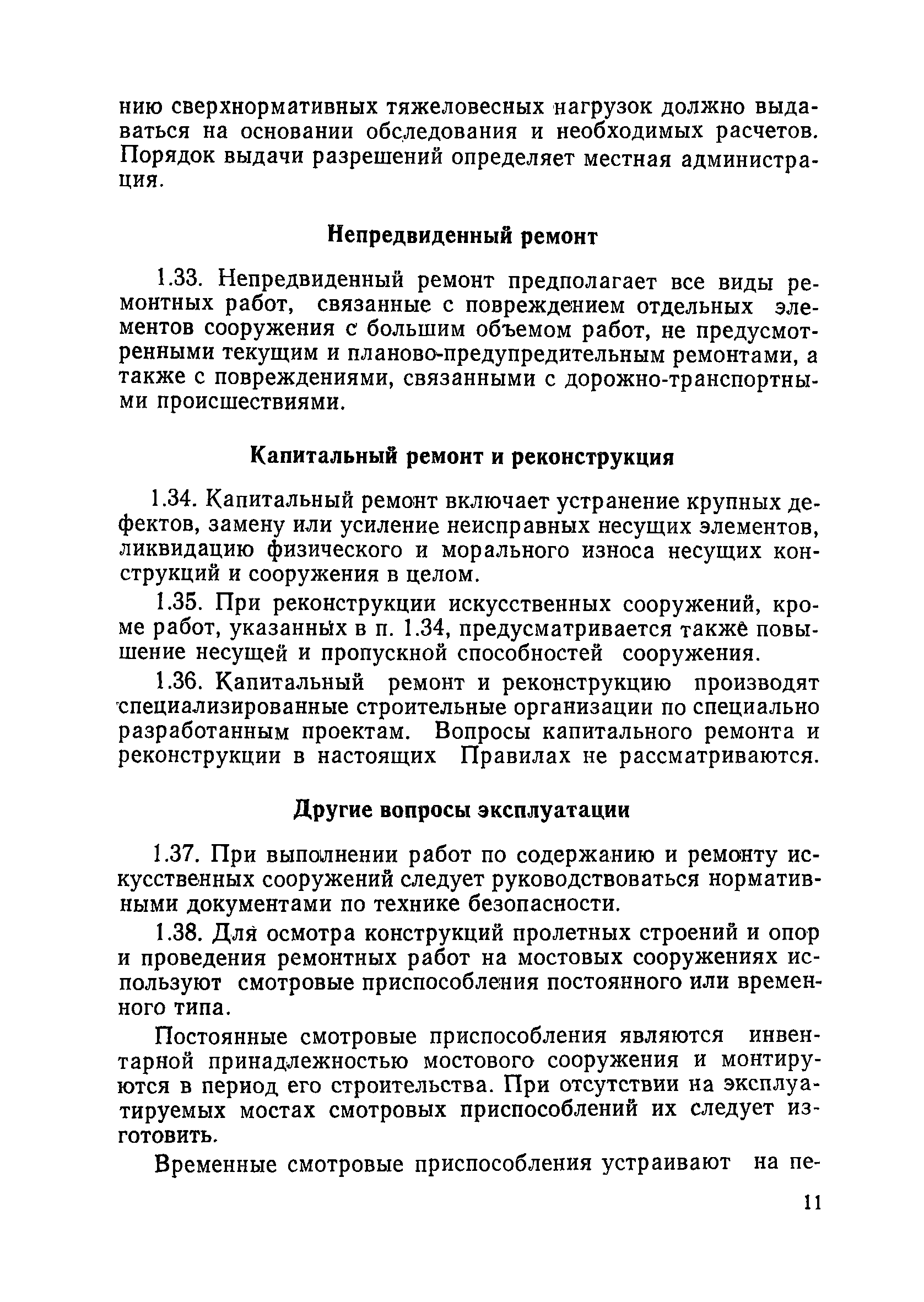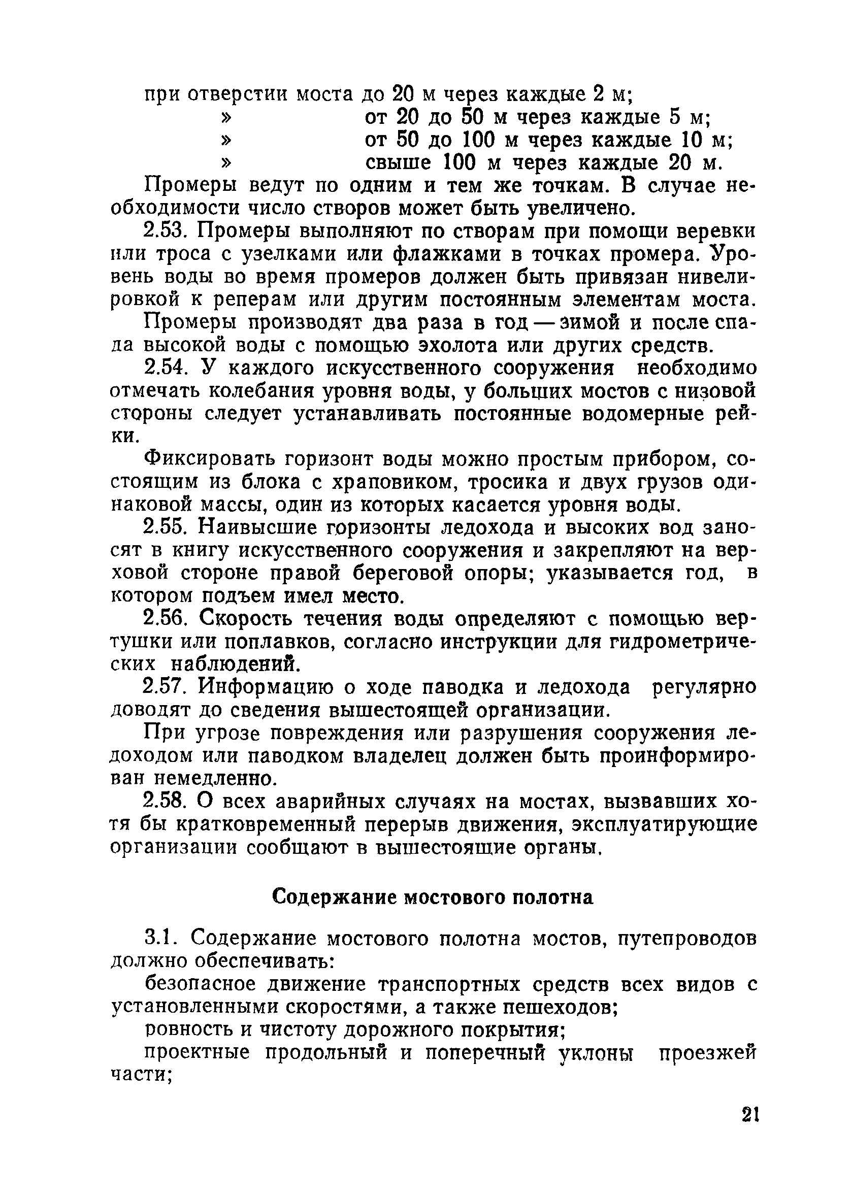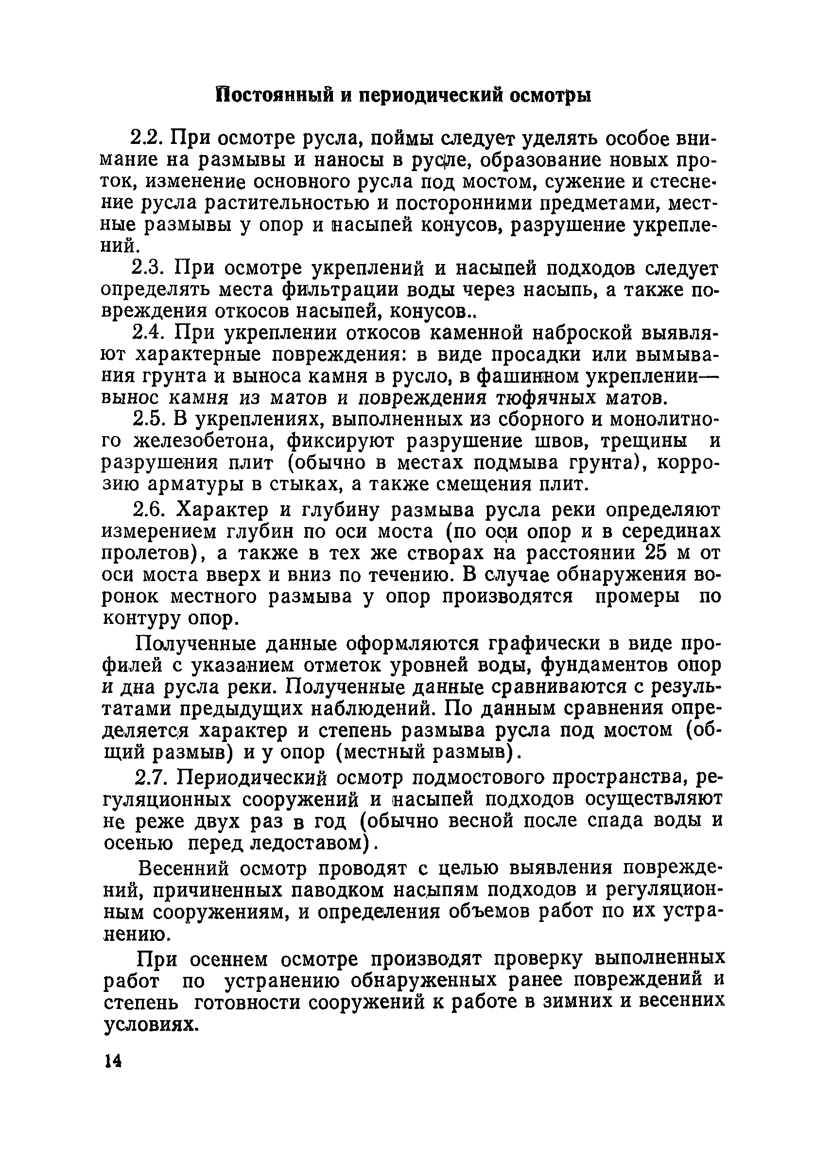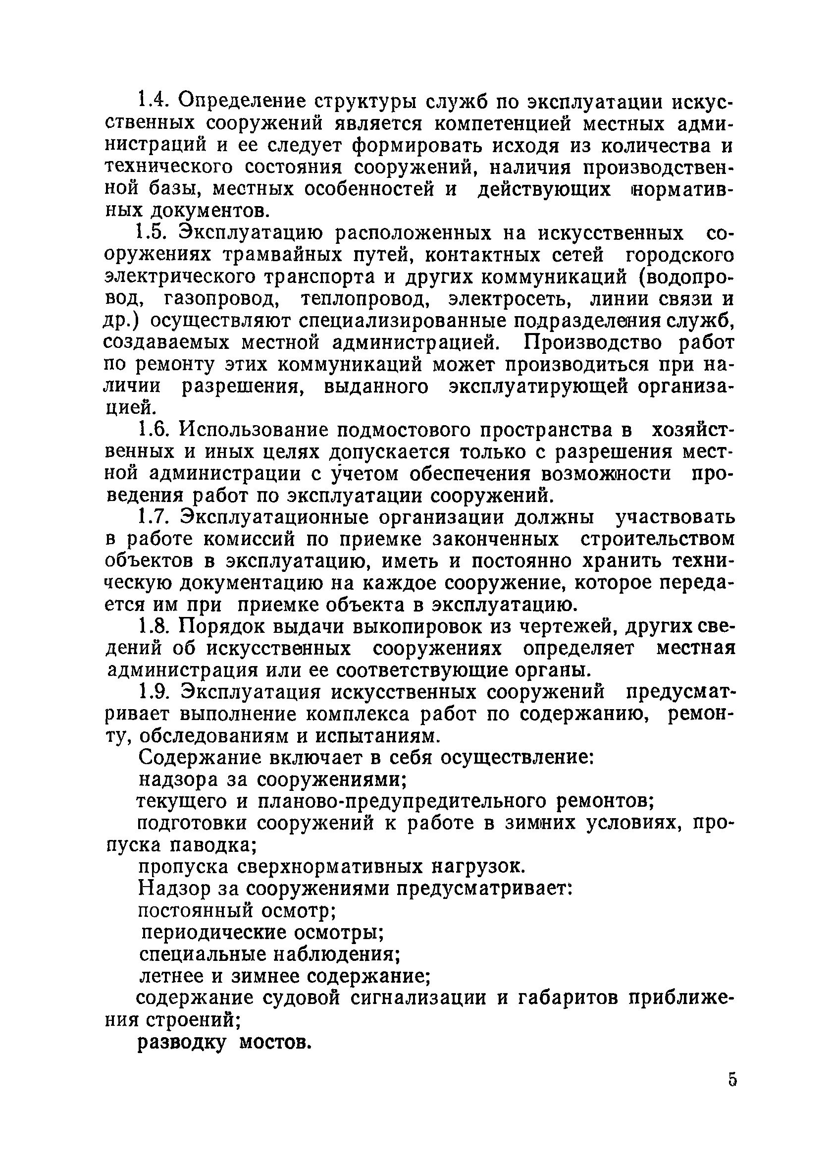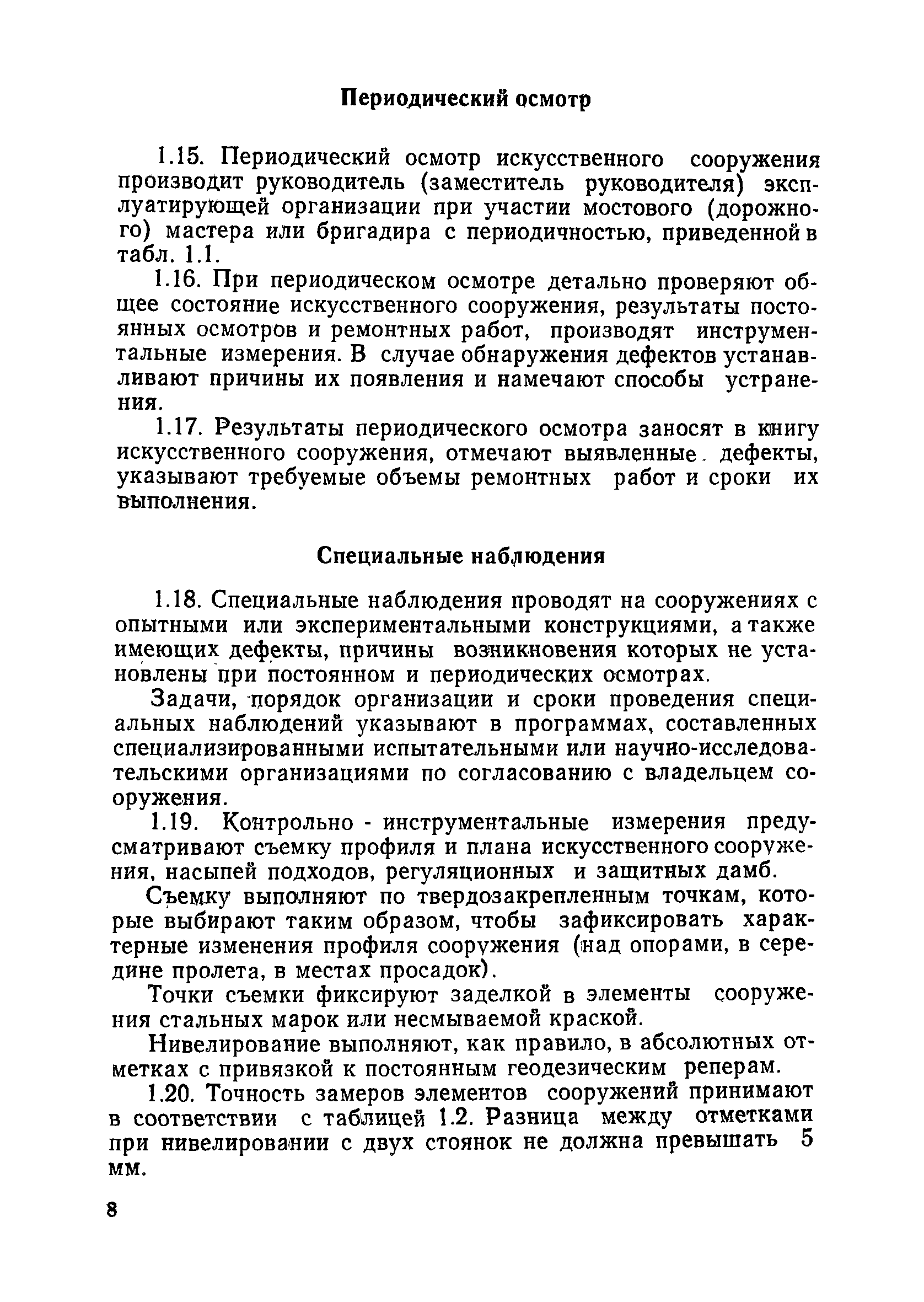 Правила эксплуатации городских искусственных сооружений| Статус: | действует | | Название рус.: | Правила эксплуатации городских искусственных сооружений | | Дата добавления в базу: | 01.09.2013 | | Дата актуализации: | 01.01.2021 | | Область применения: | Правила содержат классификацию работ и основные положения по организации содержания и ремонта городских искусственных сооружений: мостов и путепроводов с подходами к ним, труб, транспортных и пешеходных тоннелей, наплавных мостов, паромных и ледовых переправ. | | Оглавление: | 1. Общие положения 2. Содержание подмостового пространства, регуляционных сооружений и насыпей подходов 3. Содержание мостового полотна 4. Содержание железобетонных, бетонных и каменных пролетных строений мостовых сооружений 5. Содержание металлических пролетных строений мостовых сооружений 6. Содержание опор мостов и путепроводов 7. Содержание деревянных мостовых сооружений 8. Содержание наплавных мостов и паромных переправ 9. Содержание транспортных и пешеходных тоннелей, подпорных стенок 10. Устройство и содержание ледовых переправ 11. Обеспечение безопасности движения транспортных средств и пешеходов 12. Основные требования безопасности при ремонте и эксплуатации городских искусственных сооружений Приложения: 1. Структура работ по эксплуатации искусственных сооружений 2. Ориентировочные объемы ежегодных работ при текущем ремонте элементов мостовых сооружений 3. Перечень основных работ по планово-предупредительному ремонту городских капитальных мостов и путепроводов 4. Форма книги моста (путепровода) 5. Форма книги транспортного (пешеходного) тоннеля 6. Форма паспорта на мост 7. Форма паспорта на транспортный (пешеходный) тоннель 8. Журнал промеров толщины льда и определения грузоподъемности ледяного покрова Литература | | Разработан: | Саратовский институт Проектмостреконструкция