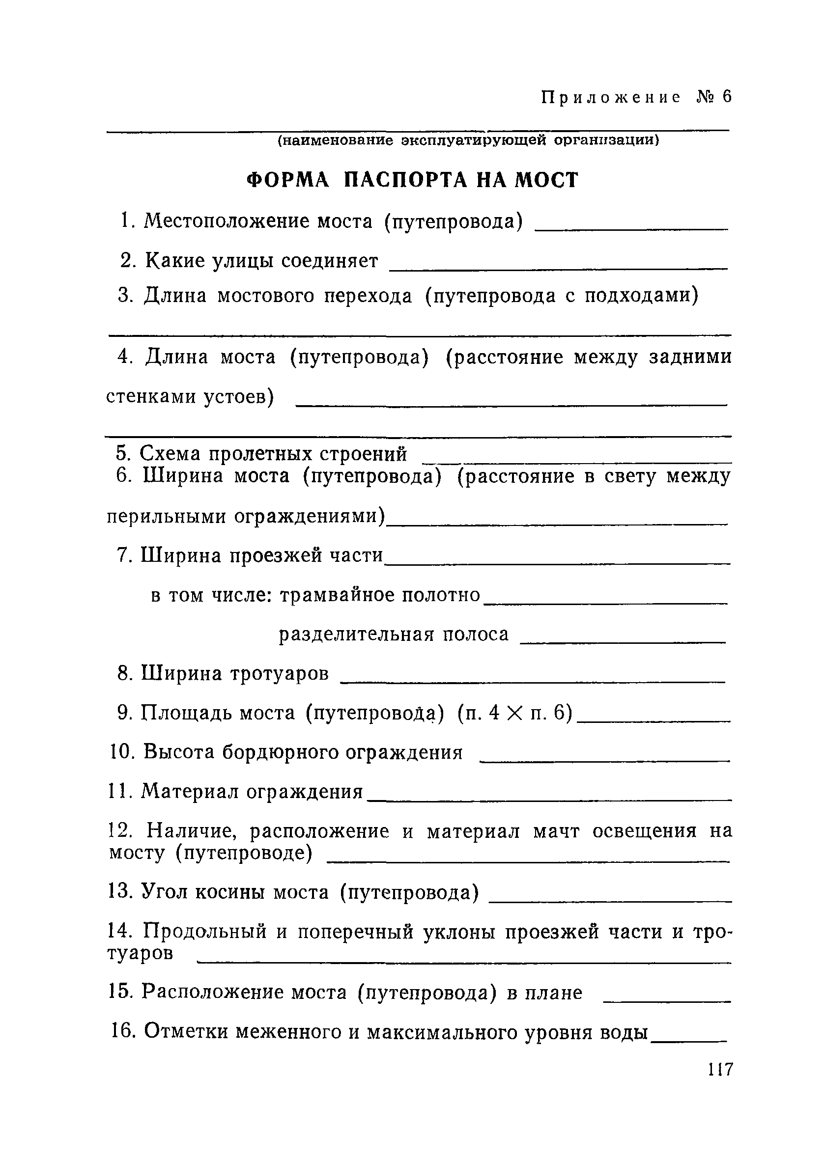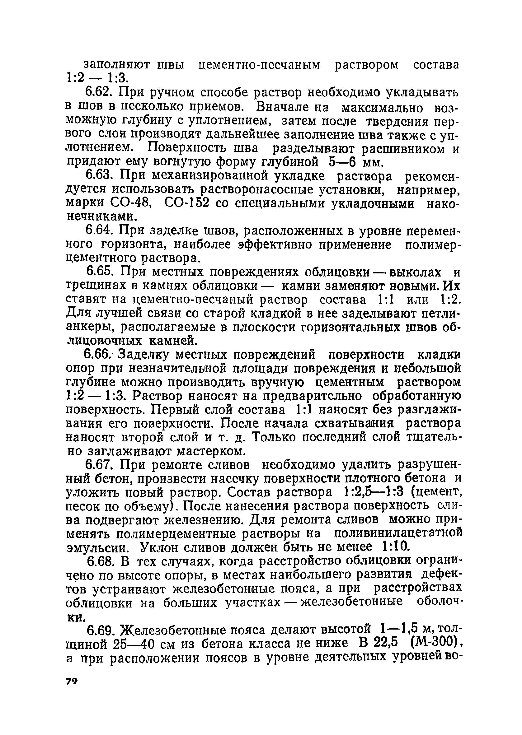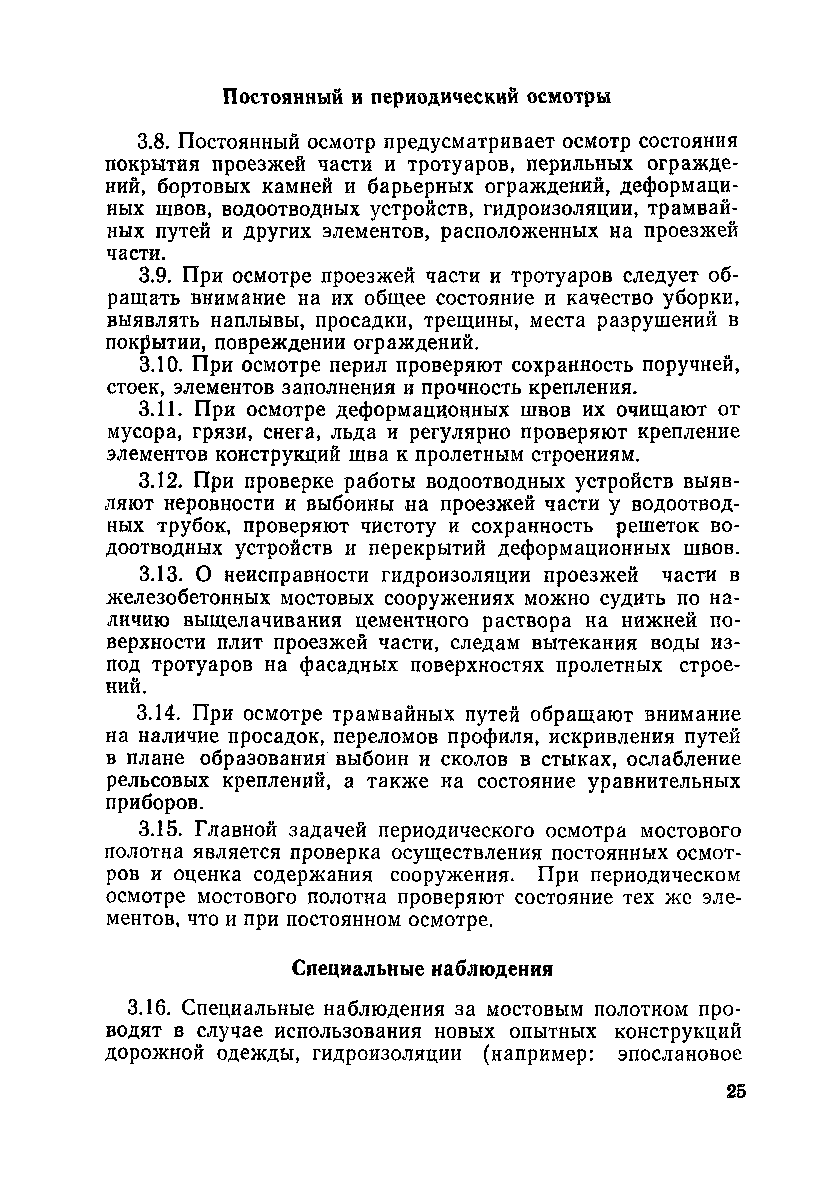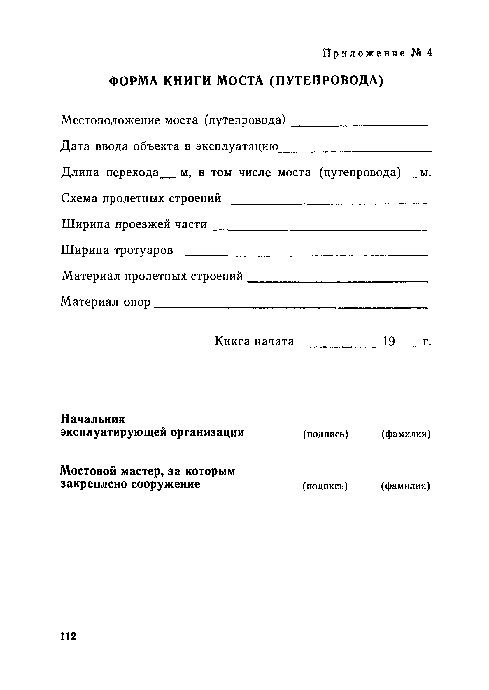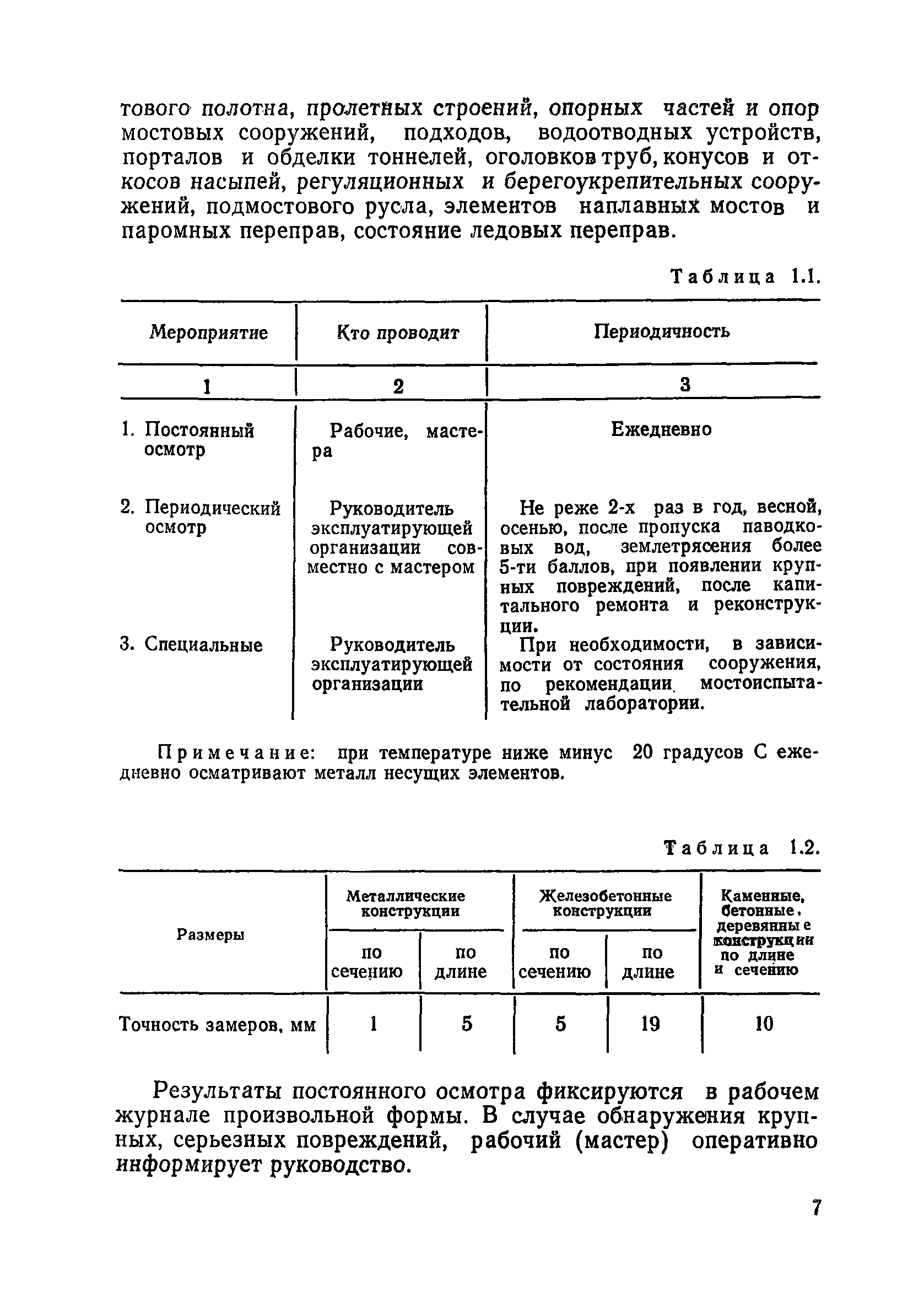 Правила эксплуатации городских искусственных сооружений| Статус: | действует | | Название рус.: | Правила эксплуатации городских искусственных сооружений | | Дата добавления в базу: | 01.09.2013 | | Дата актуализации: | 01.01.2021 | | Область применения: | Правила содержат классификацию работ и основные положения по организации содержания и ремонта городских искусственных сооружений: мостов и путепроводов с подходами к ним, труб, транспортных и пешеходных тоннелей, наплавных мостов, паромных и ледовых переправ. | | Оглавление: | 1. Общие положения 2. Содержание подмостового пространства, регуляционных сооружений и насыпей подходов 3. Содержание мостового полотна 4. Содержание железобетонных, бетонных и каменных пролетных строений мостовых сооружений 5. Содержание металлических пролетных строений мостовых сооружений 6. Содержание опор мостов и путепроводов 7. Содержание деревянных мостовых сооружений 8. Содержание наплавных мостов и паромных переправ 9. Содержание транспортных и пешеходных тоннелей, подпорных стенок 10. Устройство и содержание ледовых переправ 11. Обеспечение безопасности движения транспортных средств и пешеходов 12. Основные требования безопасности при ремонте и эксплуатации городских искусственных сооружений Приложения: 1. Структура работ по эксплуатации искусственных сооружений 2. Ориентировочные объемы ежегодных работ при текущем ремонте элементов мостовых сооружений 3. Перечень основных работ по планово-предупредительному ремонту городских капитальных мостов и путепроводов 4. Форма книги моста (путепровода) 5. Форма книги транспортного (пешеходного) тоннеля 6. Форма паспорта на мост 7. Форма паспорта на транспортный (пешеходный) тоннель 8. Журнал промеров толщины льда и определения грузоподъемности ледяного покрова Литература | | Разработан: | Саратовский институт Проектмостреконструкция