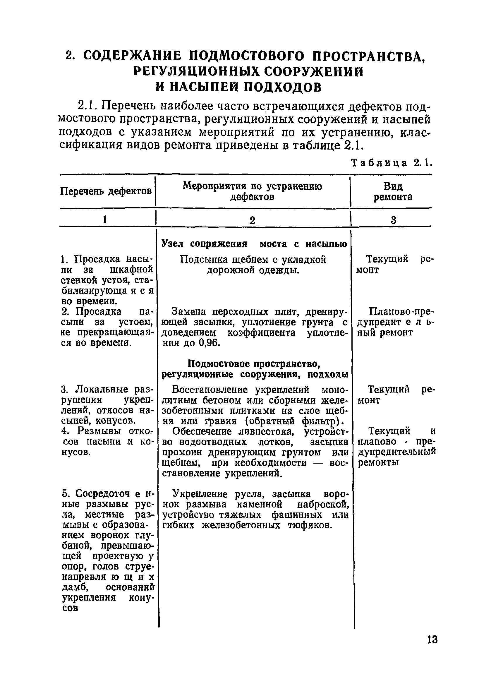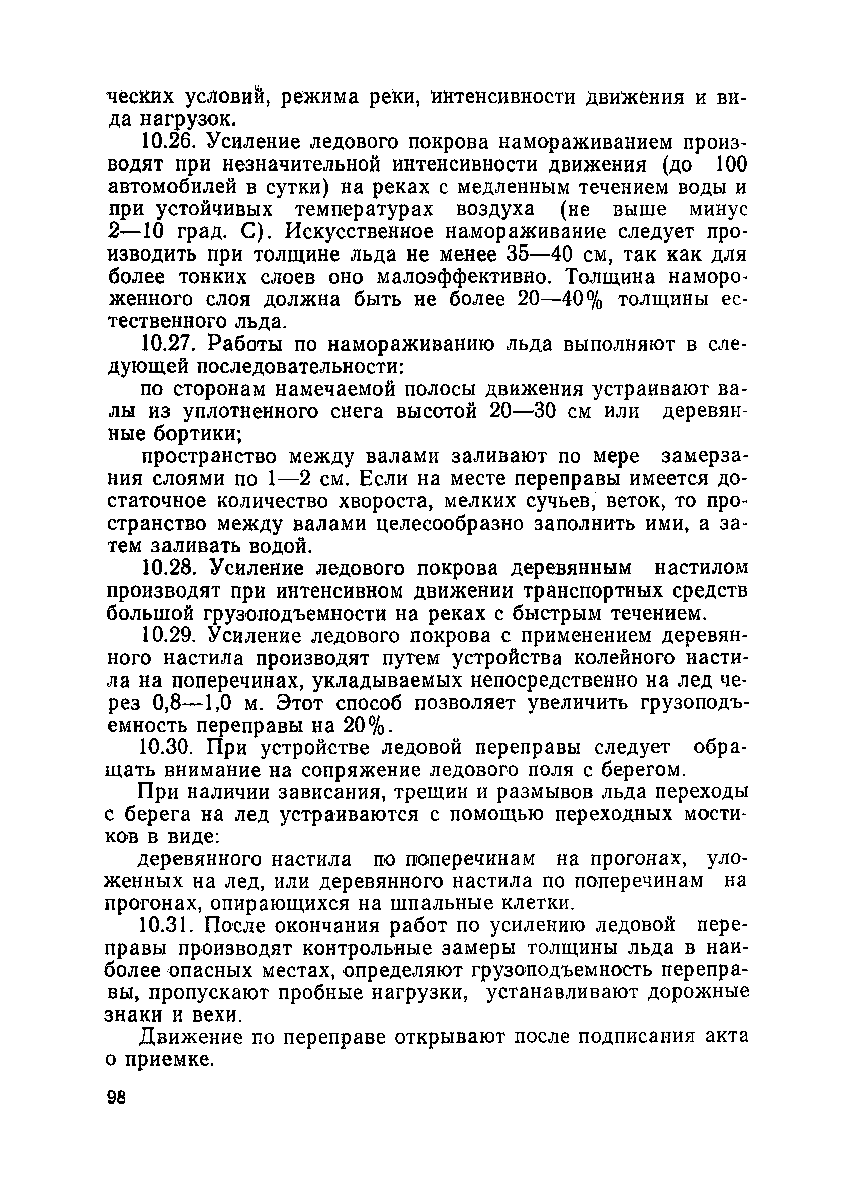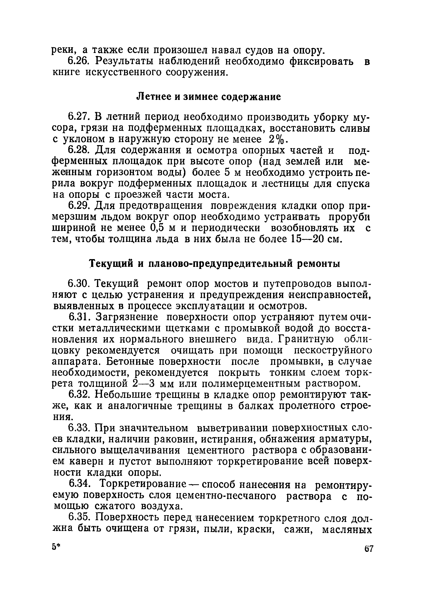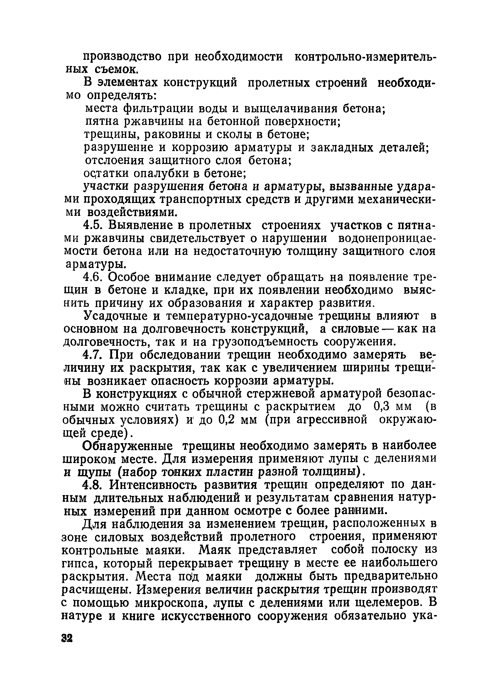 Правила эксплуатации городских искусственных сооружений| Статус: | действует | | Название рус.: | Правила эксплуатации городских искусственных сооружений | | Дата добавления в базу: | 01.09.2013 | | Дата актуализации: | 01.01.2021 | | Область применения: | Правила содержат классификацию работ и основные положения по организации содержания и ремонта городских искусственных сооружений: мостов и путепроводов с подходами к ним, труб, транспортных и пешеходных тоннелей, наплавных мостов, паромных и ледовых переправ. | | Оглавление: | 1. Общие положения 2. Содержание подмостового пространства, регуляционных сооружений и насыпей подходов 3. Содержание мостового полотна 4. Содержание железобетонных, бетонных и каменных пролетных строений мостовых сооружений 5. Содержание металлических пролетных строений мостовых сооружений 6. Содержание опор мостов и путепроводов 7. Содержание деревянных мостовых сооружений 8. Содержание наплавных мостов и паромных переправ 9. Содержание транспортных и пешеходных тоннелей, подпорных стенок 10. Устройство и содержание ледовых переправ 11. Обеспечение безопасности движения транспортных средств и пешеходов 12. Основные требования безопасности при ремонте и эксплуатации городских искусственных сооружений Приложения: 1. Структура работ по эксплуатации искусственных сооружений 2. Ориентировочные объемы ежегодных работ при текущем ремонте элементов мостовых сооружений 3. Перечень основных работ по планово-предупредительному ремонту городских капитальных мостов и путепроводов 4. Форма книги моста (путепровода) 5. Форма книги транспортного (пешеходного) тоннеля 6. Форма паспорта на мост 7. Форма паспорта на транспортный (пешеходный) тоннель 8. Журнал промеров толщины льда и определения грузоподъемности ледяного покрова Литература | | Разработан: | Саратовский институт Проектмостреконструкция
