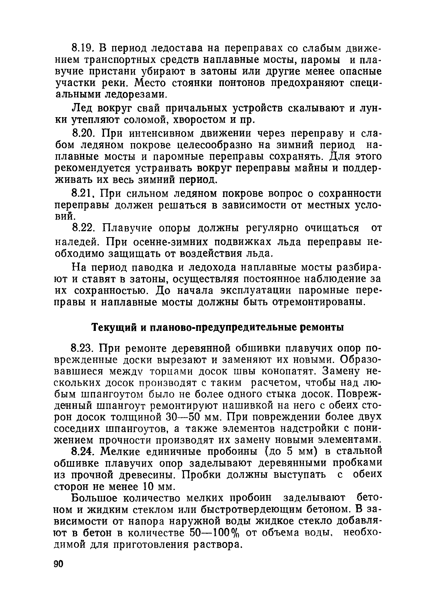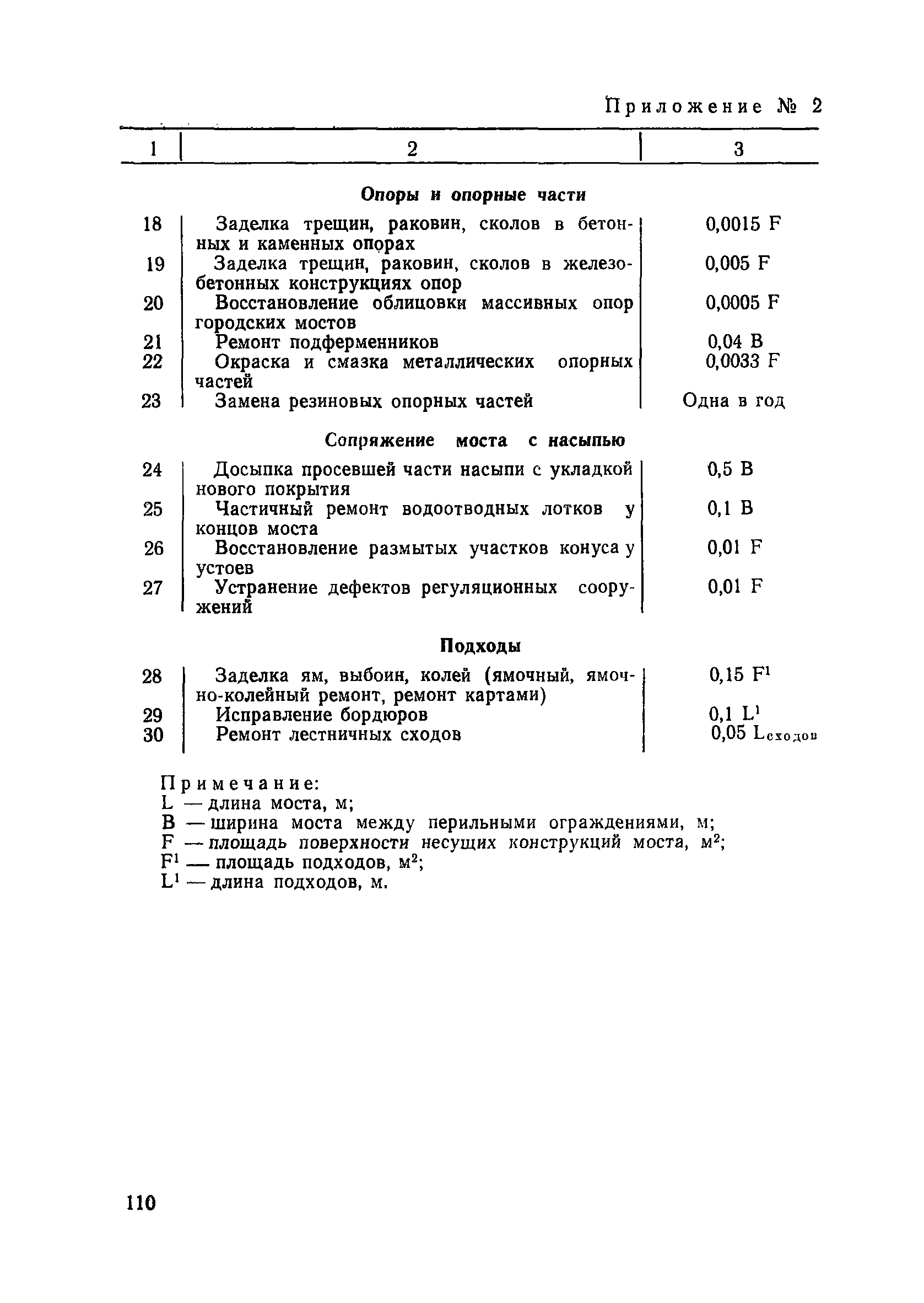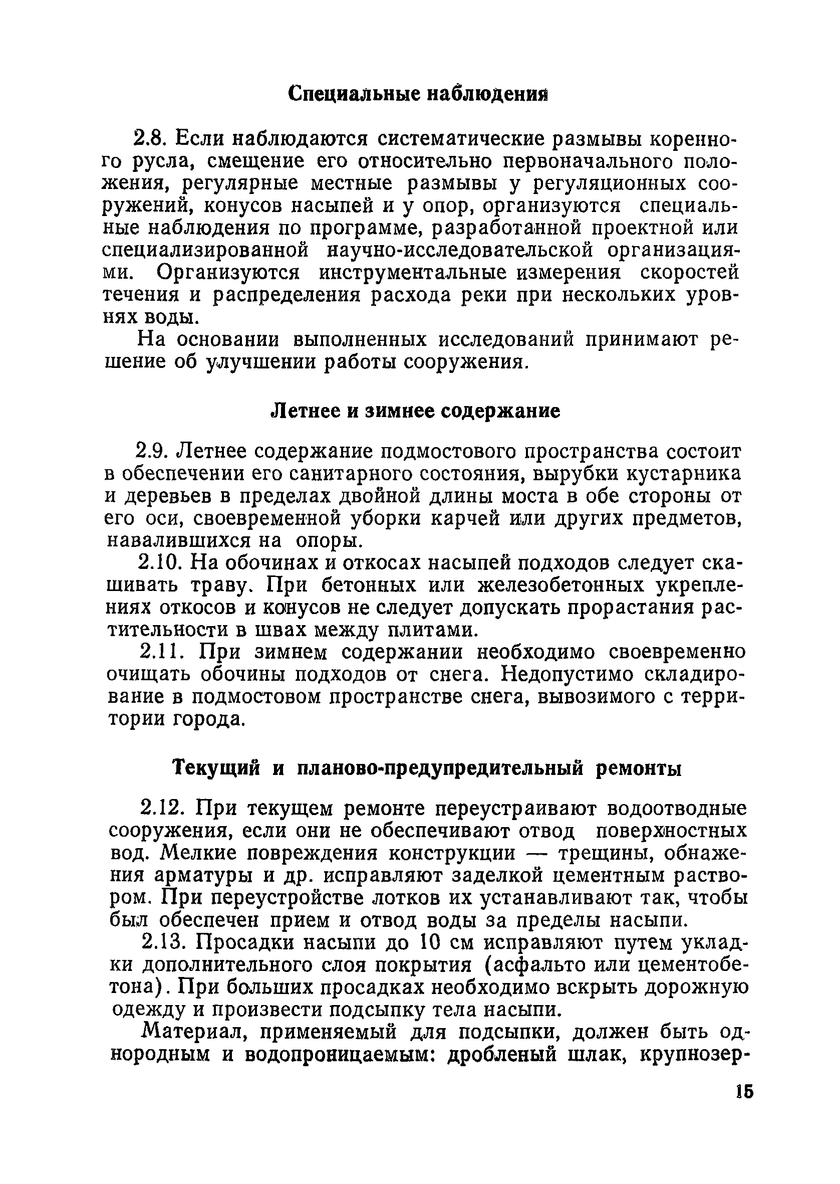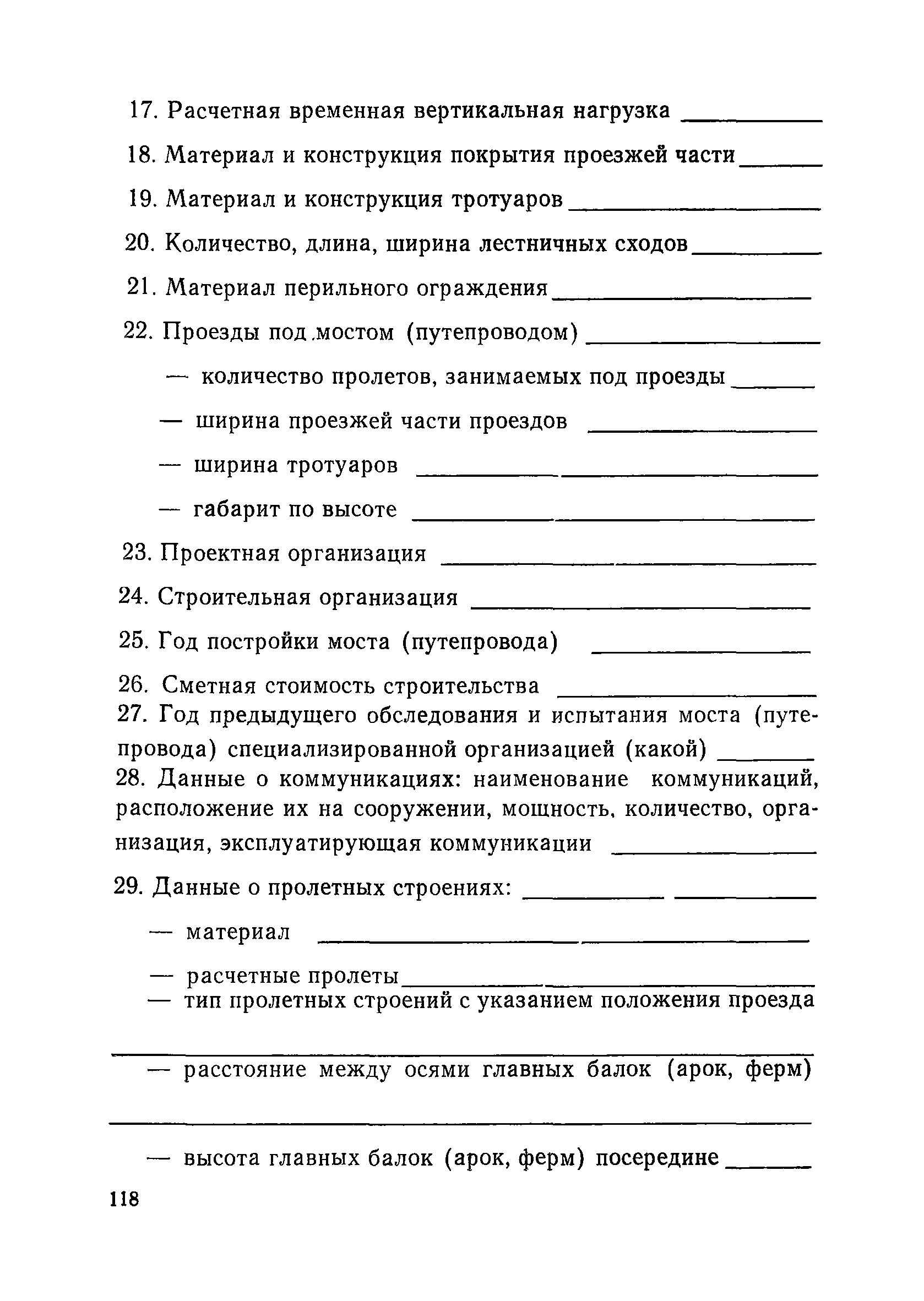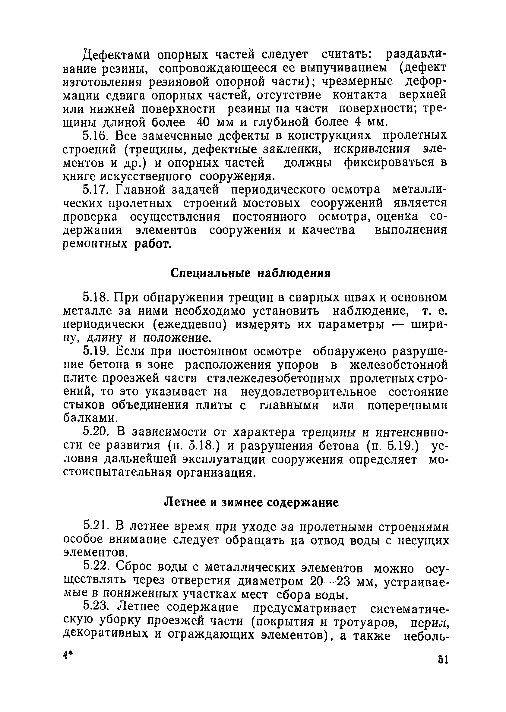 Правила эксплуатации городских искусственных сооружений| Статус: | действует | | Название рус.: | Правила эксплуатации городских искусственных сооружений | | Дата добавления в базу: | 01.09.2013 | | Дата актуализации: | 01.01.2021 | | Область применения: | Правила содержат классификацию работ и основные положения по организации содержания и ремонта городских искусственных сооружений: мостов и путепроводов с подходами к ним, труб, транспортных и пешеходных тоннелей, наплавных мостов, паромных и ледовых переправ. | | Оглавление: | 1. Общие положения 2. Содержание подмостового пространства, регуляционных сооружений и насыпей подходов 3. Содержание мостового полотна 4. Содержание железобетонных, бетонных и каменных пролетных строений мостовых сооружений 5. Содержание металлических пролетных строений мостовых сооружений 6. Содержание опор мостов и путепроводов 7. Содержание деревянных мостовых сооружений 8. Содержание наплавных мостов и паромных переправ 9. Содержание транспортных и пешеходных тоннелей, подпорных стенок 10. Устройство и содержание ледовых переправ 11. Обеспечение безопасности движения транспортных средств и пешеходов 12. Основные требования безопасности при ремонте и эксплуатации городских искусственных сооружений Приложения: 1. Структура работ по эксплуатации искусственных сооружений 2. Ориентировочные объемы ежегодных работ при текущем ремонте элементов мостовых сооружений 3. Перечень основных работ по планово-предупредительному ремонту городских капитальных мостов и путепроводов 4. Форма книги моста (путепровода) 5. Форма книги транспортного (пешеходного) тоннеля 6. Форма паспорта на мост 7. Форма паспорта на транспортный (пешеходный) тоннель 8. Журнал промеров толщины льда и определения грузоподъемности ледяного покрова Литература | | Разработан: | Саратовский институт Проектмостреконструкция